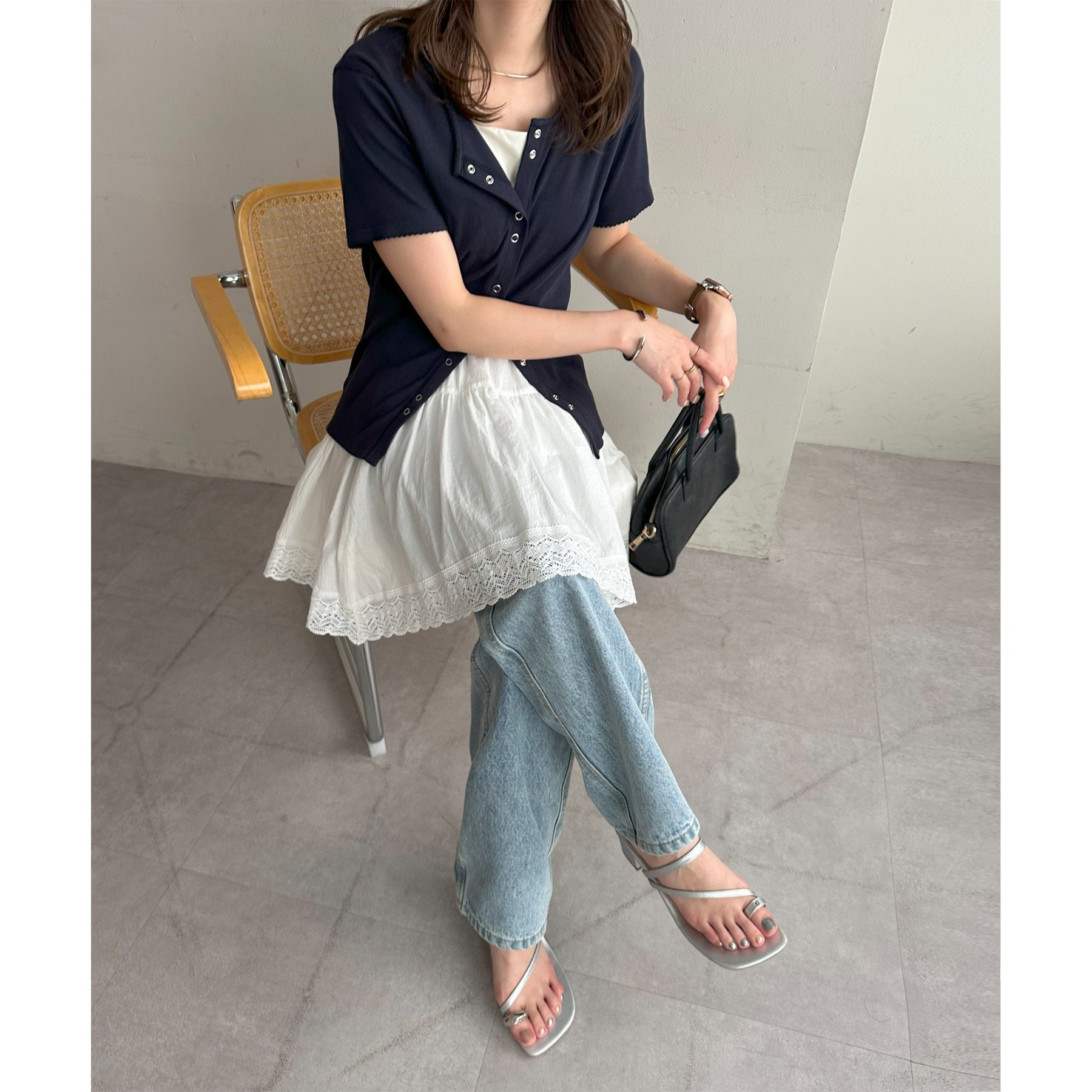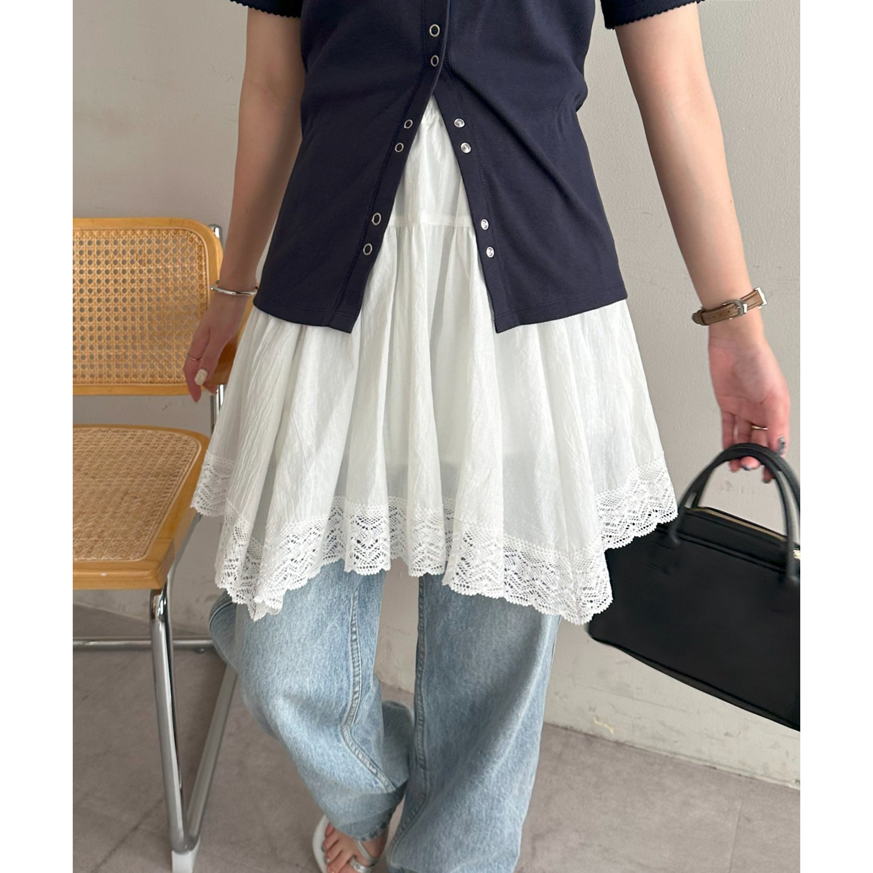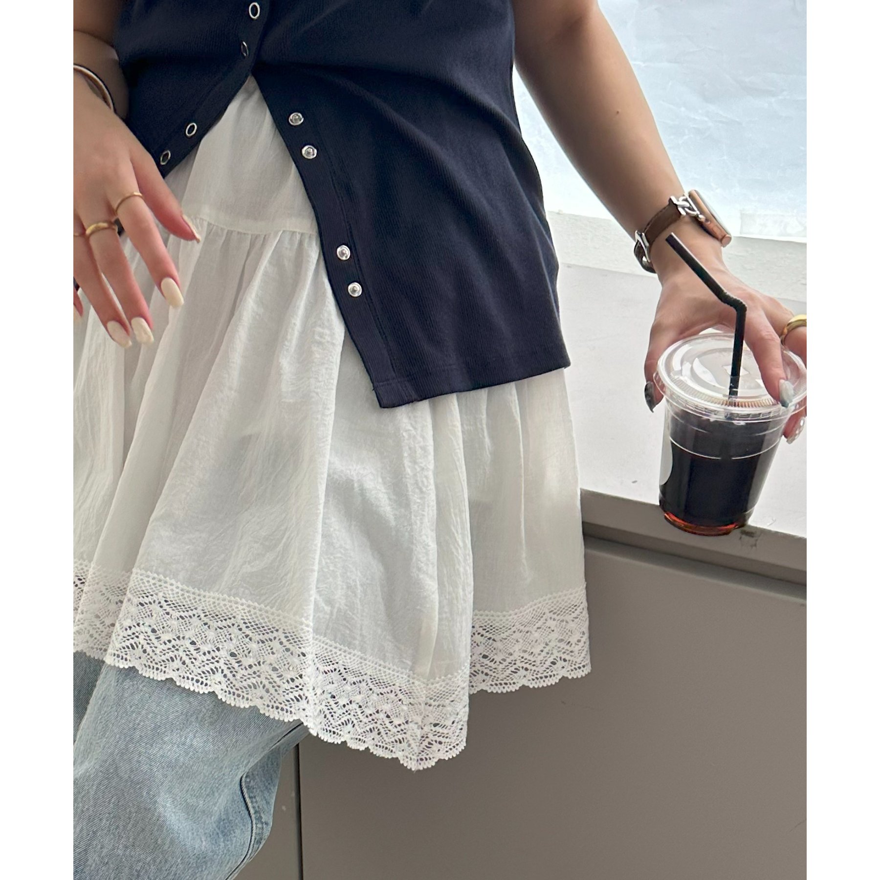 裾にはレースをあしらい、甘さはありつつも上品で大人っぽい印象に。