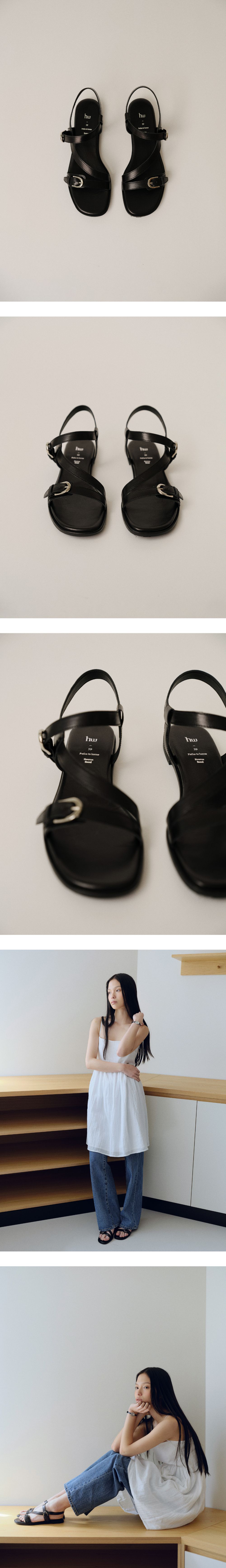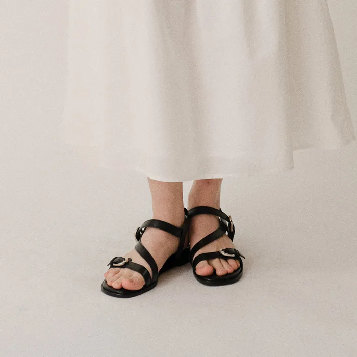 緩やかな曲線と直線が調和するラウンドスクエアトゥは構築的な美しさを強調しつつ、つま先の接地面を広げて快適な履き心地を実現。ストラップのメタルバックルは調整可能で、足型に合わせた精緻なフィットを叶え、ほのかな光沢が上品なアクセントになります。