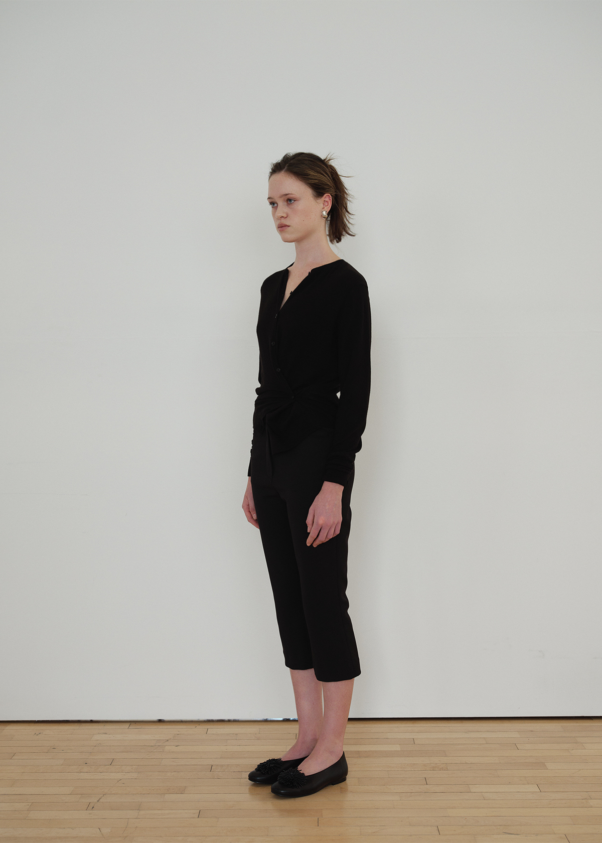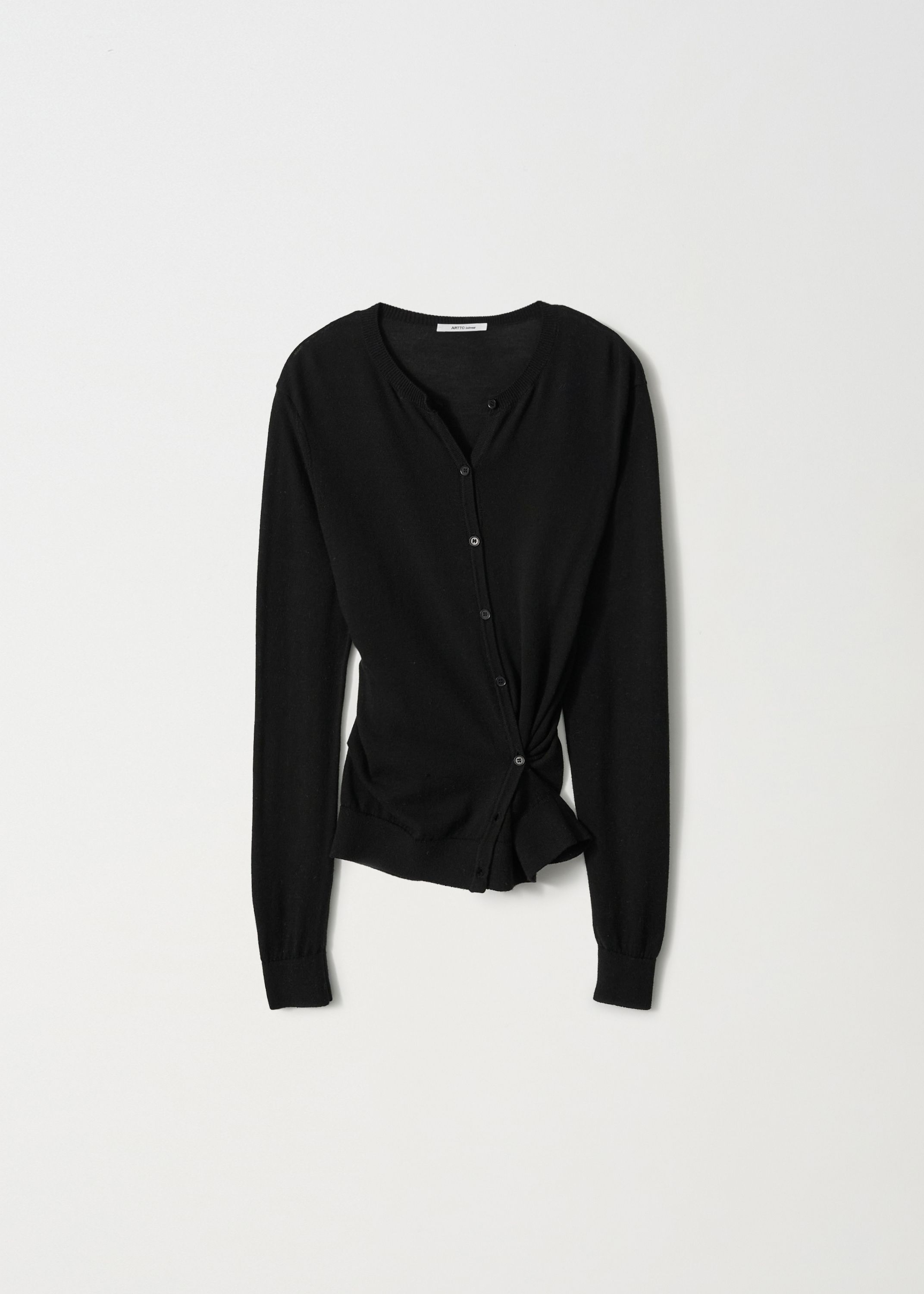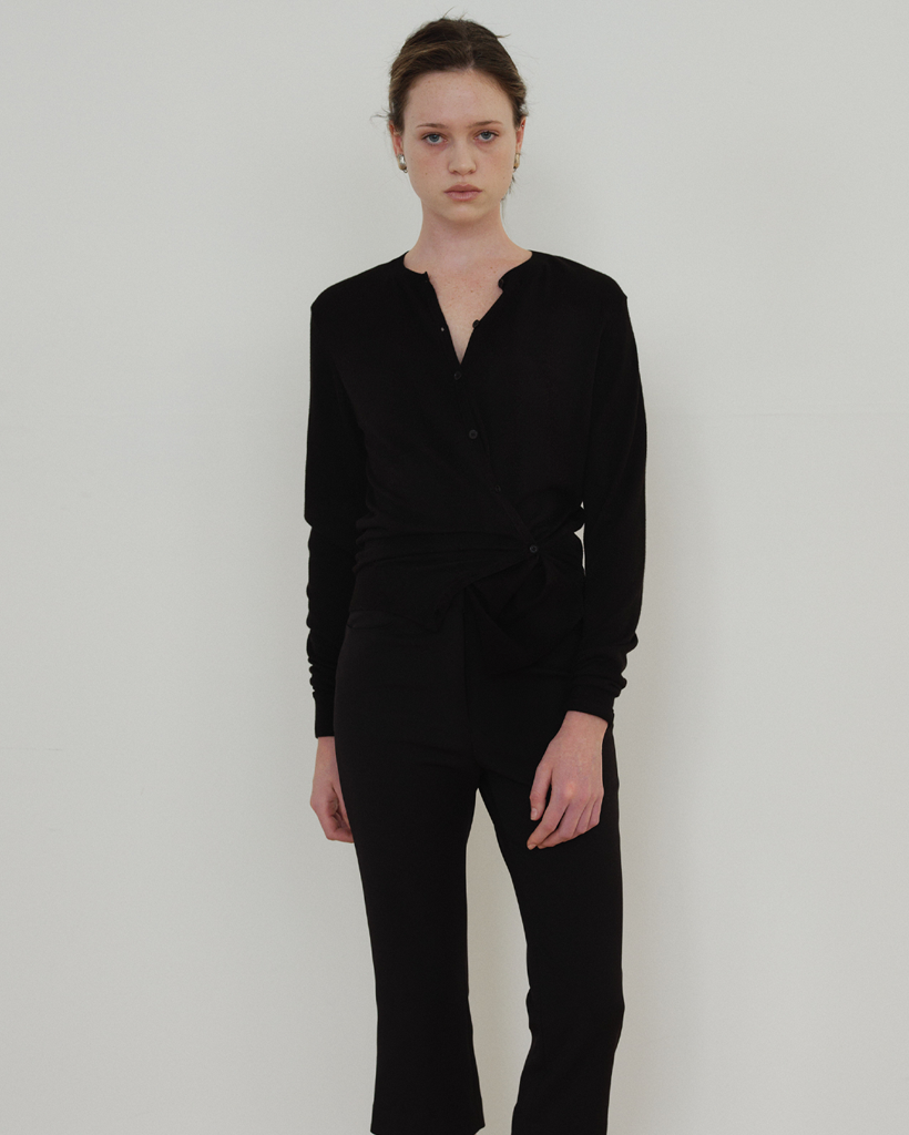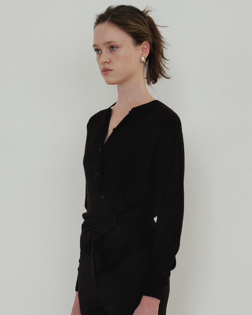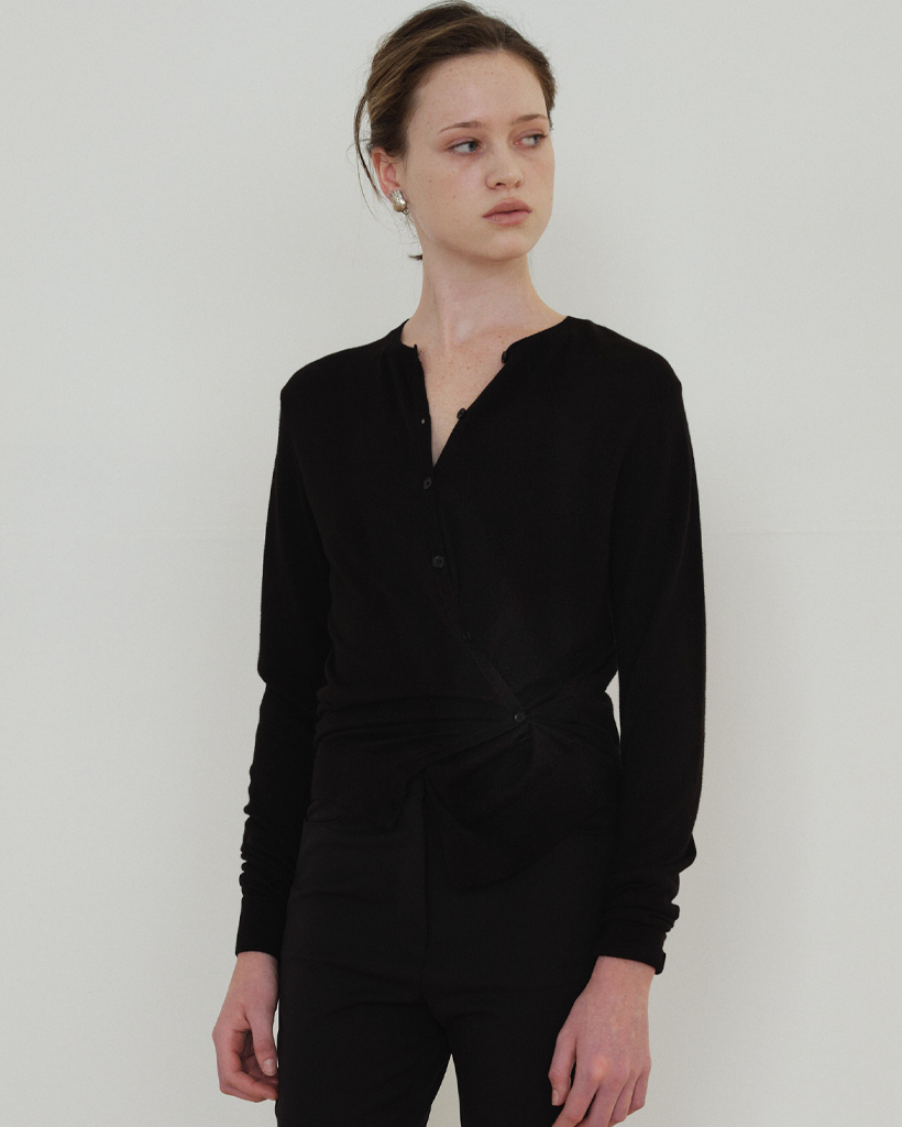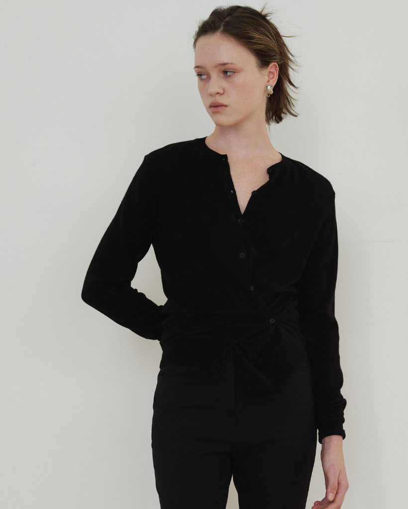 サイドラインのボタンディテールを活かしてラップのように結べる 2WAY デザインで、ベーシックなカーディガンスタイルとポイントのあるシルエットの両方を楽しめます。袖口と裾はリブ組織で仕上げ、ほどよいテンションでフォルムを整えます。Cream・Charcoal・Black の3色構成で、デイリーからフォーマルなスタイリングまで幅広くマッチします。