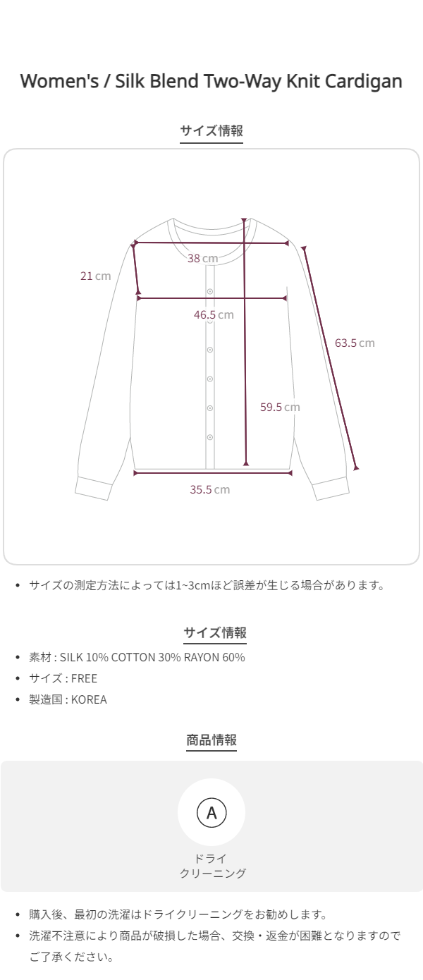 - ラップニットの特性上、ボタンを留める過程で生地にテンションがかかると、ボタン部分に伸びが生じる場合があります。ボタン部分の伸びや着用痕が発生した場合、交換および返品はできません。