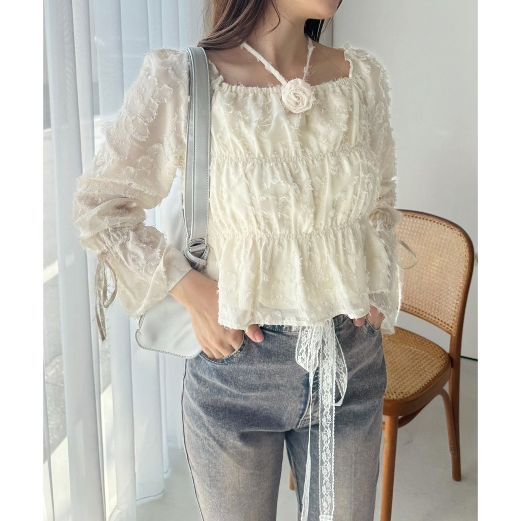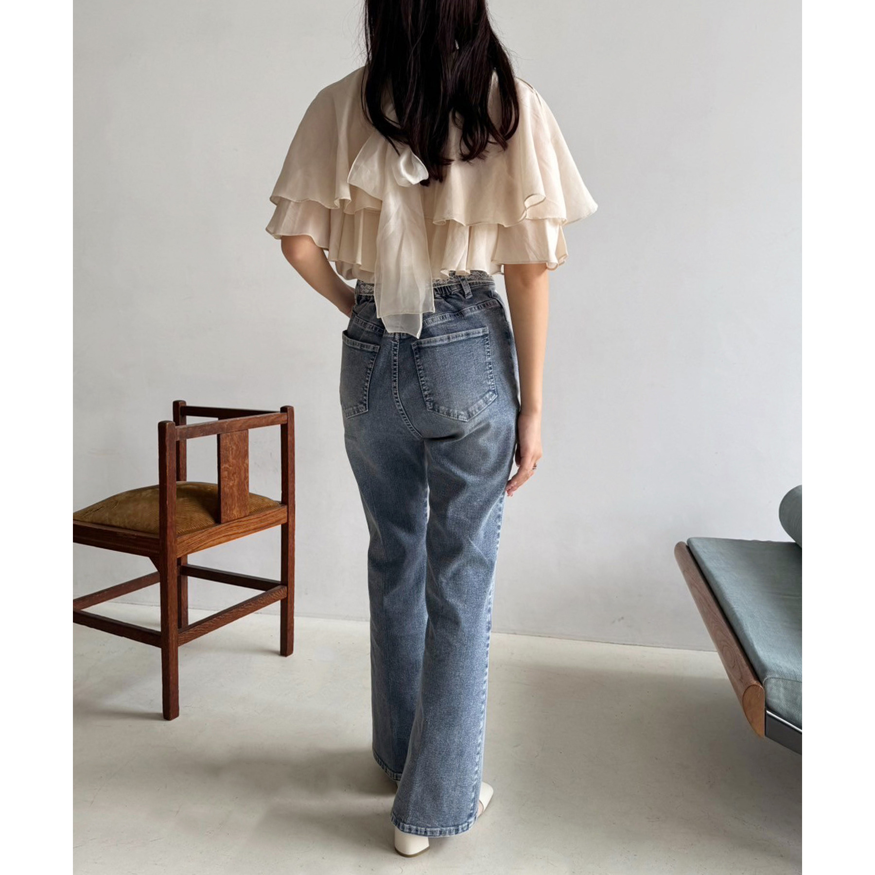 カジュアルになりやすいデニムはTシャツなどはもちろん、少し甘めなブラウスとの合わせがおすすめ。
