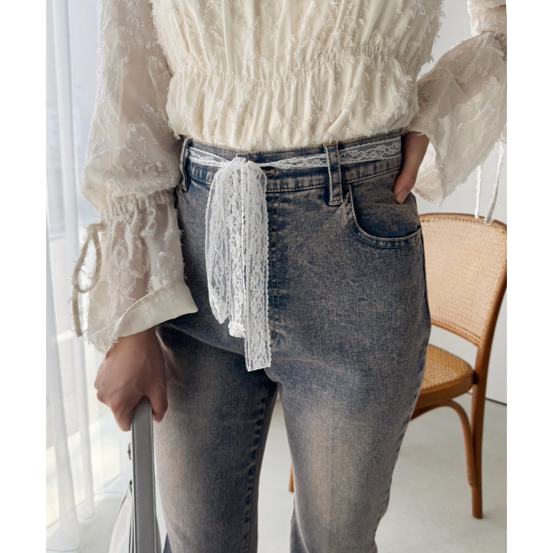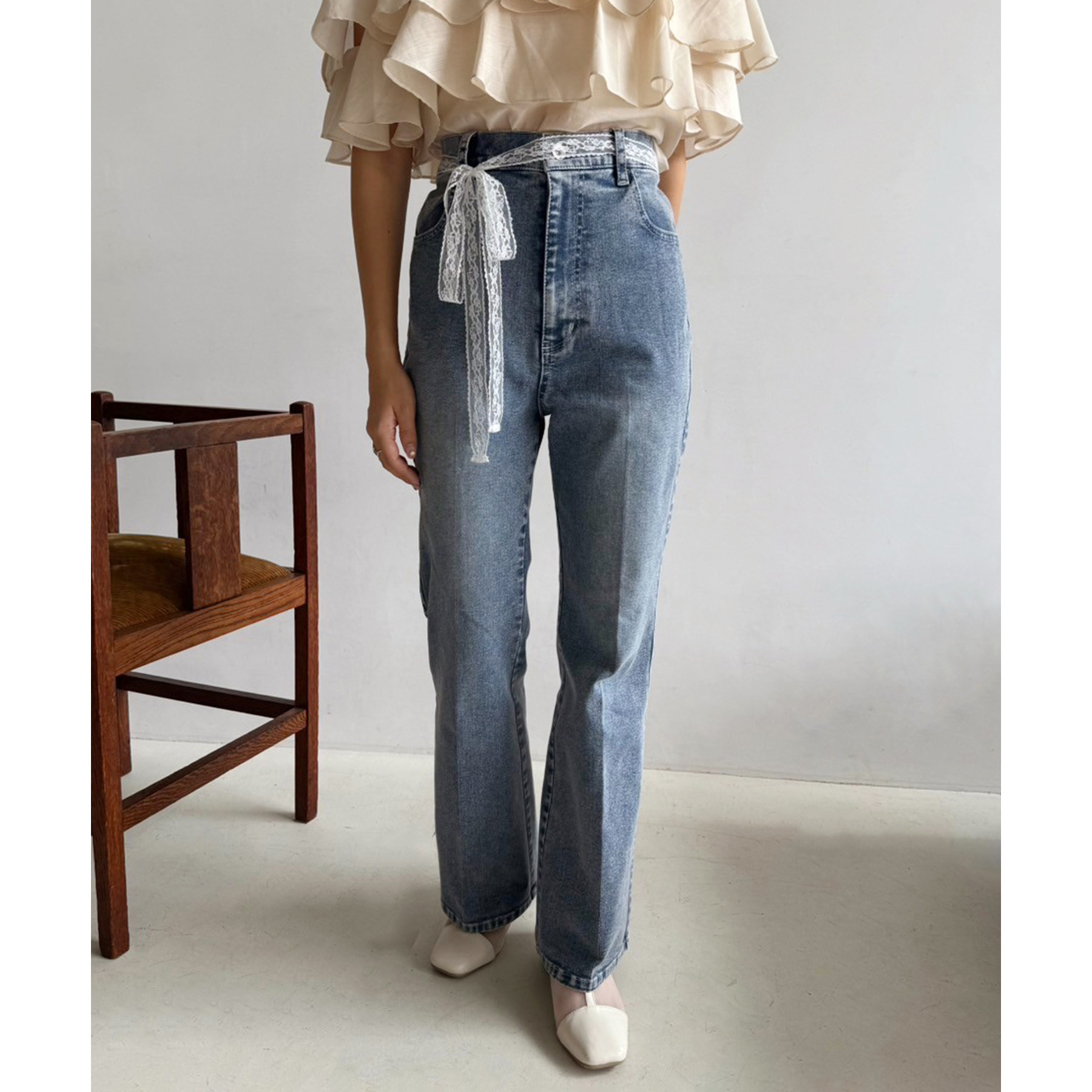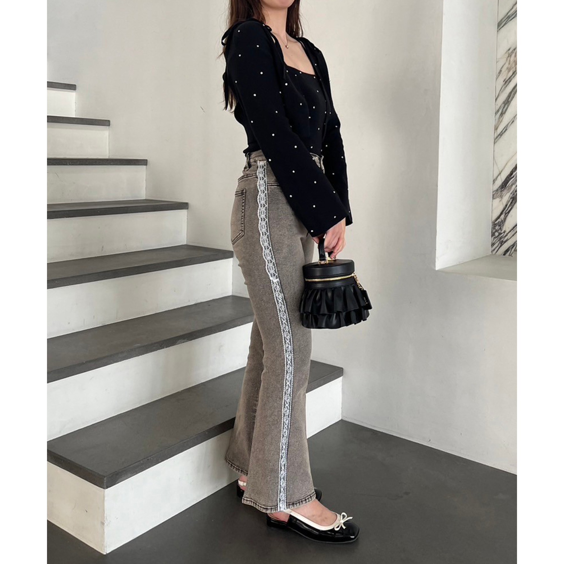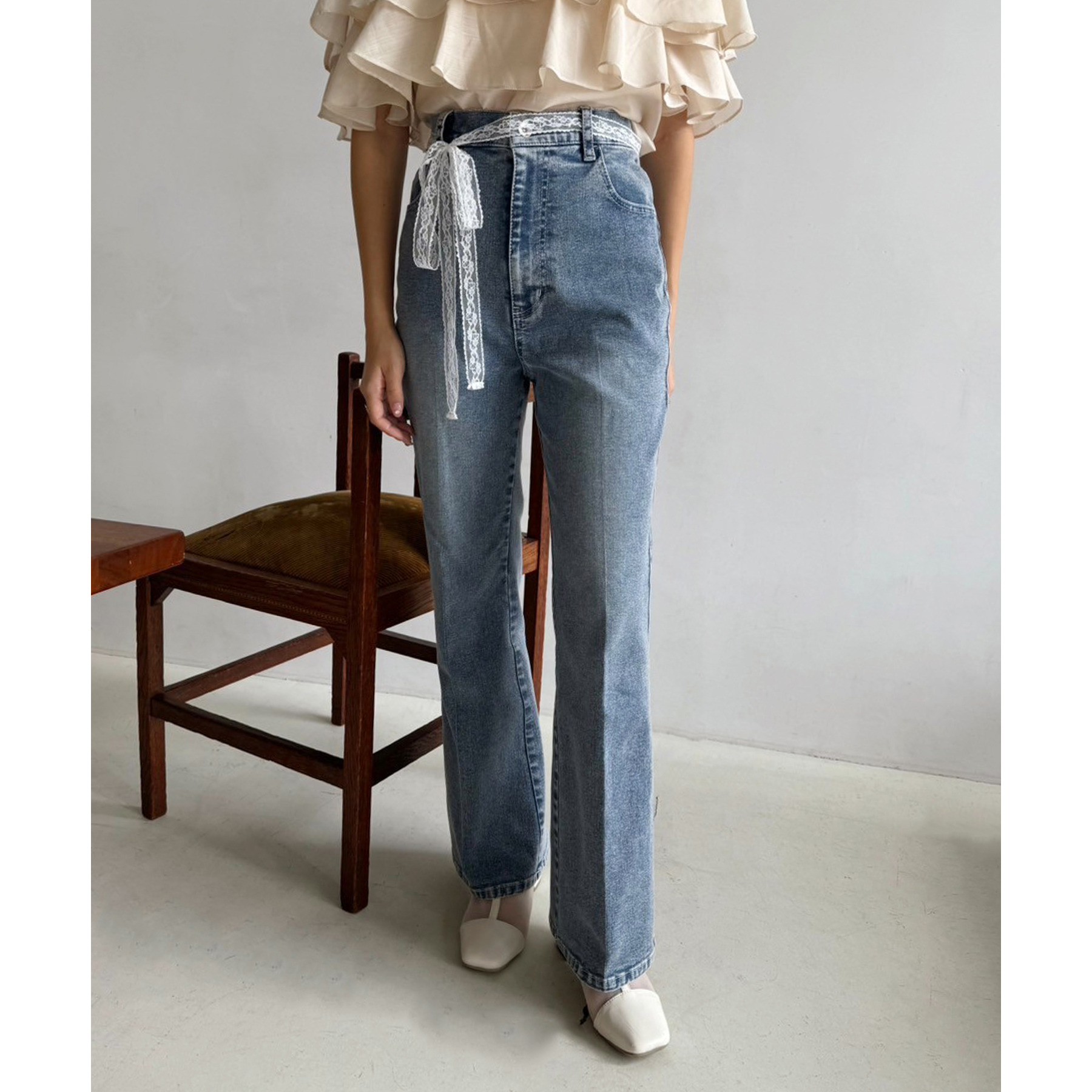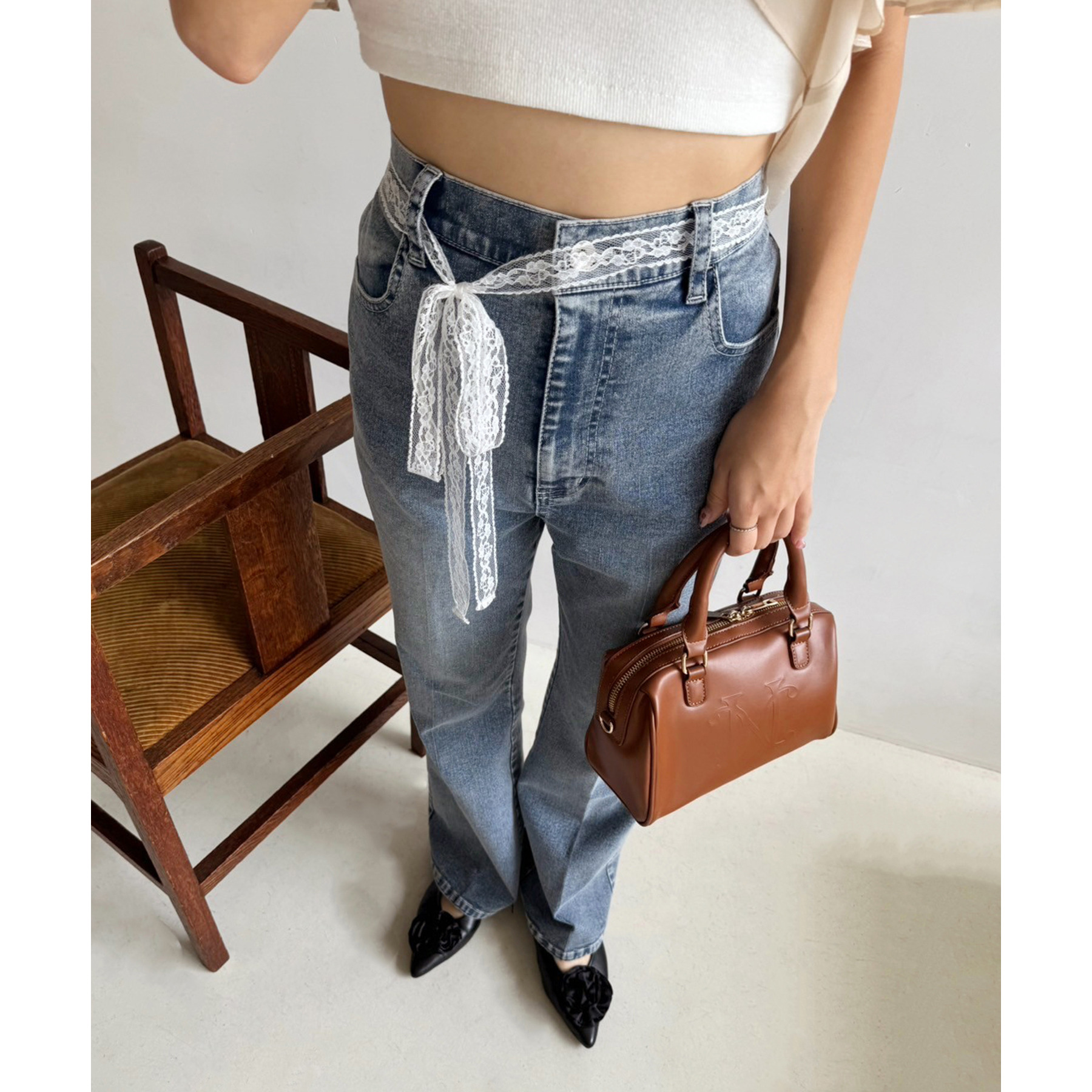 シンプルなデニムにレースを施すことで可愛らしさをプラス。