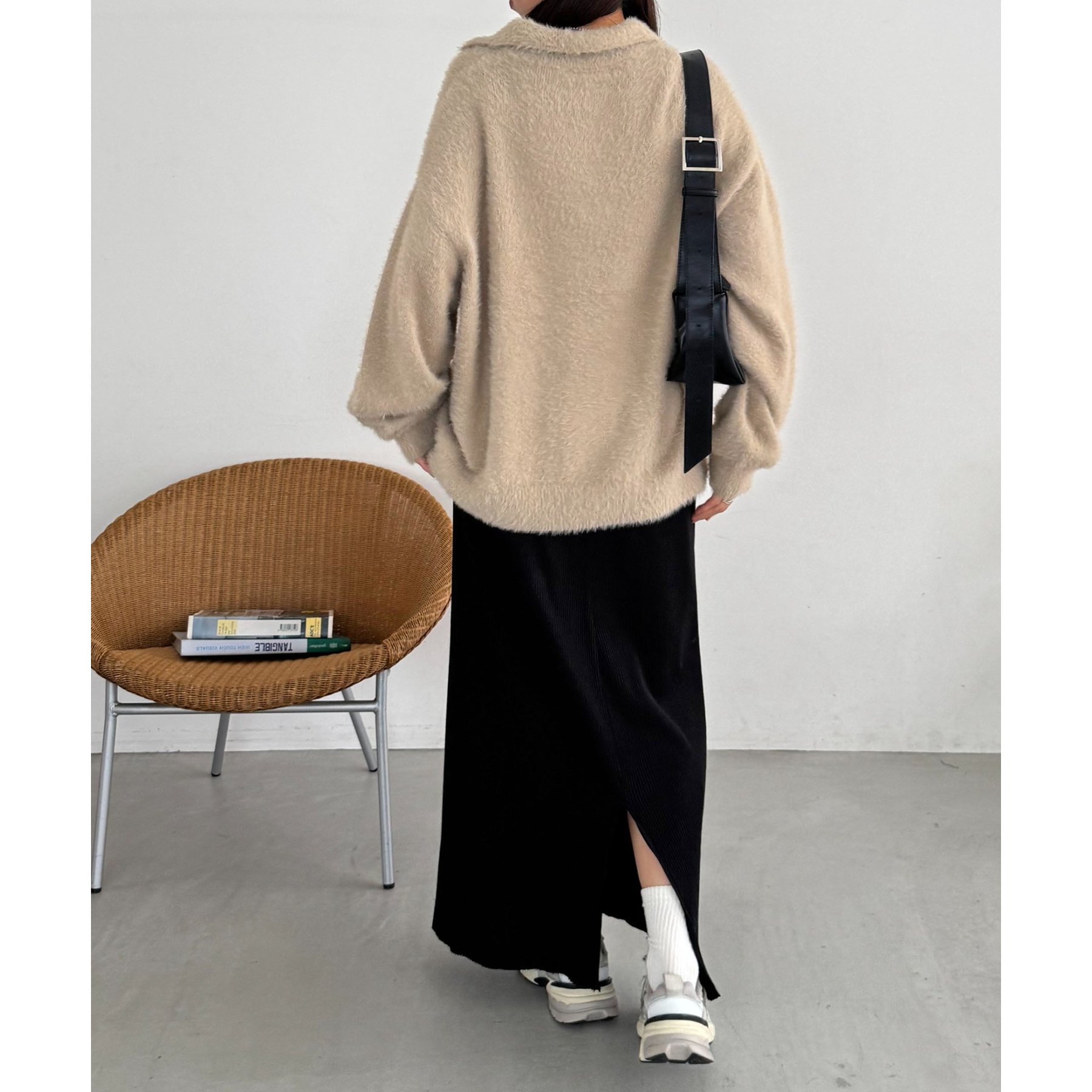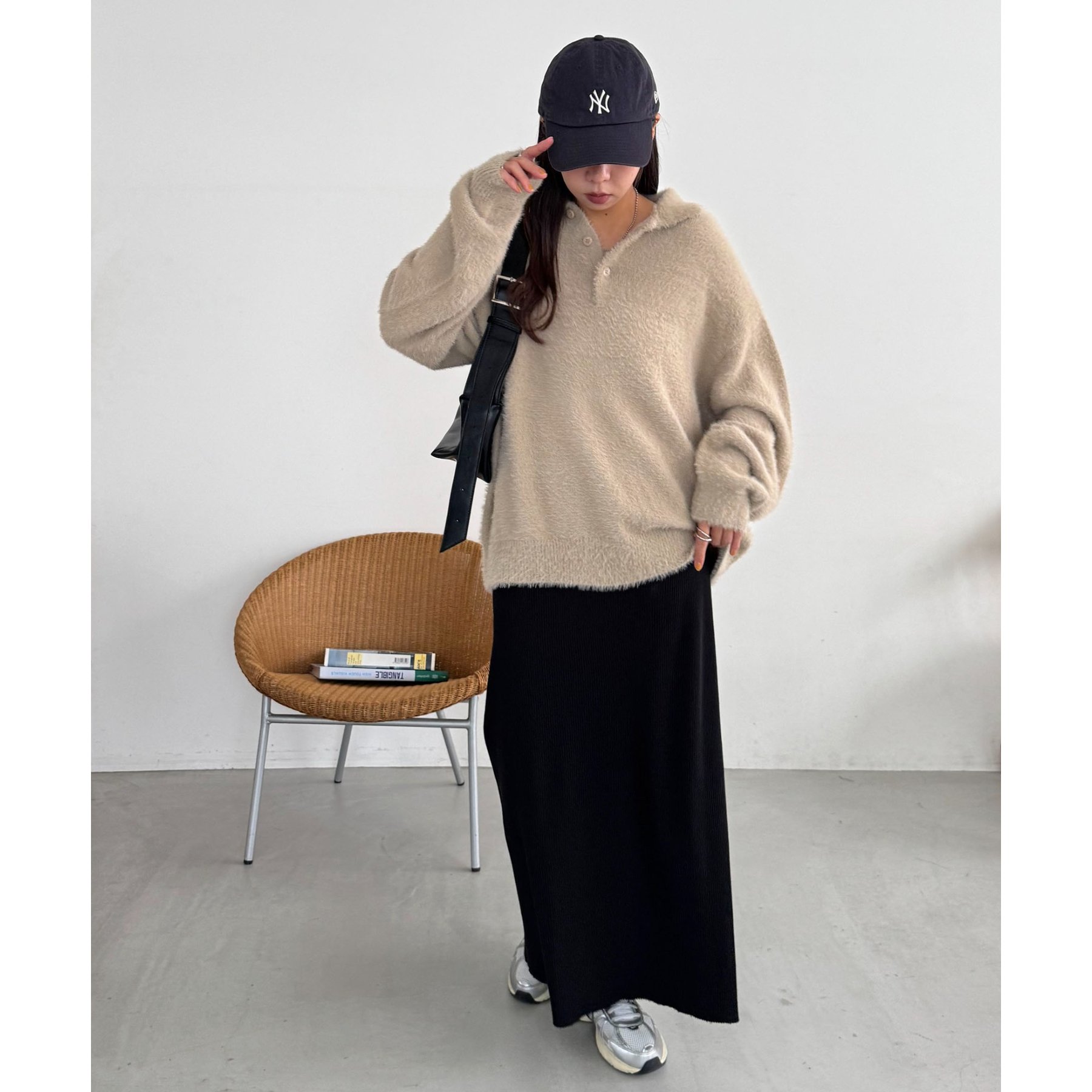 デニムやスラックスはもちろん、ナロースカートやレーススカートなどボトムを選ばない着丈なので幅広い系統の方に着ていただけます◎