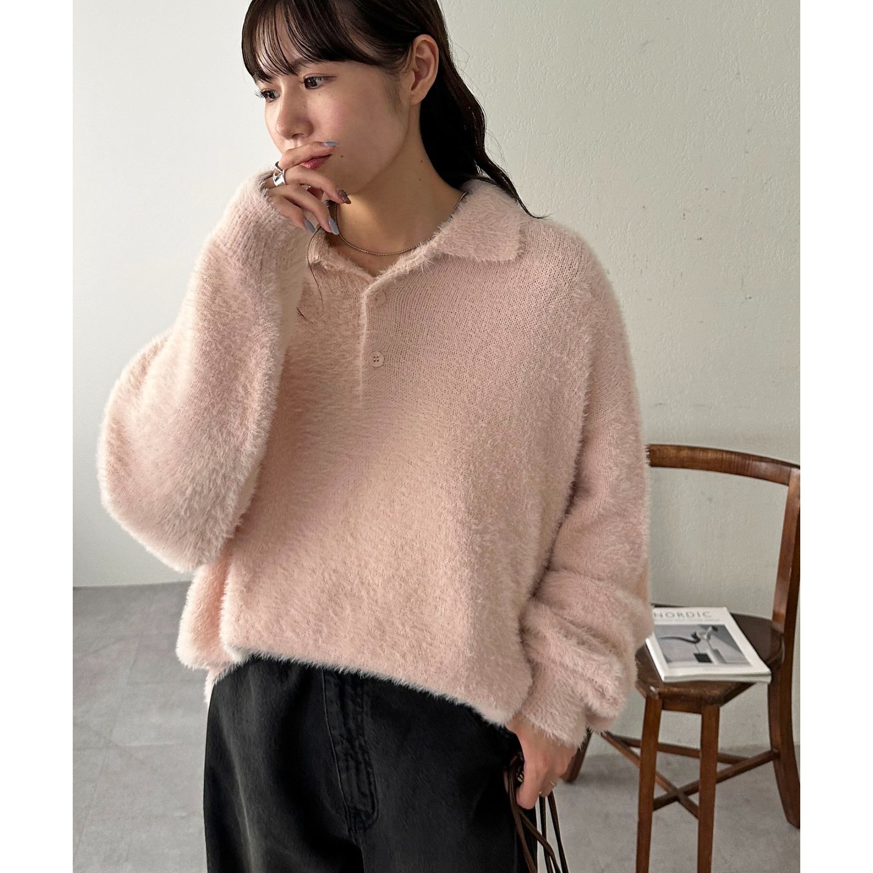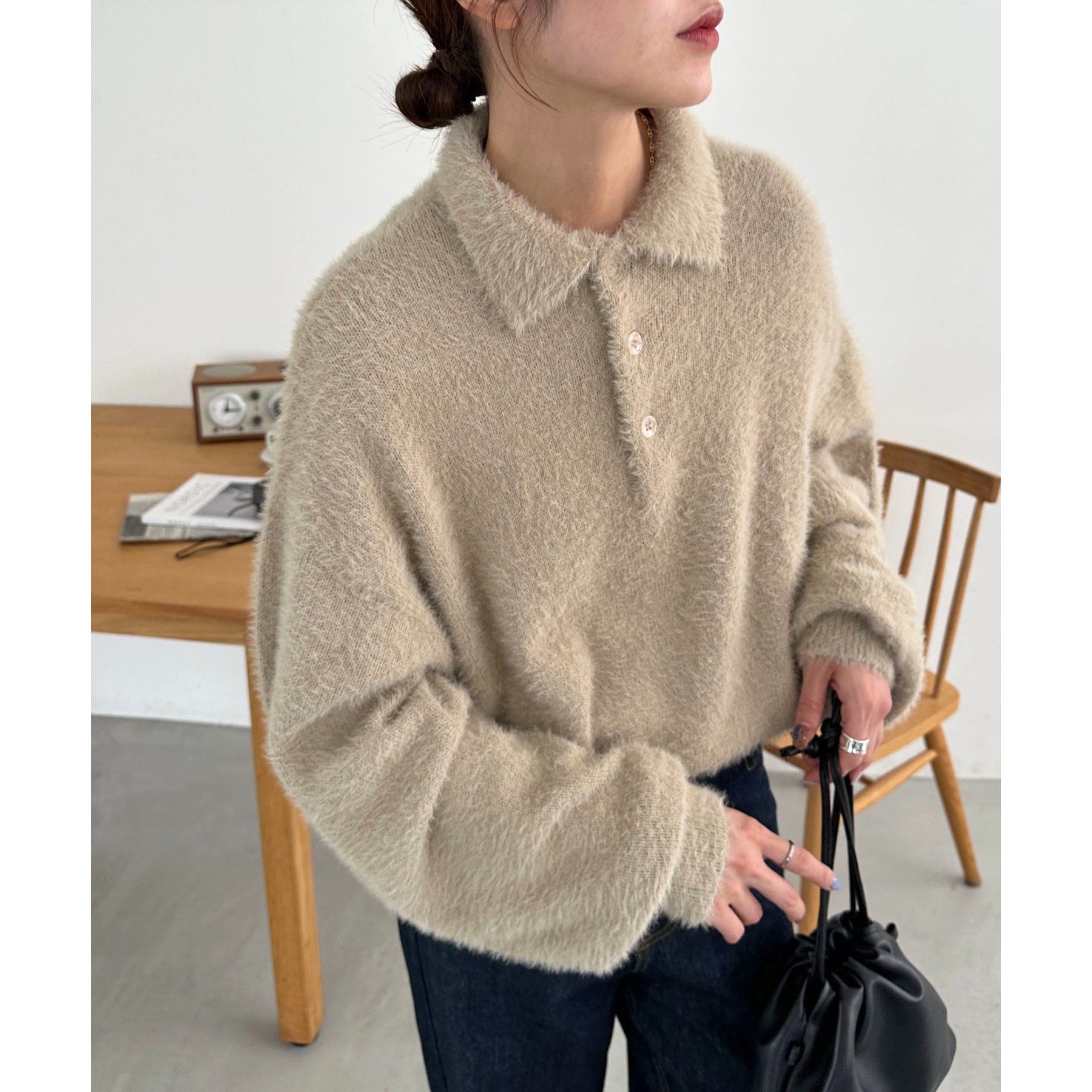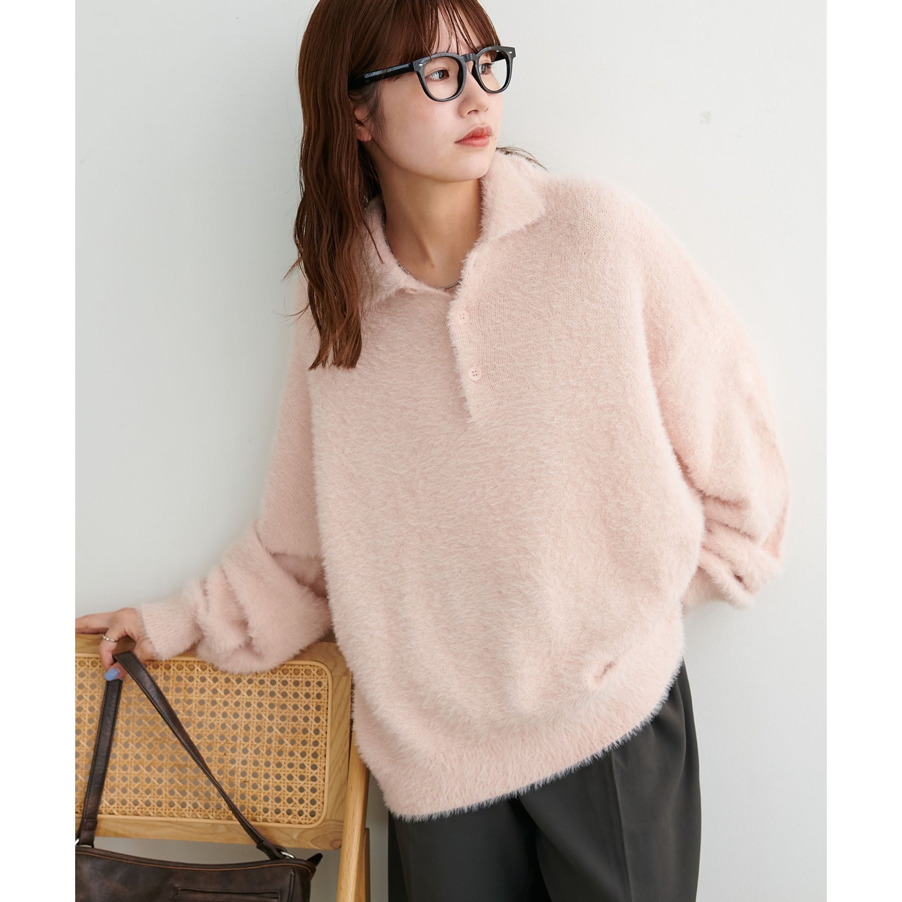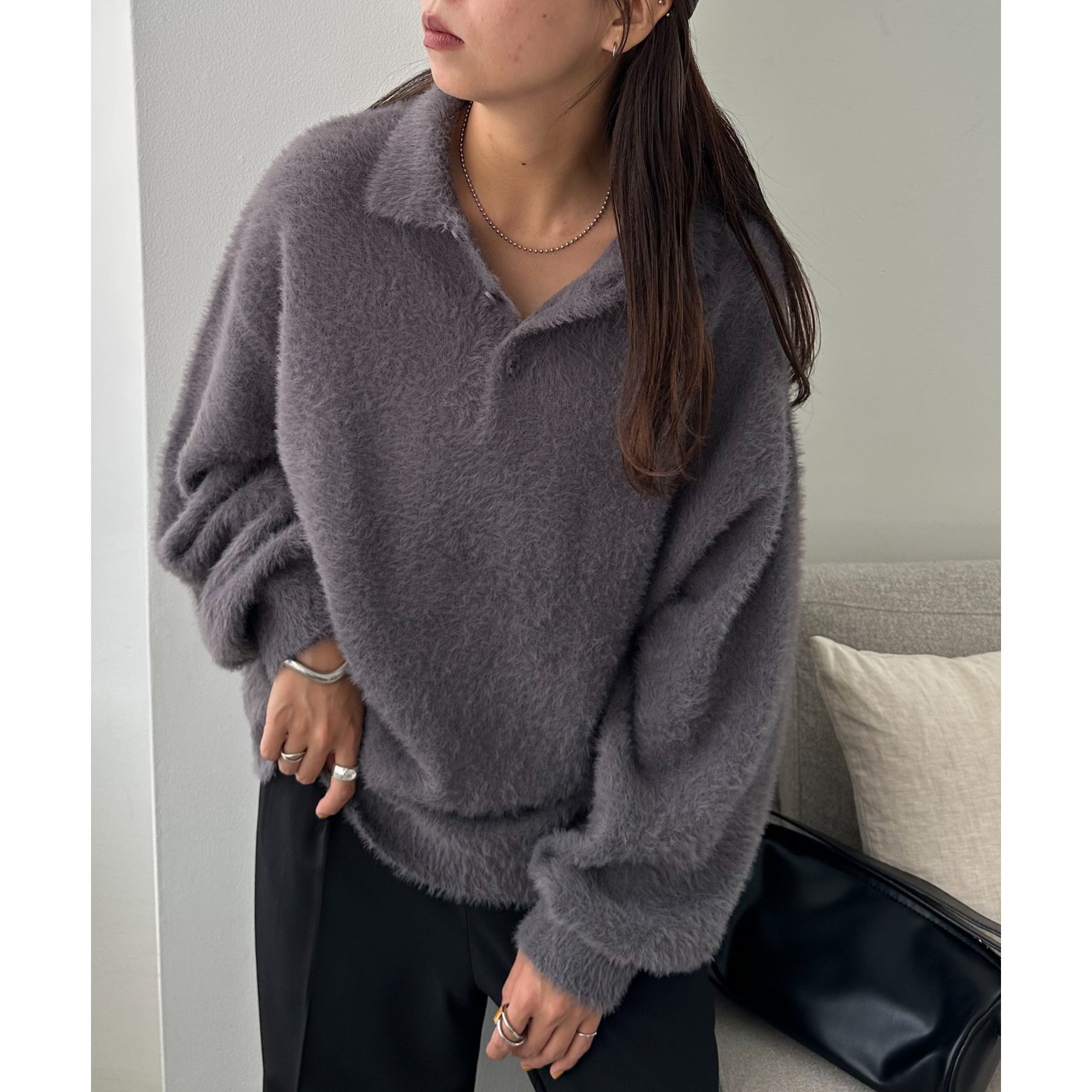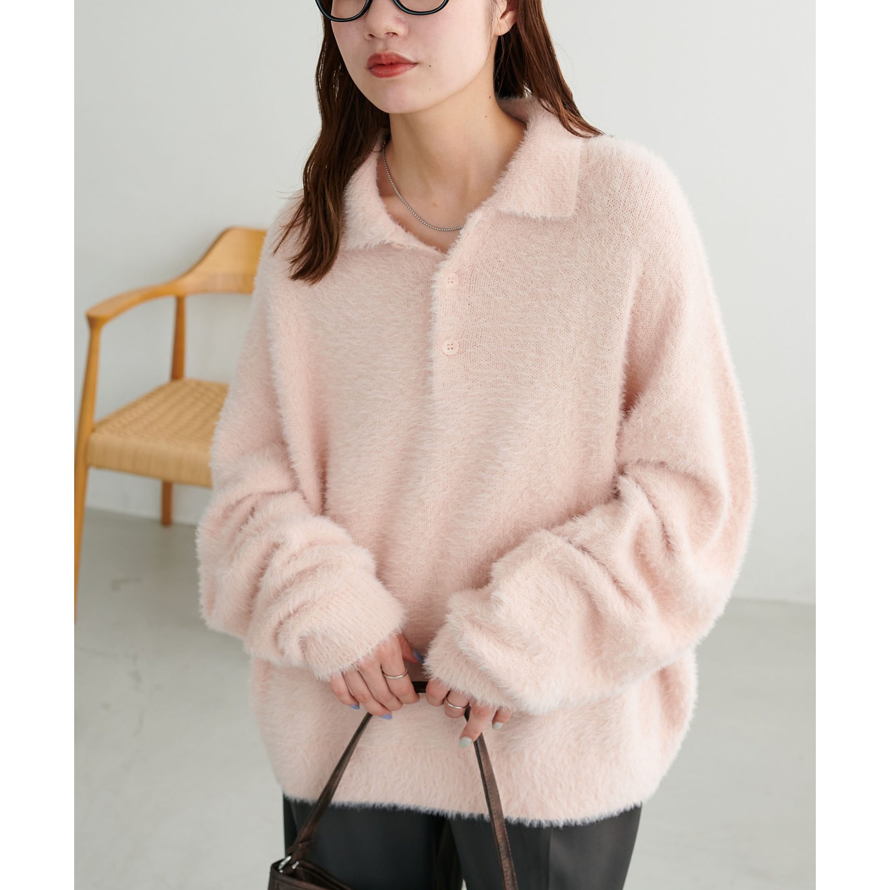 ずっと着ていられるようなふんわりと、手触りのいいミンク調のニットポロ。