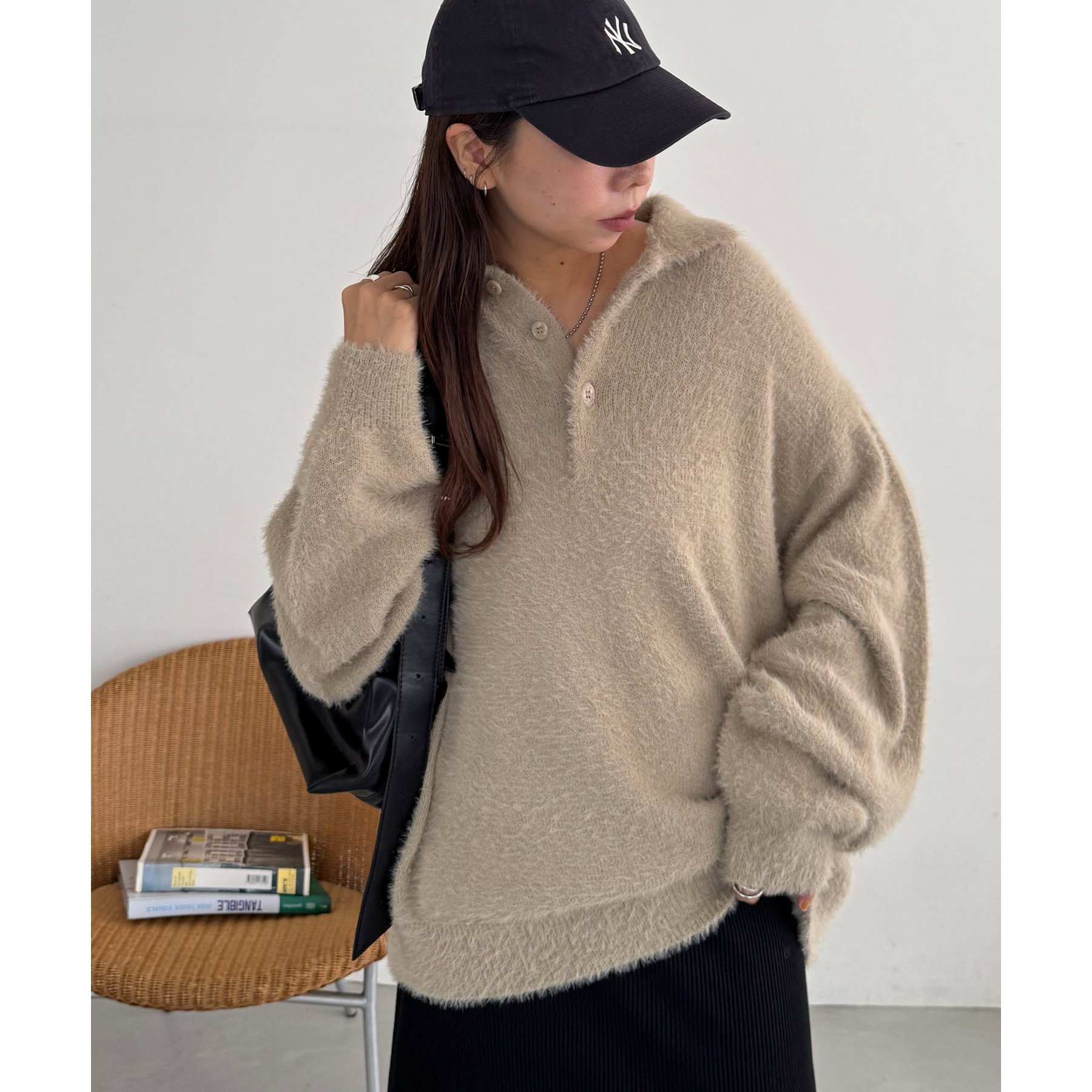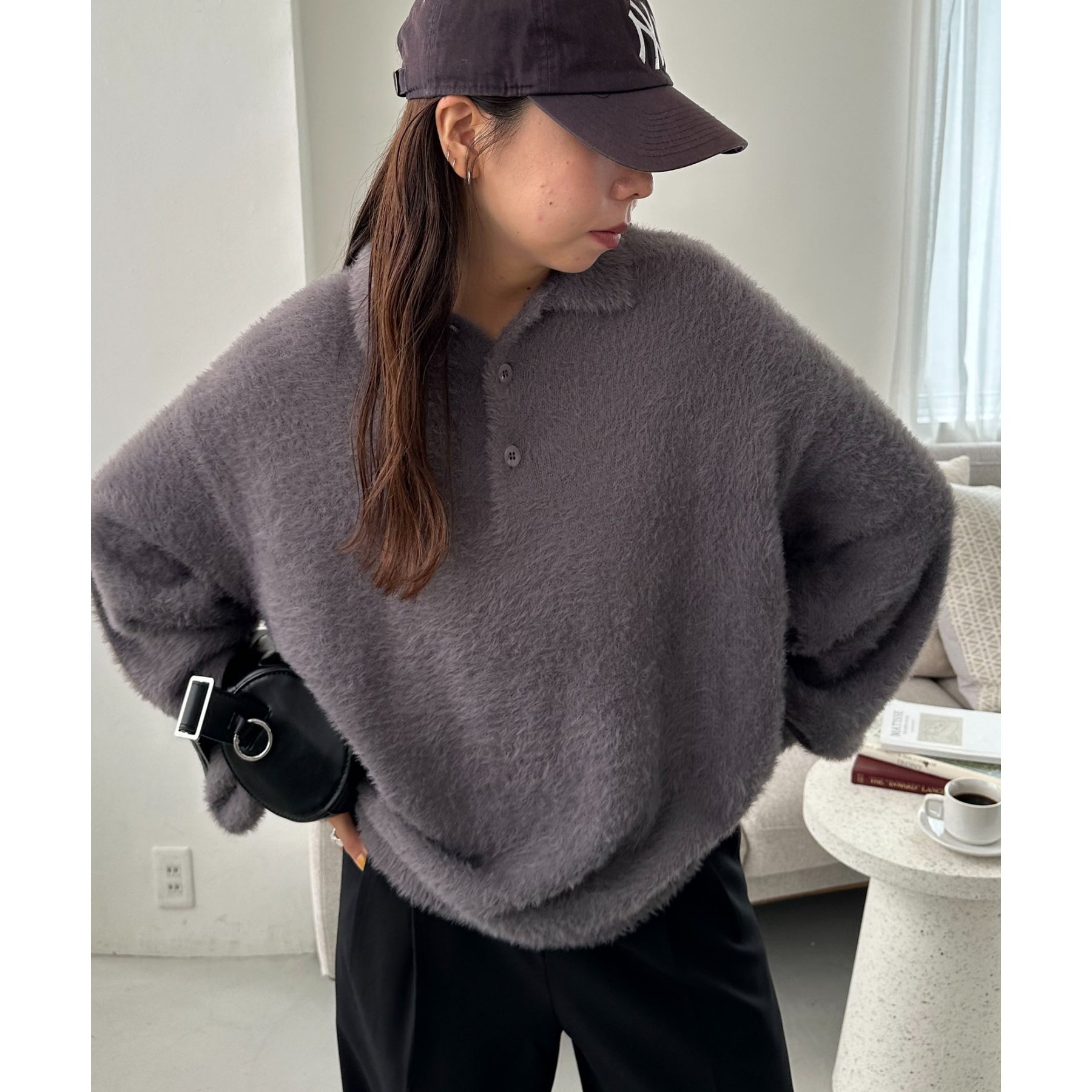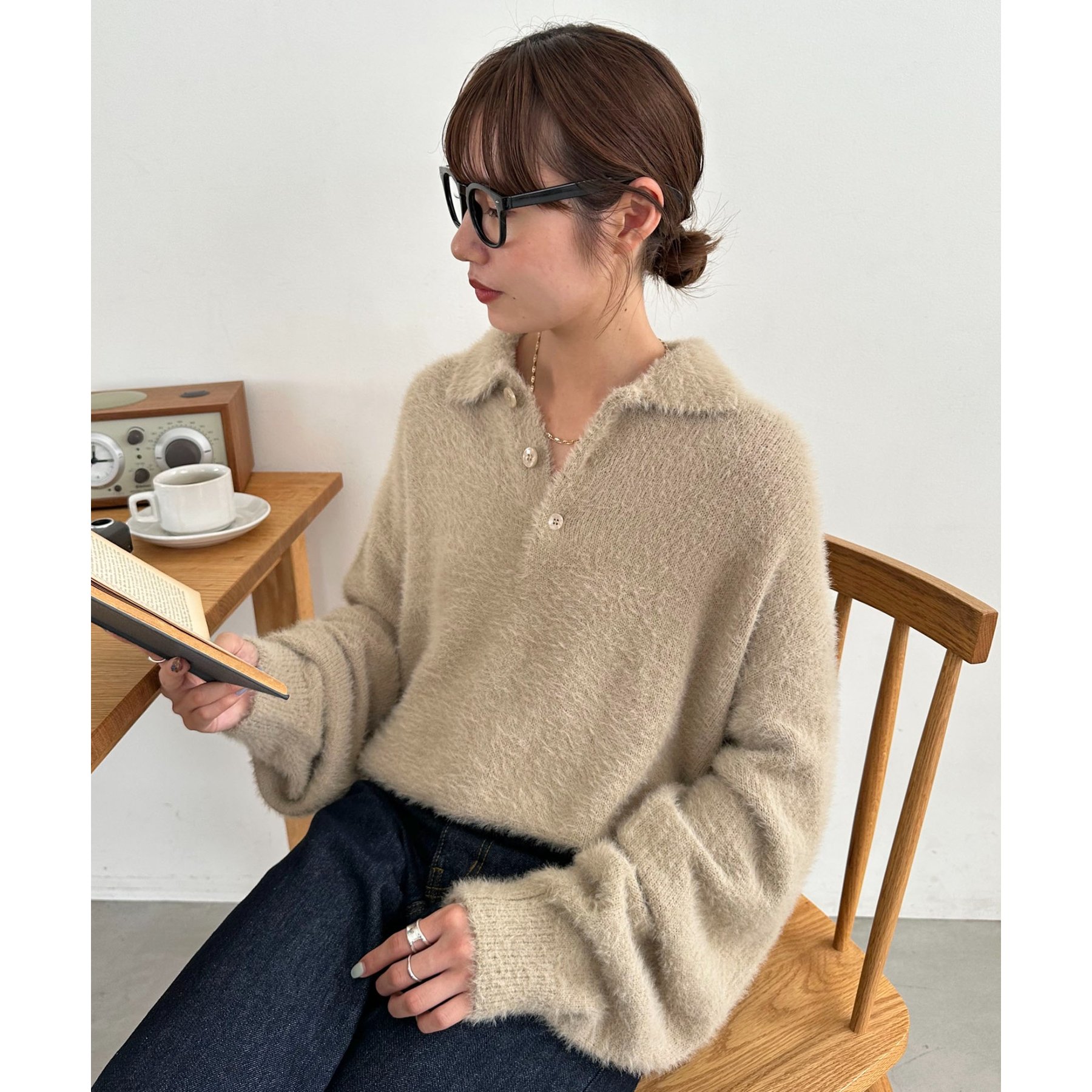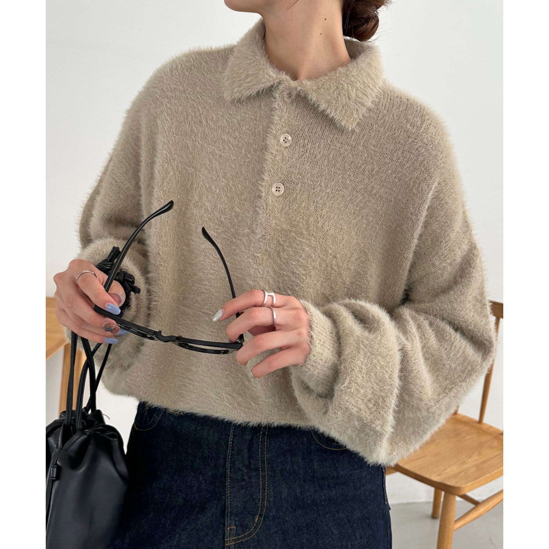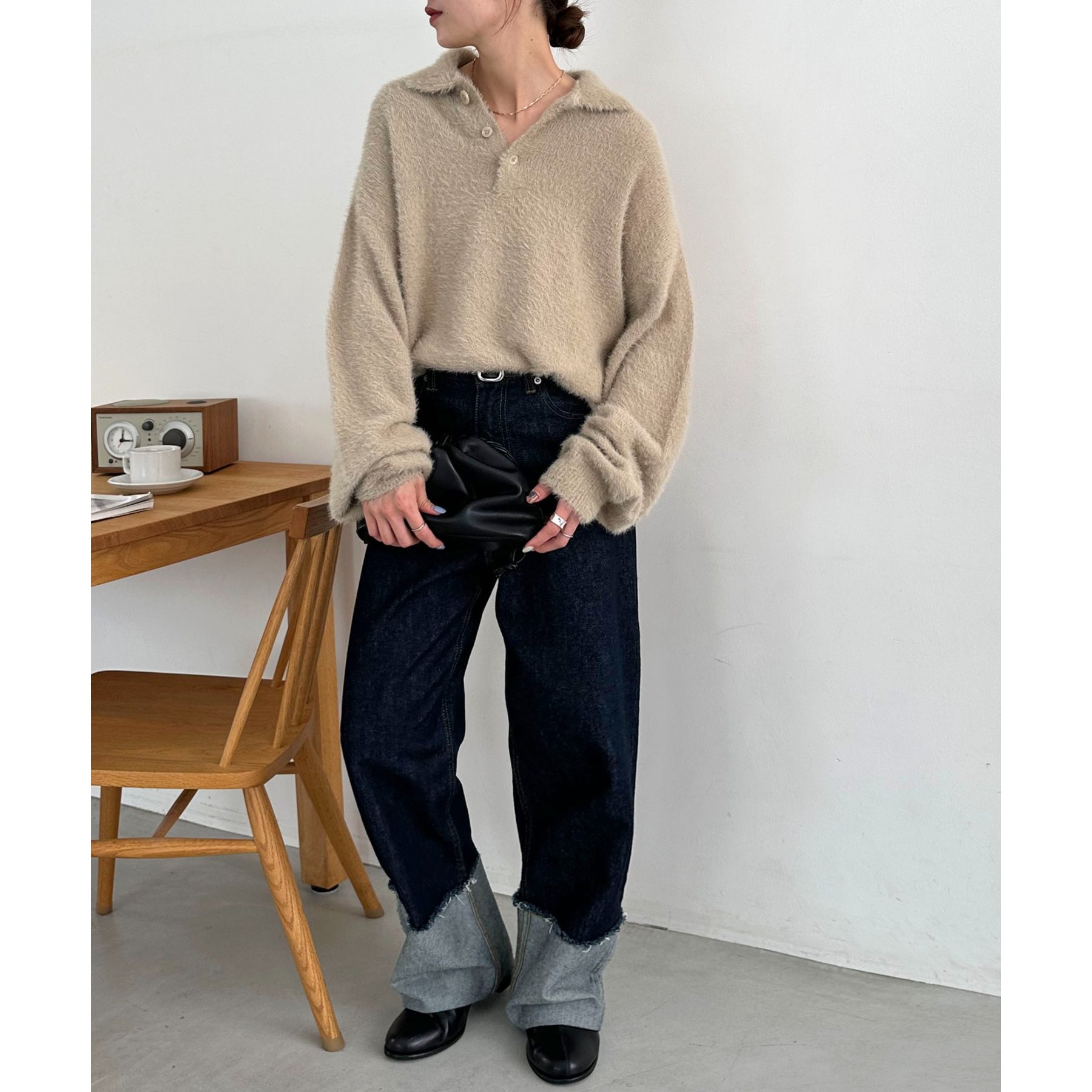 ずっと着ていられるようなふんわりと、手触りのいいミンク調のニットポロ。
