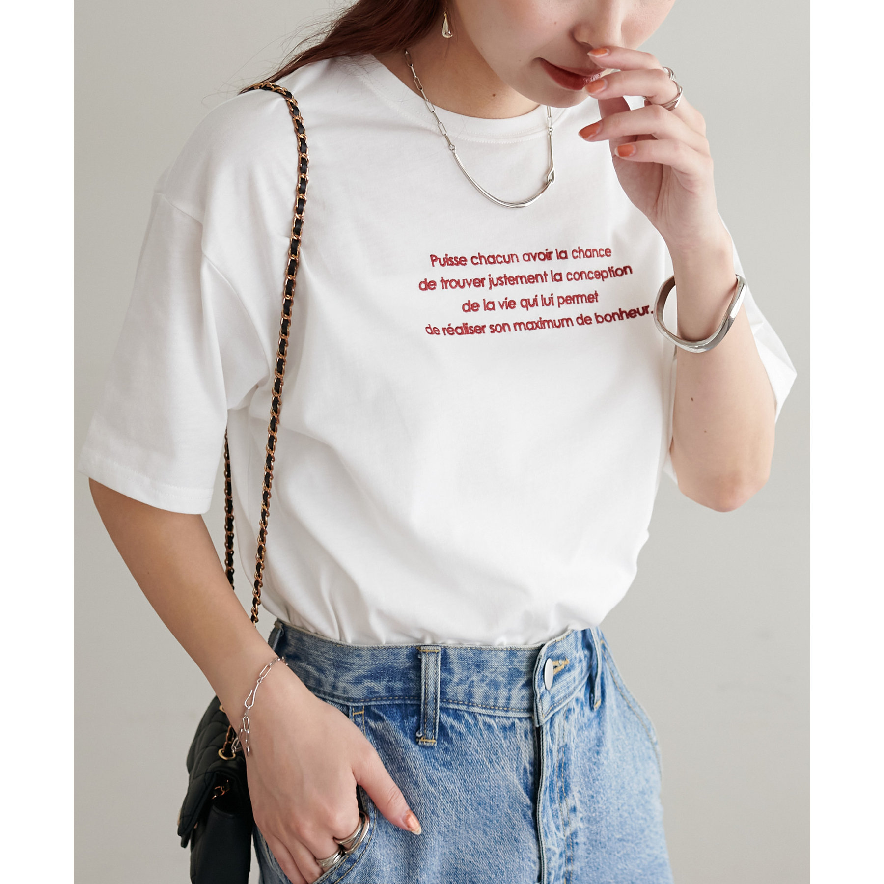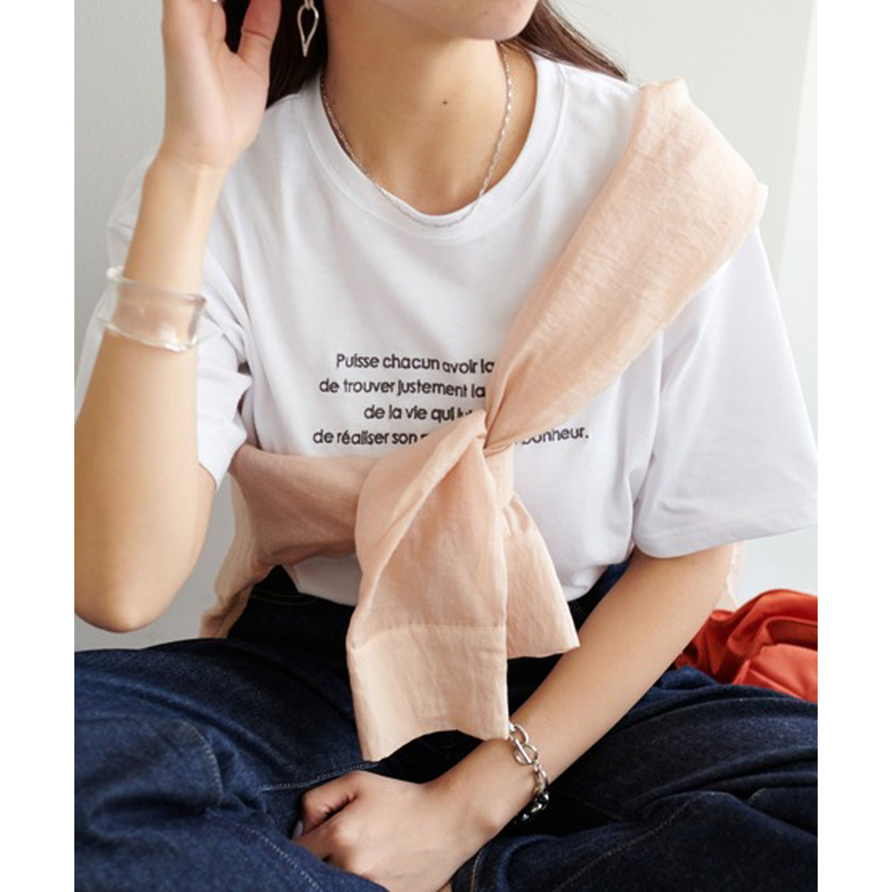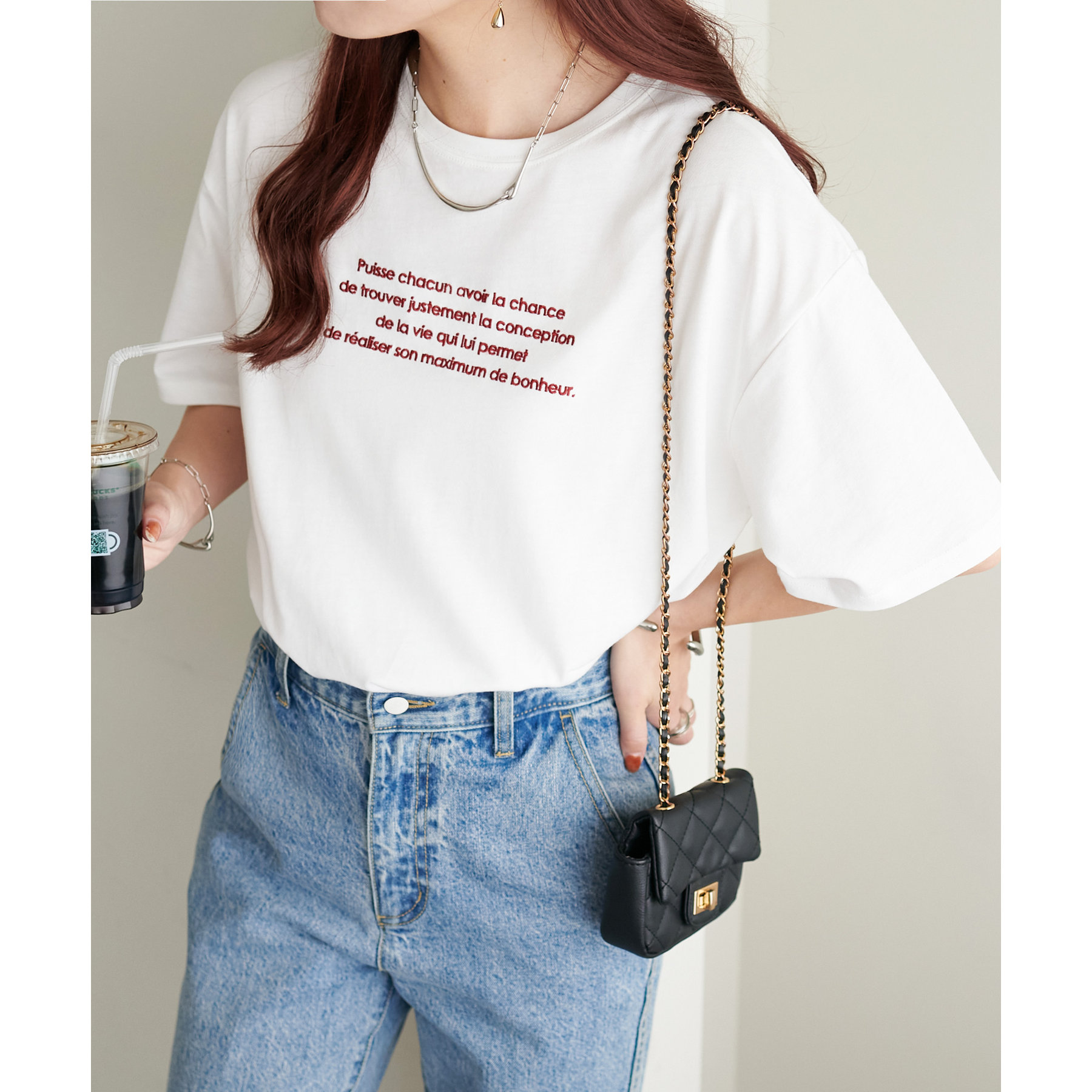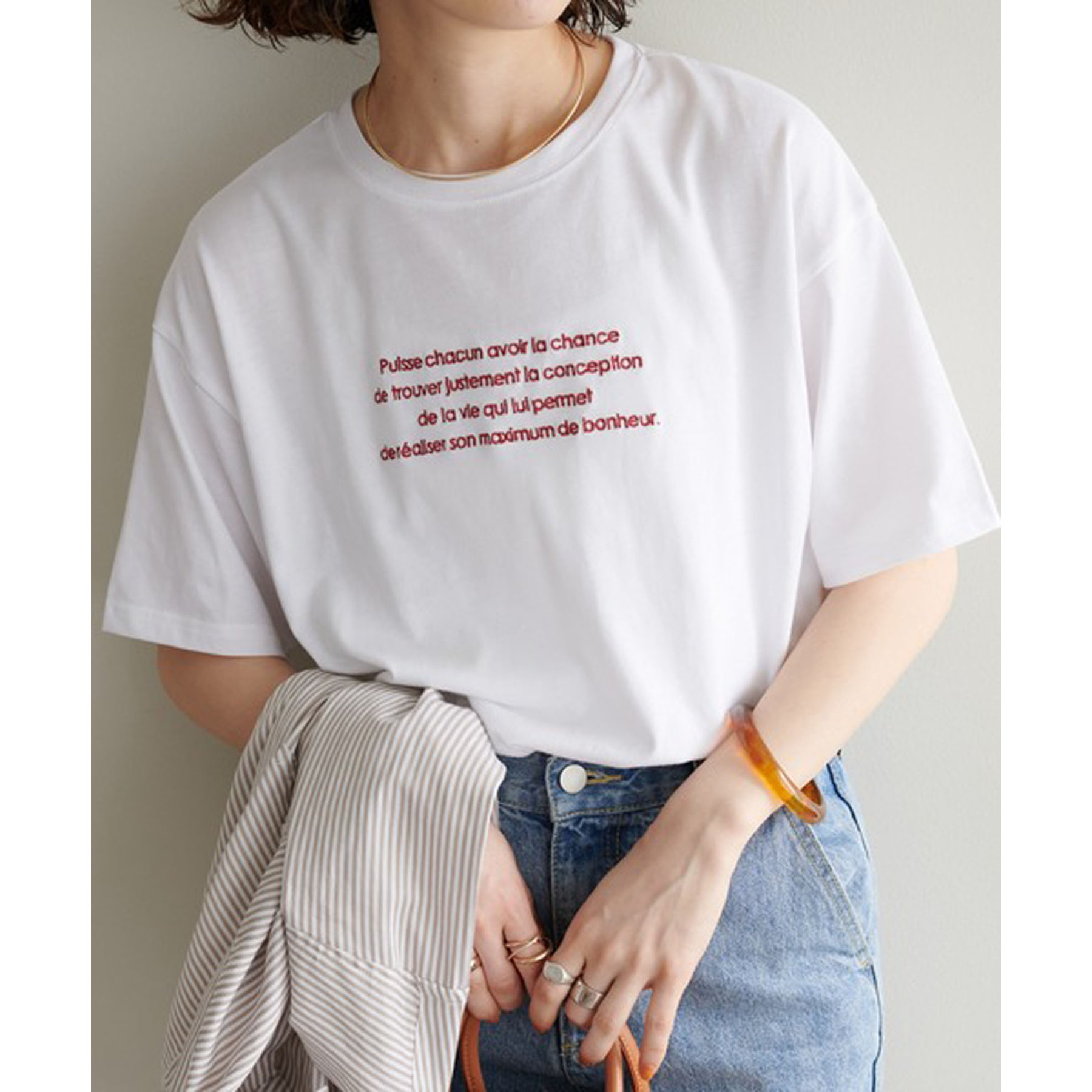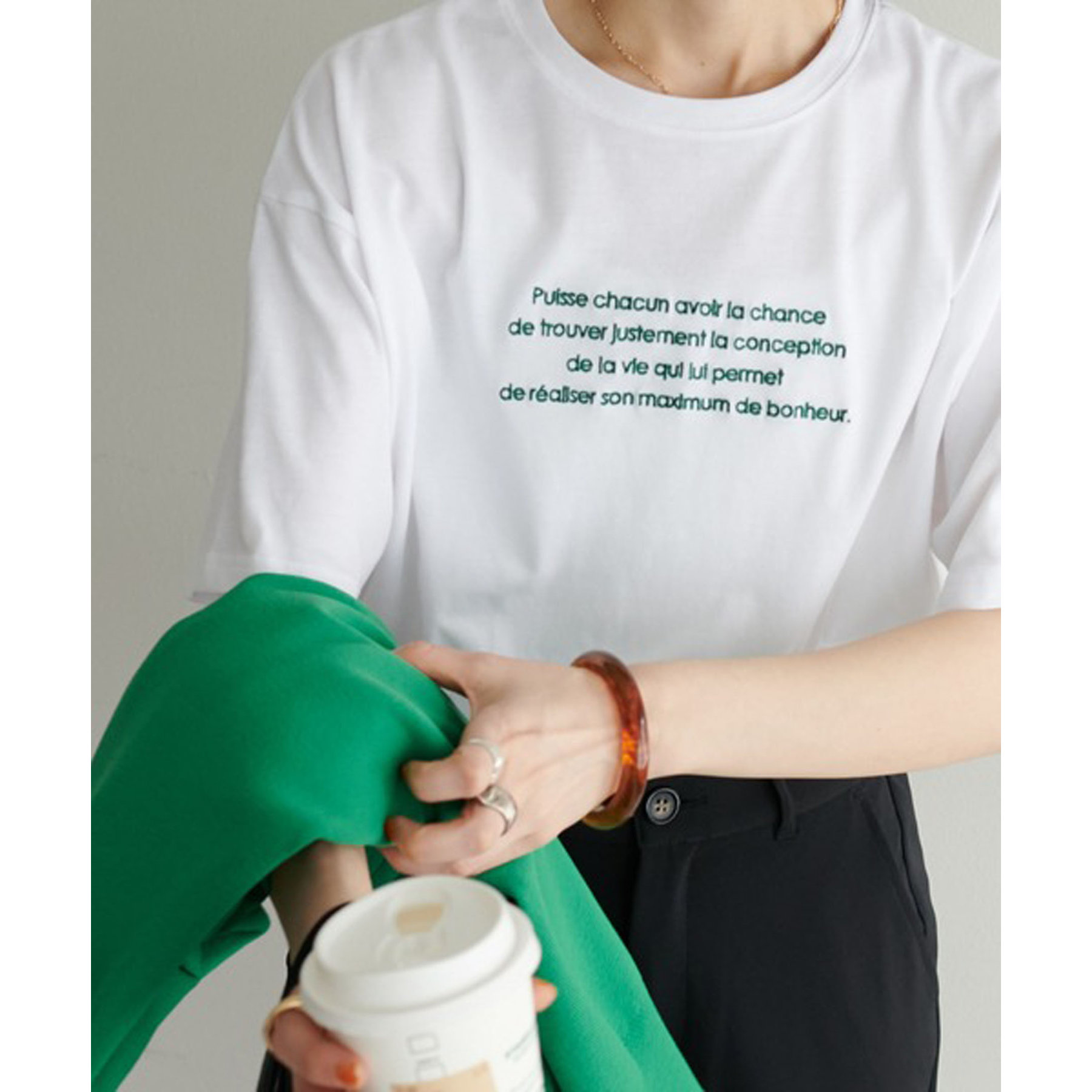メッセージ性がありながらもコーディネートワンポイントになる、フロントのロゴ刺繍が魅力のデザイン。一枚着でも、インナーとしても幅広く着用ができ、無地Tシャツに比べトレンド感ある着こなしが楽しめます。程よくゆったりした女性らしいシルエットで、年代を問わずワードロープにおすすめです◎