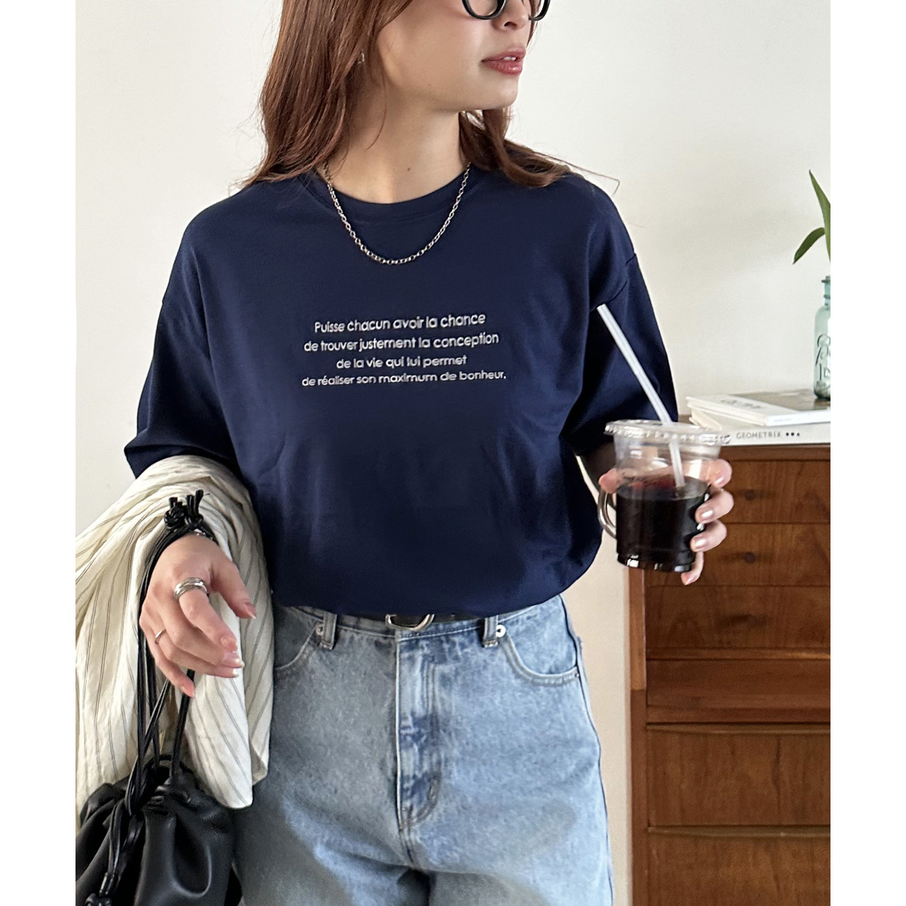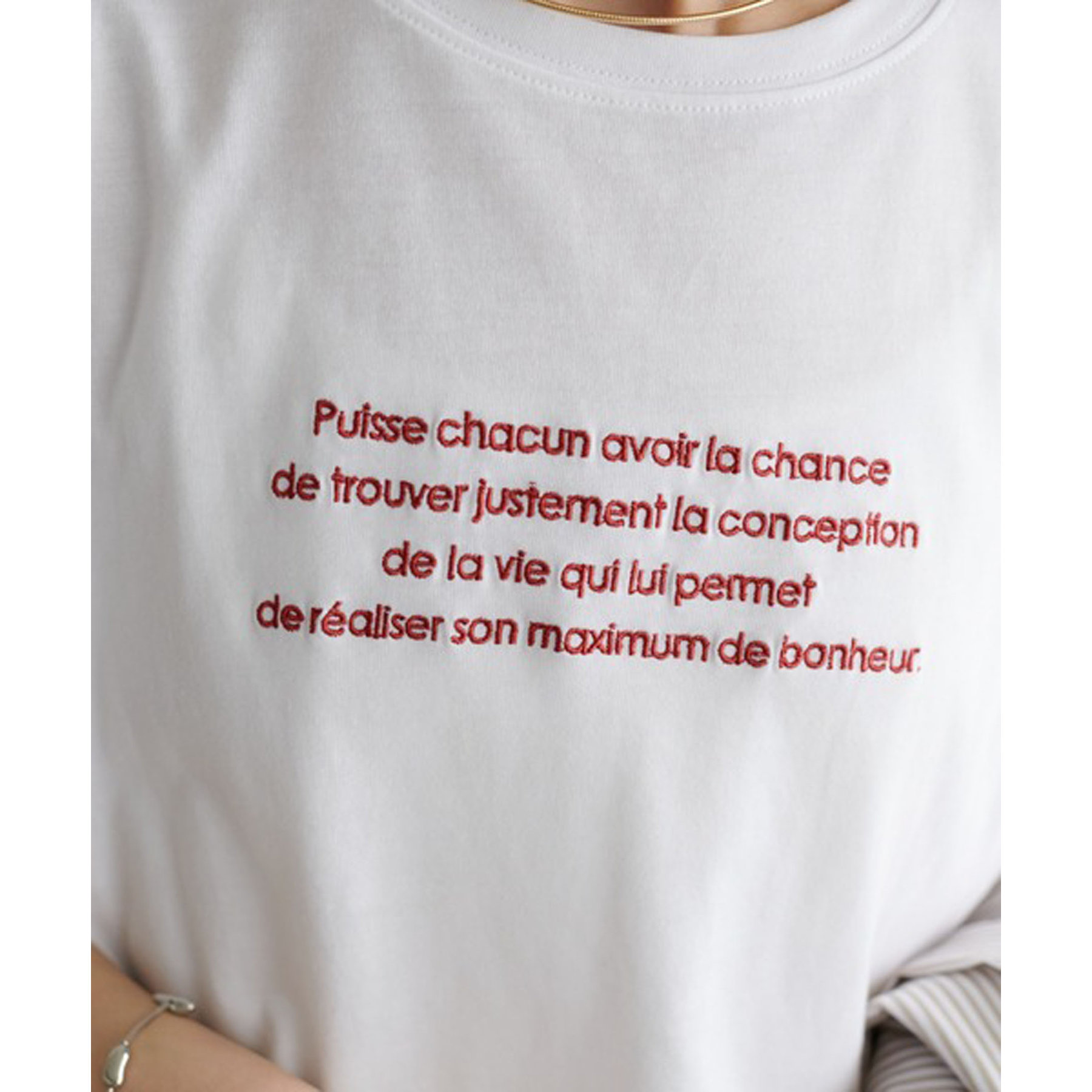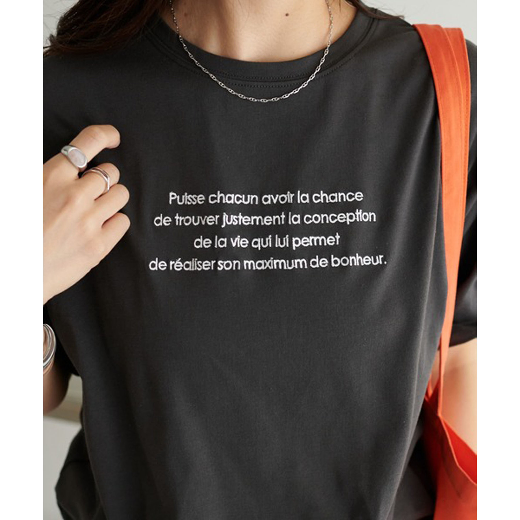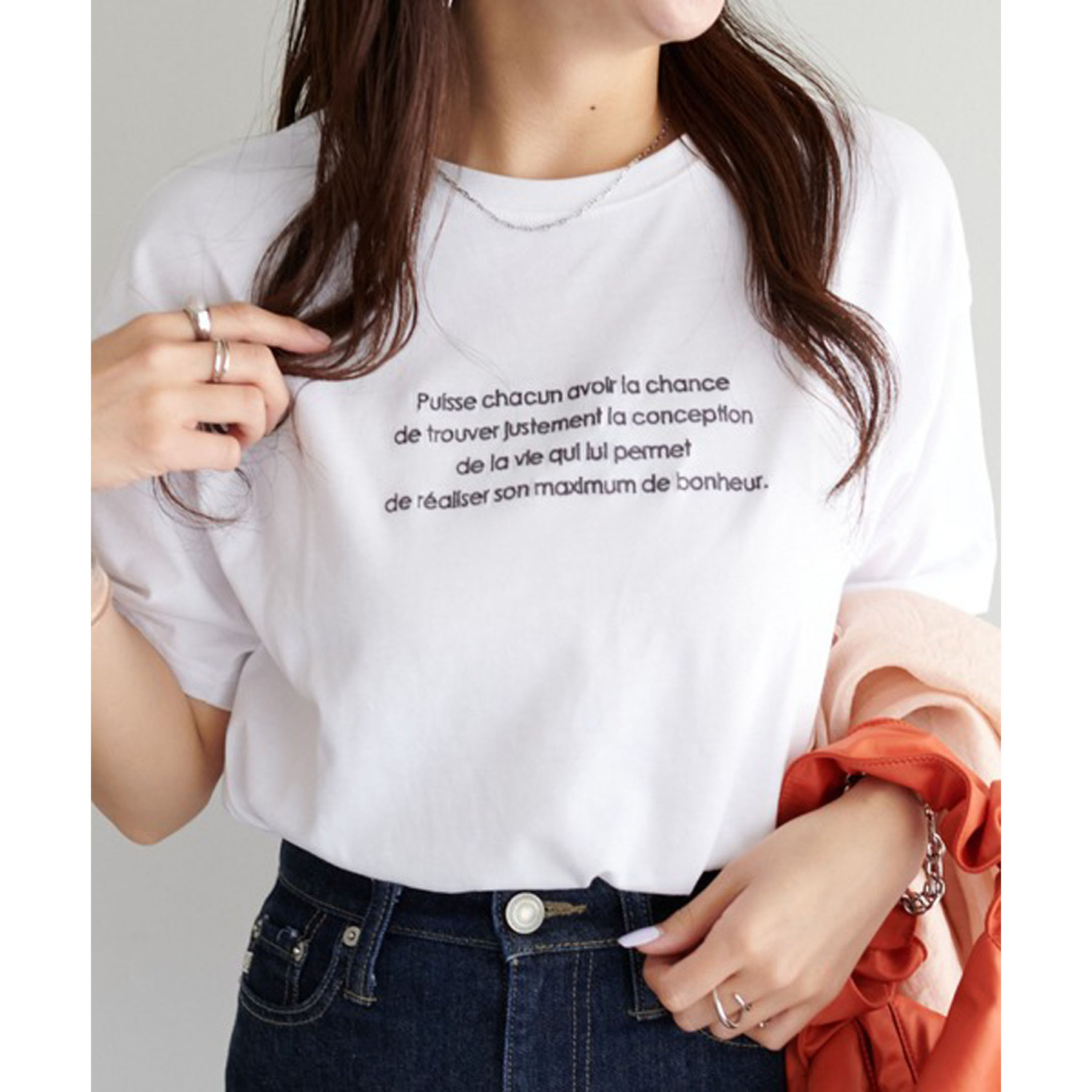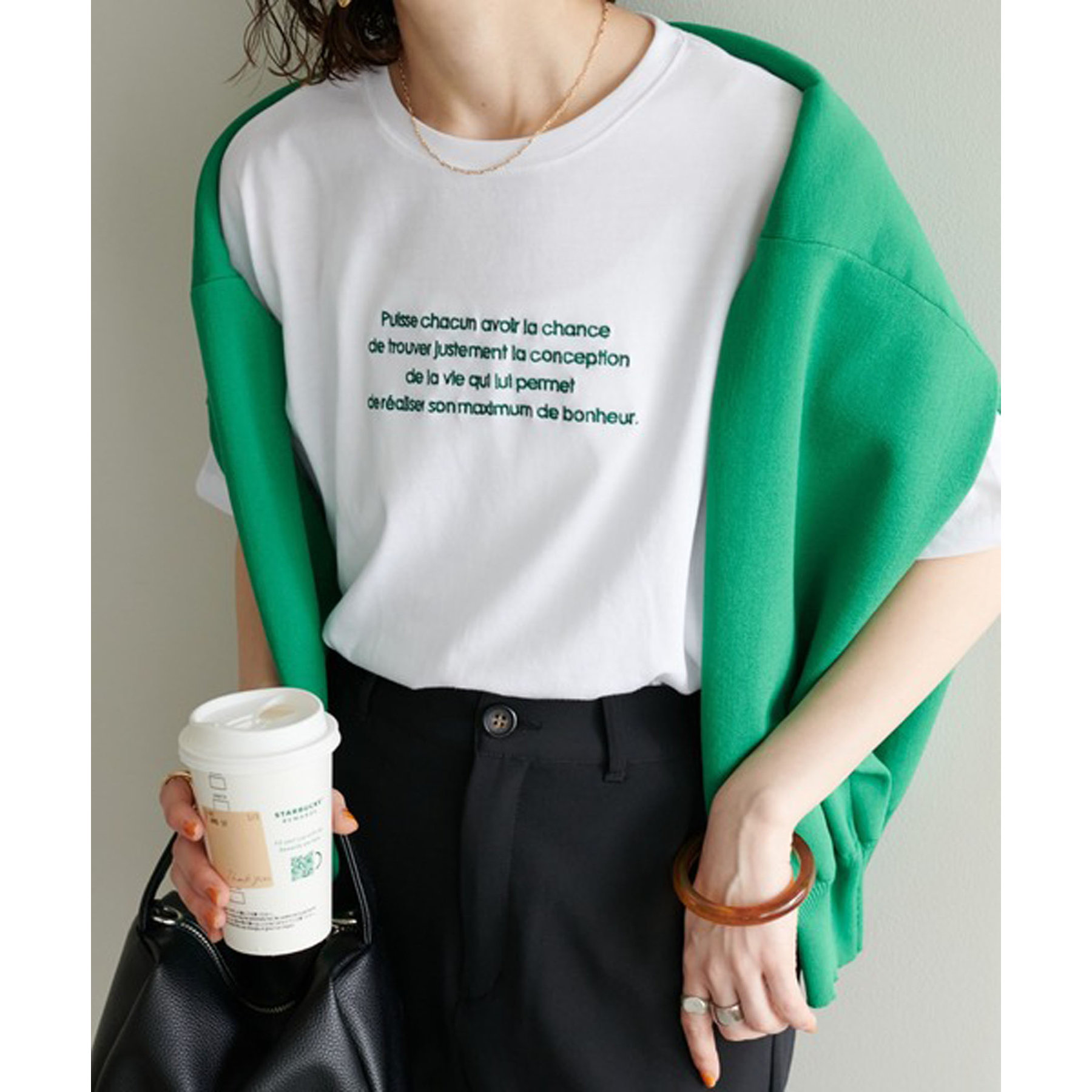 メッセージ性がありながらもコーディネートワンポイントになる、フロントのロゴ刺繍が魅力のデザイン。一枚着でも、インナーとしても幅広く着用ができ、無地Tシャツに比べトレンド感ある着こなしが楽しめます。程よくゆったりした女性らしいシルエットで、年代を問わずワードロープにおすすめです◎