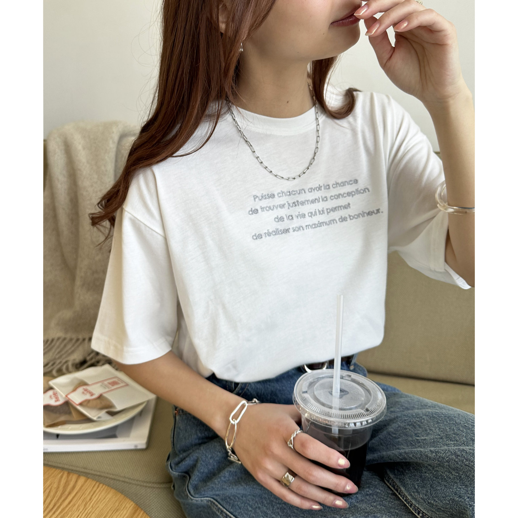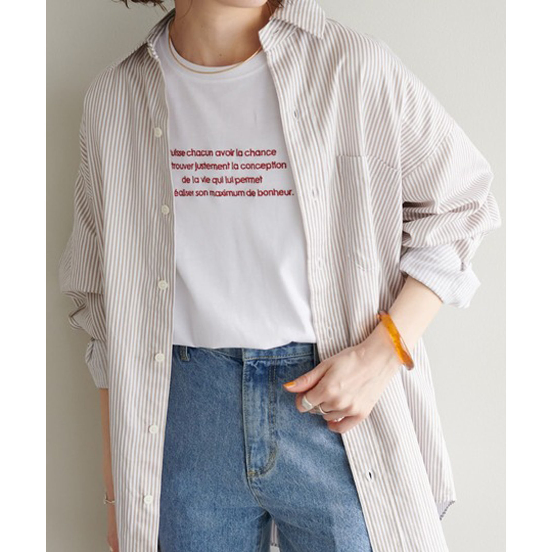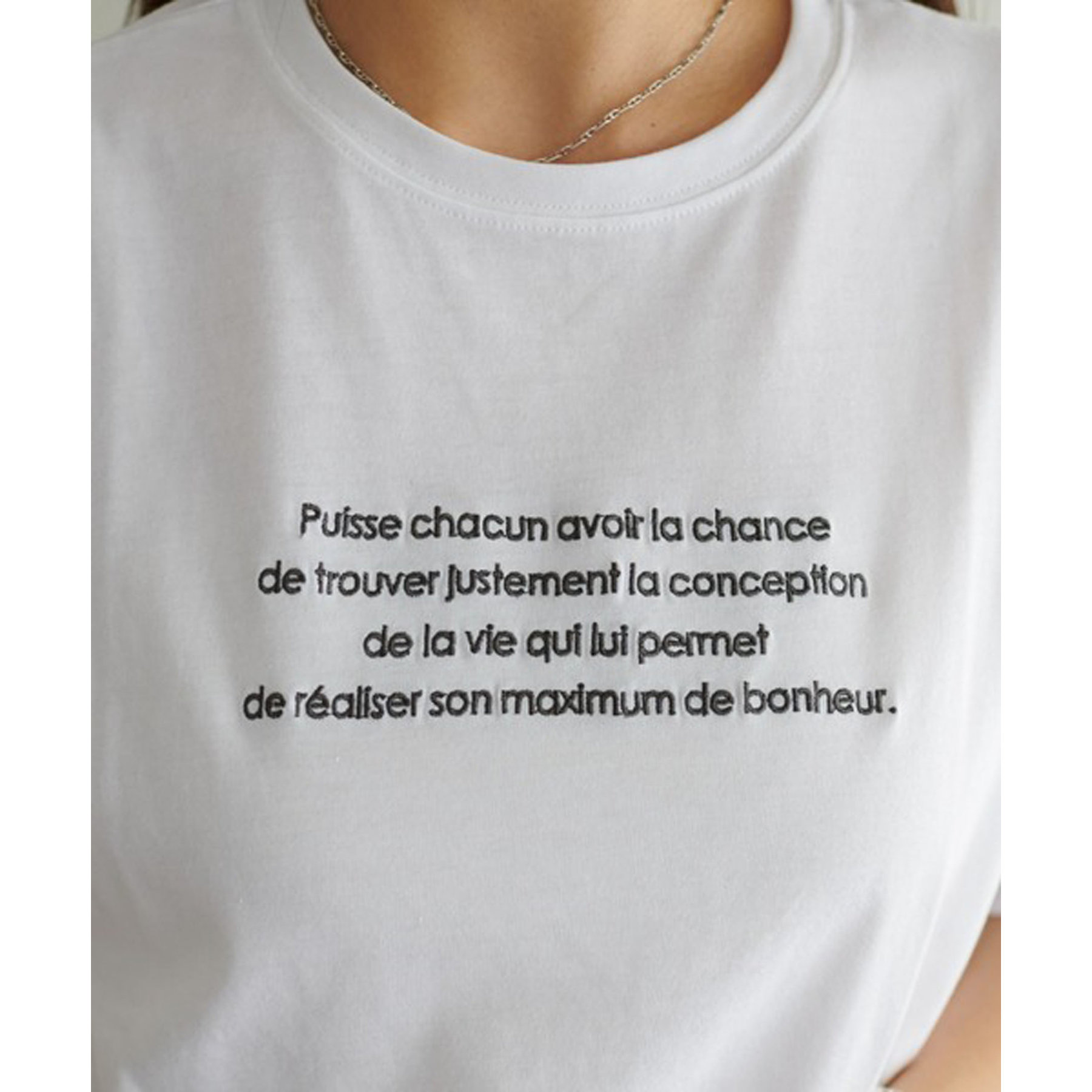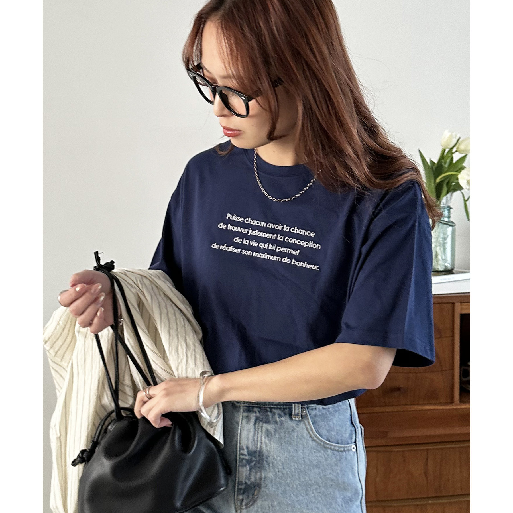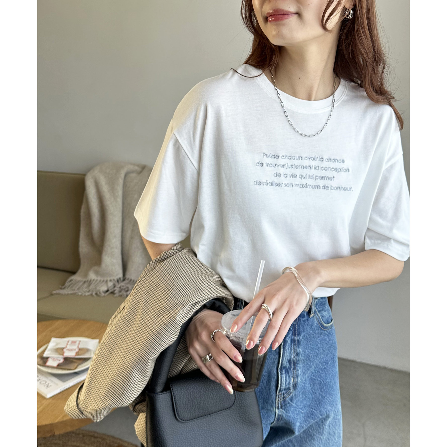 メッセージ性がありながらもコーディネートワンポイントになる、フロントのロゴ刺繍が魅力のデザイン。一枚着でも、インナーとしても幅広く着用ができ、無地Tシャツに比べトレンド感ある着こなしが楽しめます。程よくゆったりした女性らしいシルエットで、年代を問わずワードロープにおすすめです◎