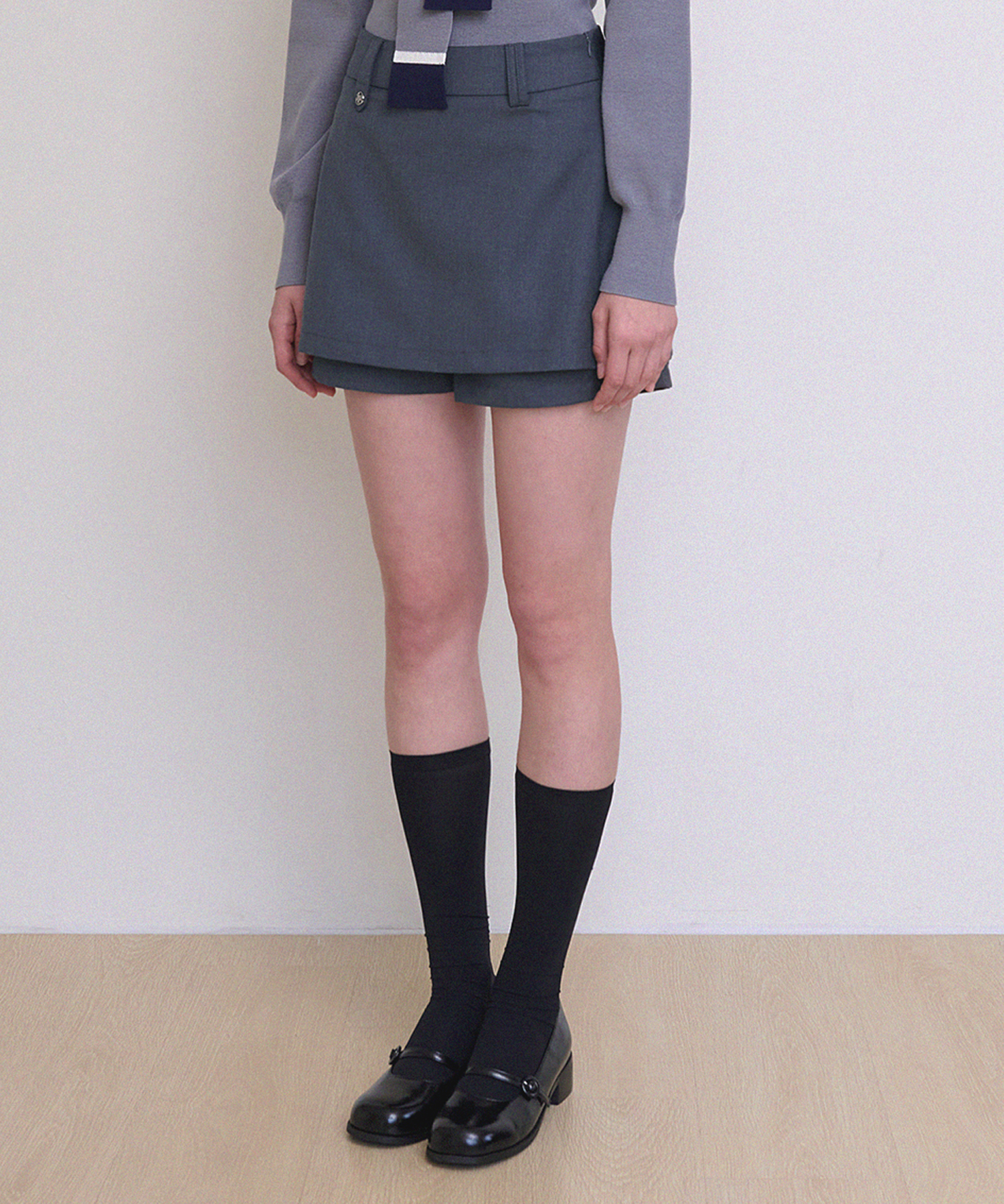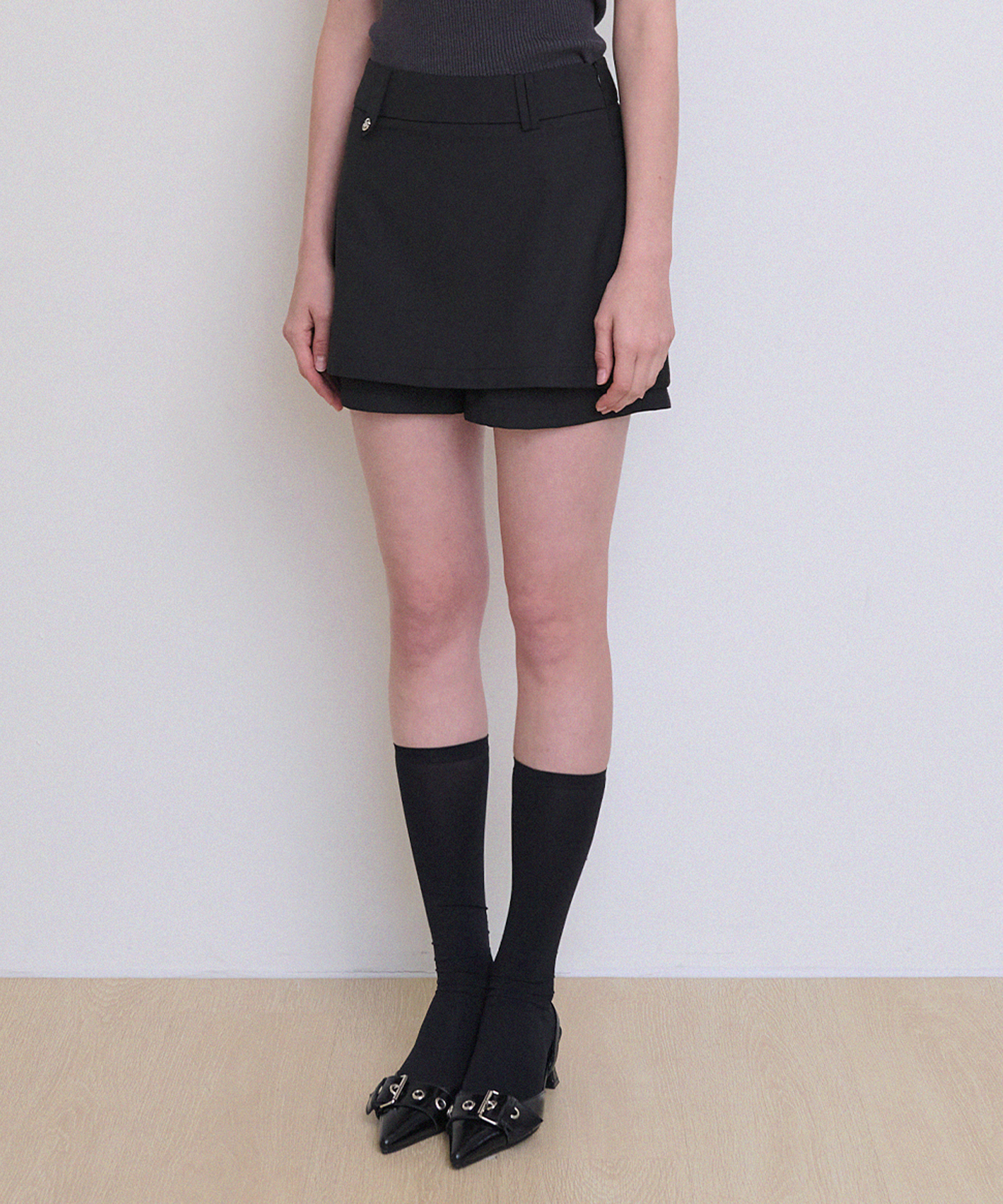 ローライズショートパンツの上にミニスカートがレイヤードされたスタイルでトレンディで