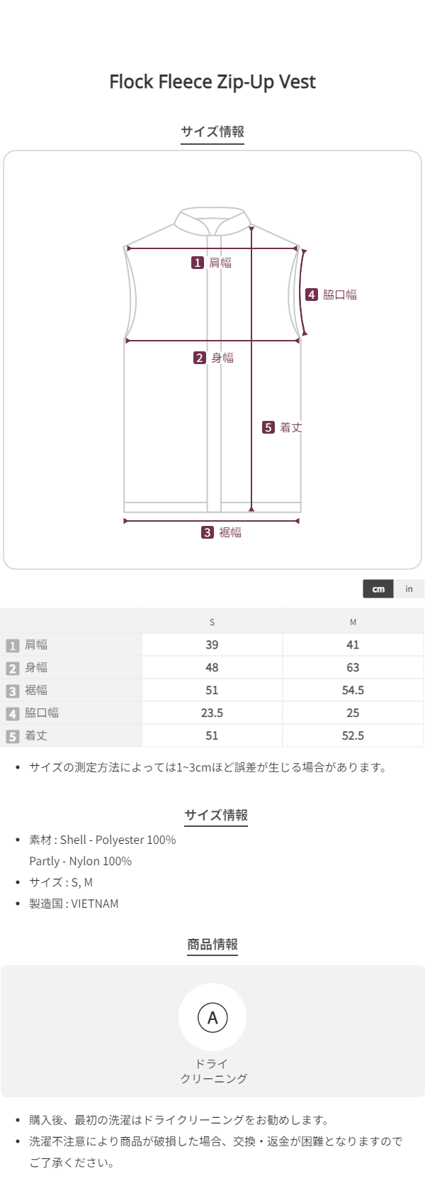 ※ フリースの特性のせいで、保管や着用時に毛落ちが発生する場合があります。