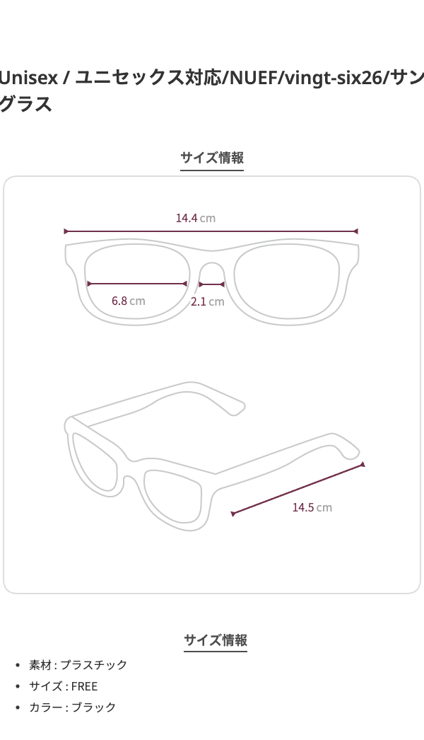 フレーム正面144mmレンズ横68mm ブリッジ21mmテンプル長さ145mm素材:プラスチック