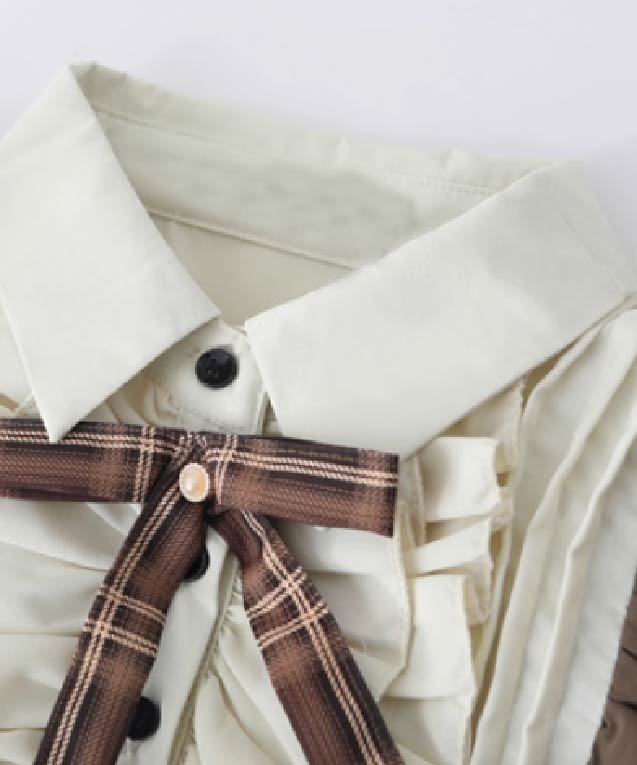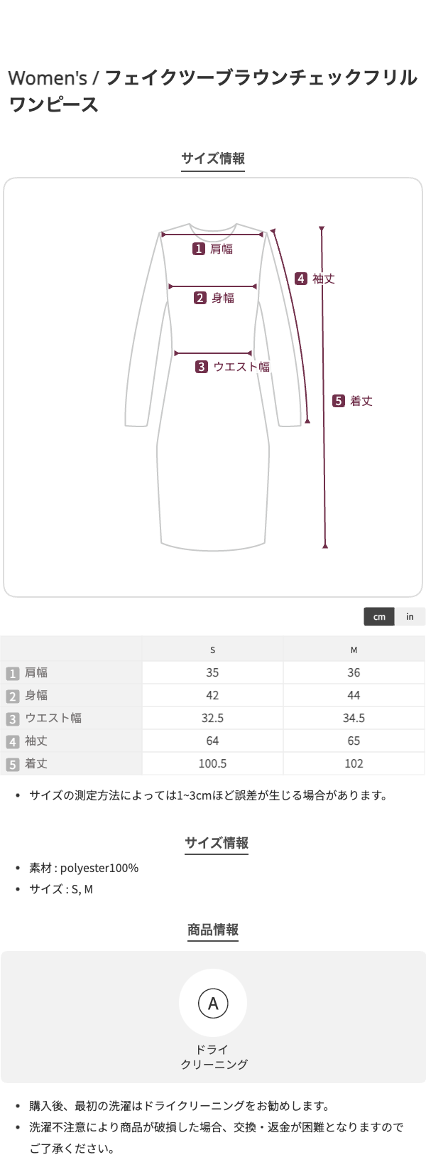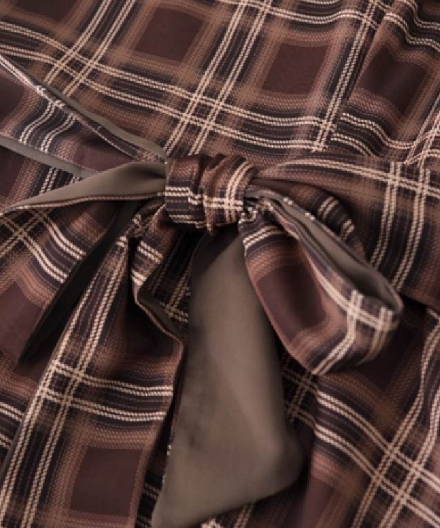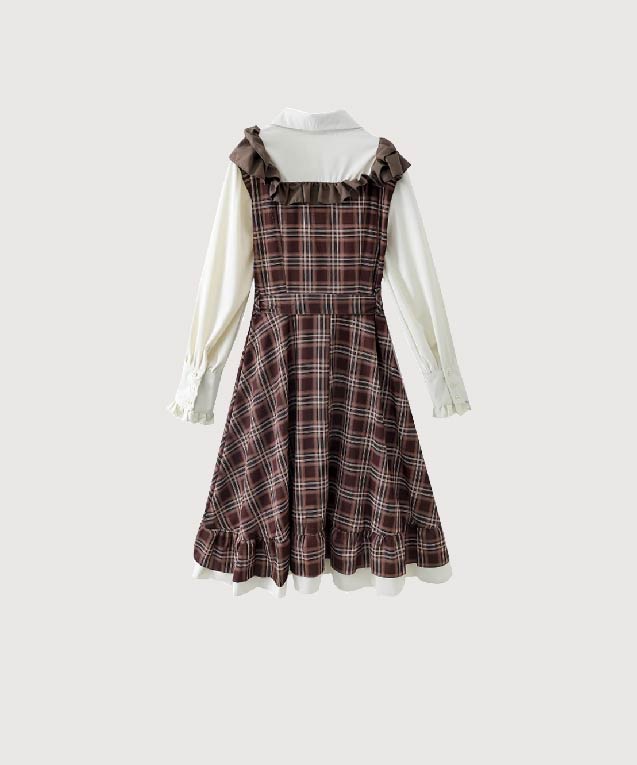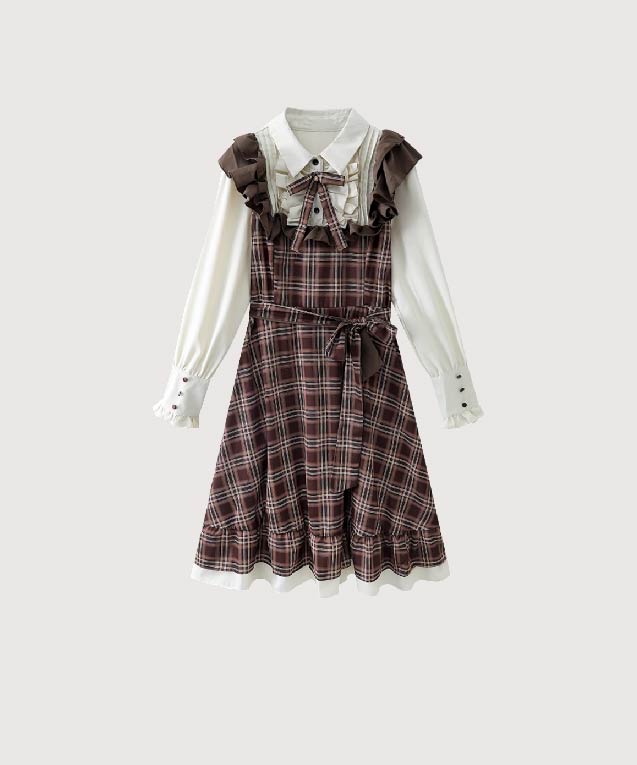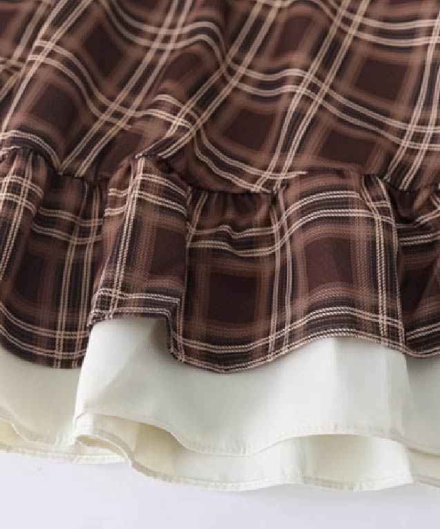 フェイクツーブラウンチェックフリルワンピース