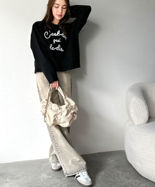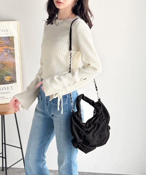 チェーンでモード感プラスし、ギャザーの立体感がトレンドライク。