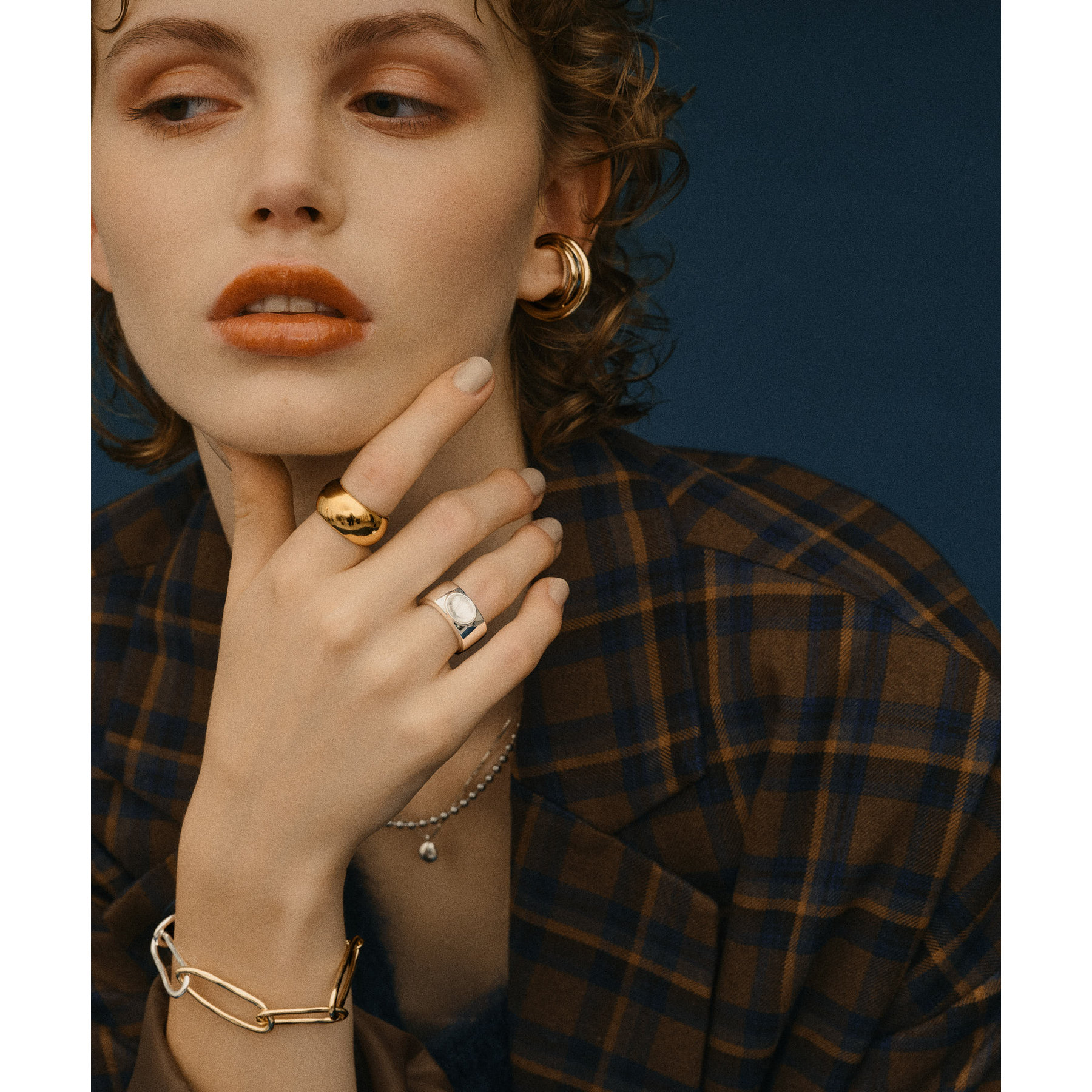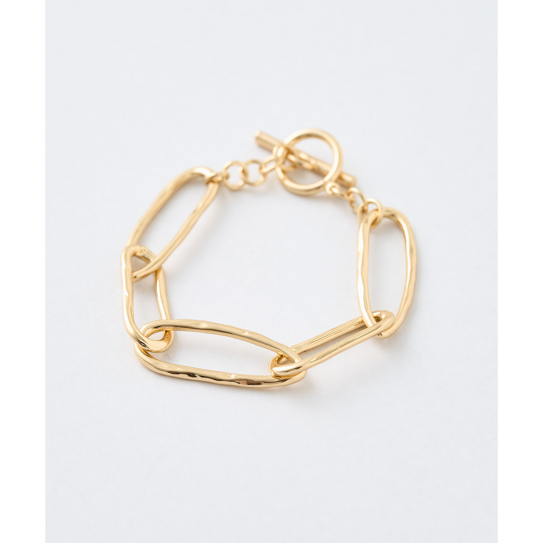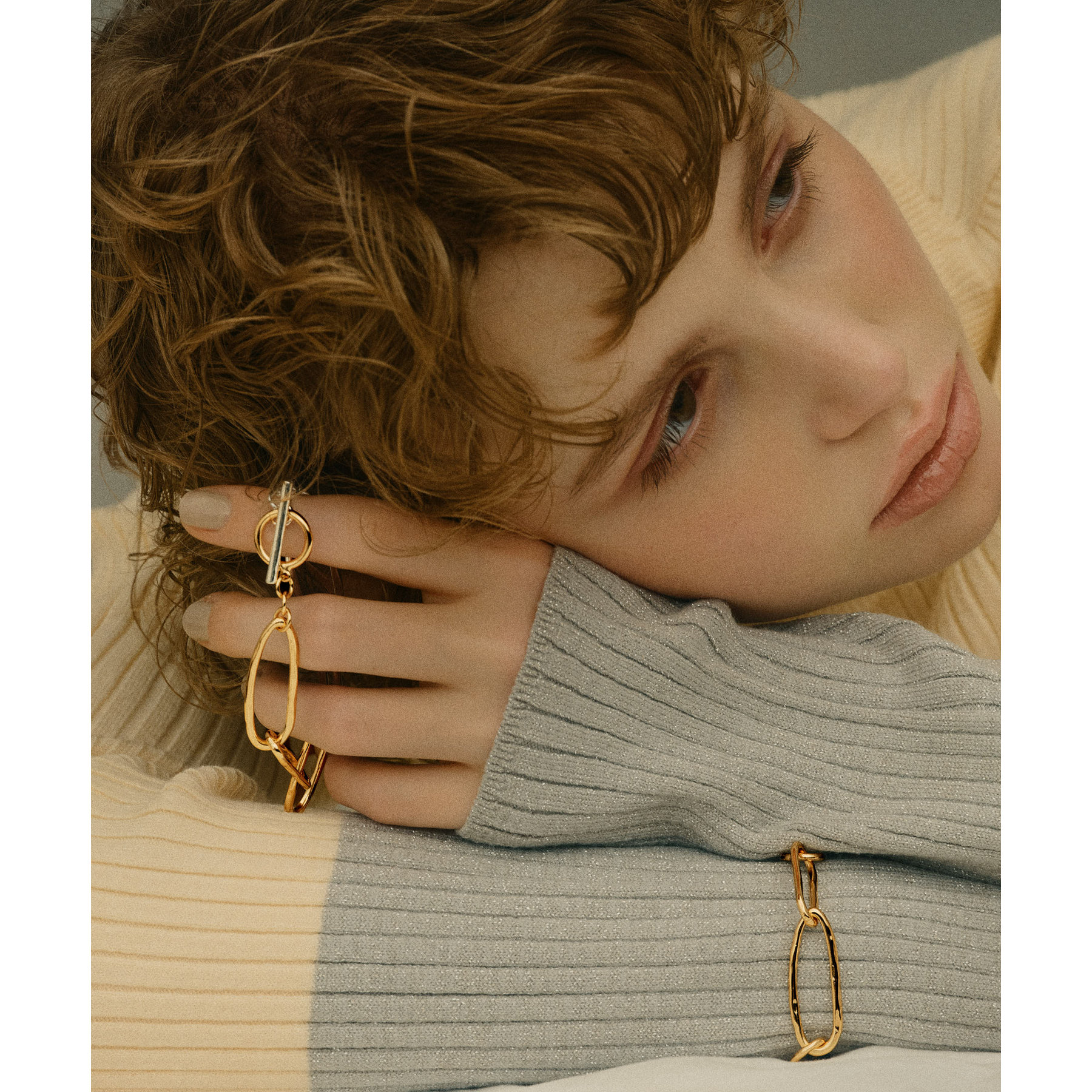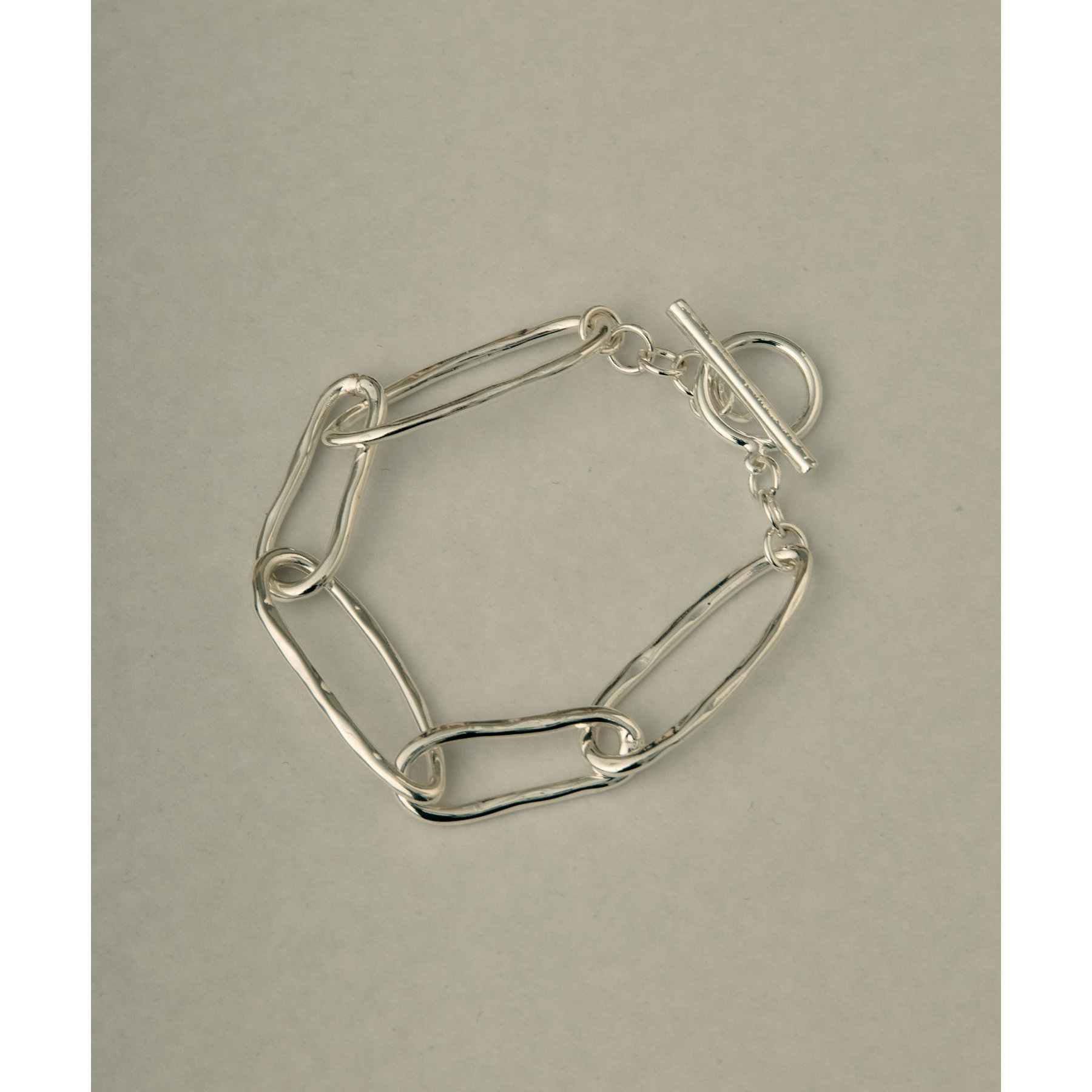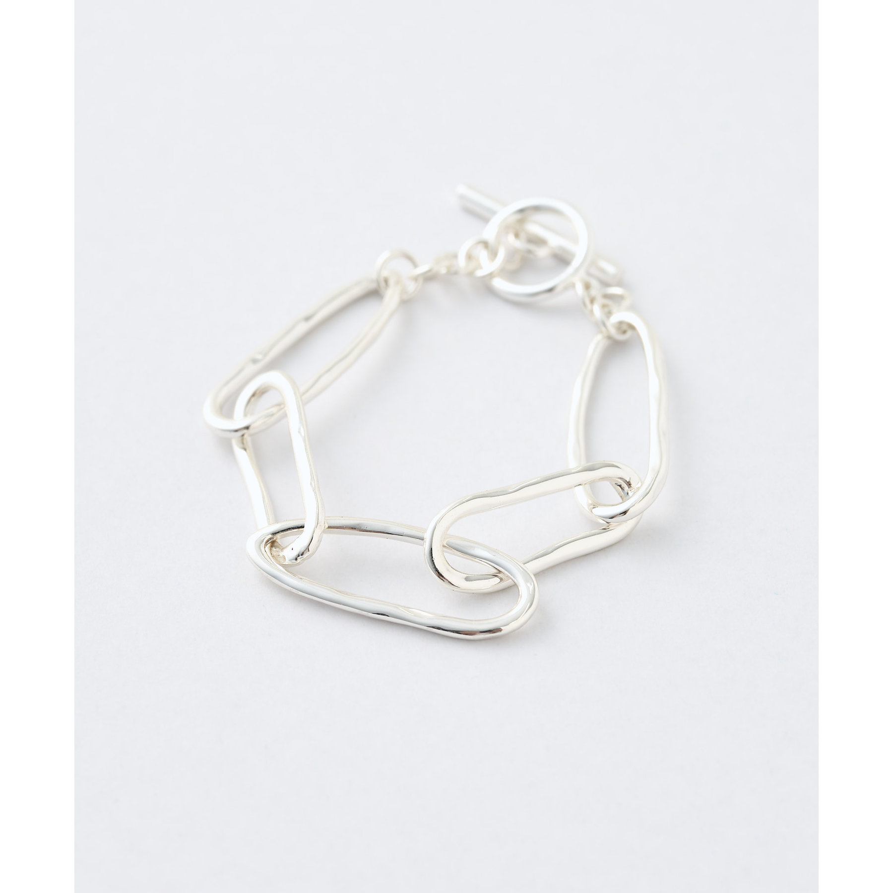 肌馴染みの良い、いびつな形のチェーンがいくつも重なった華奢すぎない程良いボリューム感のあるブレスレット。金具はマンテルタイプで着脱しやすく、またデザインのアクセントに。これだけでシンプルに1本で着けたり、他のバングルやリングなどと重ね付けしたりと色々なコーディネートがお楽しみいただけます。