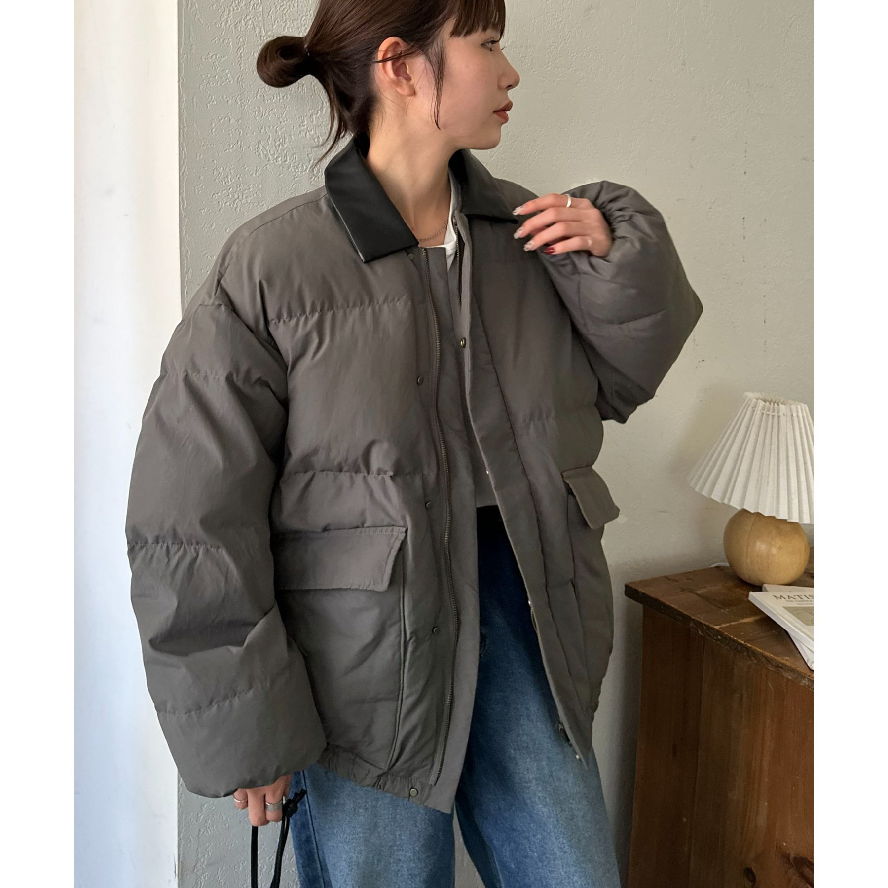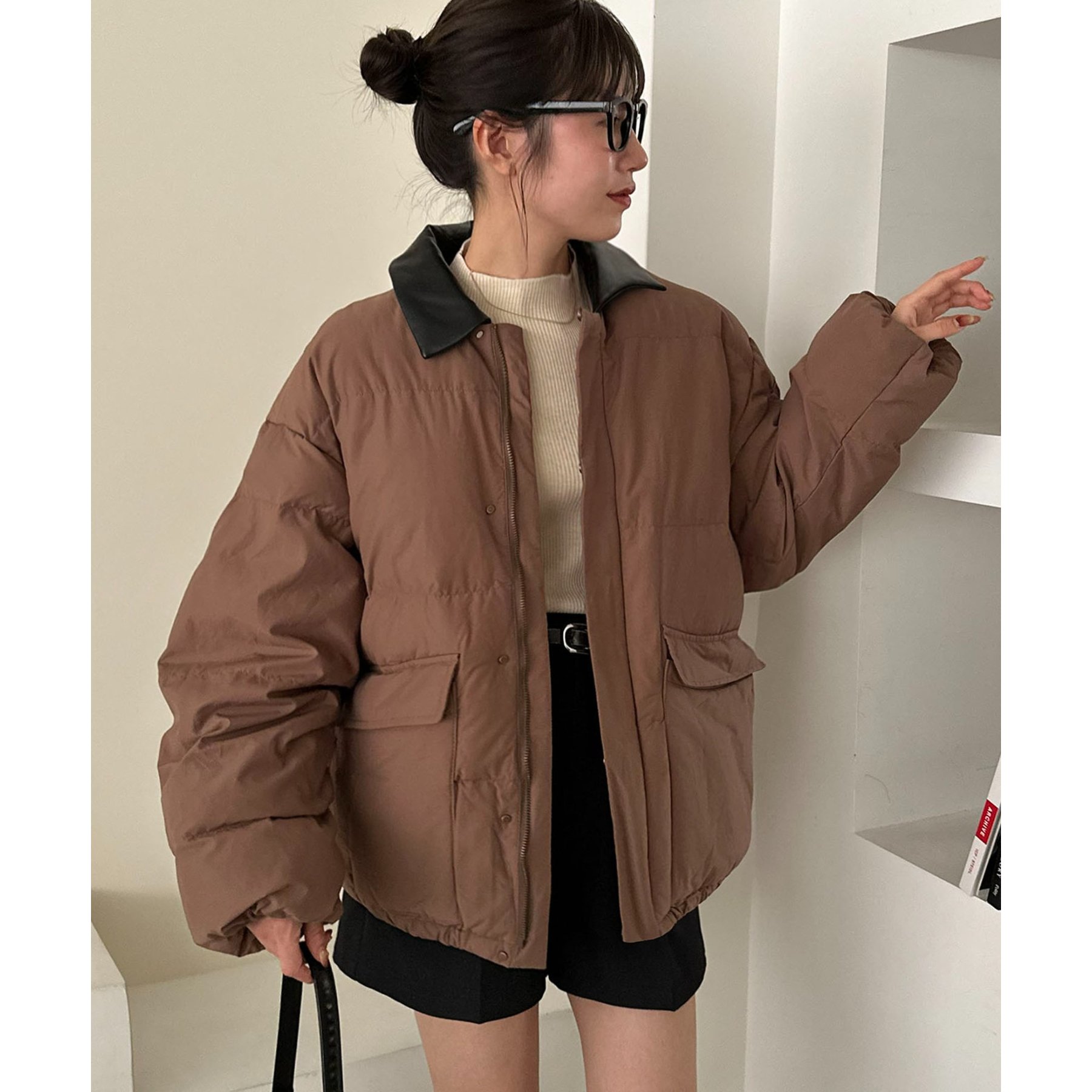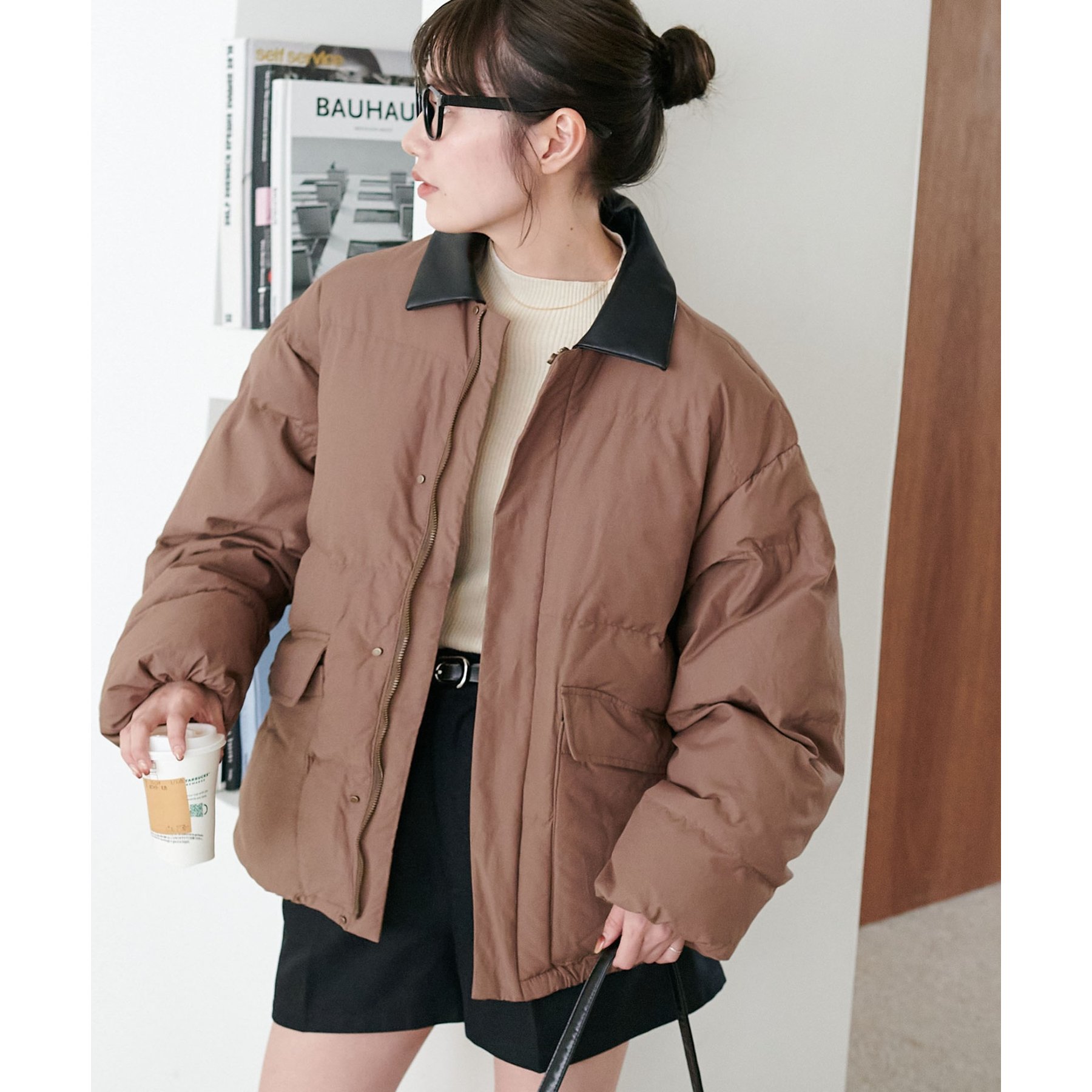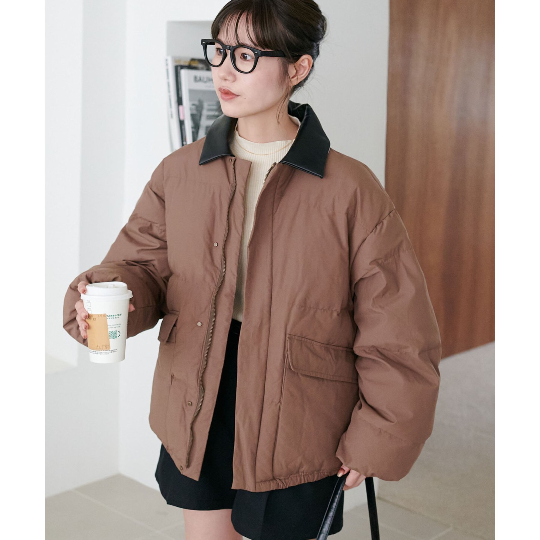 フェイクレザーの衿が映える中綿ブルゾン