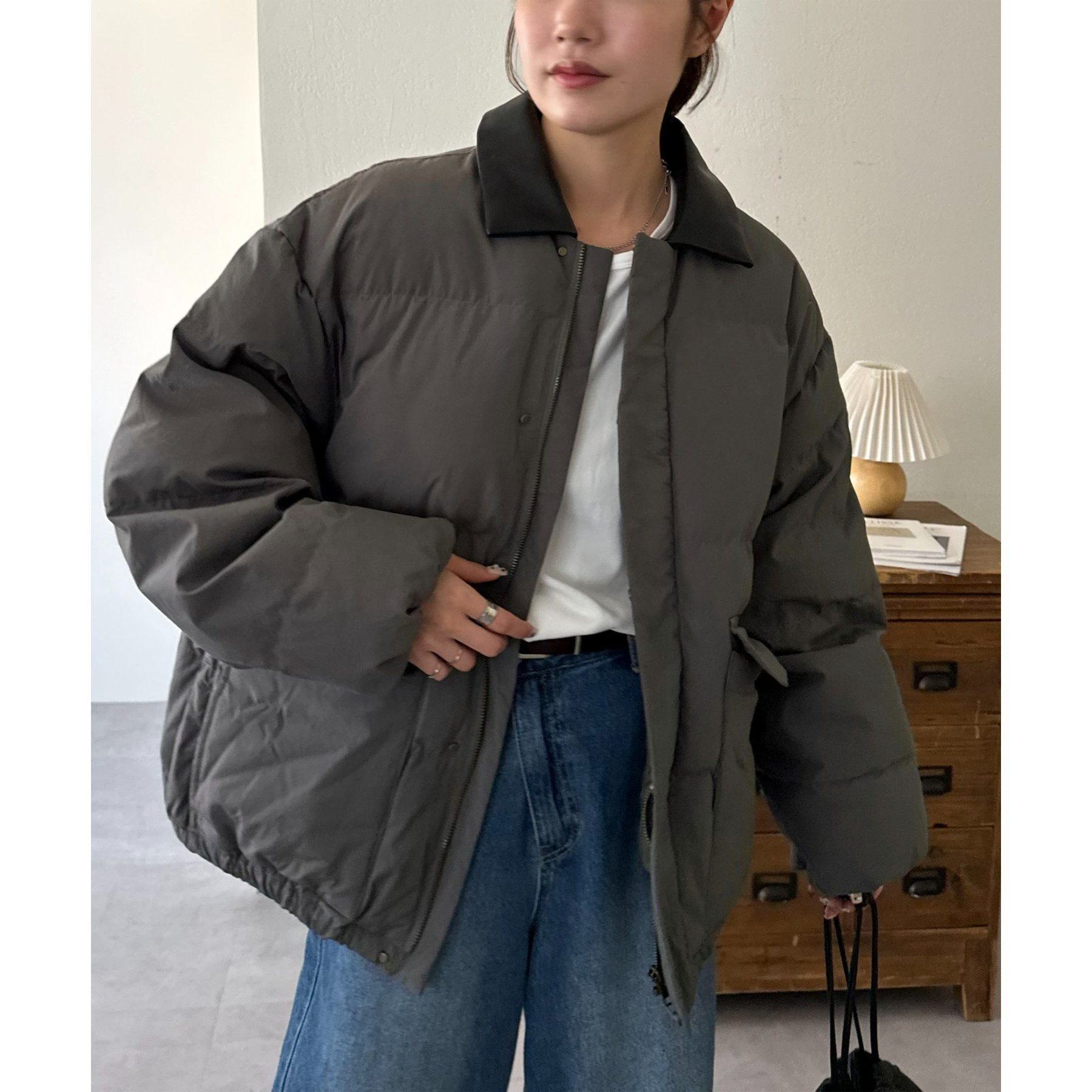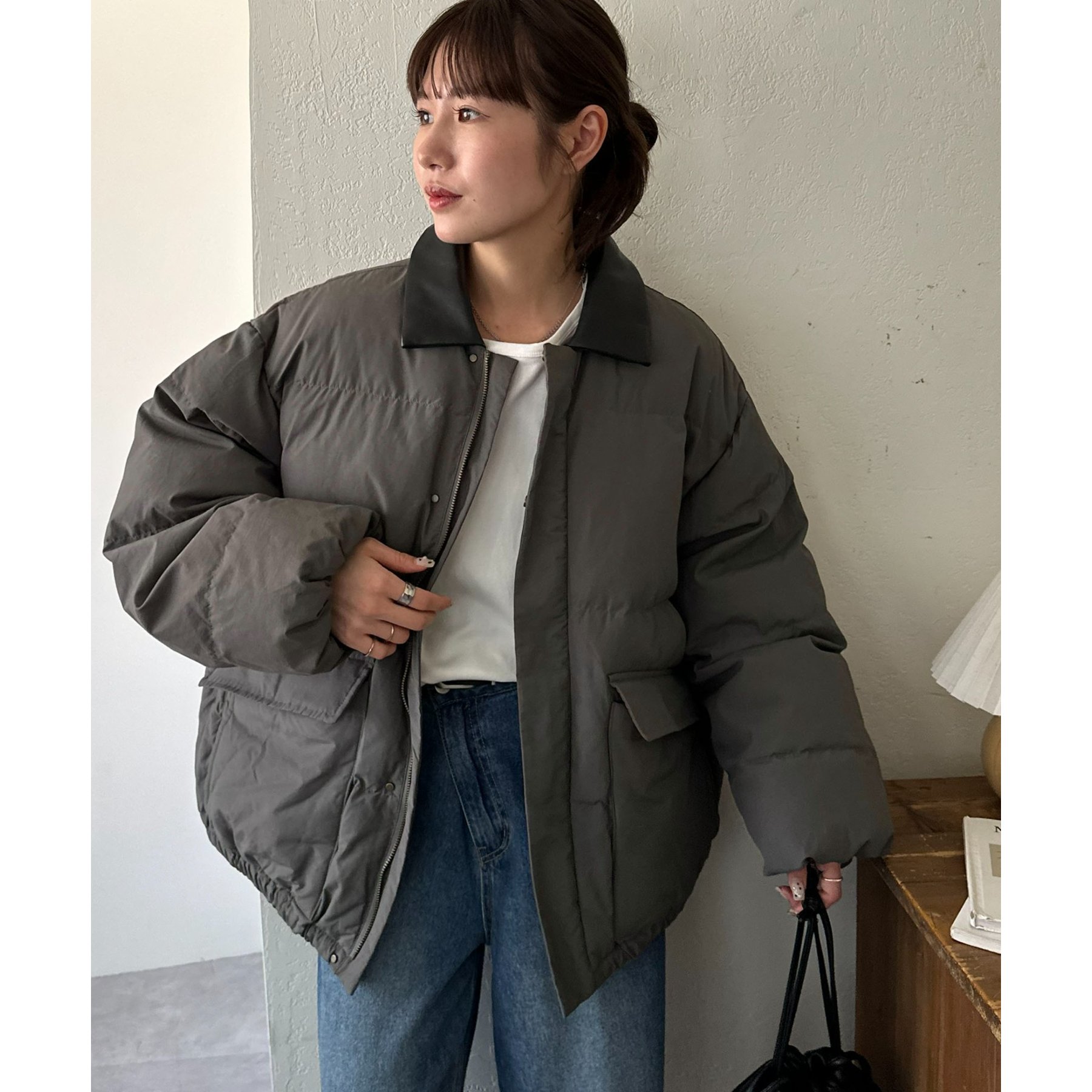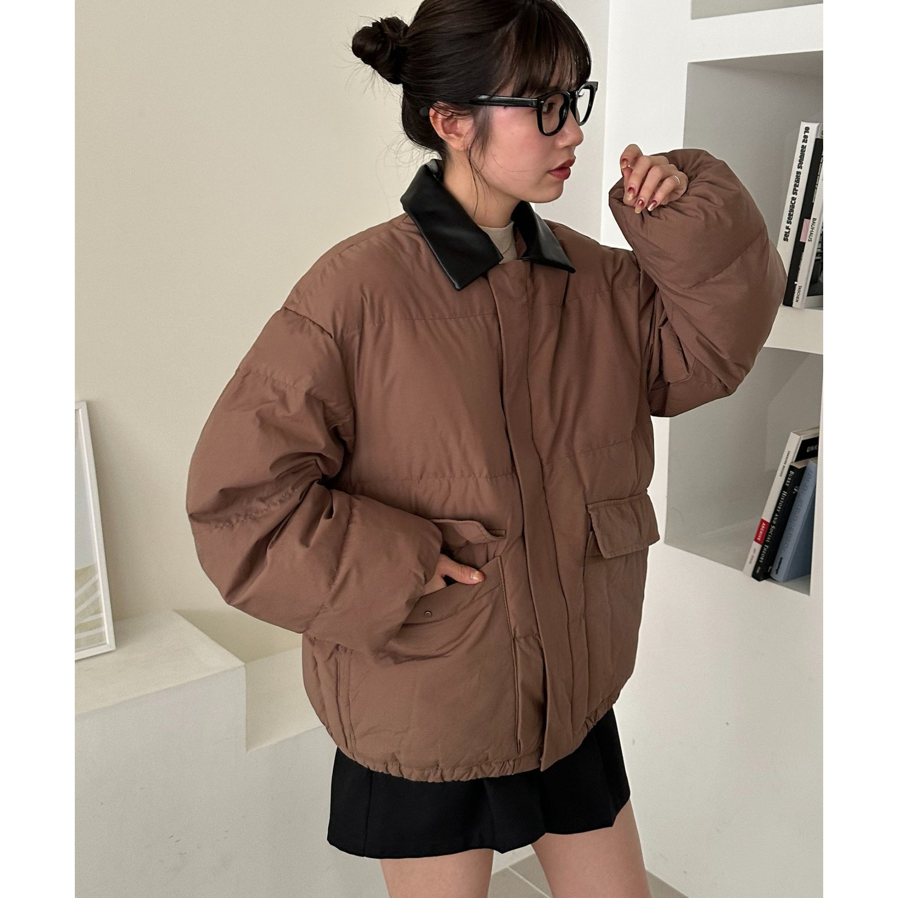 フェイクレザーの衿が映える中綿ブルゾン