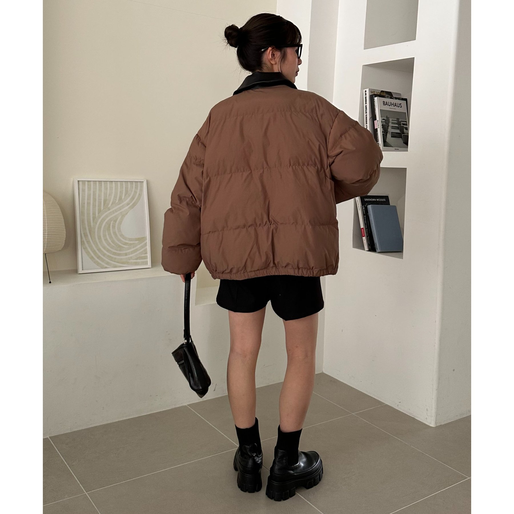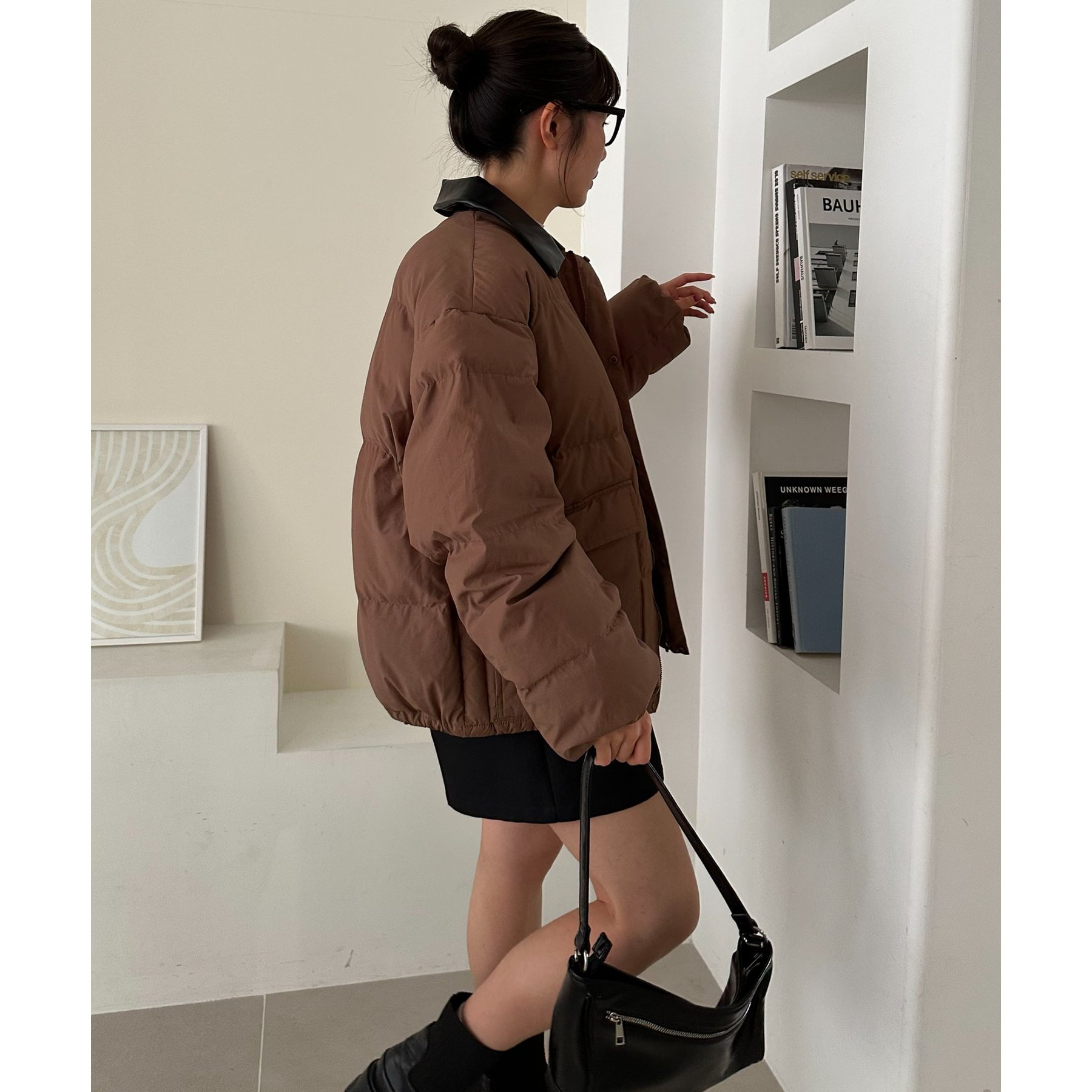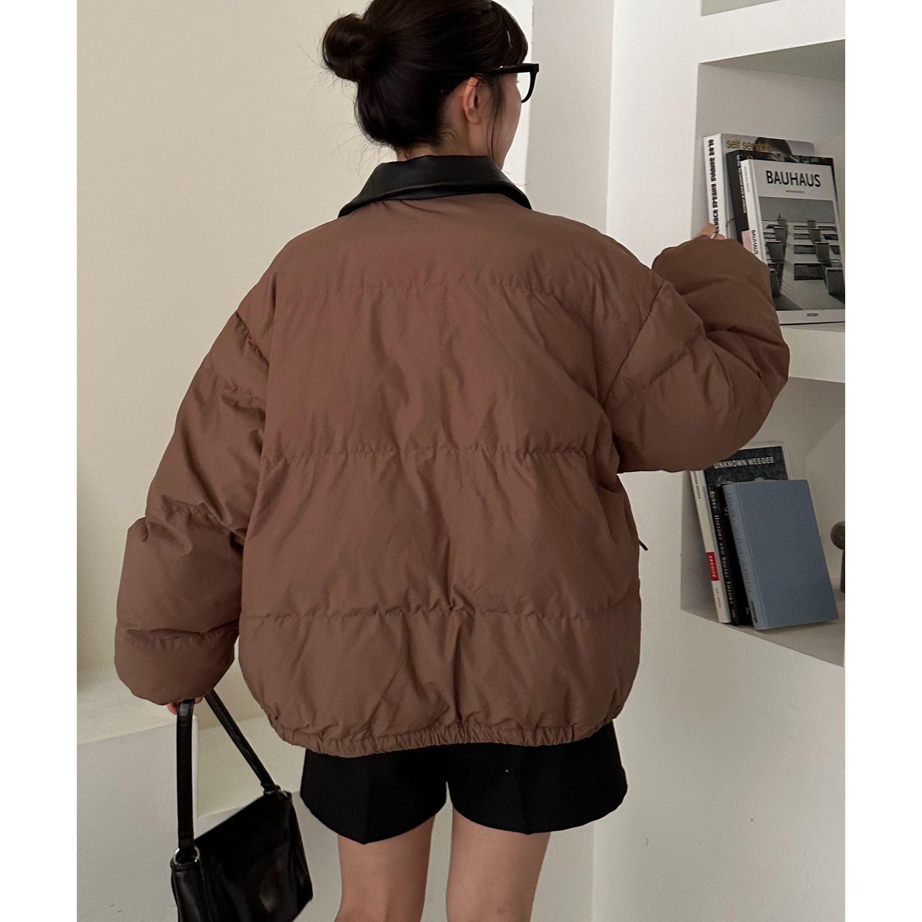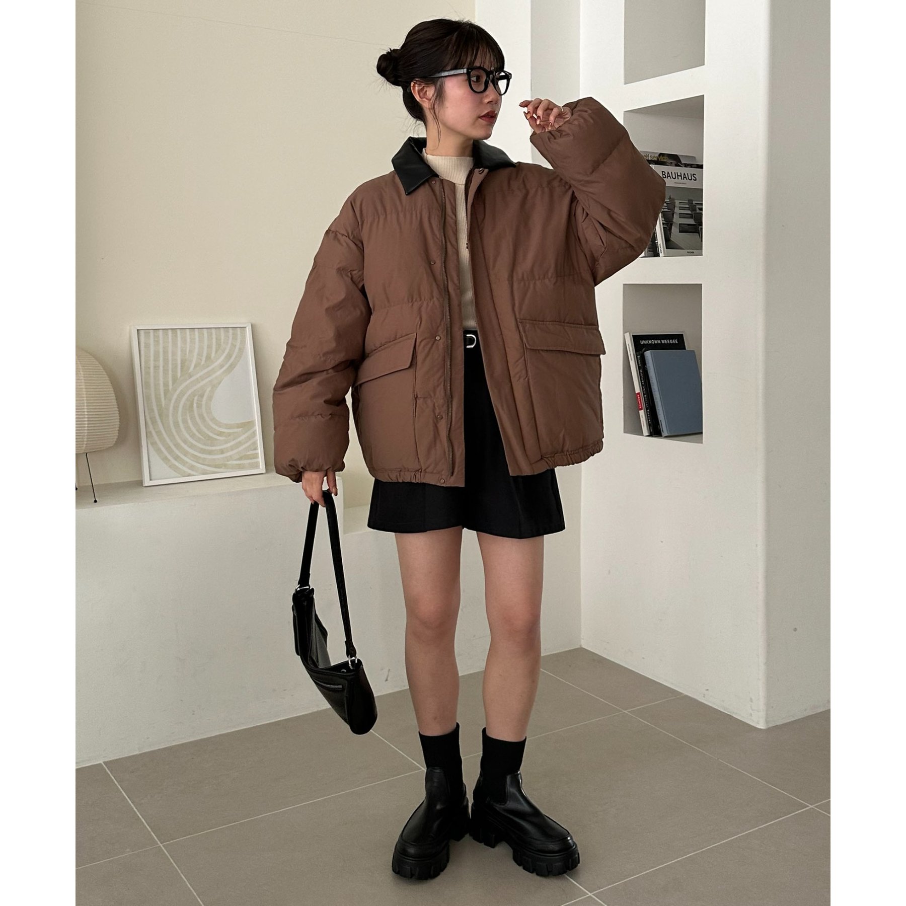 フェイクレザーの衿が映える中綿ブルゾン