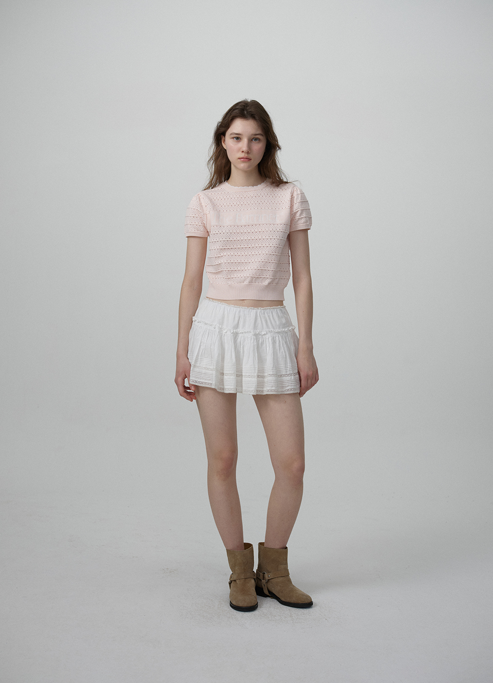 ラウンドネック&半袖仕様のニットトップ