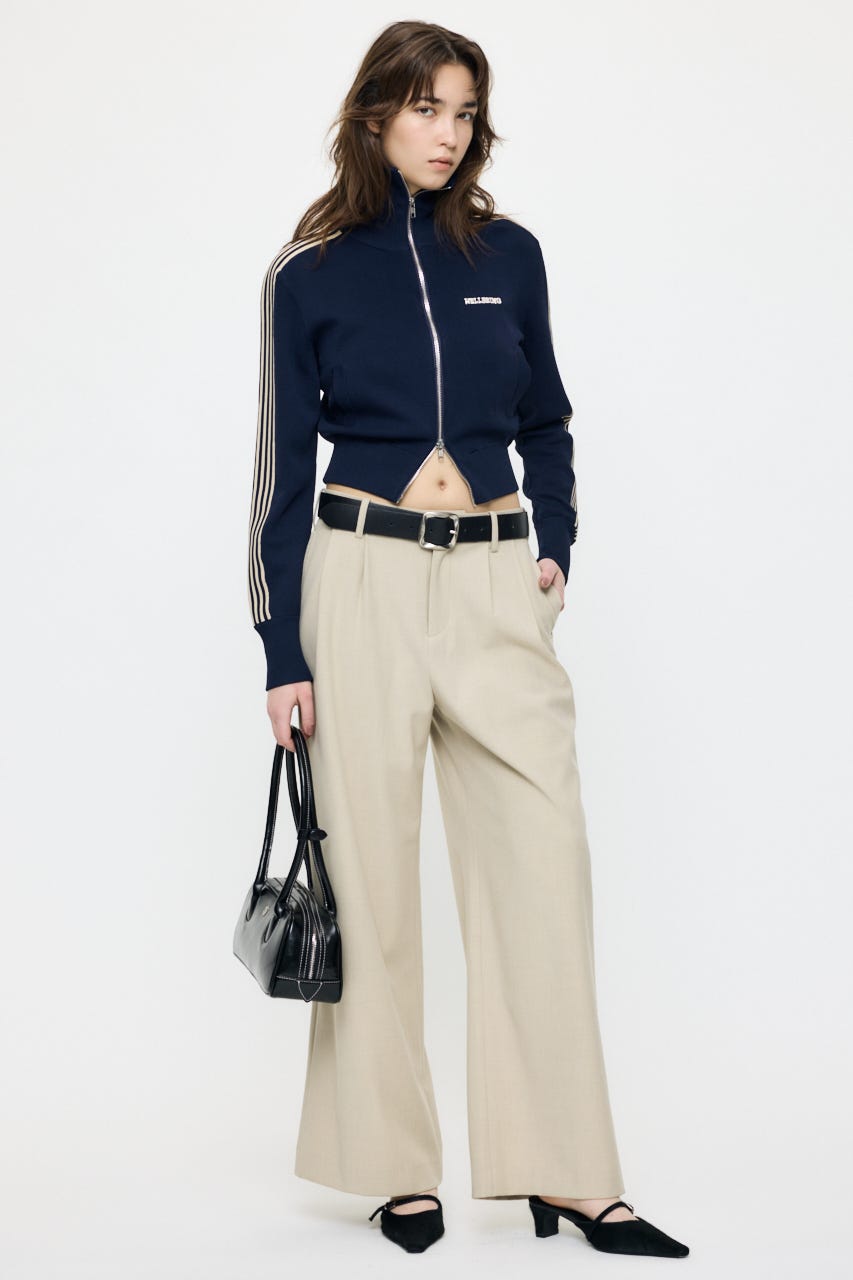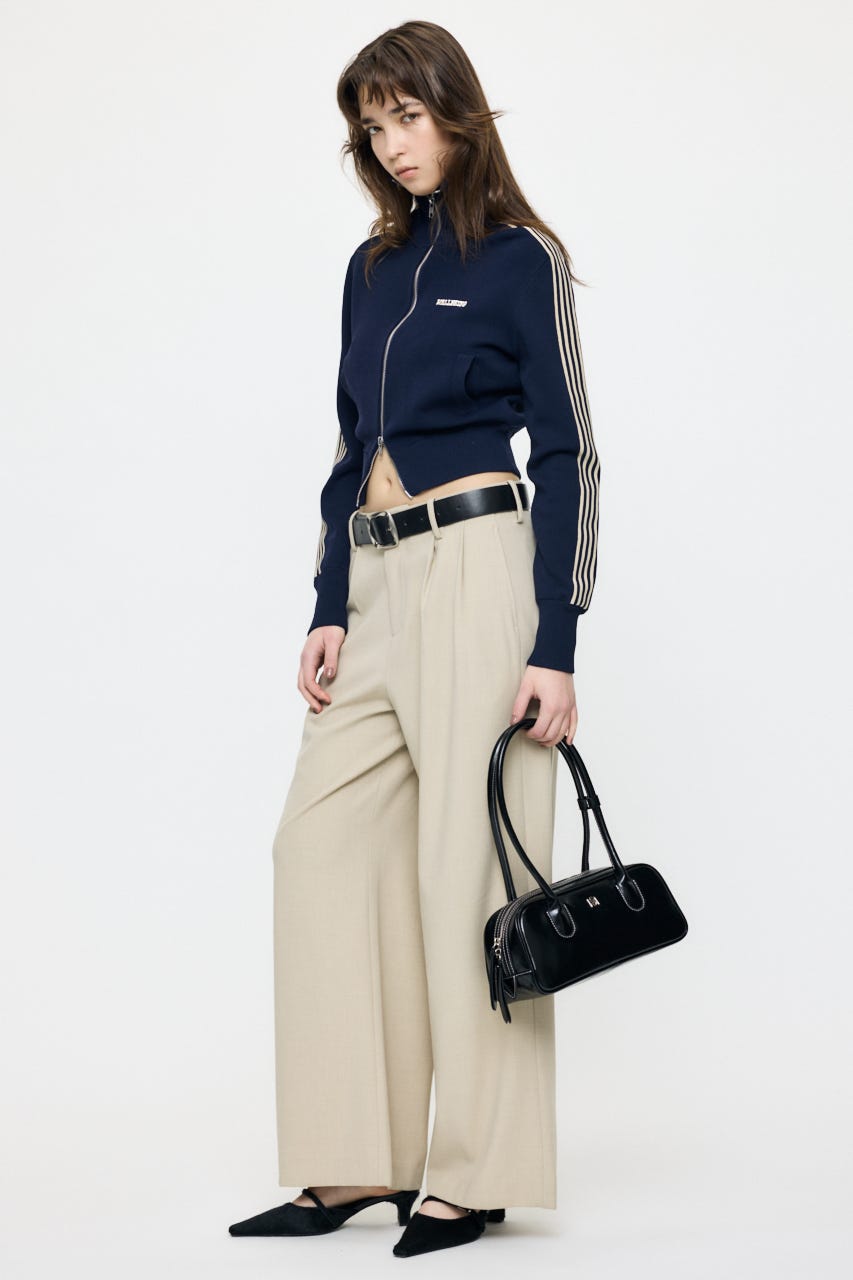 春先まで着れる薄手のニット生地で高めの襟とコンパクトなシルエットで今っぽい印象に。
