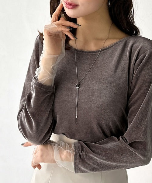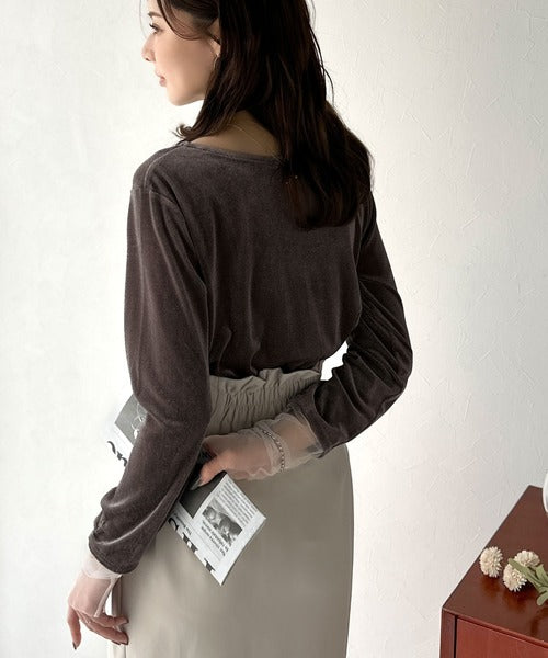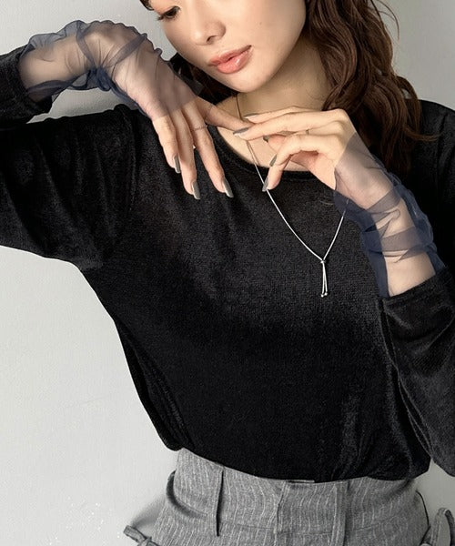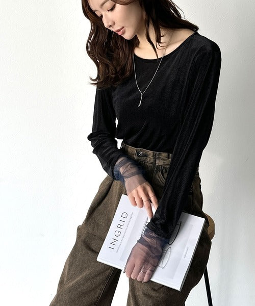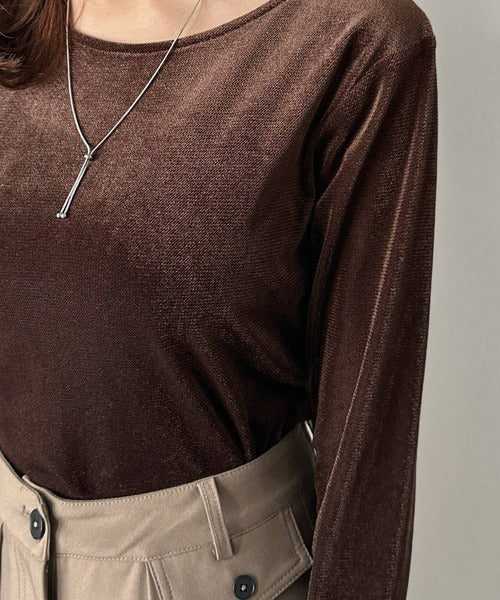 上品な光沢と透け感が魅力のシアーベロア素材を使用した、1枚で着映えるプルオーバー。