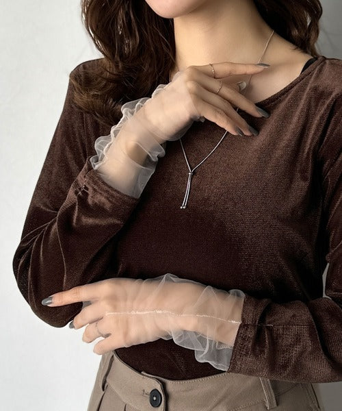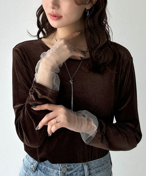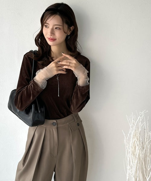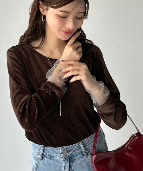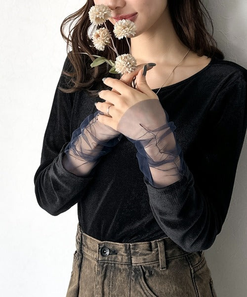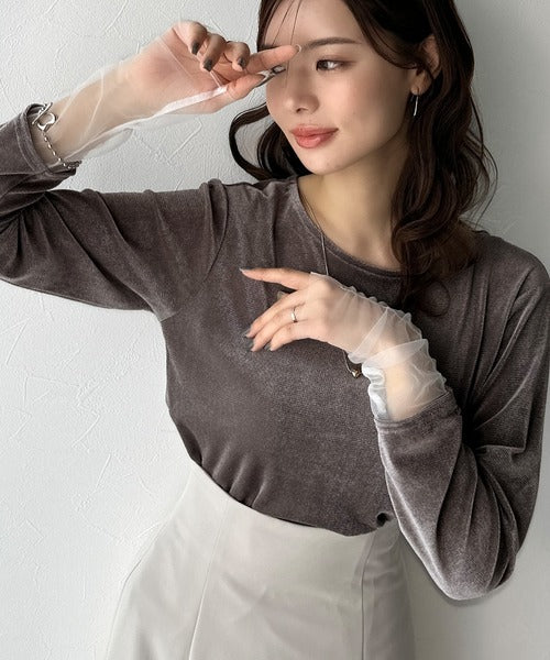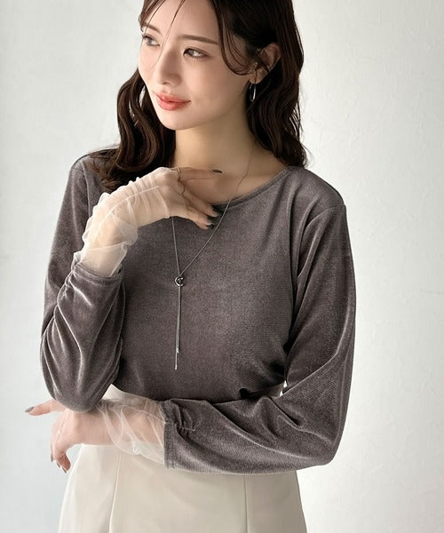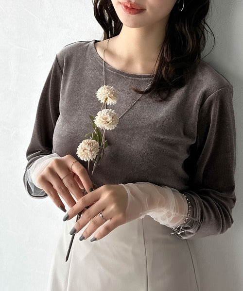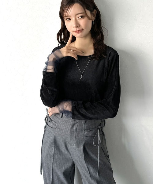 袖のギャザーチュールとシアーベロアの異素材MIXがアクセントに◎
