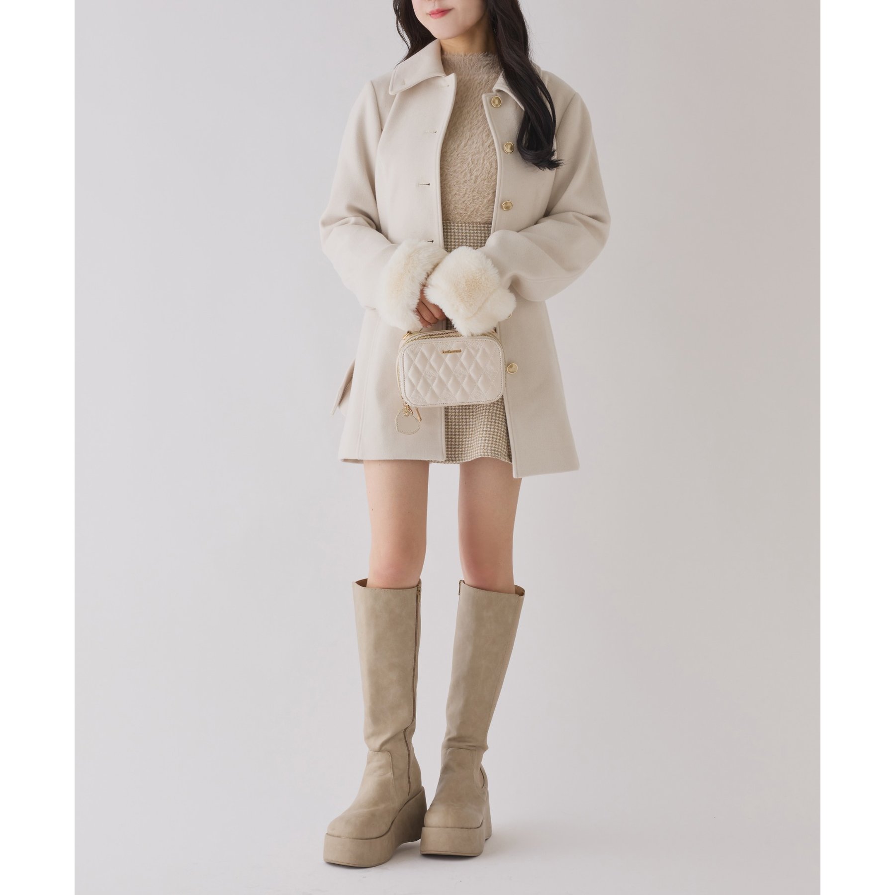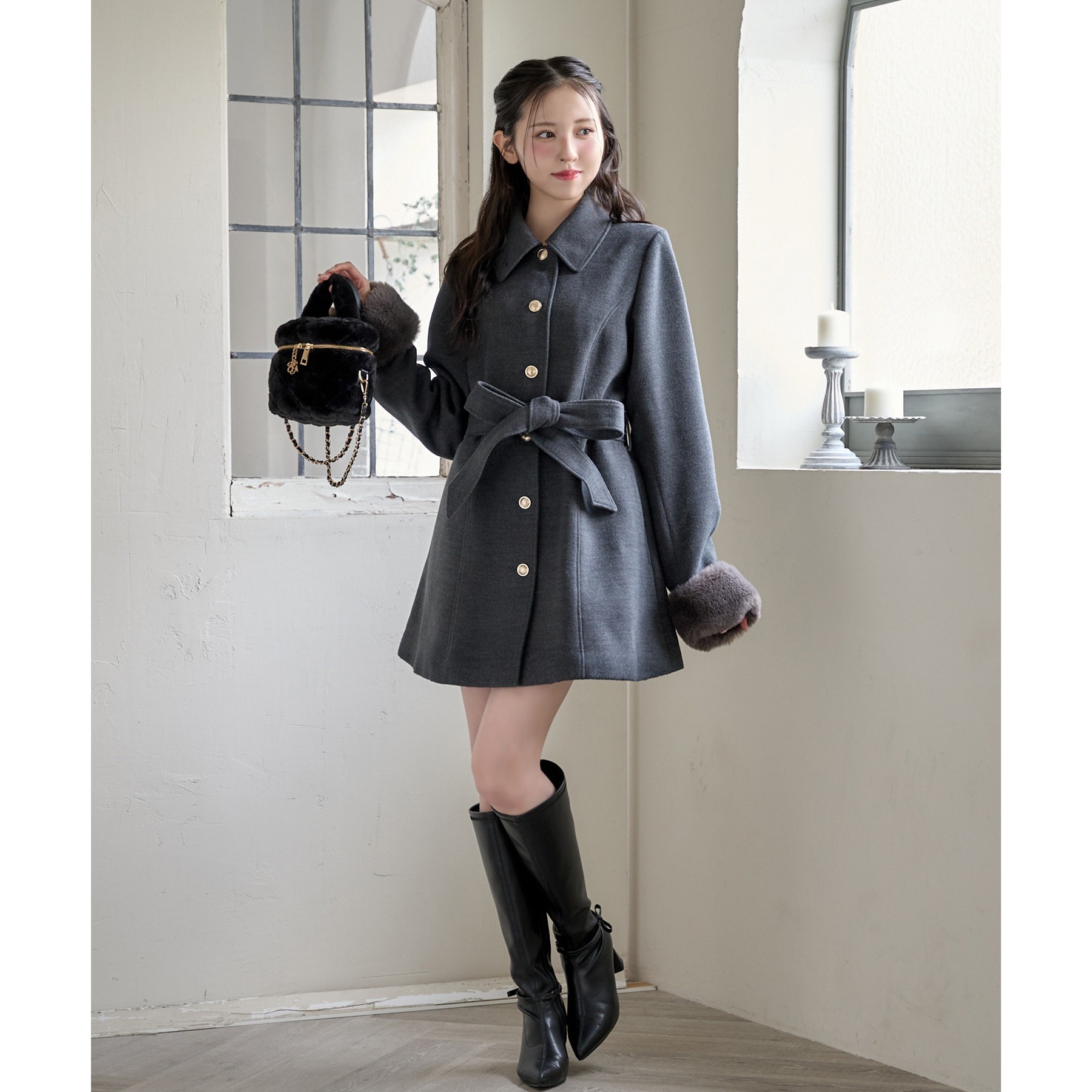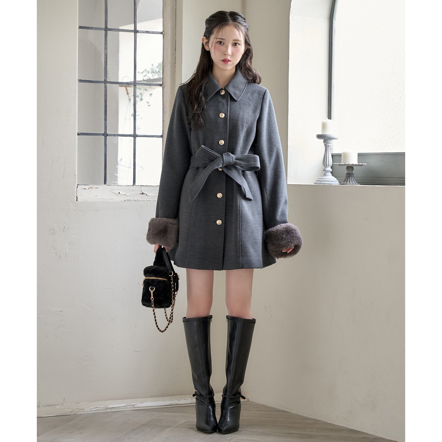 ミニボトム×ロングブーツでコートを閉じてワンピースっぽく着こなすのがオススメ!