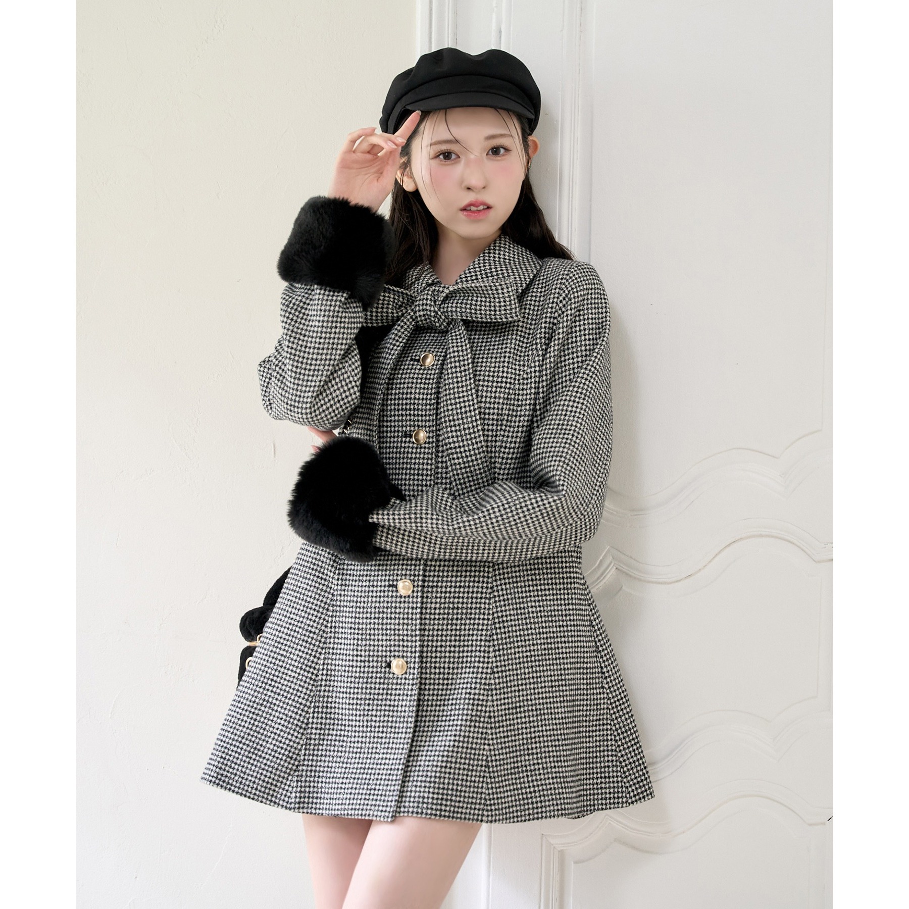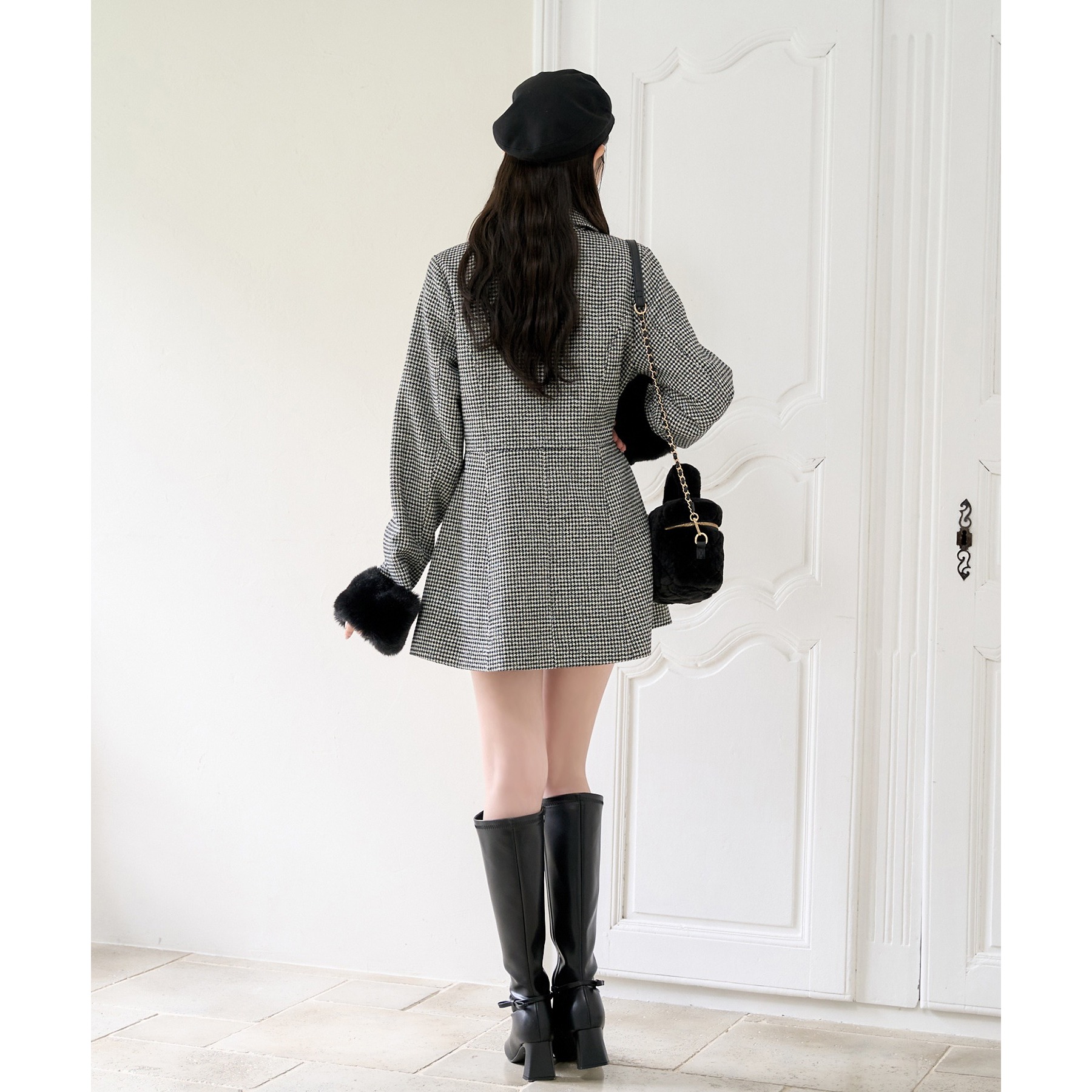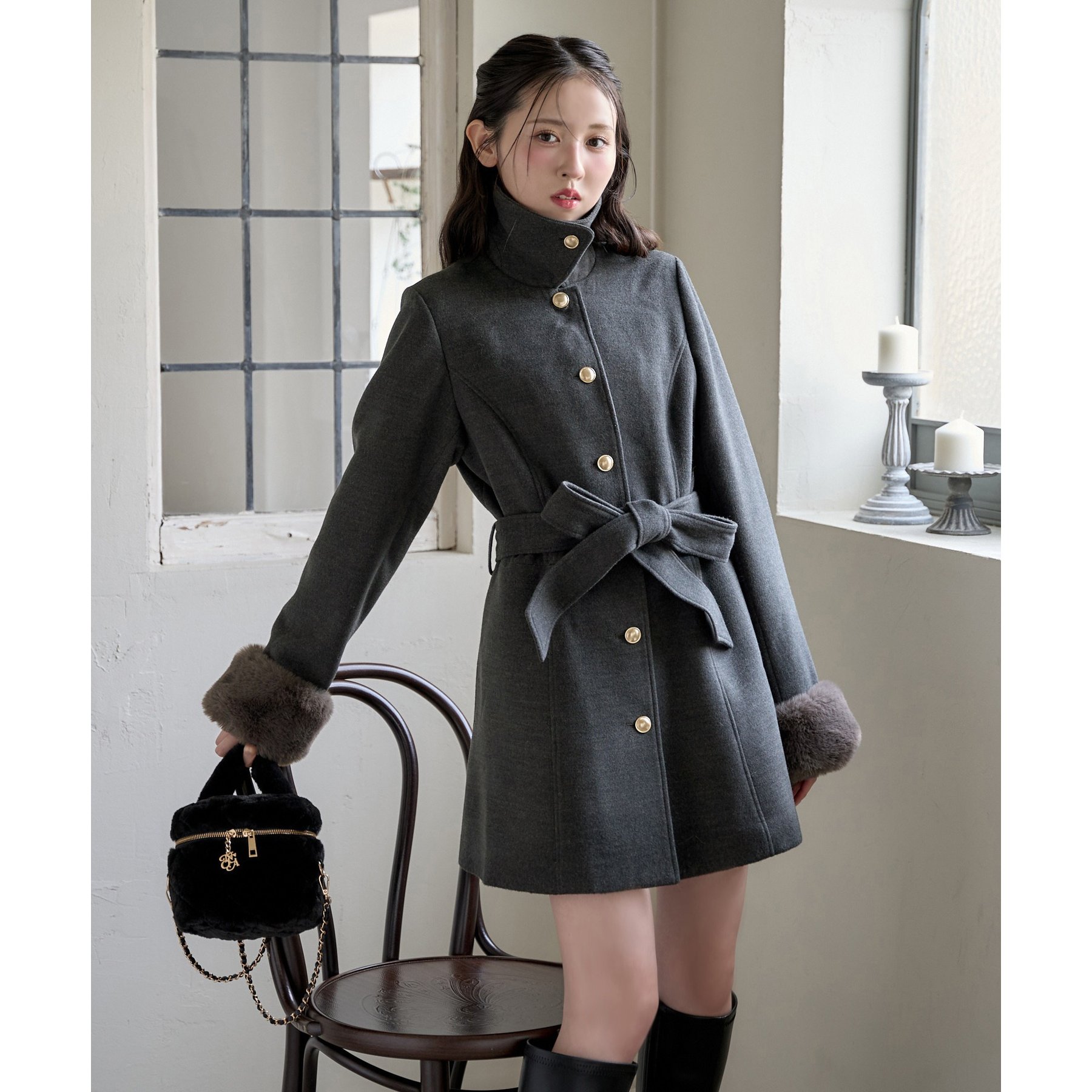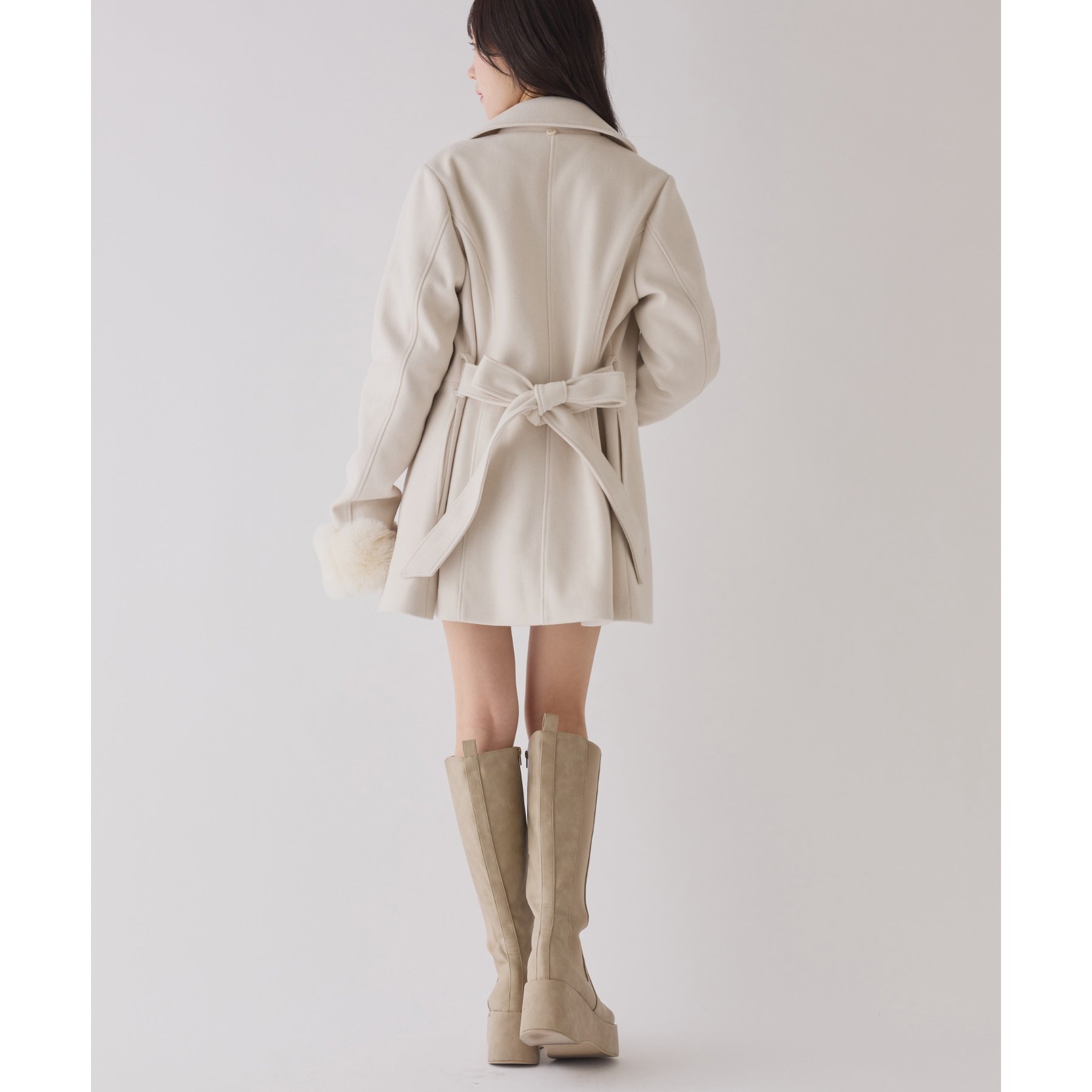 ミニボトム×ロングブーツでコートを閉じてワンピースっぽく着こなすのがオススメ!