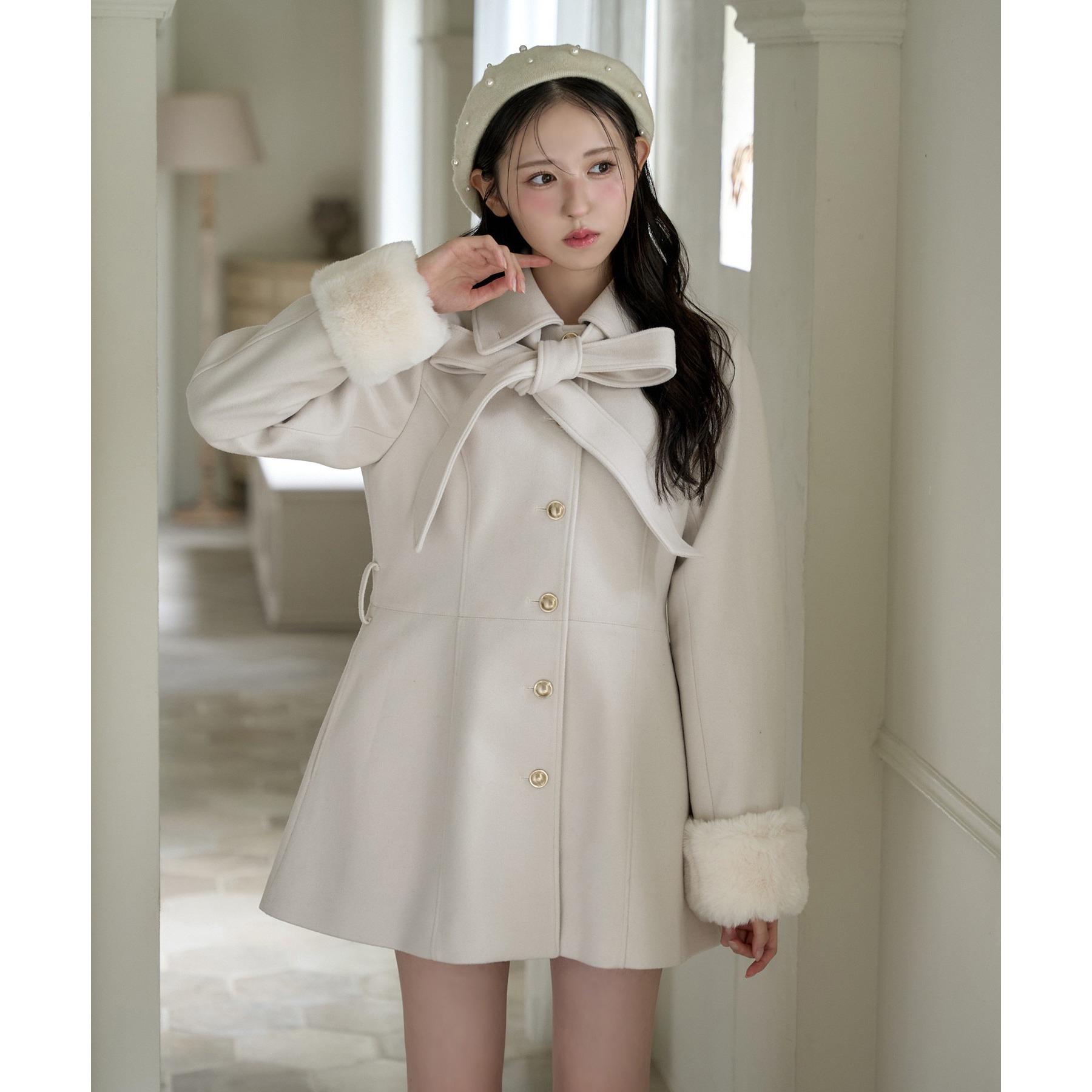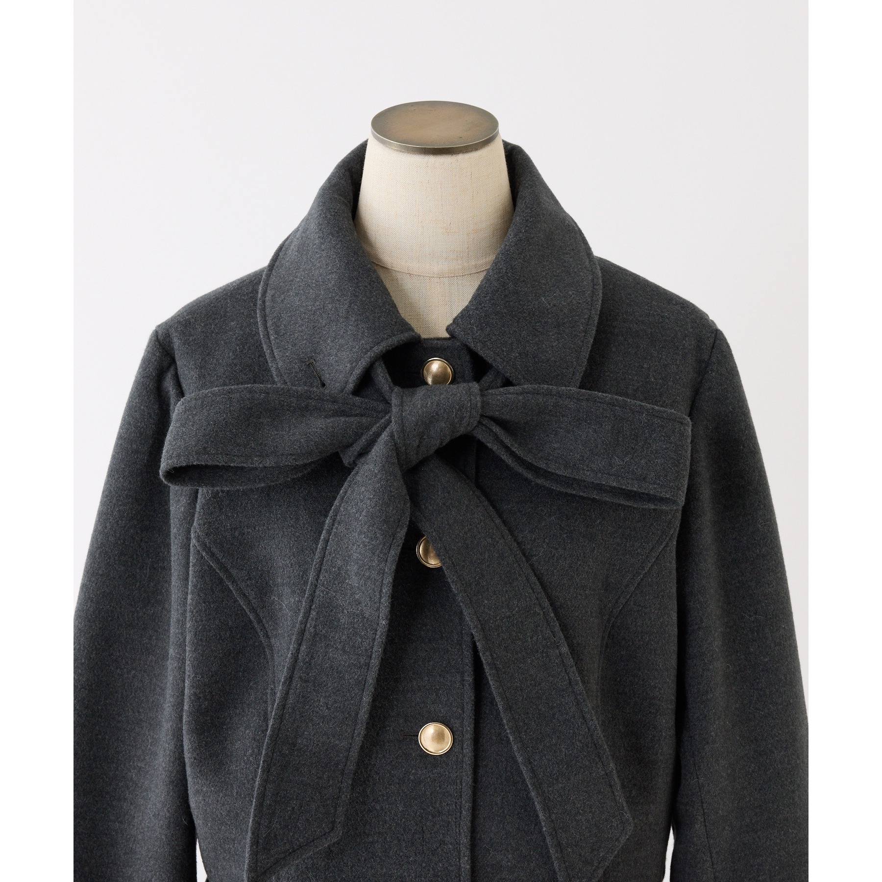 リボンが女性らしいシルエットを演出してくれるミドル丈コート。