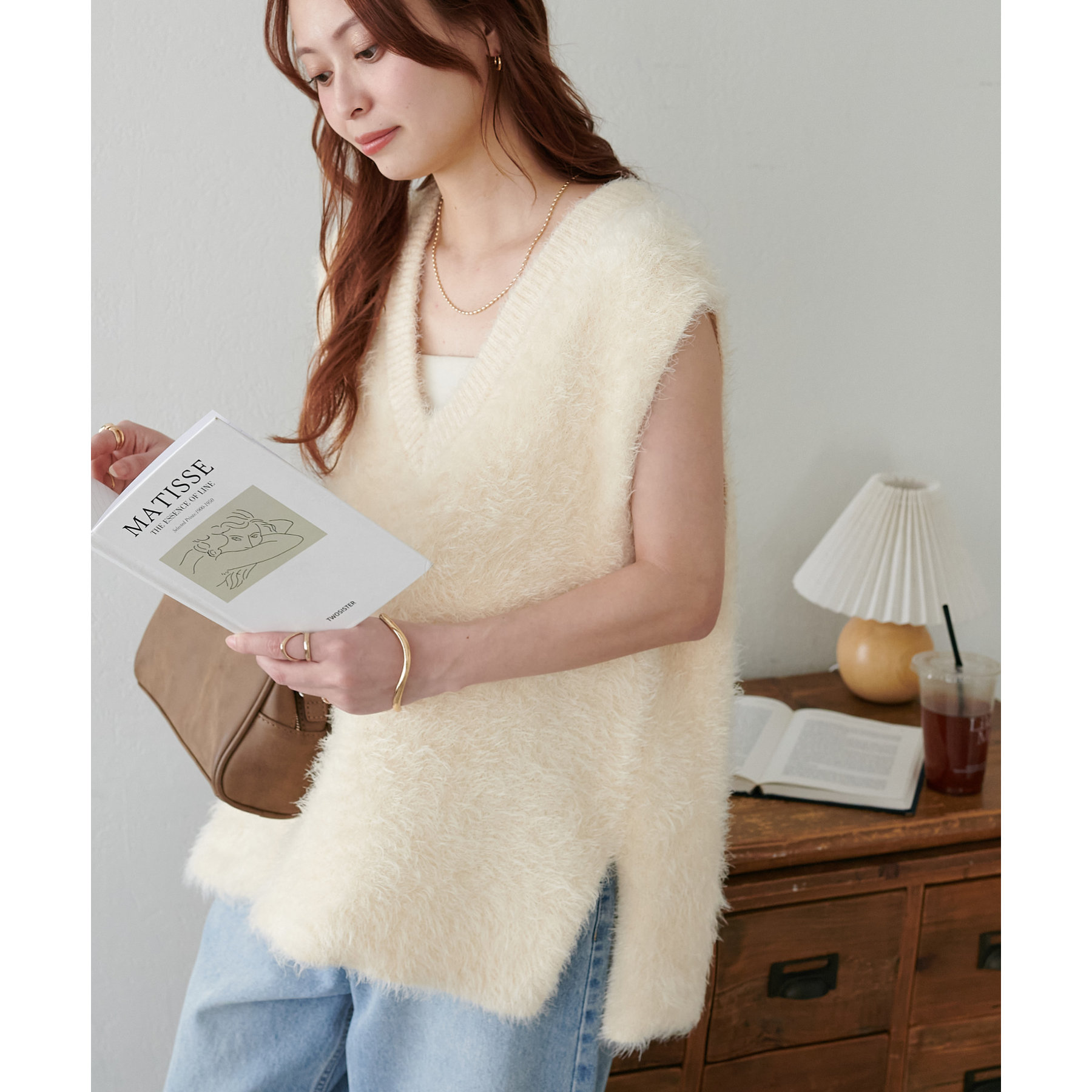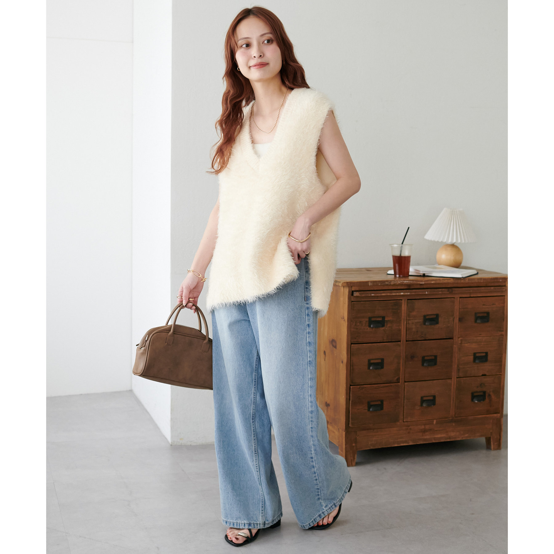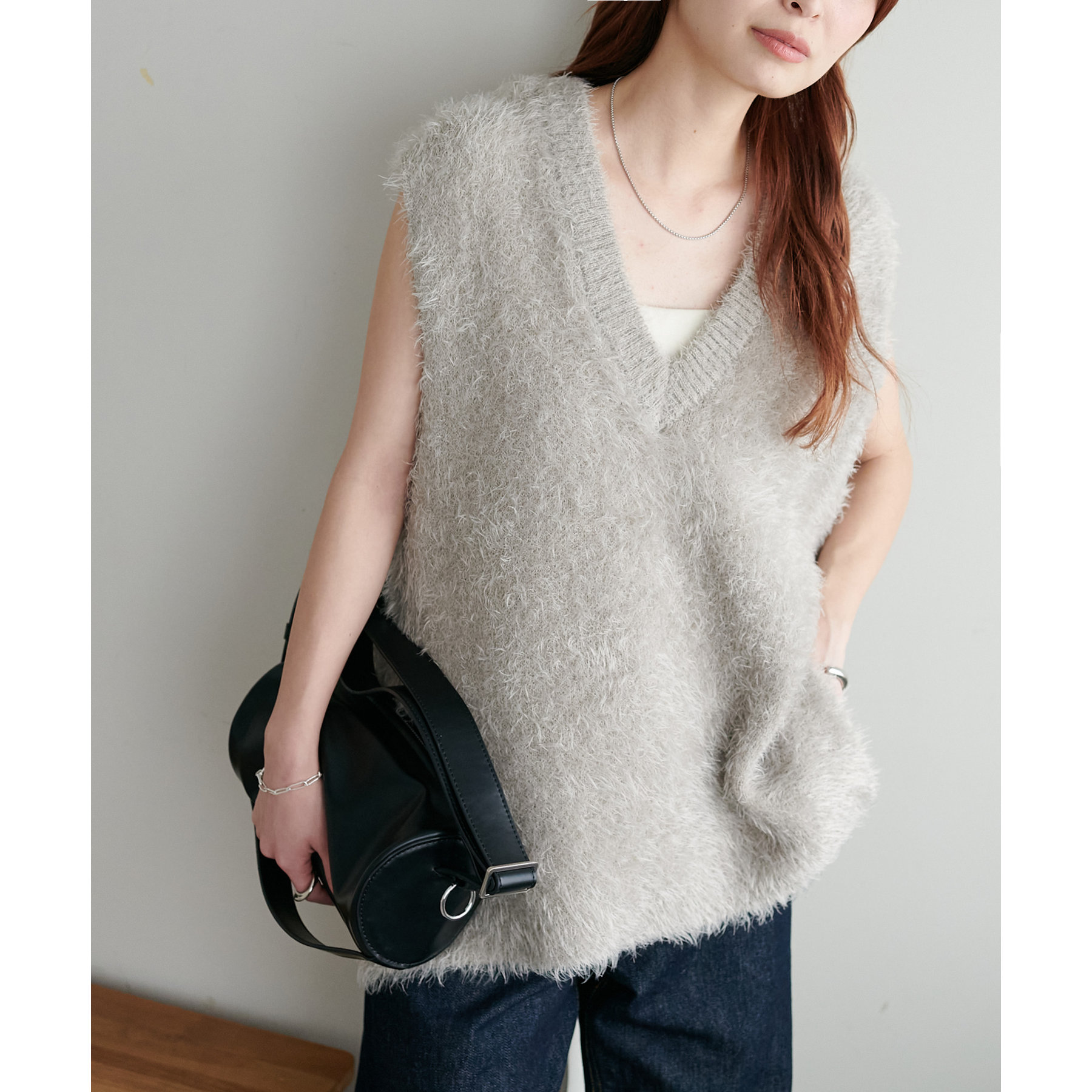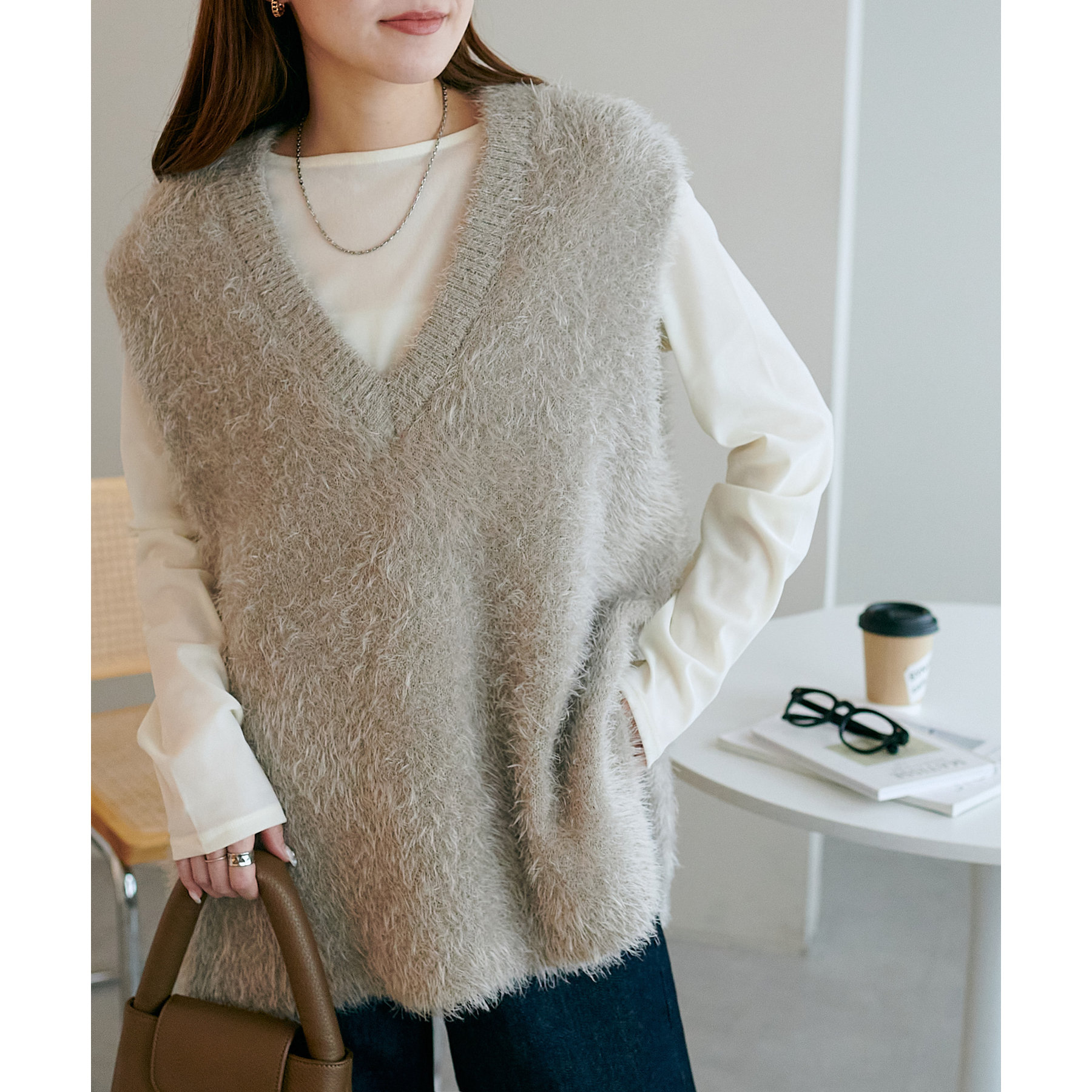 滑らかでふわふわとした優しい触り心地が特徴のライトフェザーヤーンベスト。
