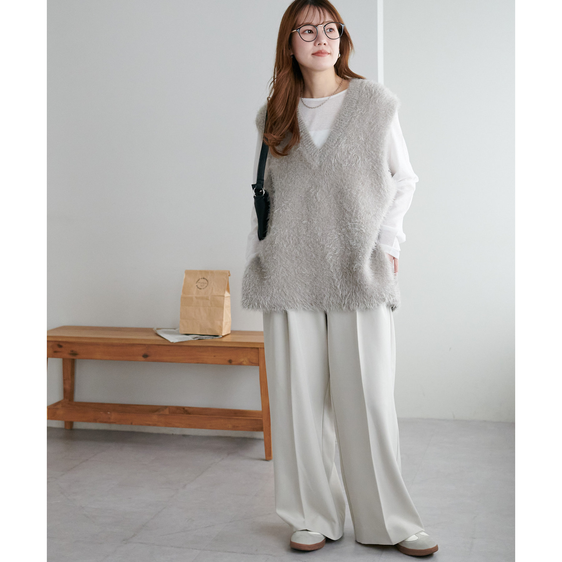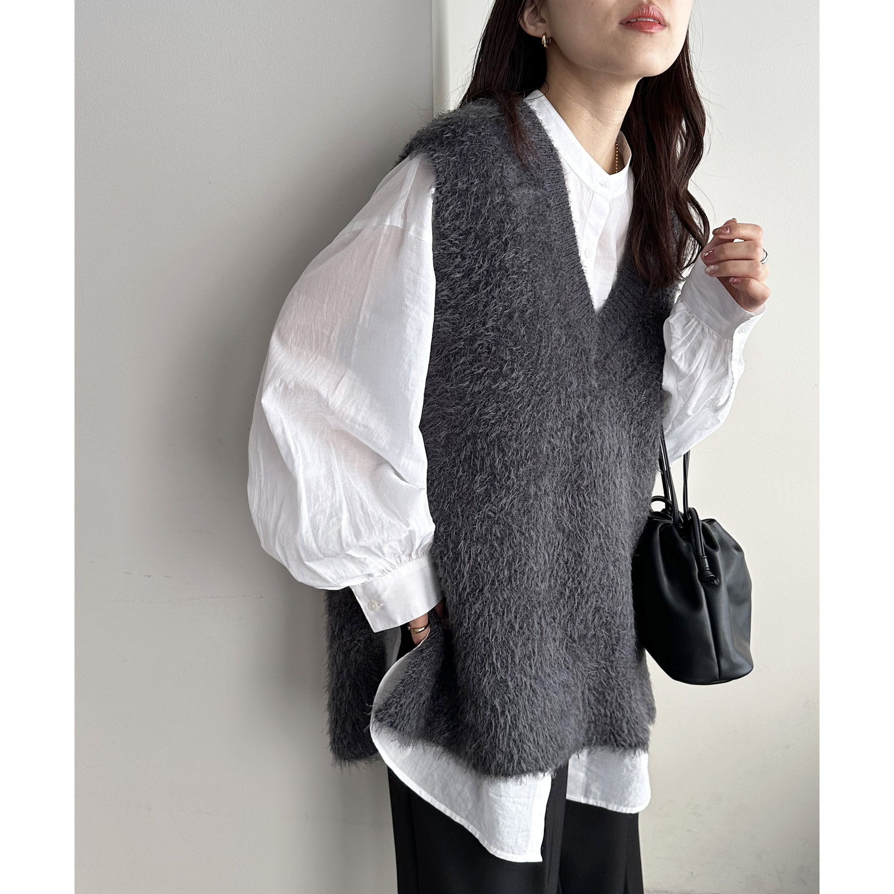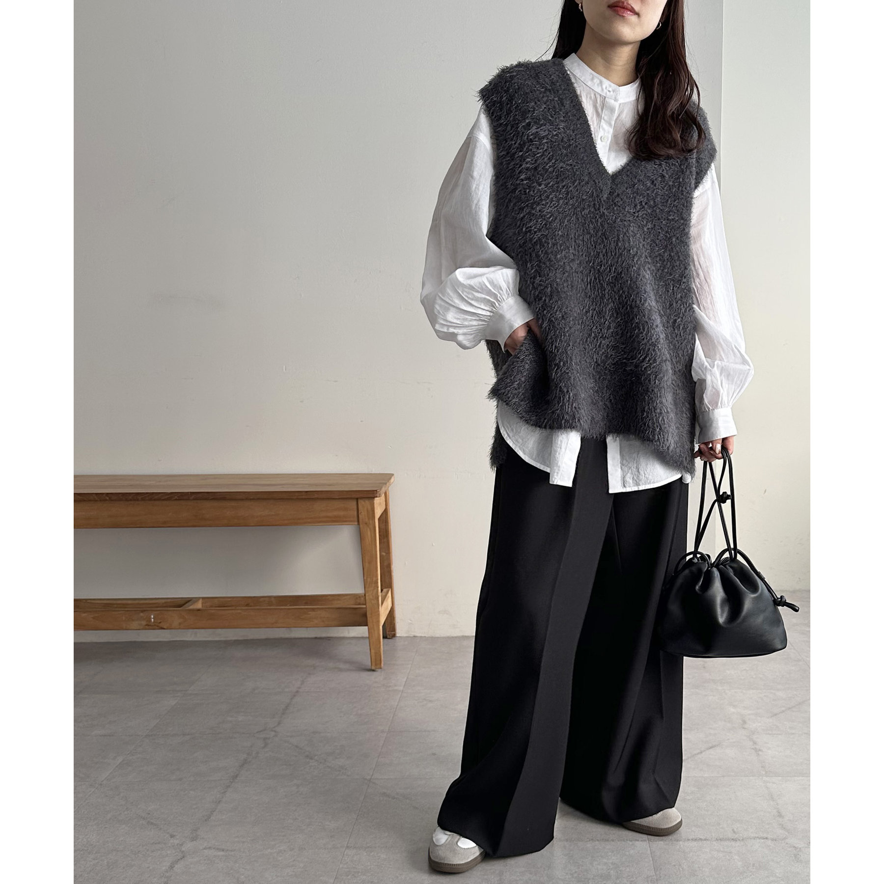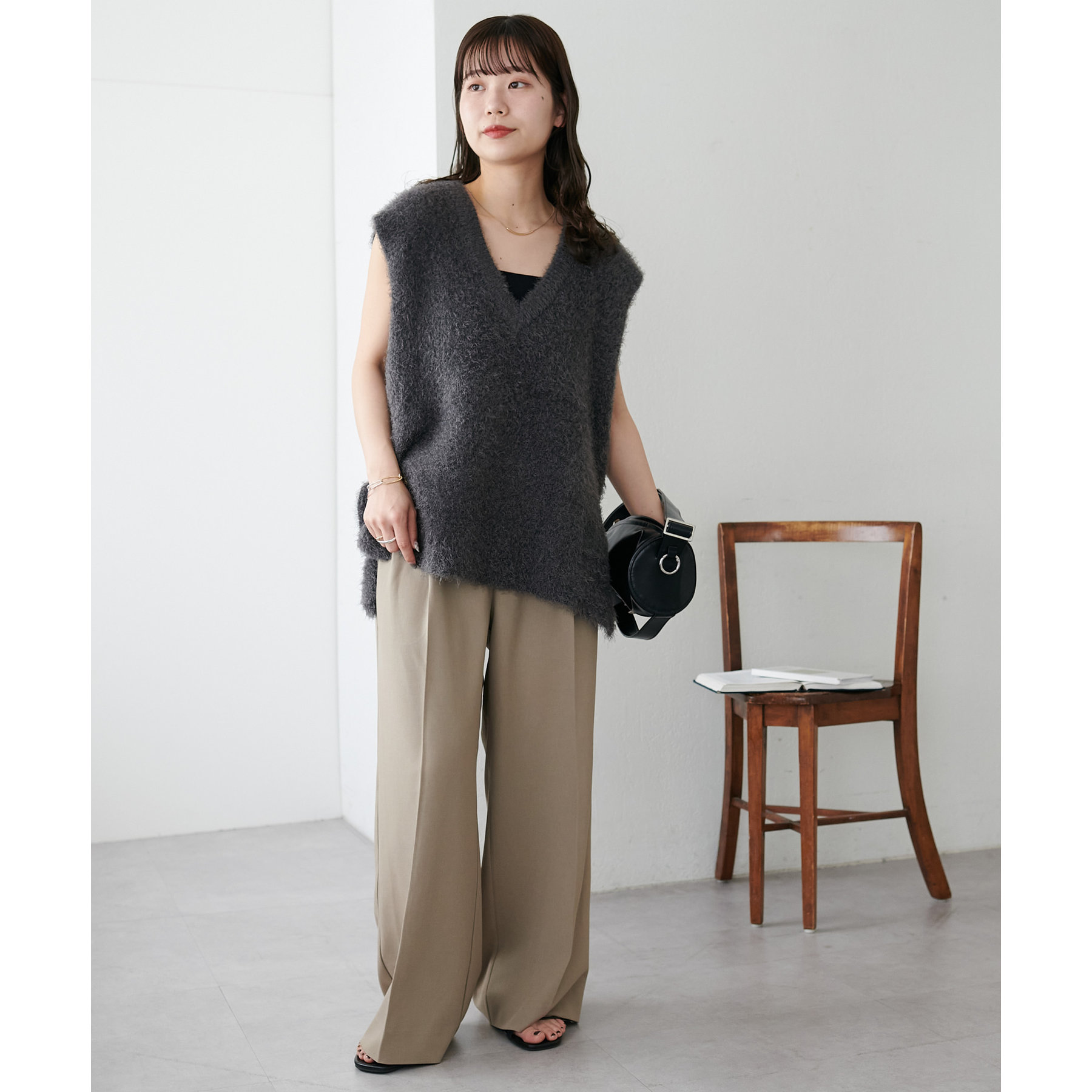 155㎝スタッフ: 着心地も触り心地も抜群なベスト。ゆったりとしたサイズ感がリラクシーな着心地に♡インナーにシャツやブラウス合わせても窮屈感なく着られます♪