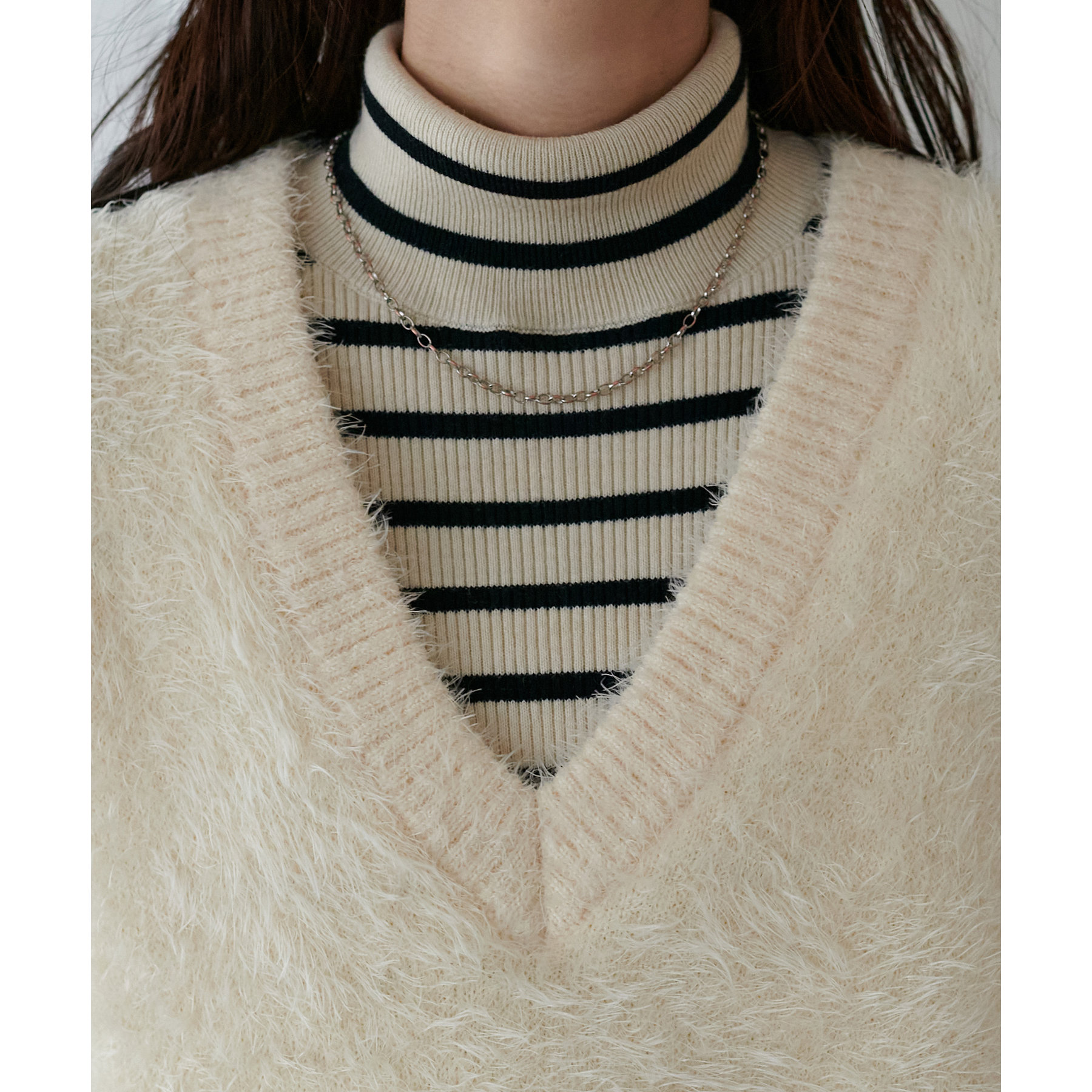インナーには、タートルやシアートップス、シャツなど合わせて、オールシーズン着用できます。