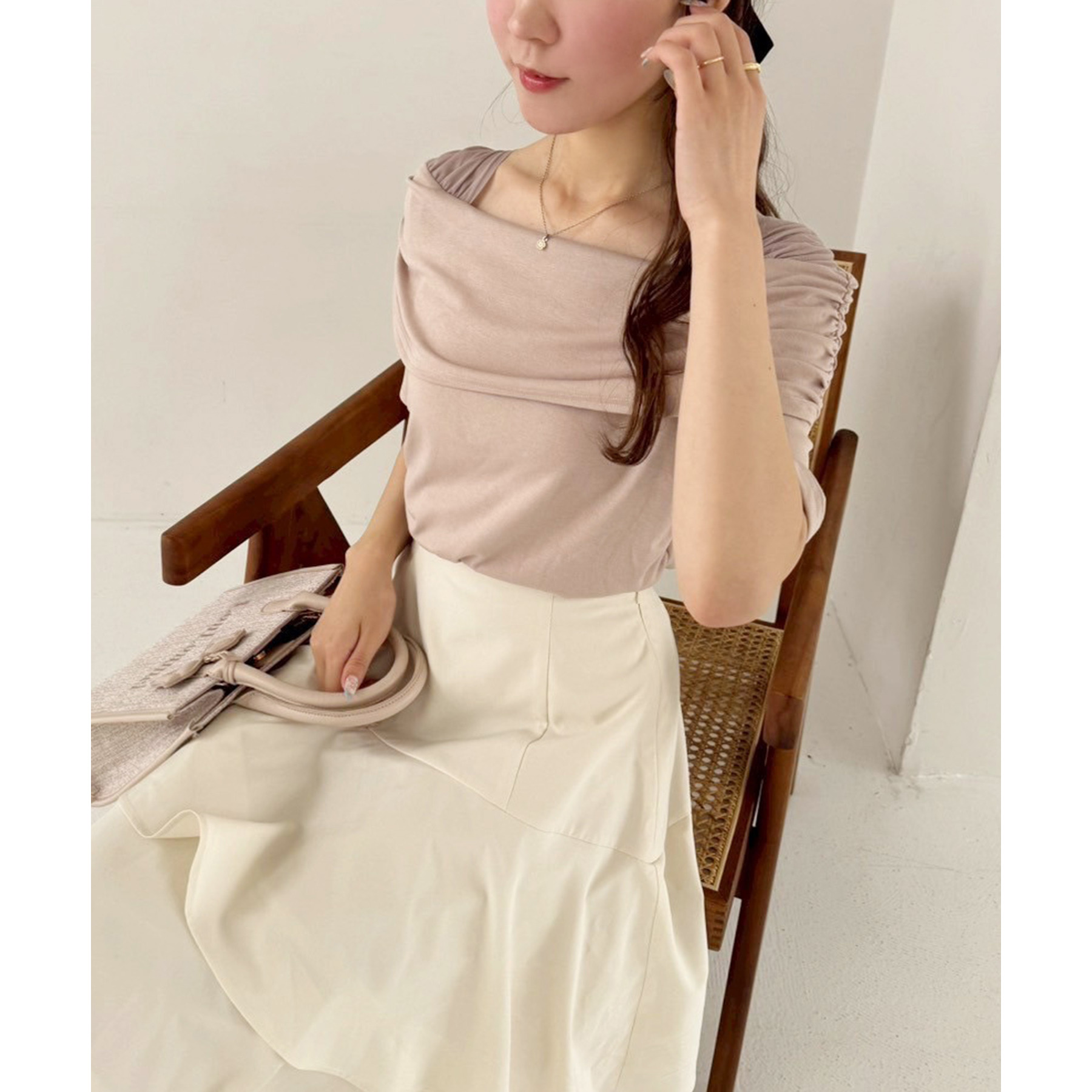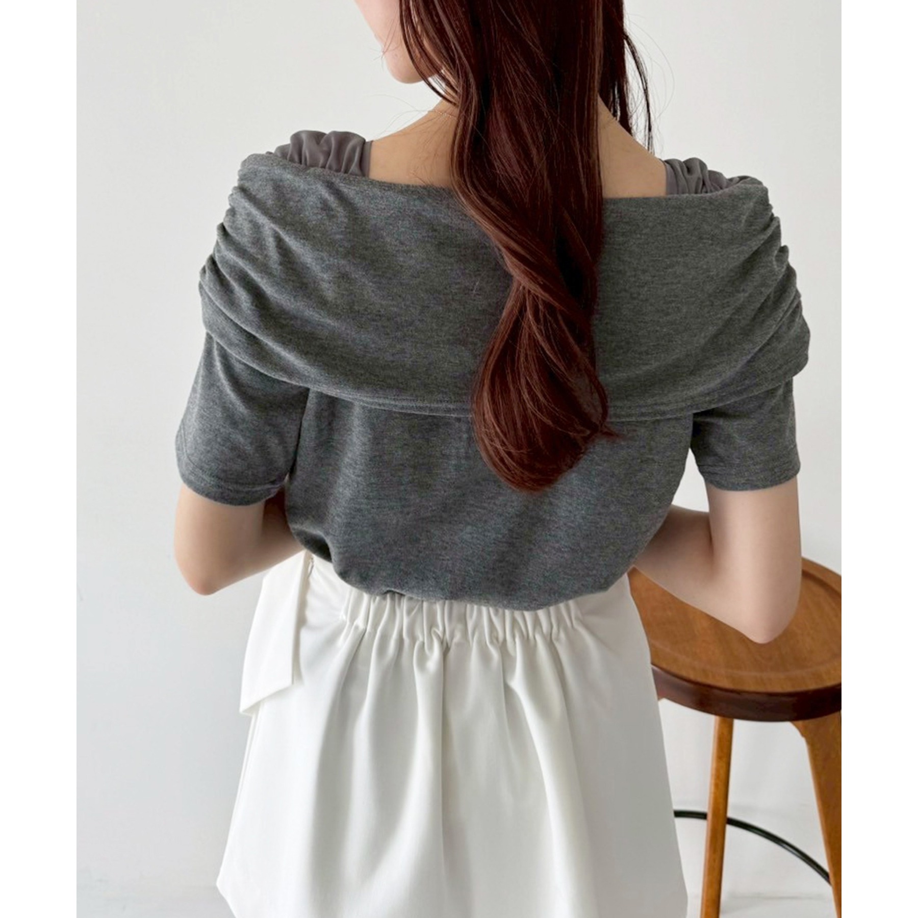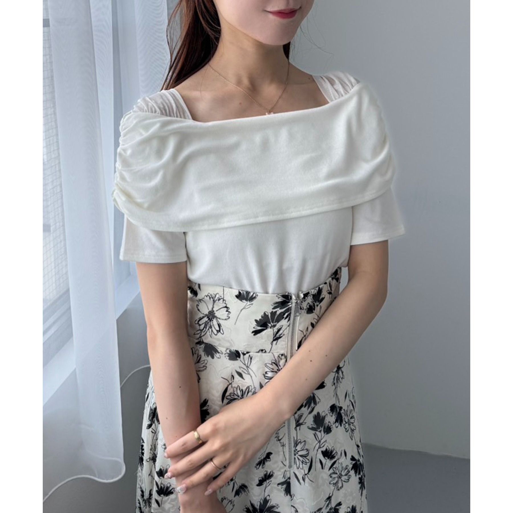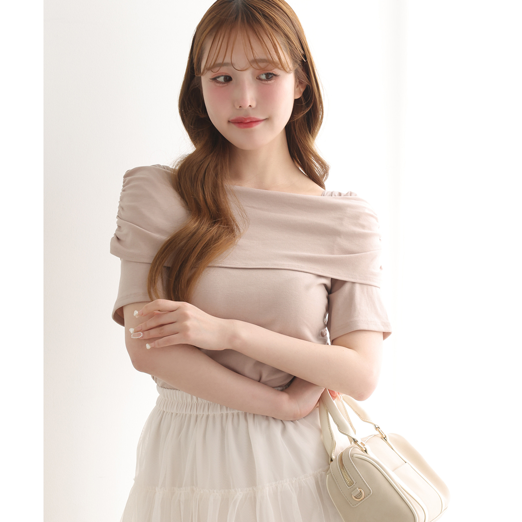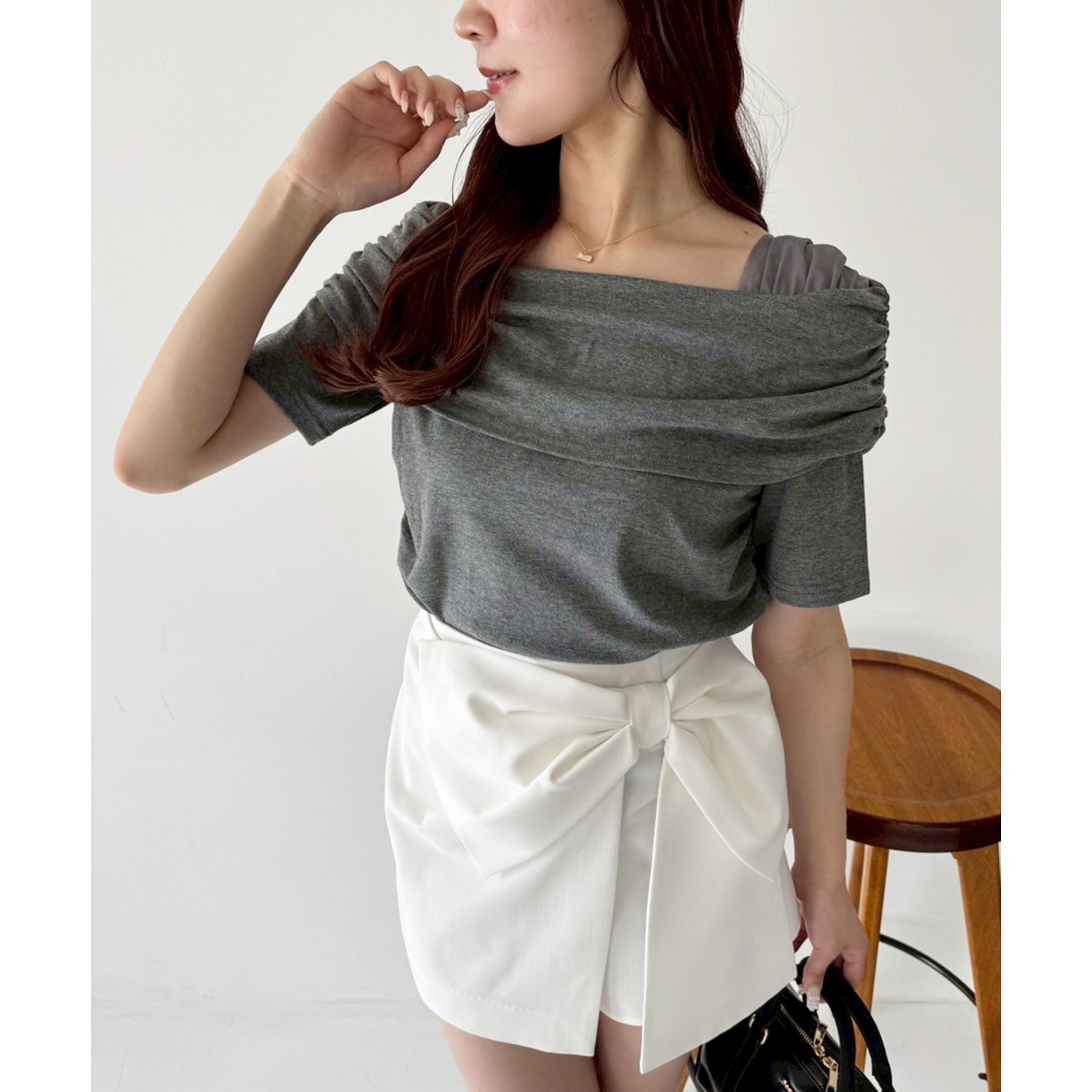 オフショル部分は大きく折り返しているので大人っぽい印象に。