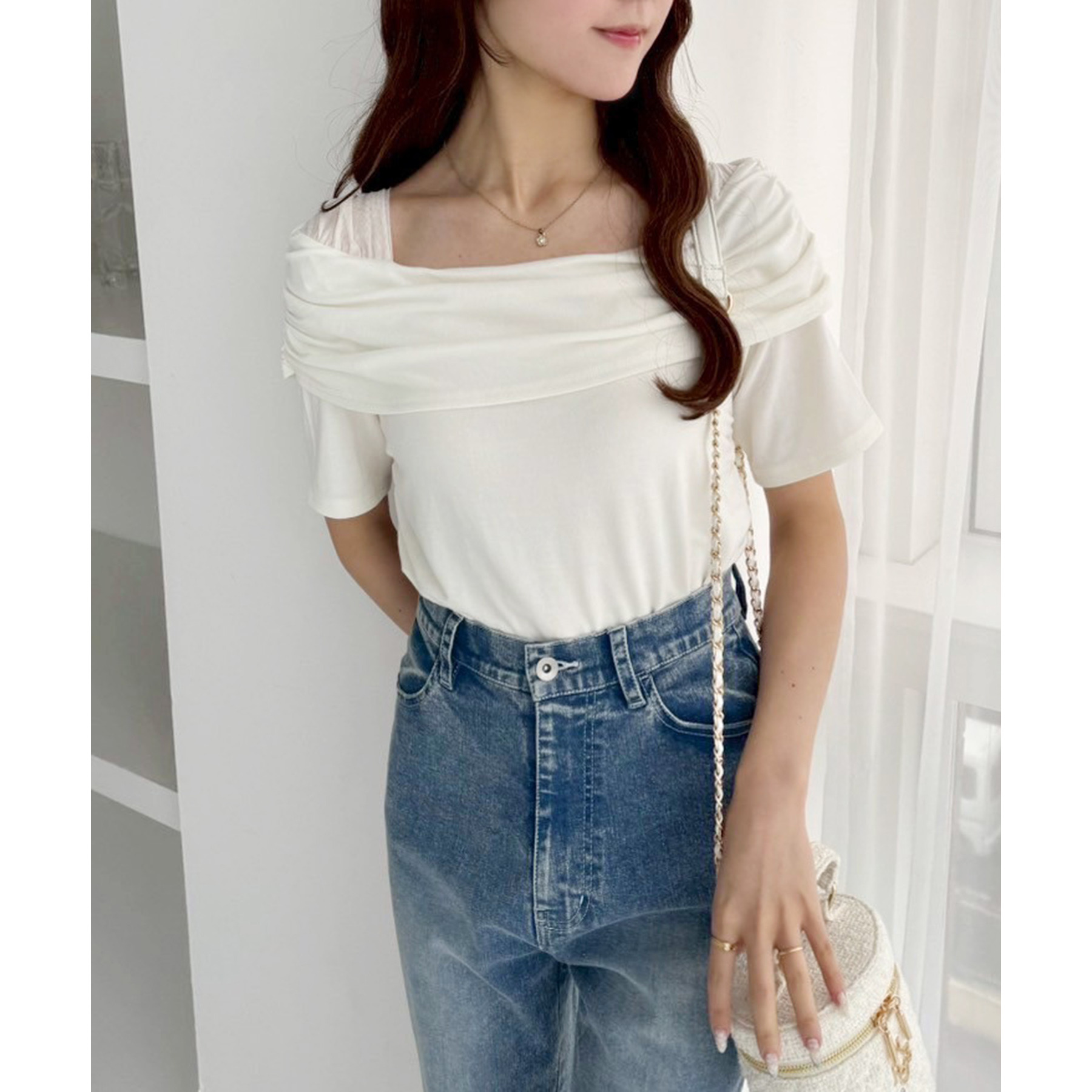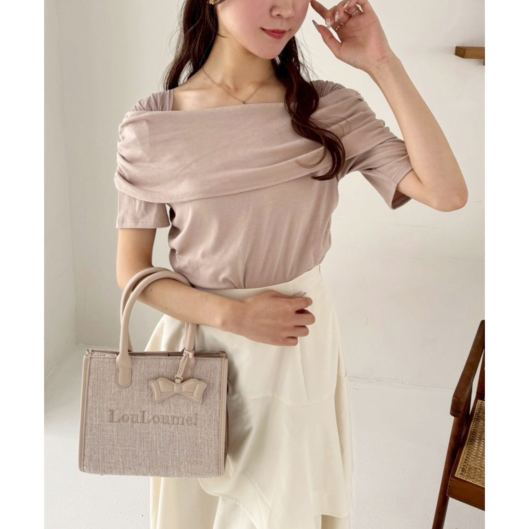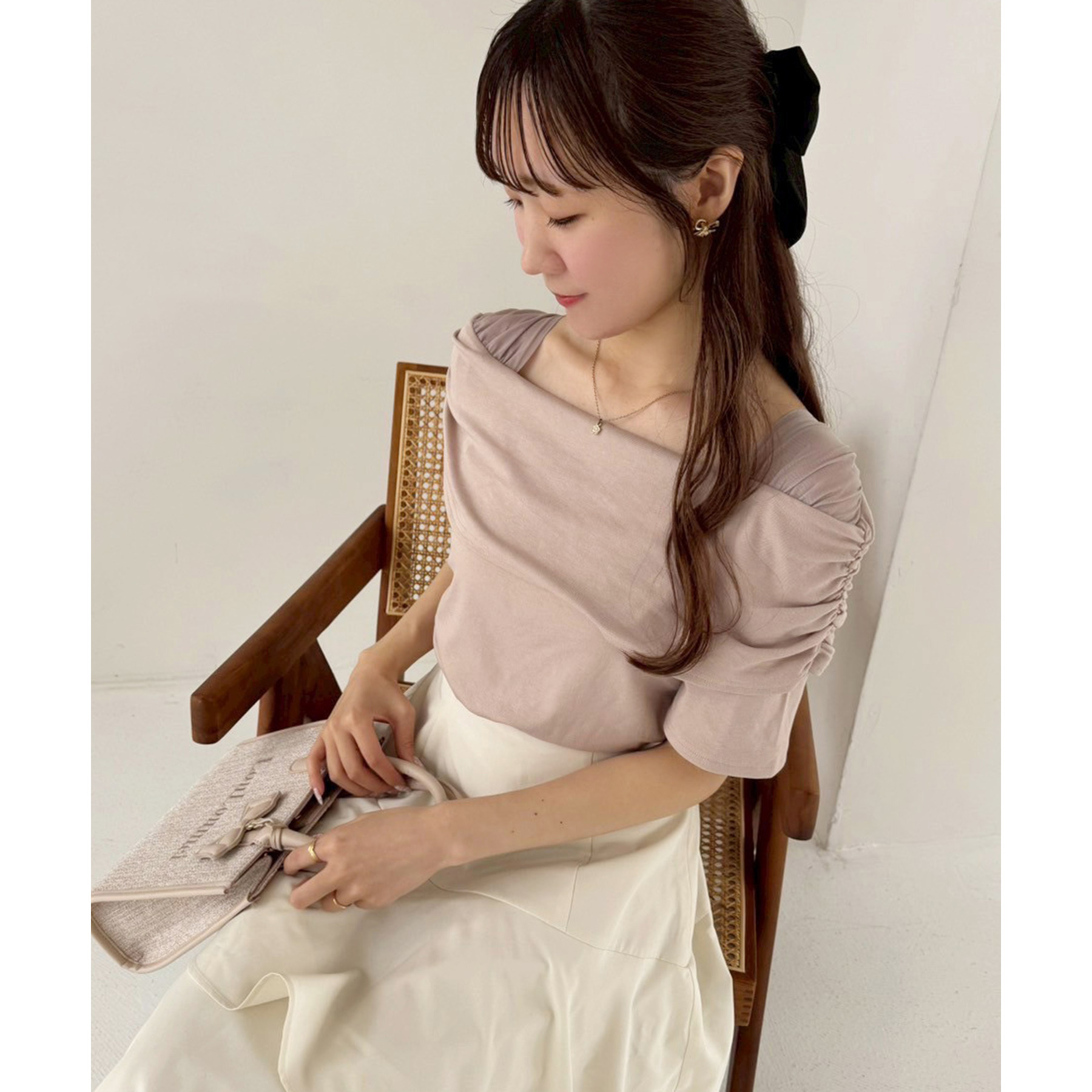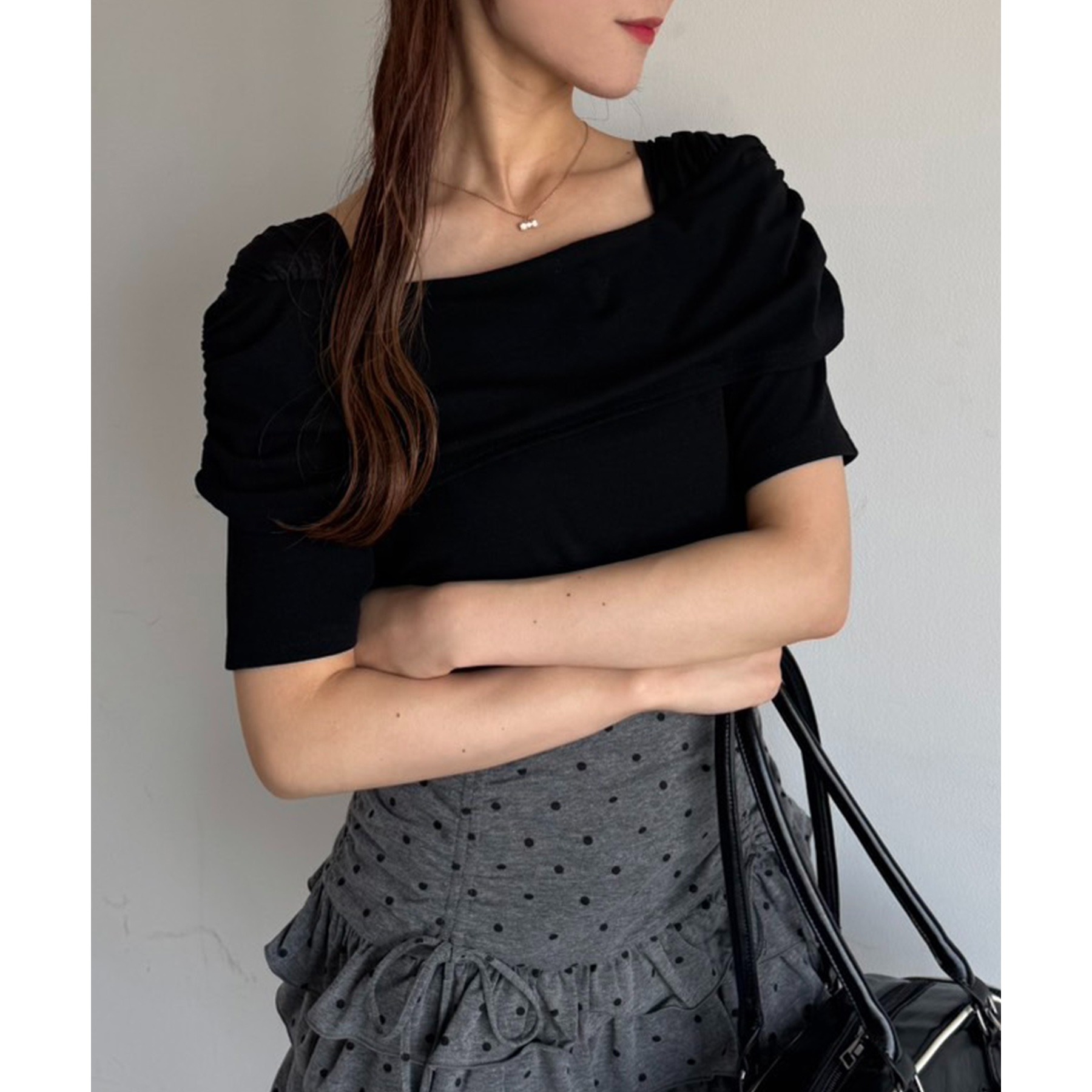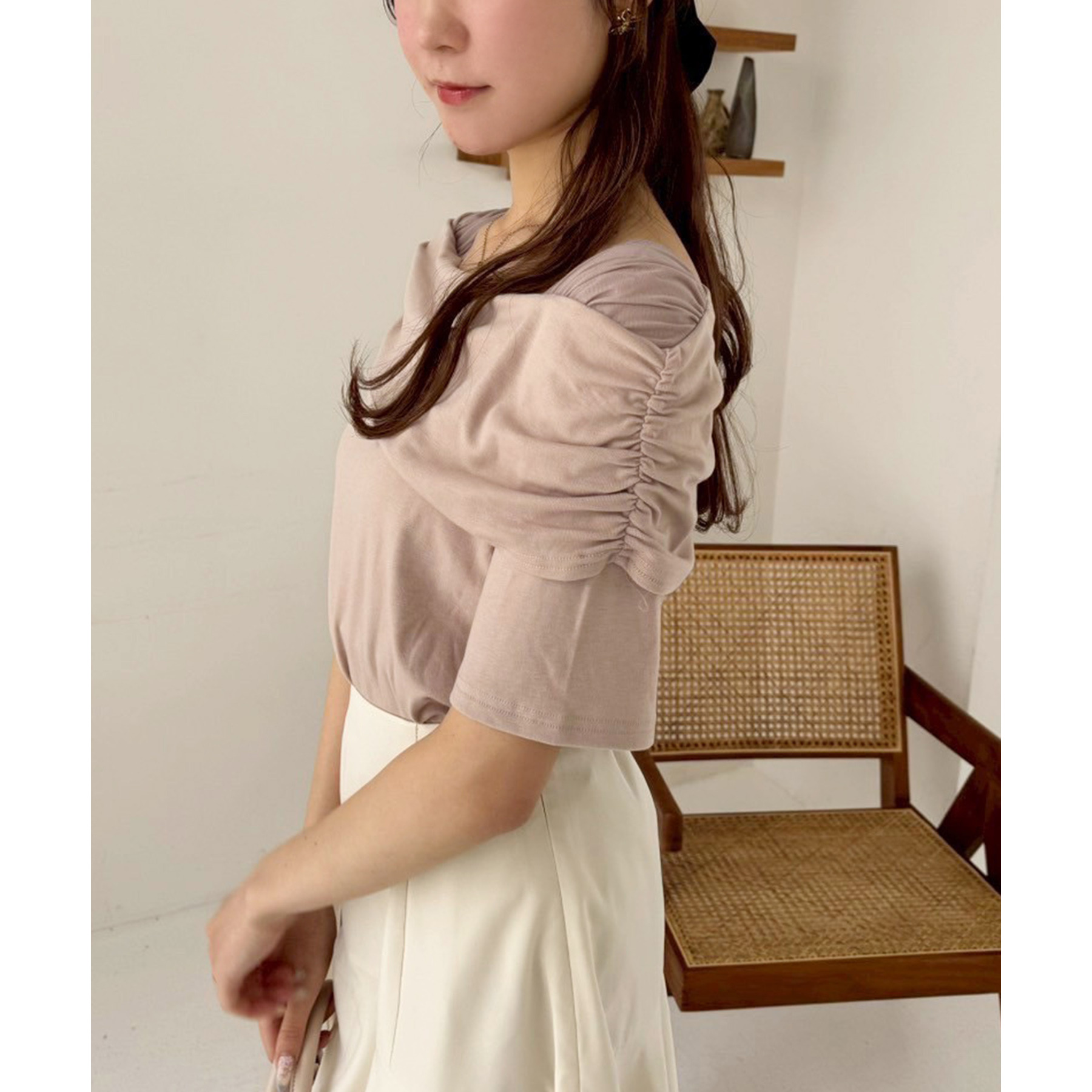 オフショル部分は大きく折り返しているので大人っぽい印象に。