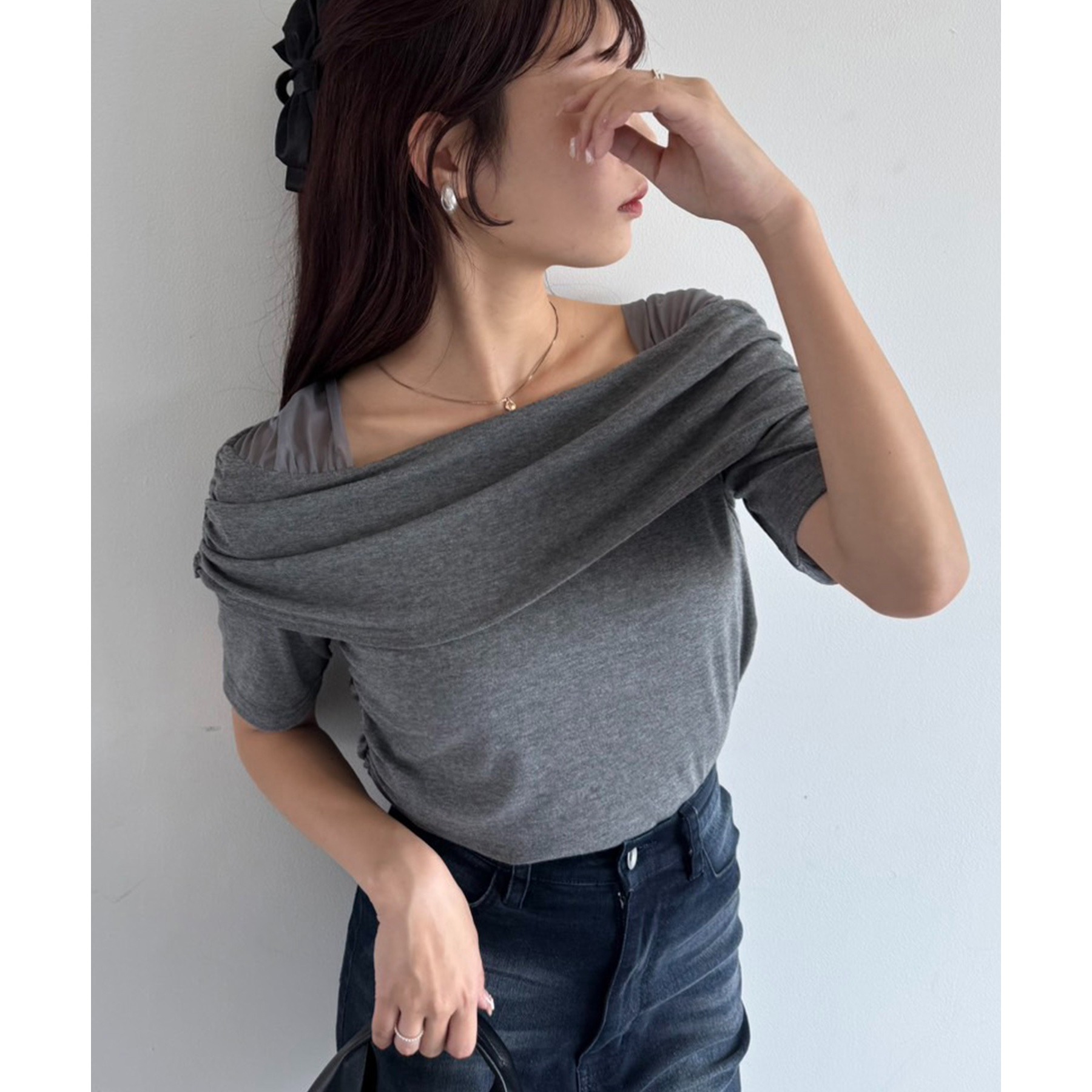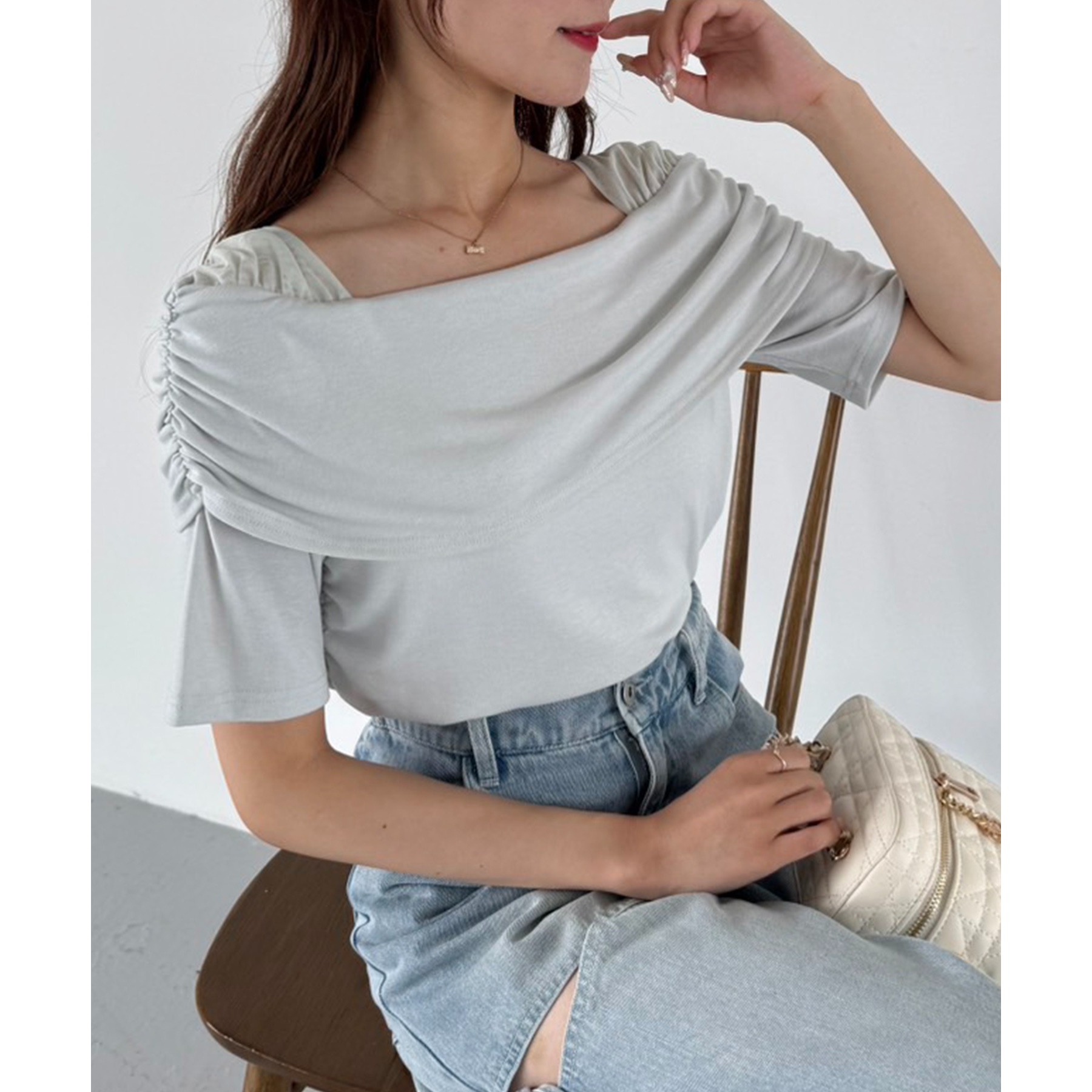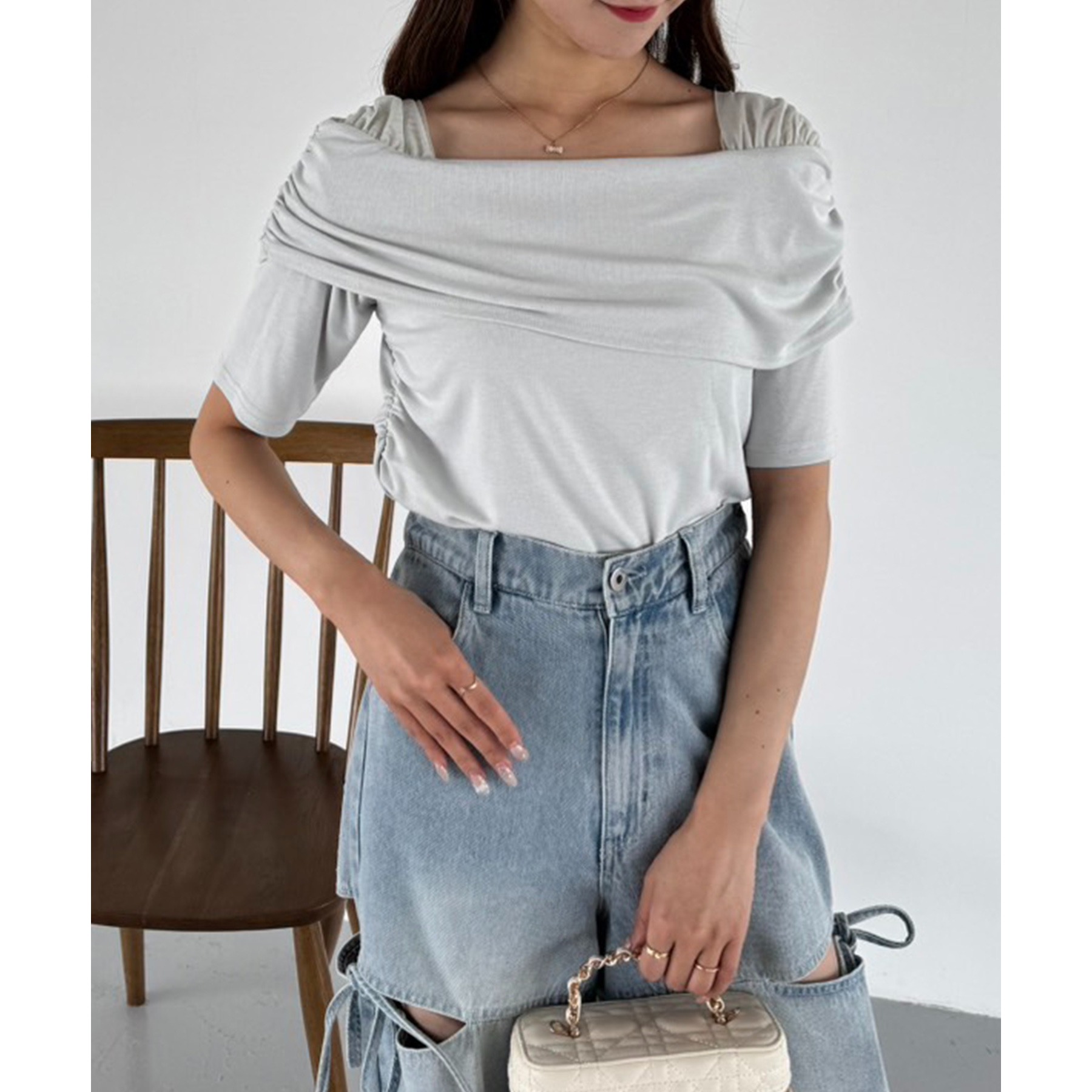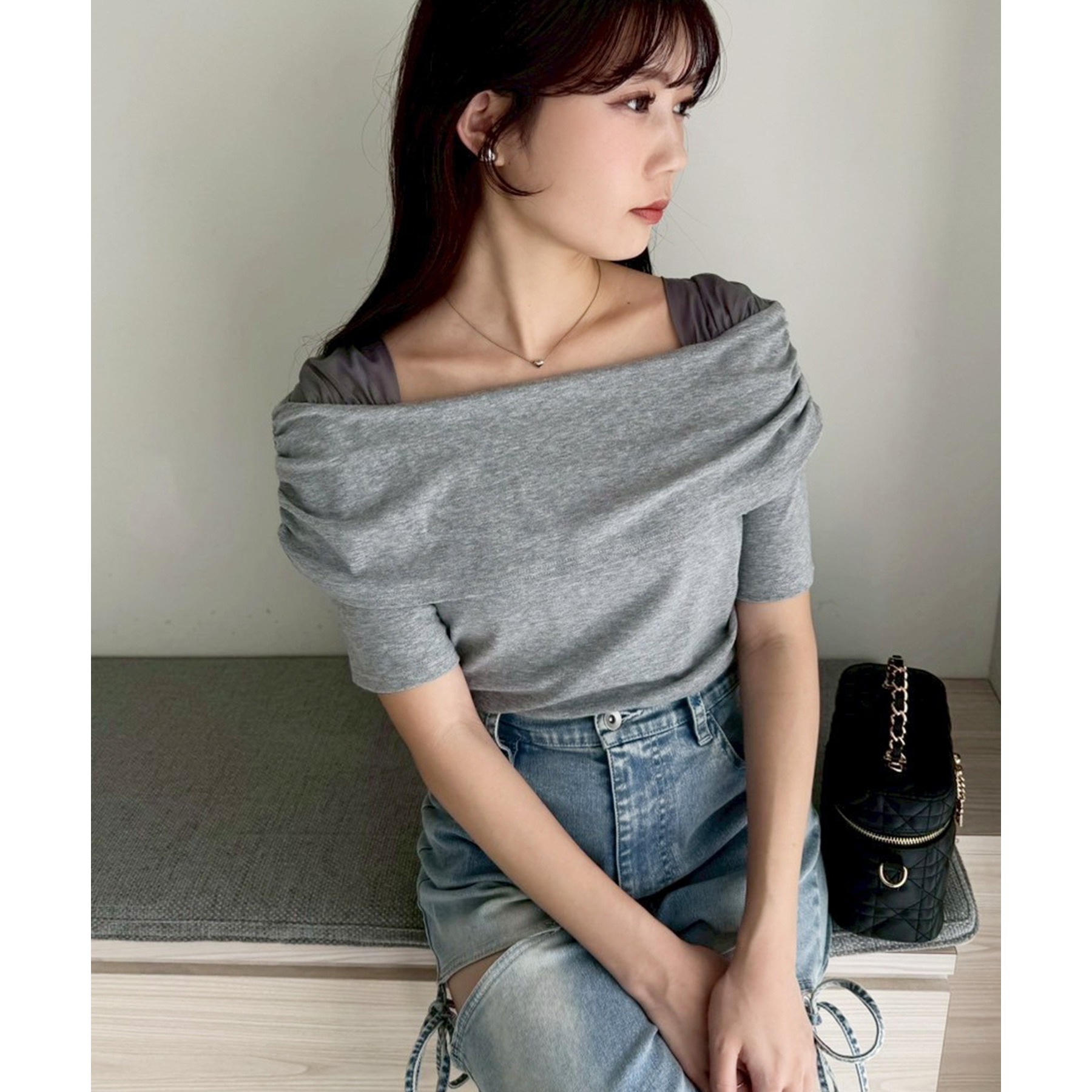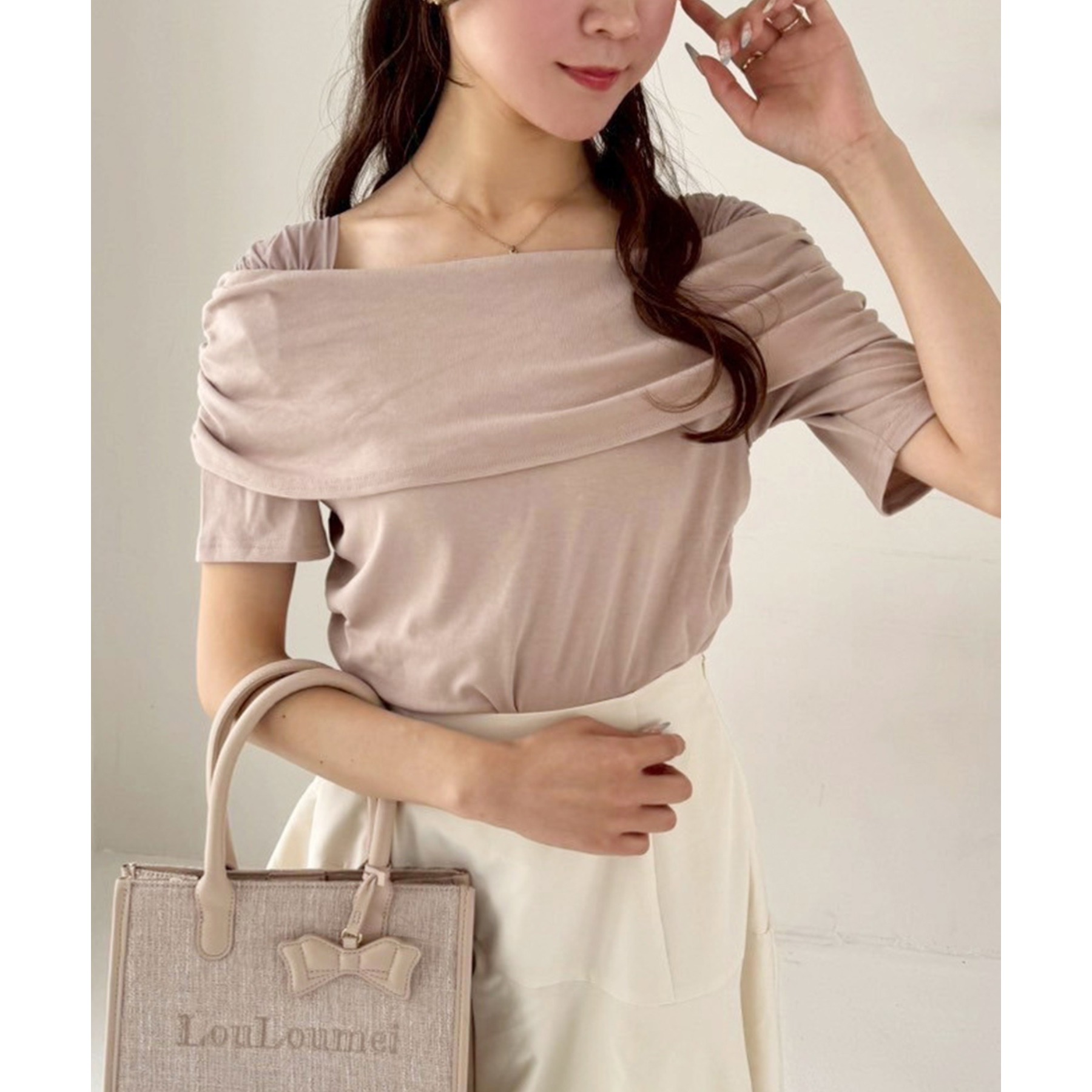オフショル部分は大きく折り返しているので大人っぽい印象に。