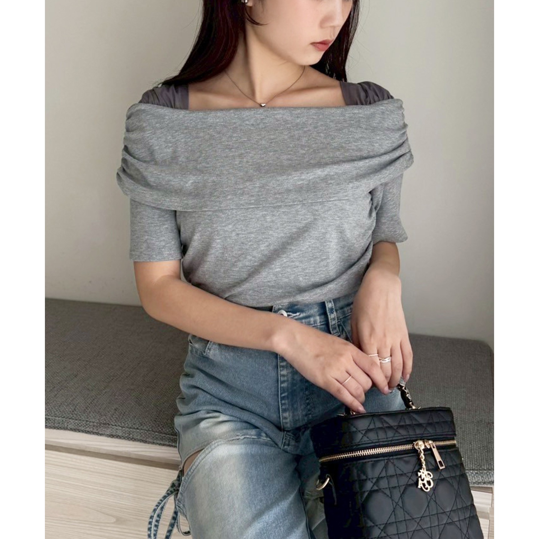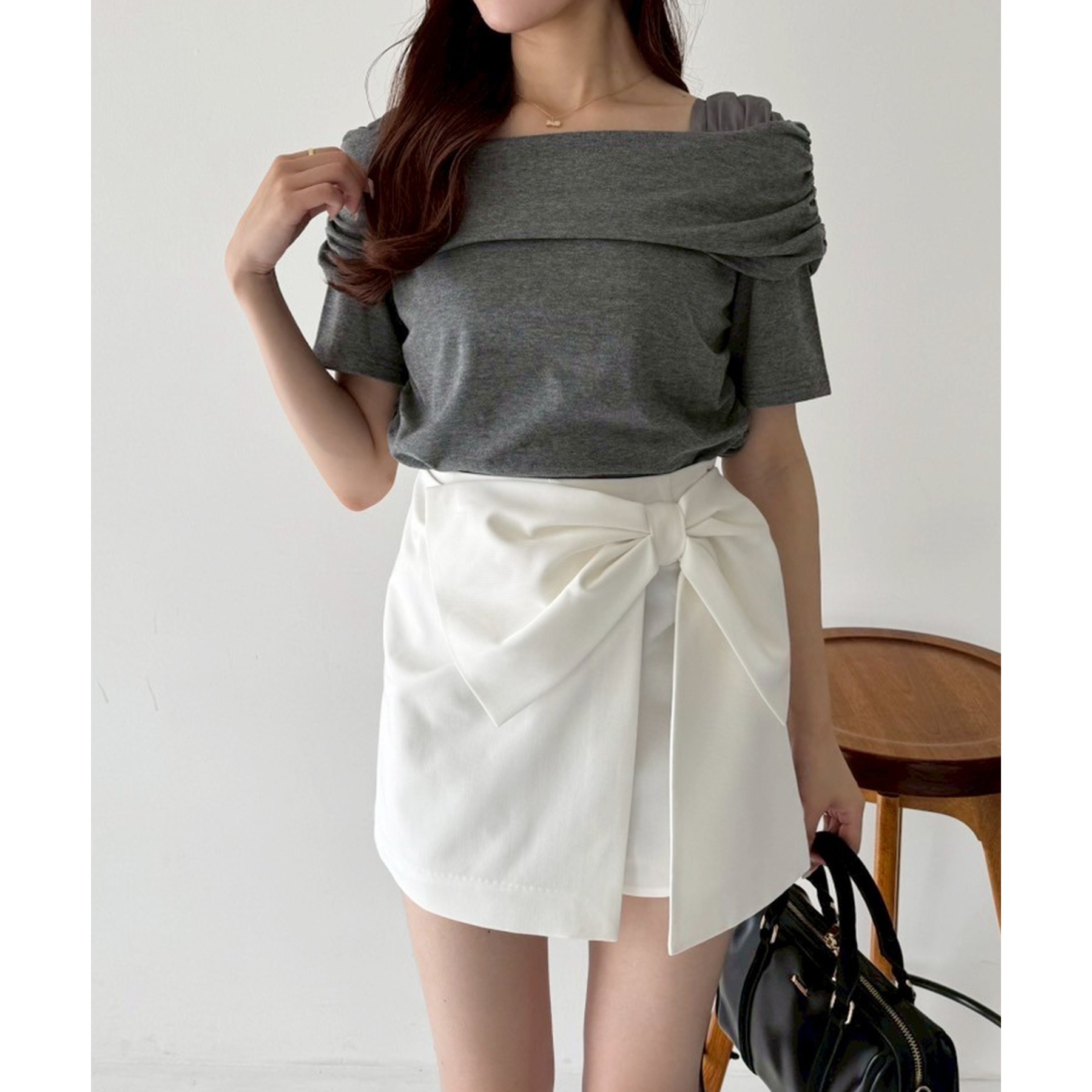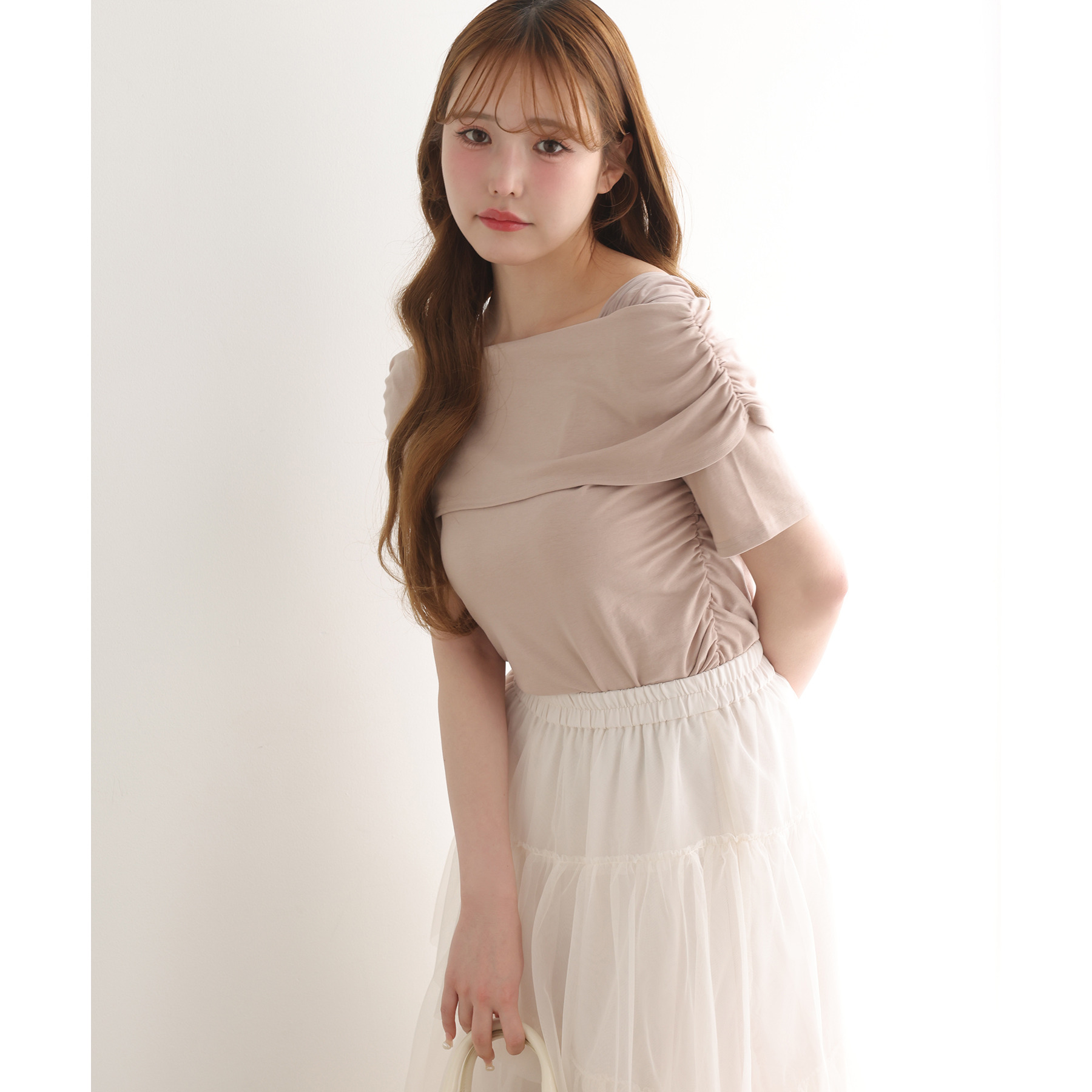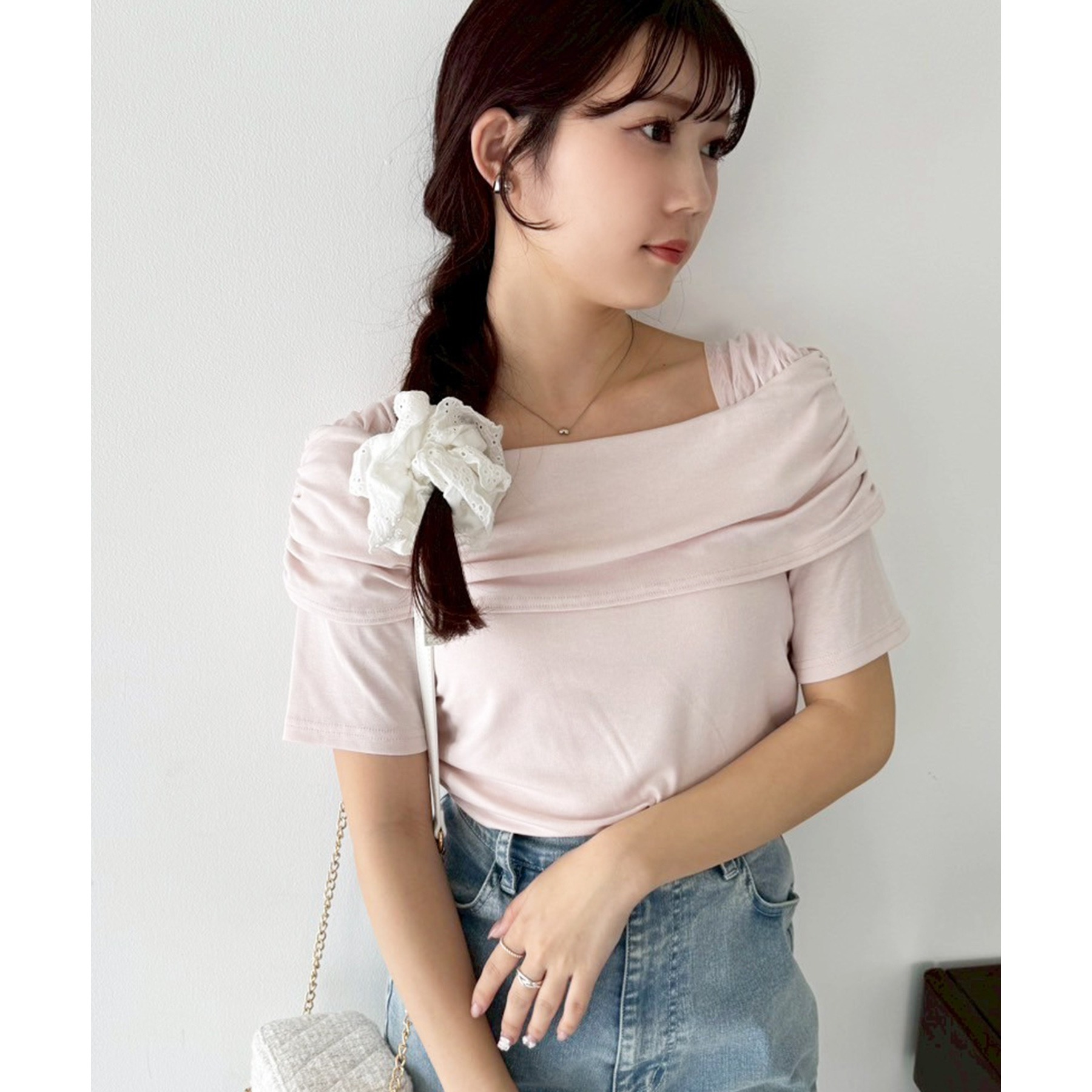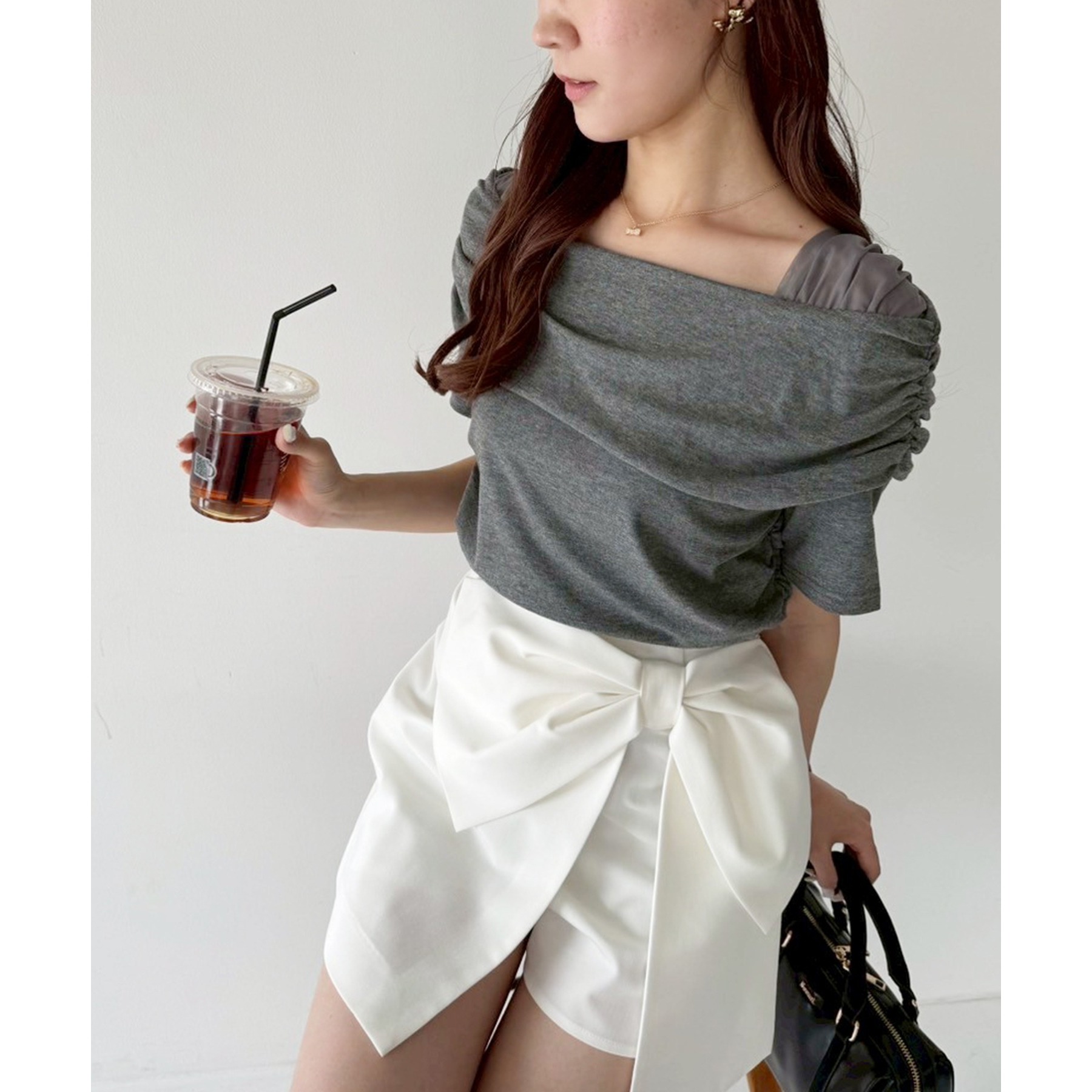 オフショル部分は大きく折り返しているので大人っぽい印象に。