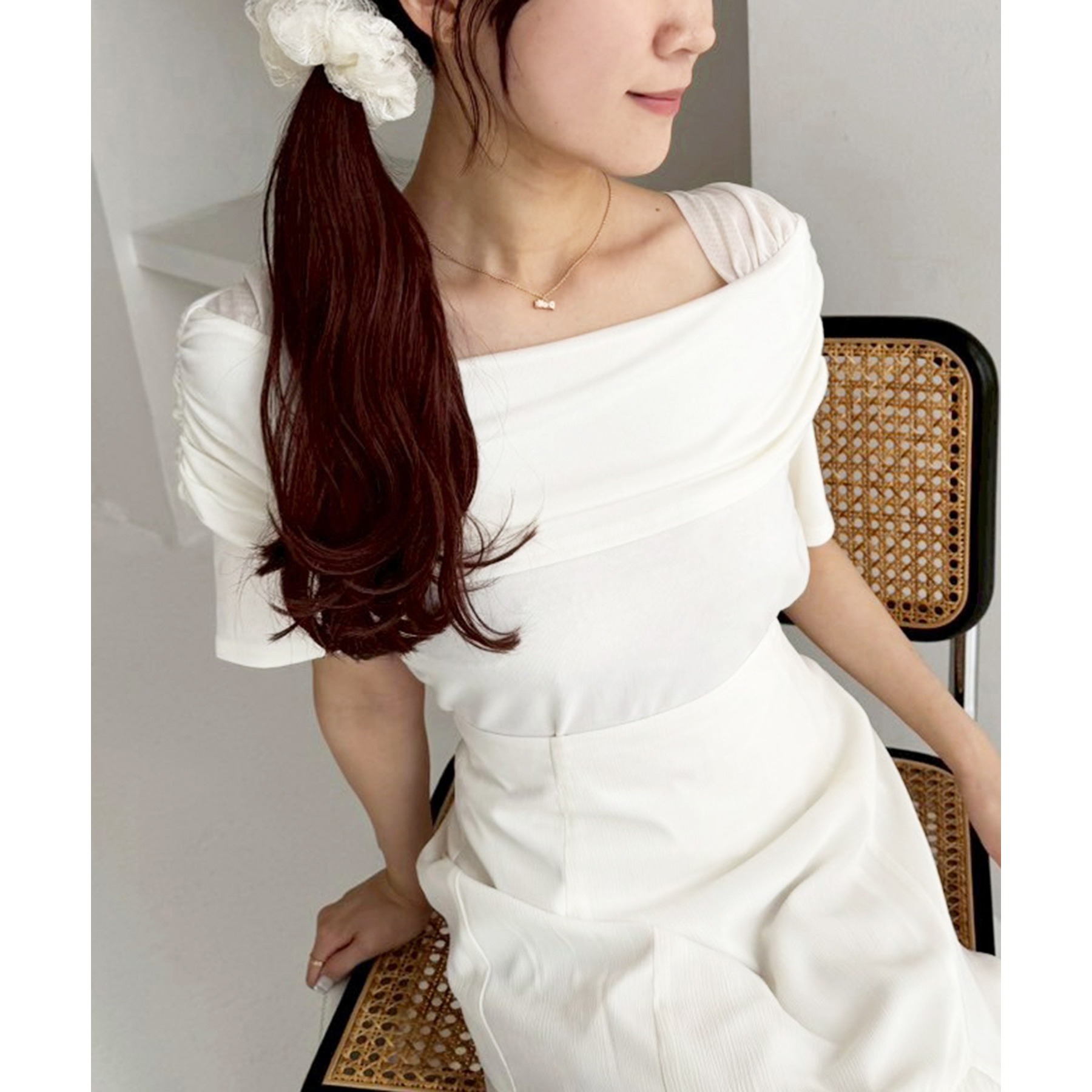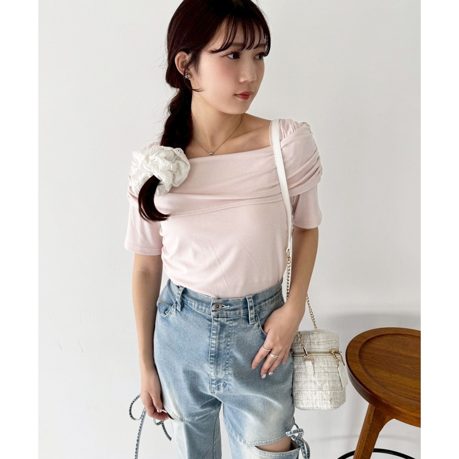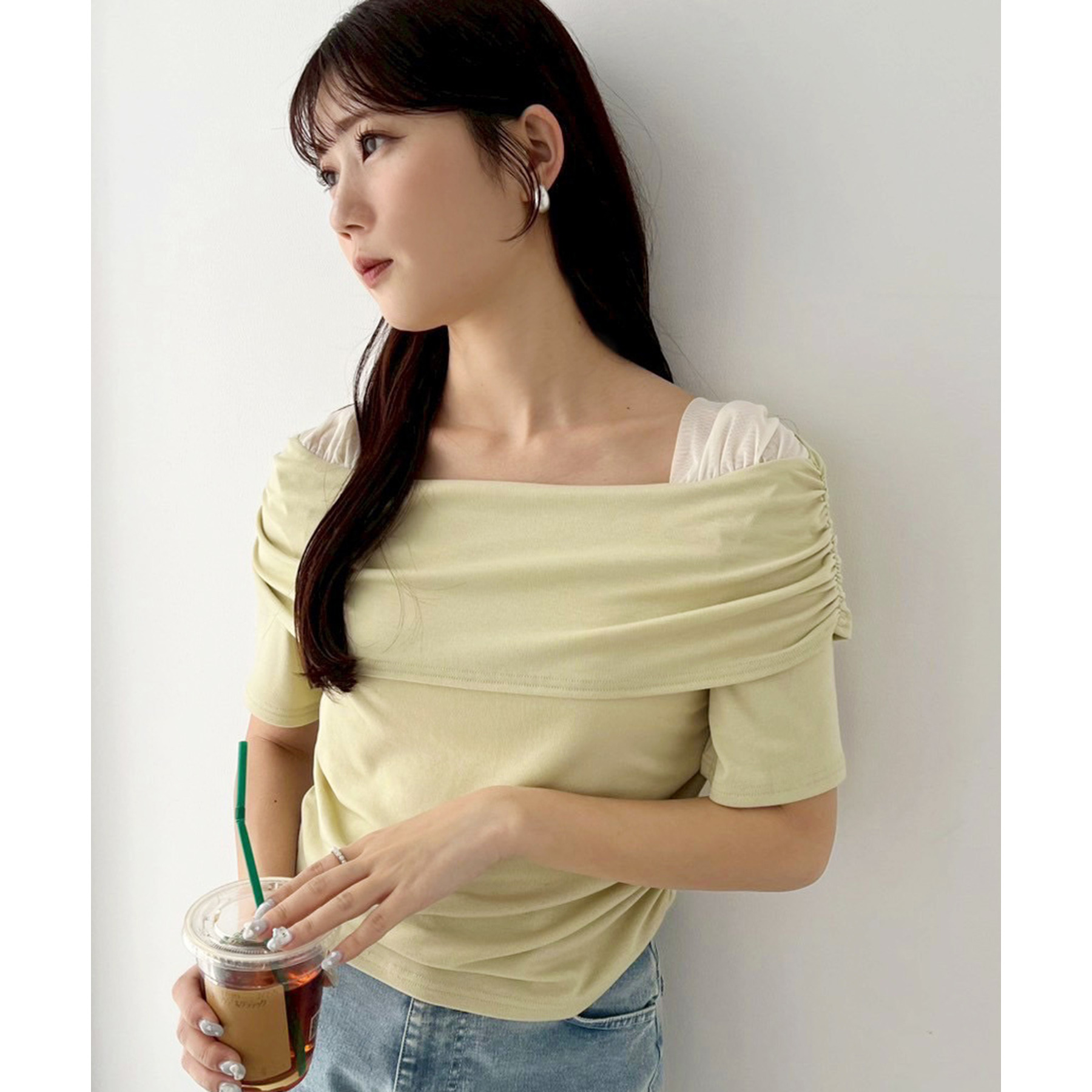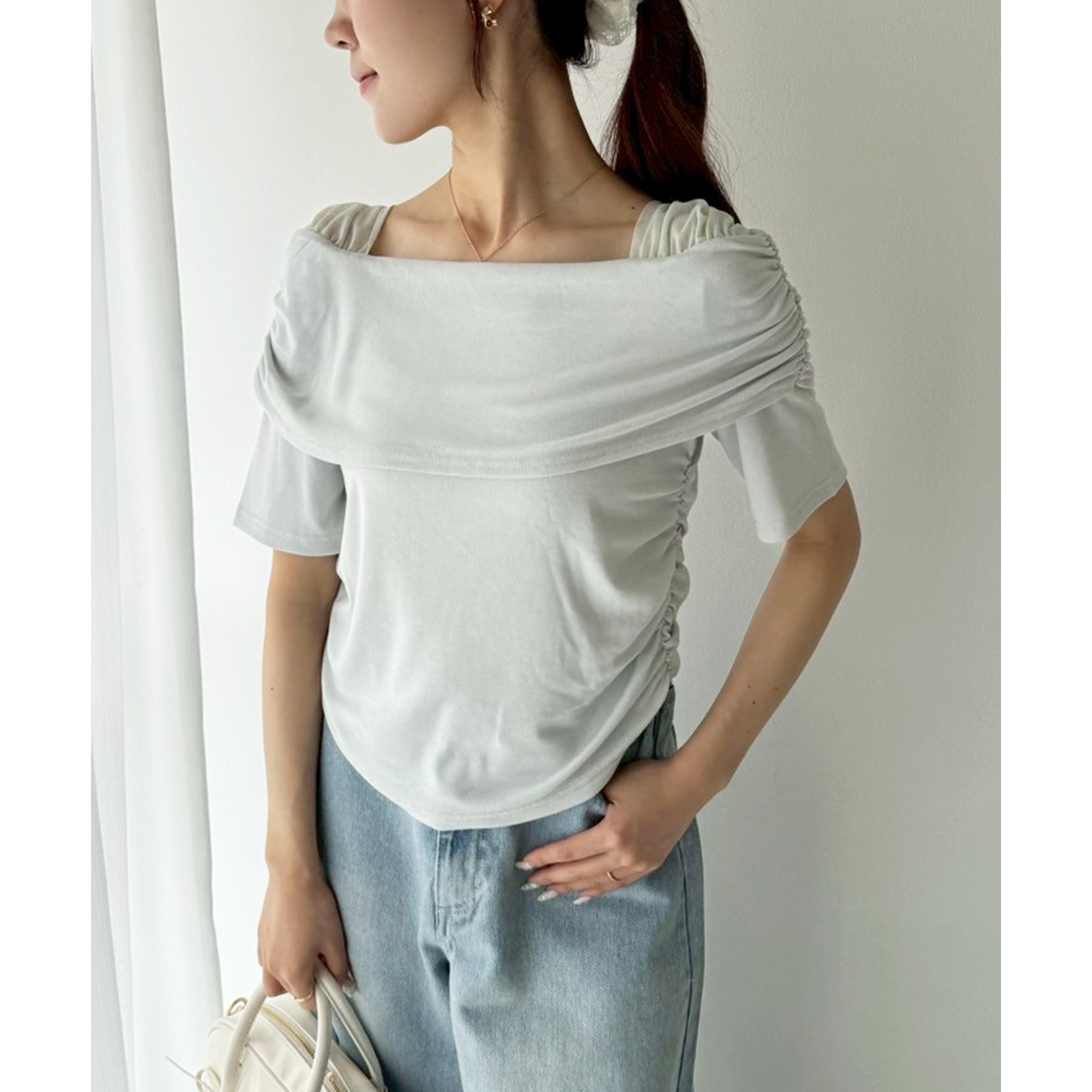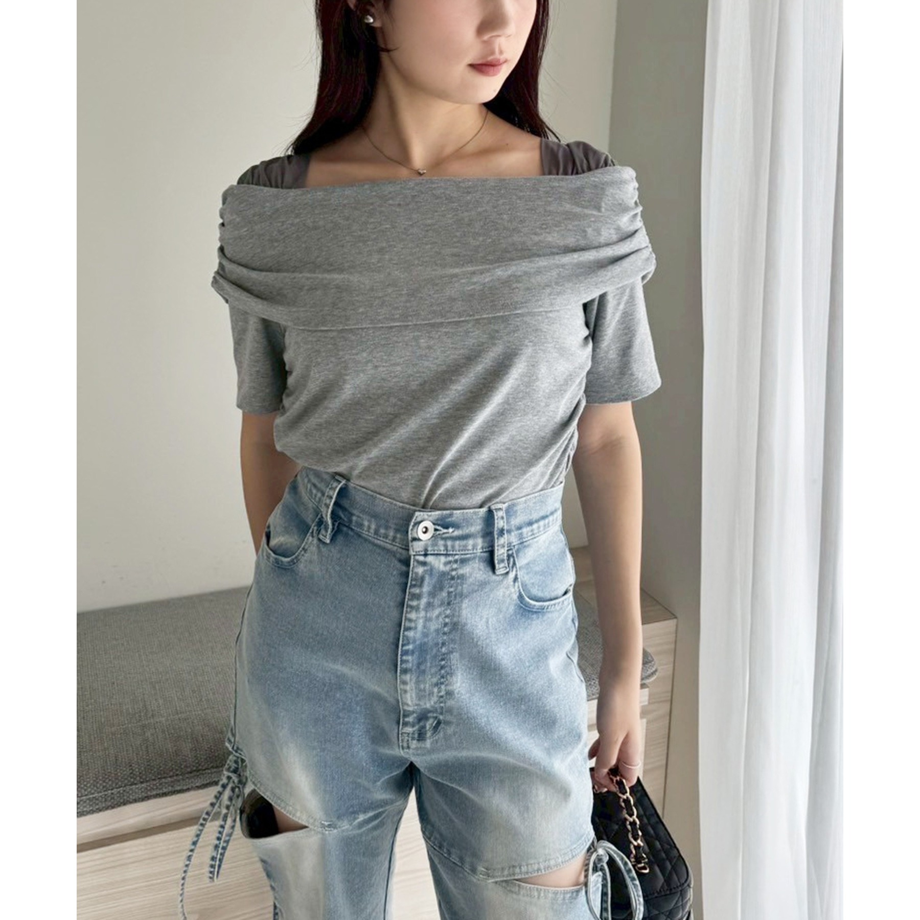 オフショル部分は大きく折り返しているので大人っぽい印象に。