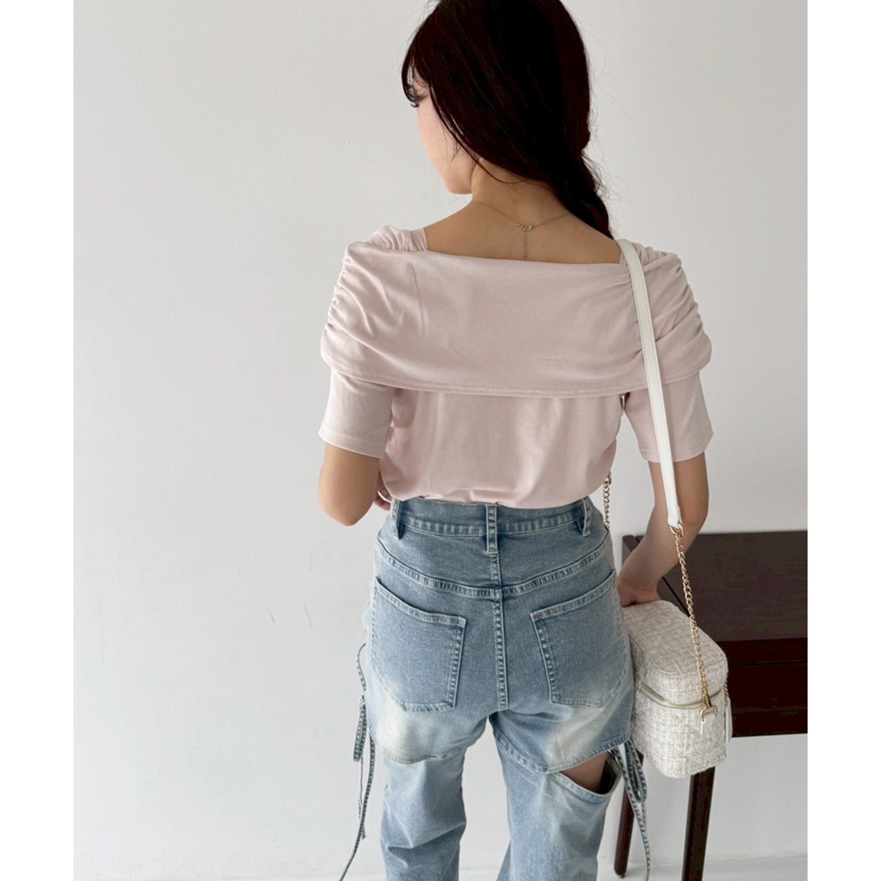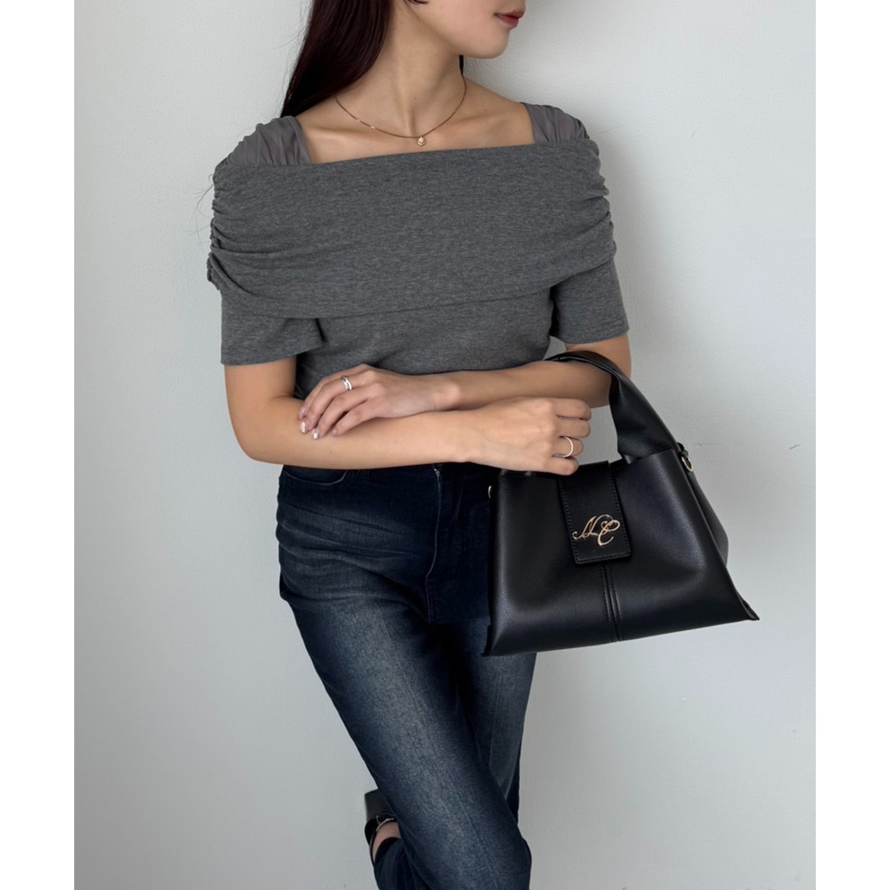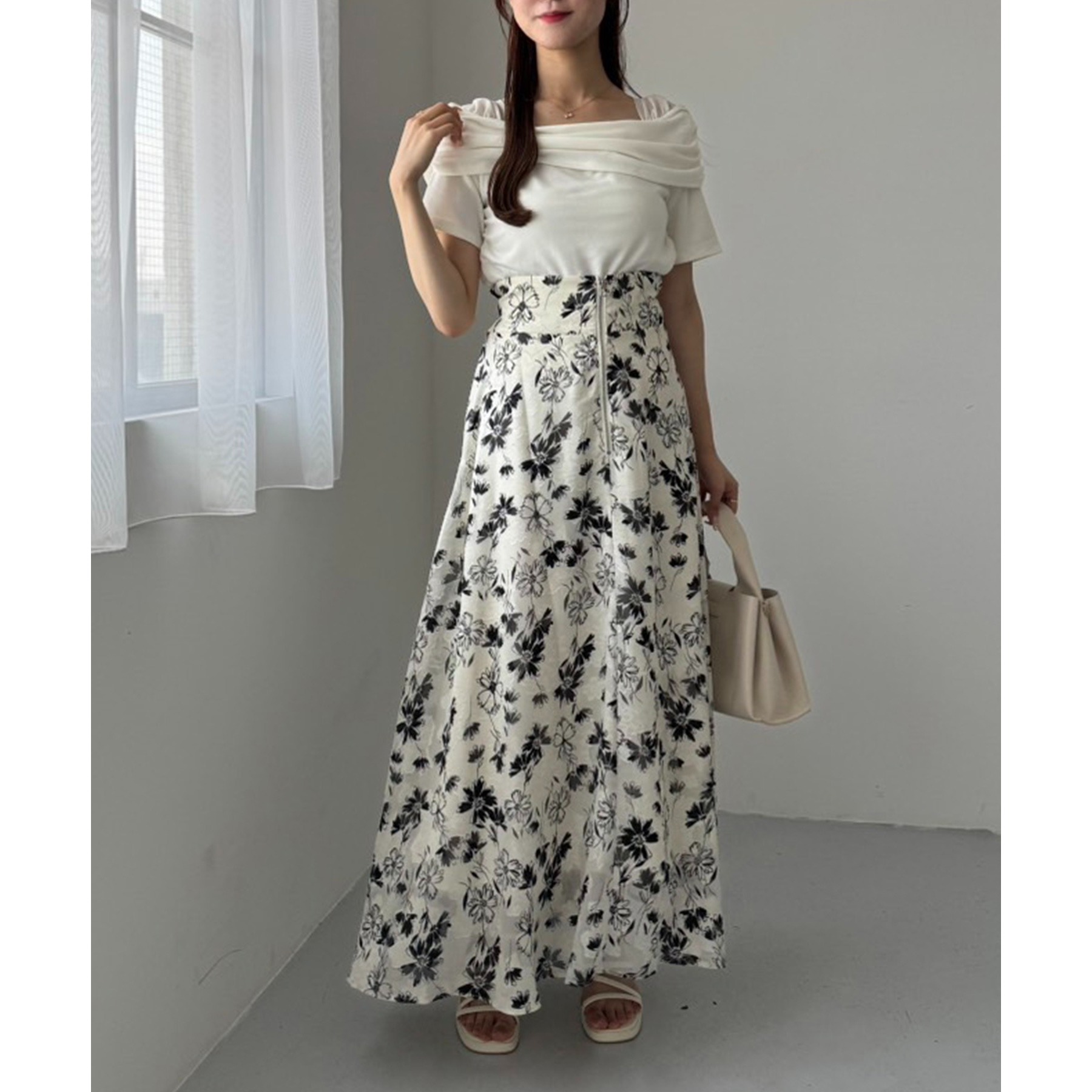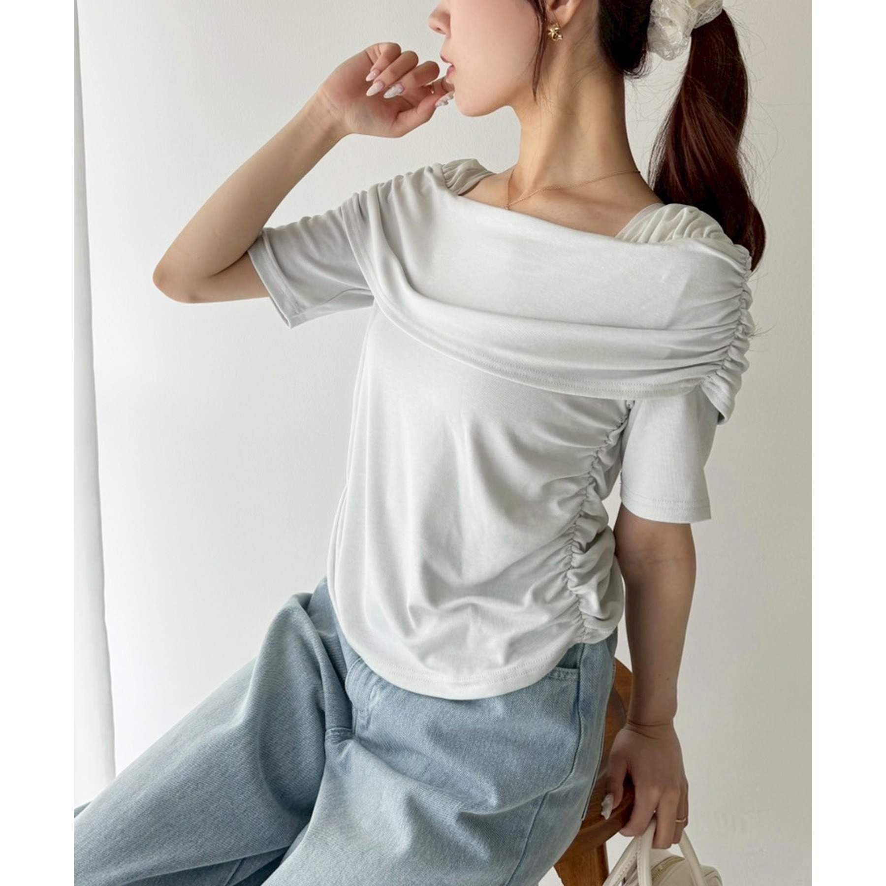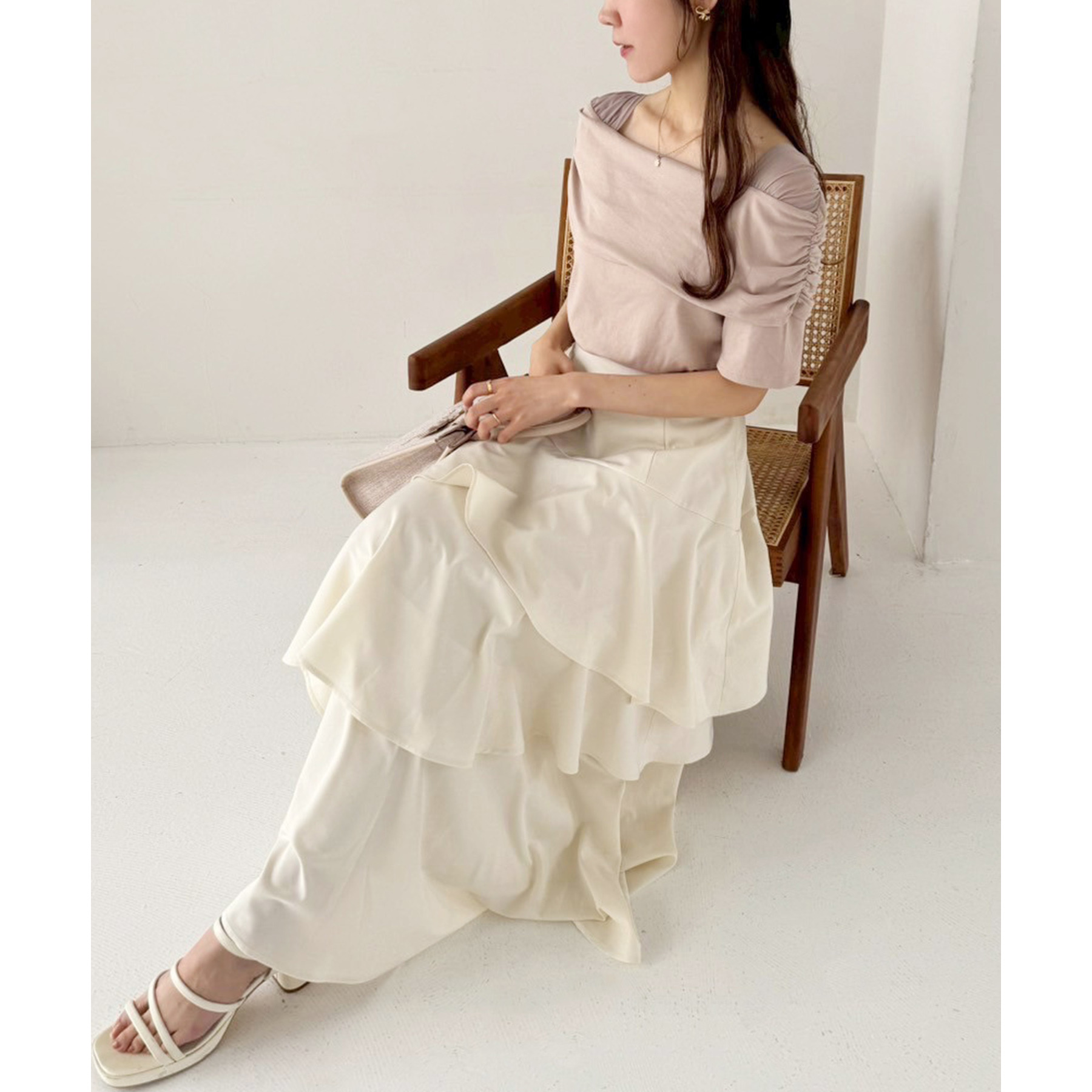オフショル部分は大きく折り返しているので大人っぽい印象に。