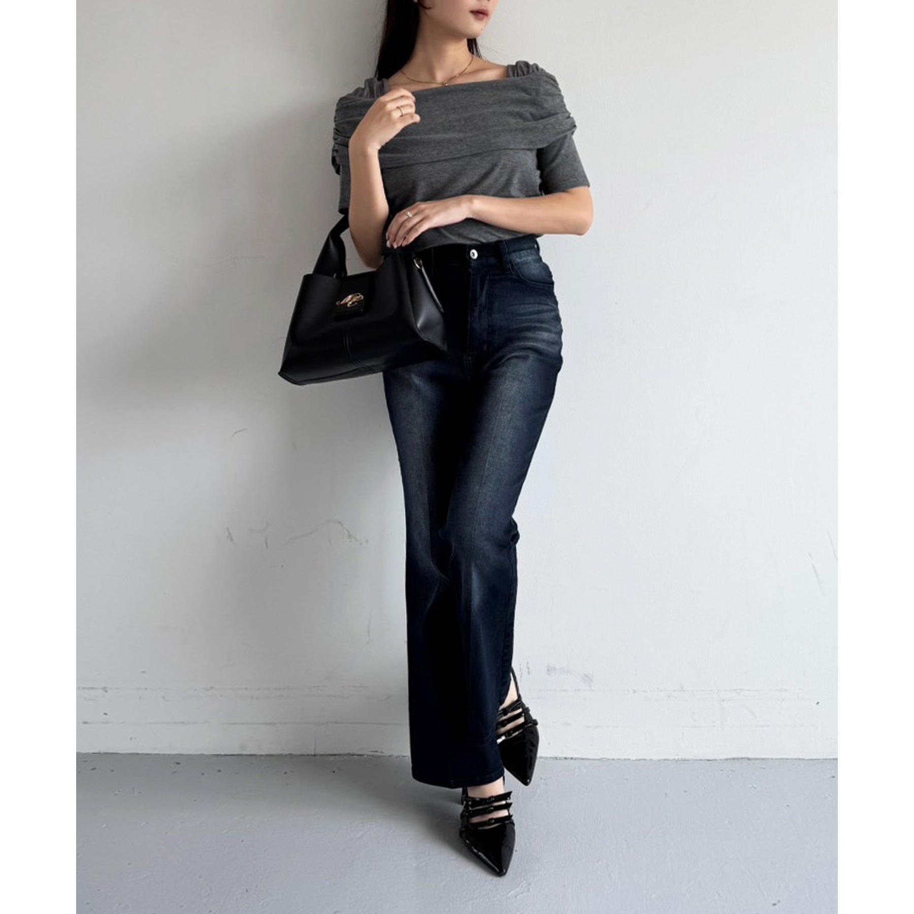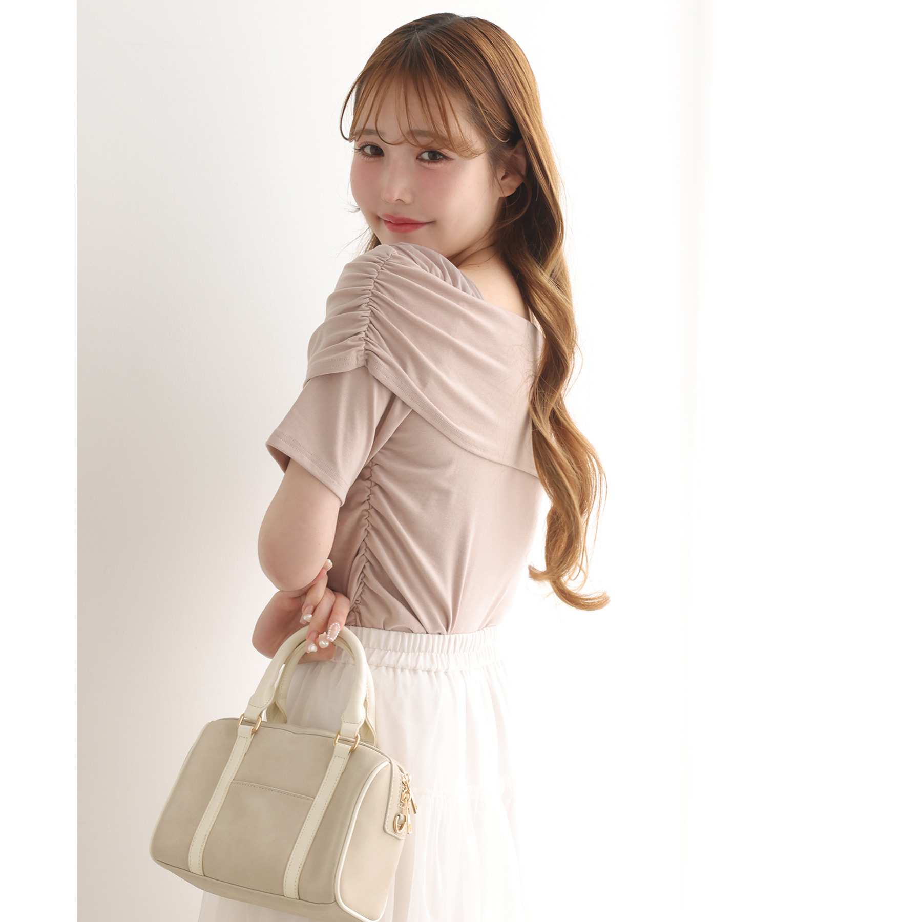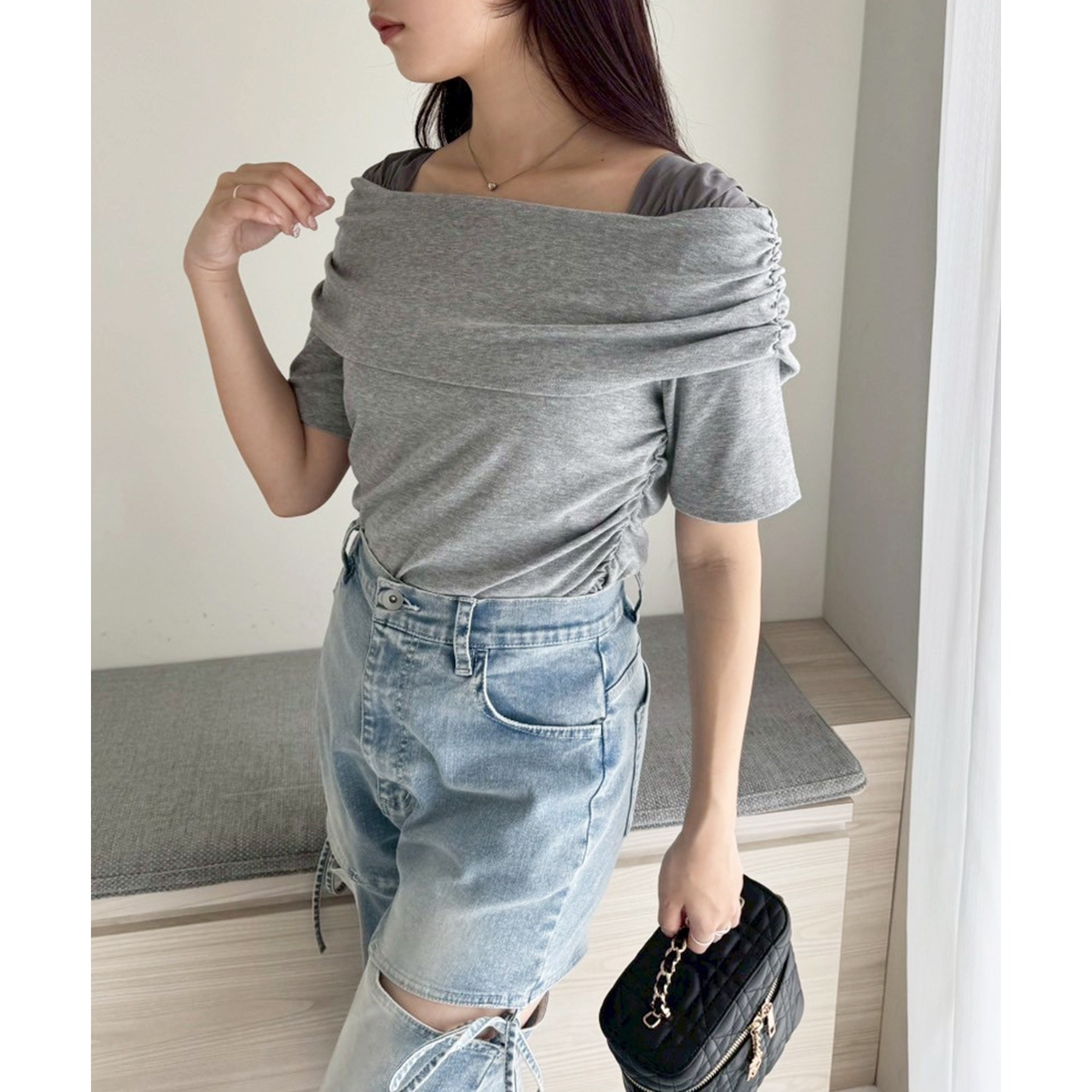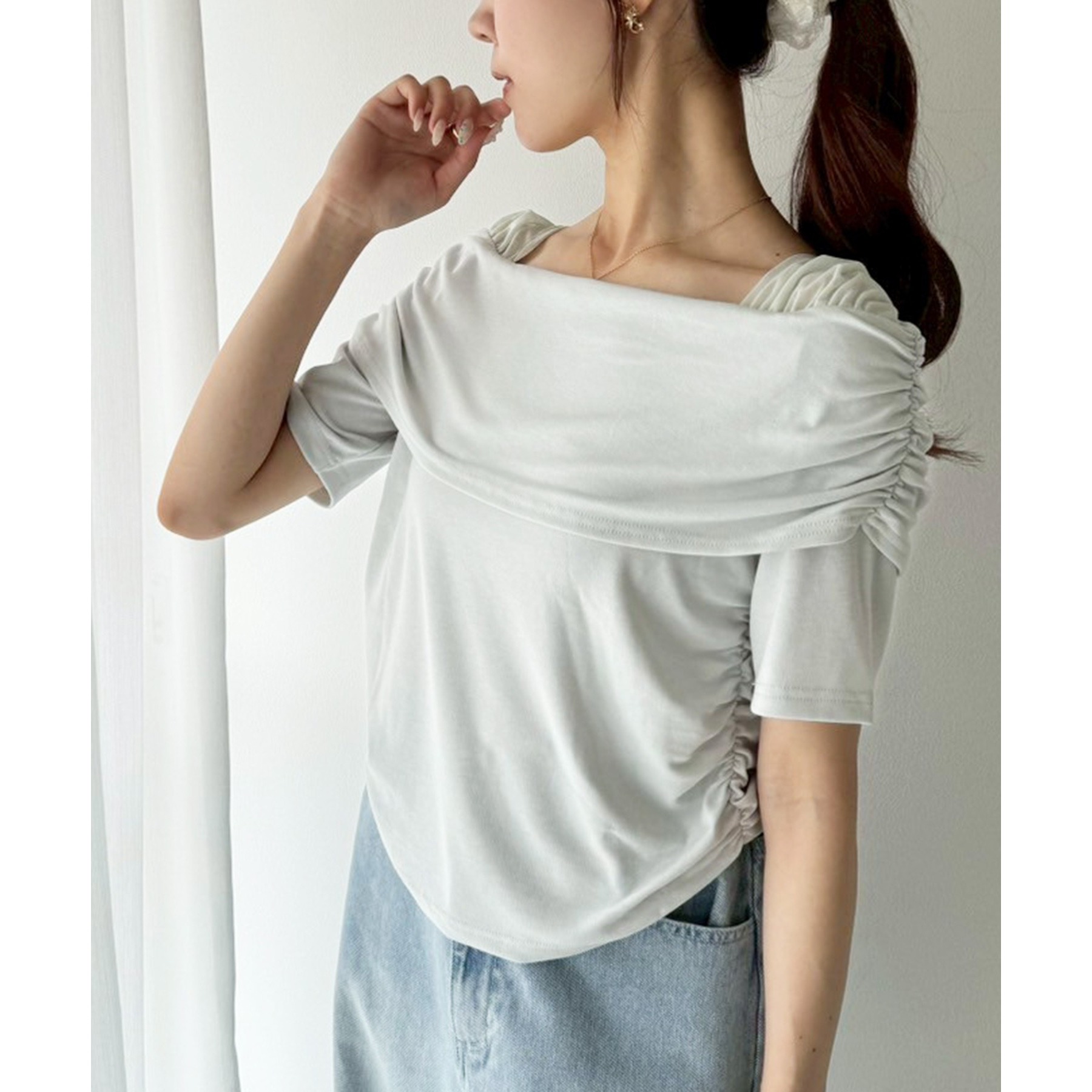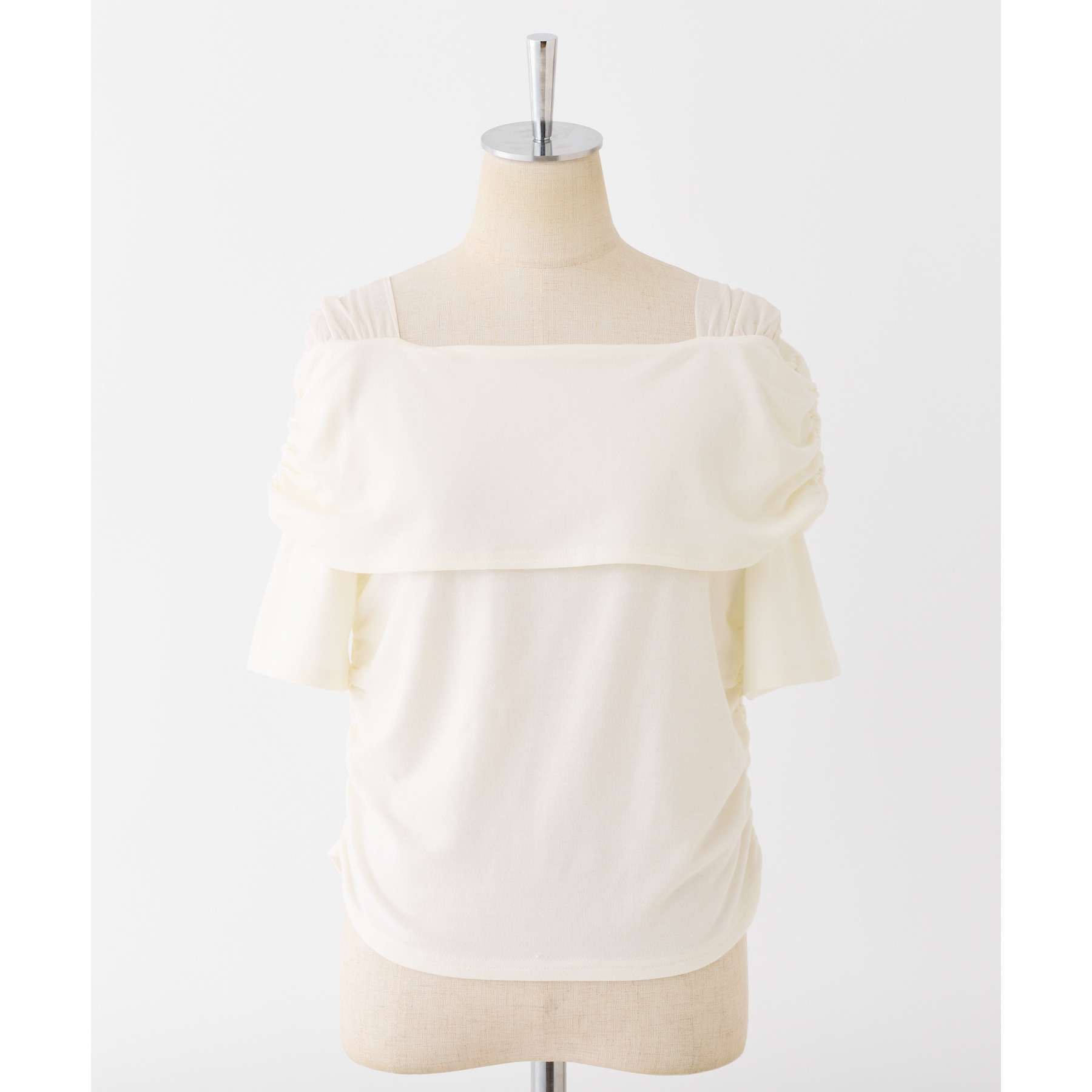 オフショル部分は大きく折り返しているので大人っぽい印象に。