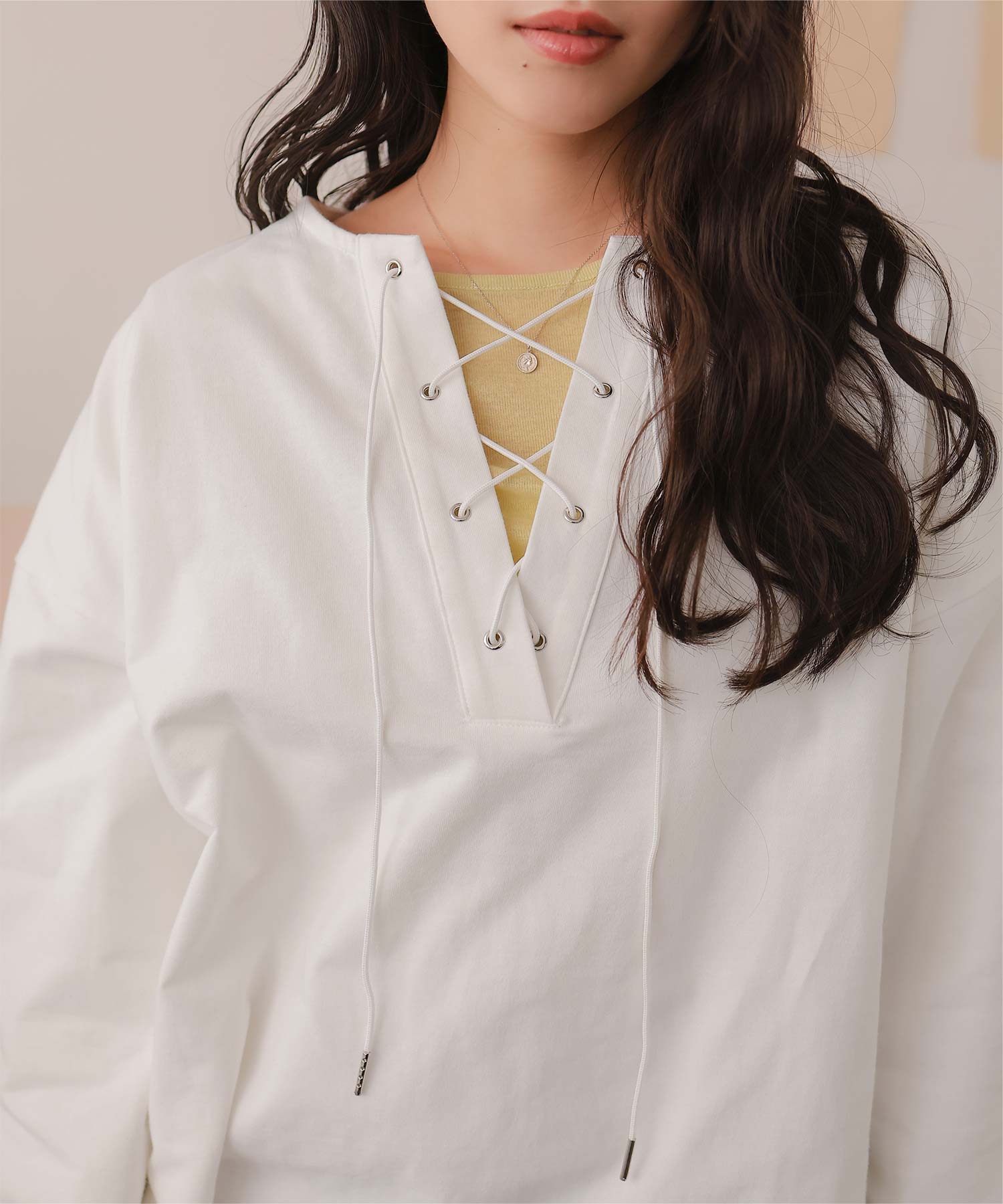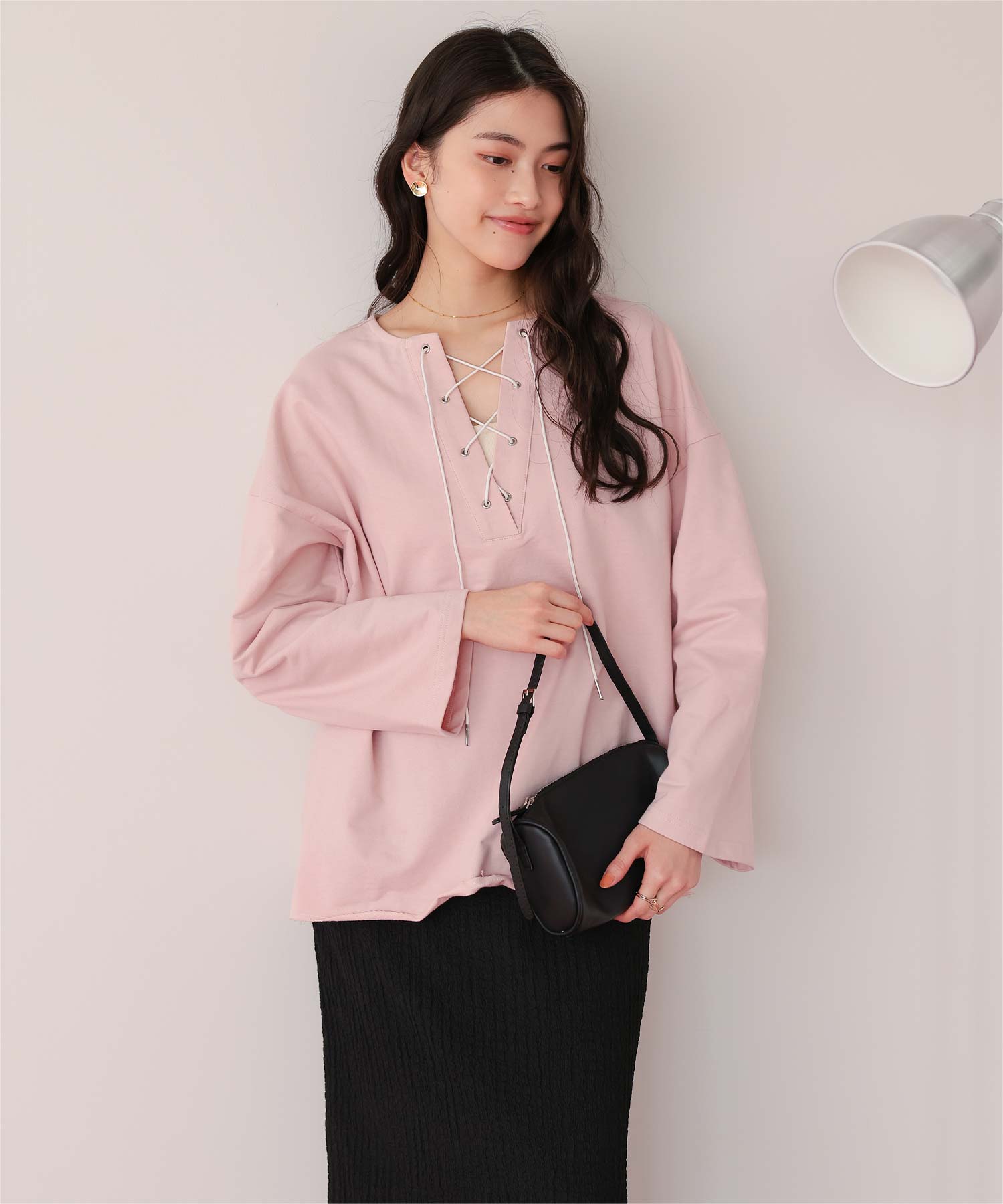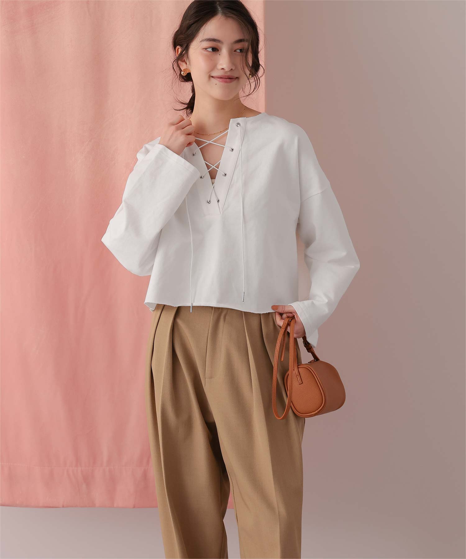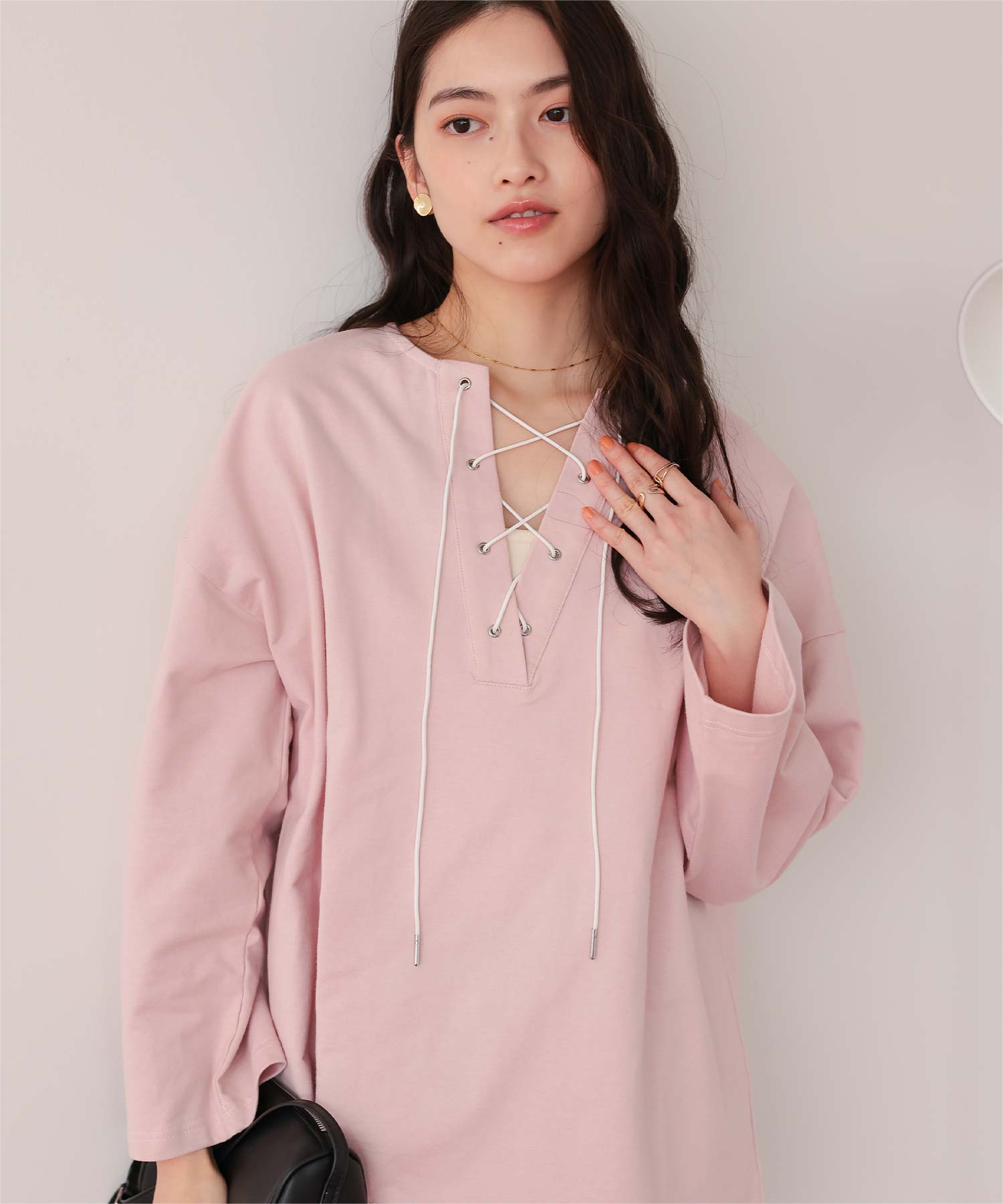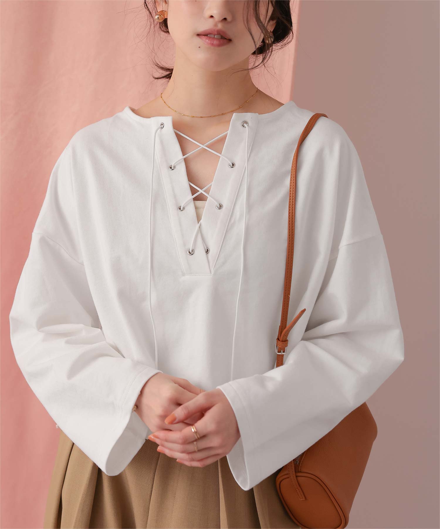 ・胸元のレースアップが印象的なデザインで、甘すぎず大人可愛いバランスを実現