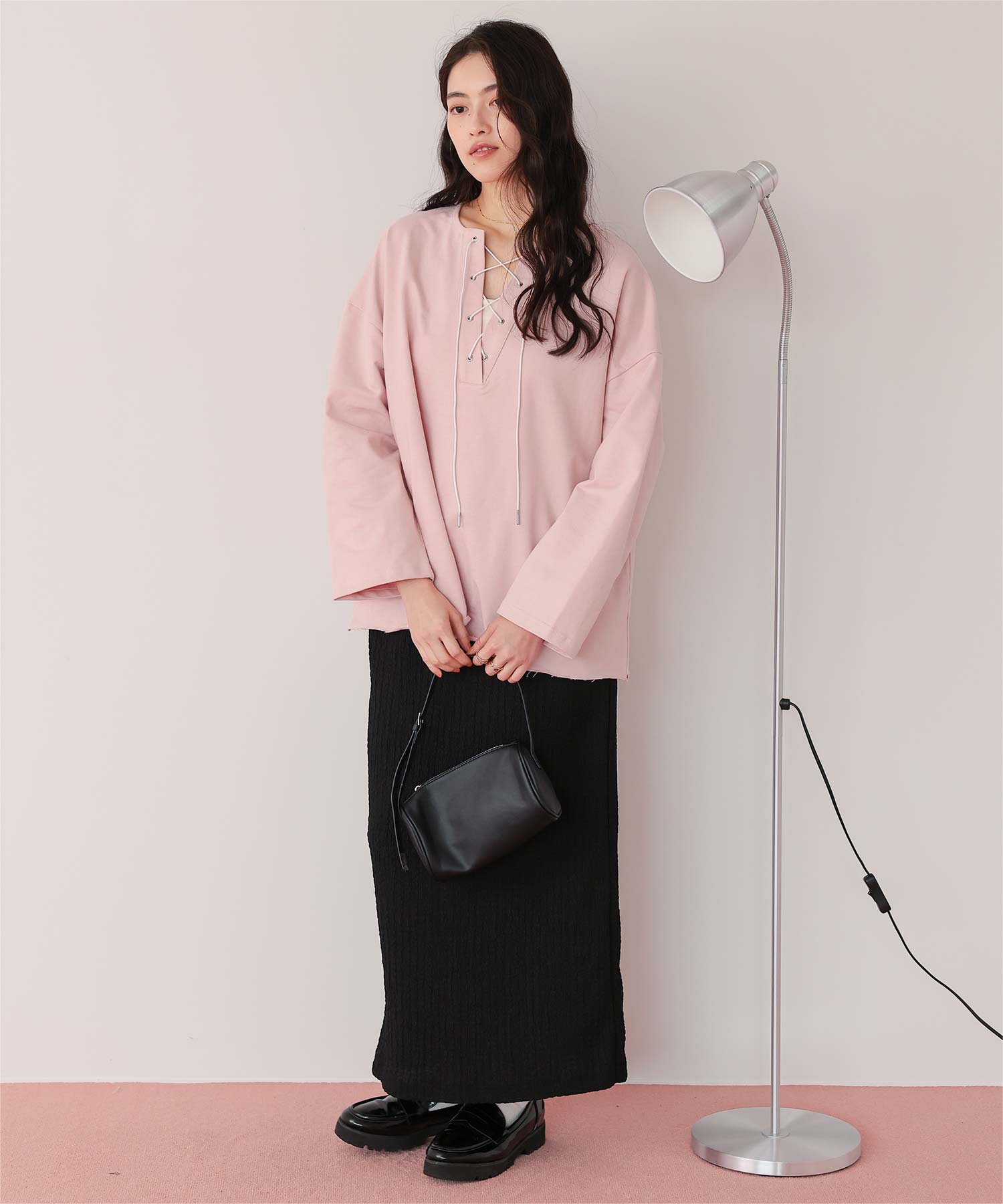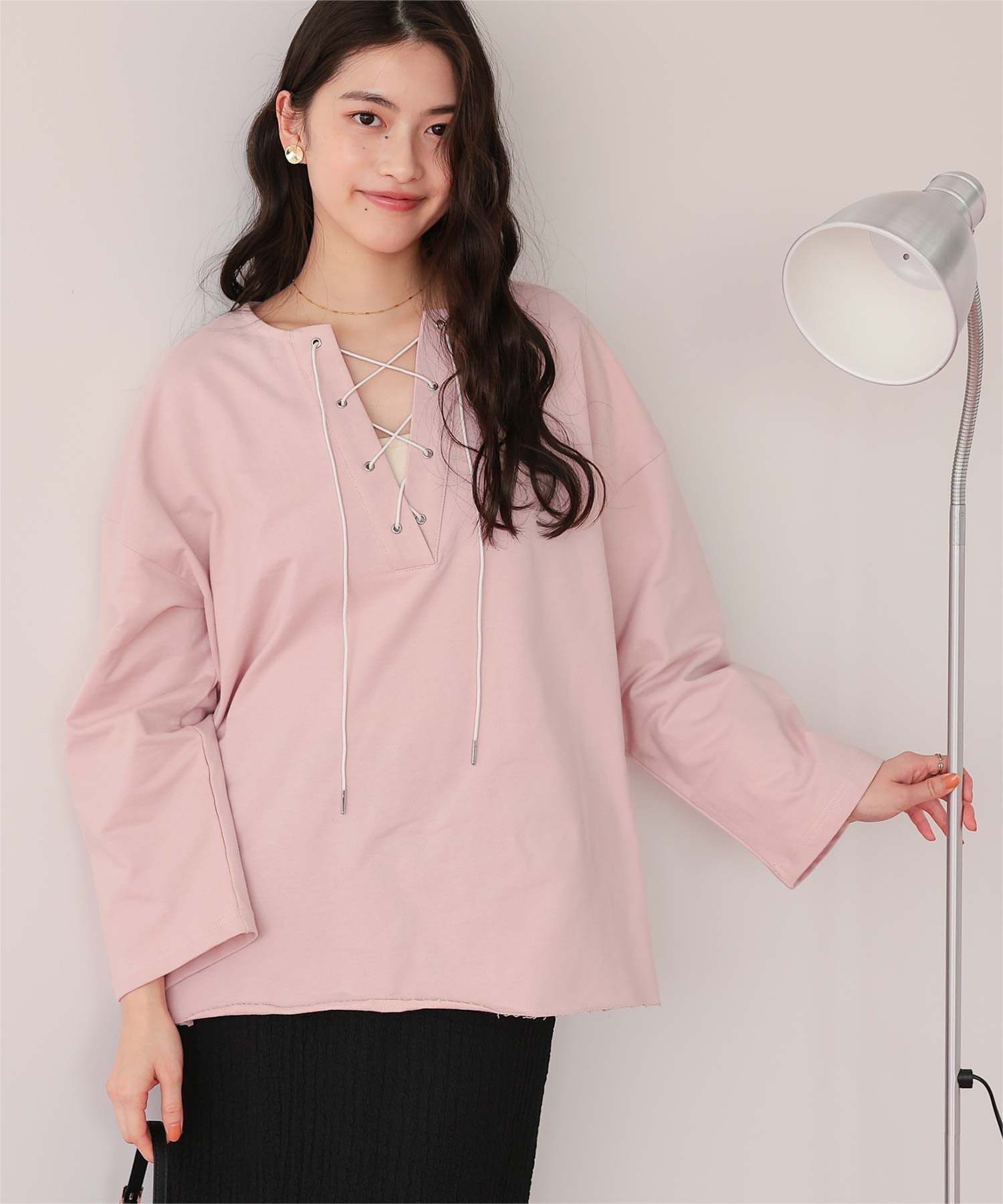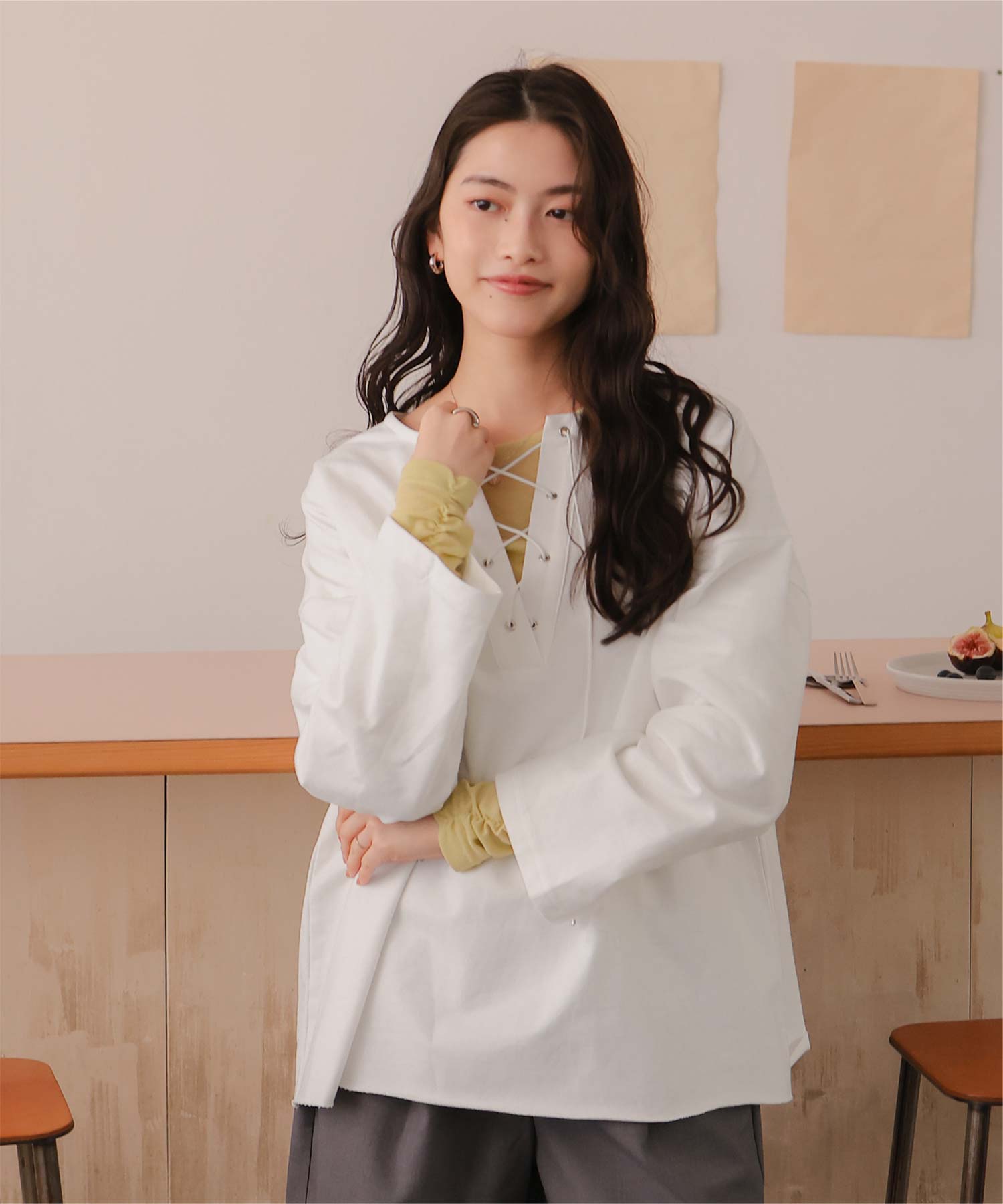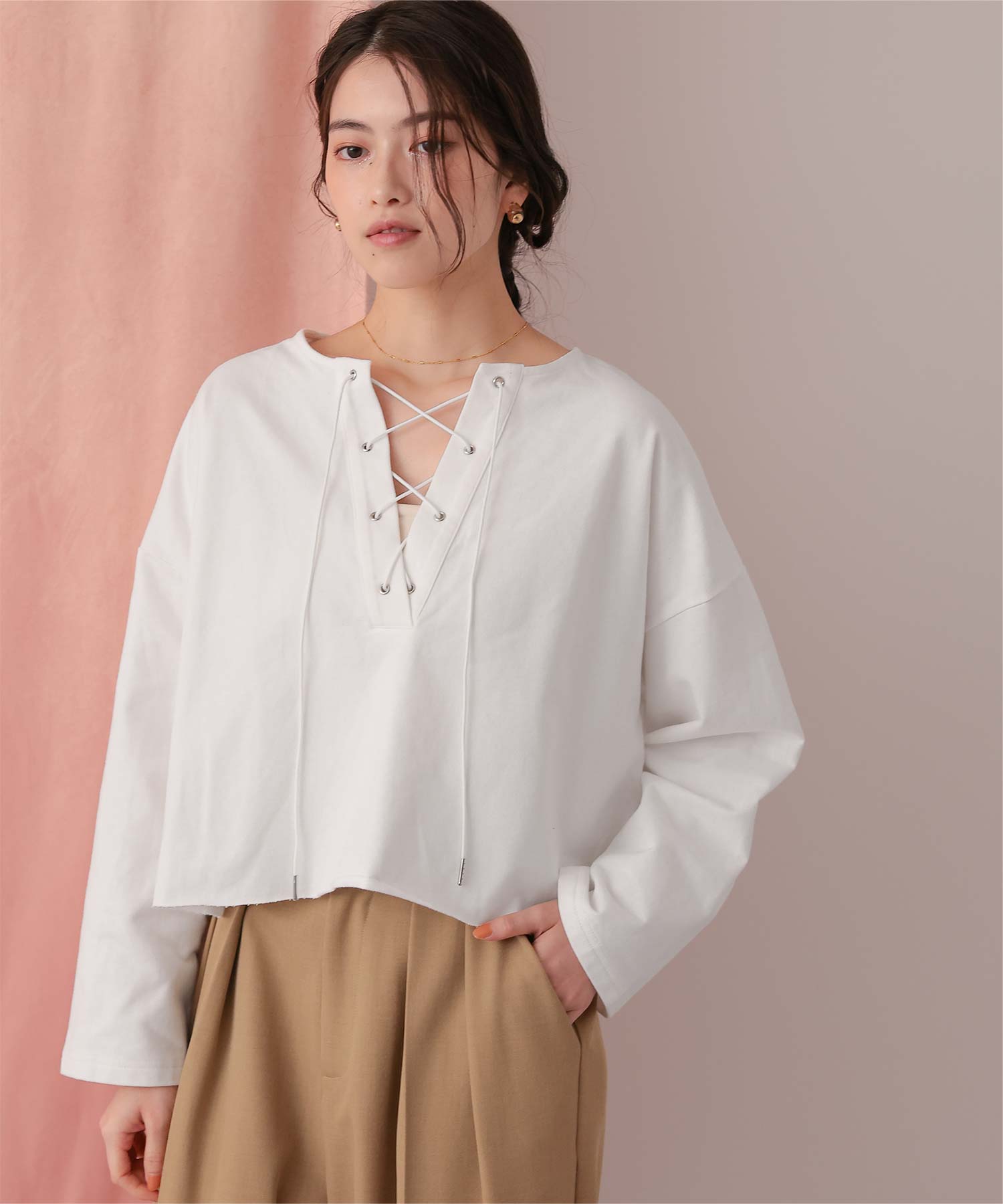 ・胸元のレースアップが印象的なデザインで、甘すぎず大人可愛いバランスを実現
