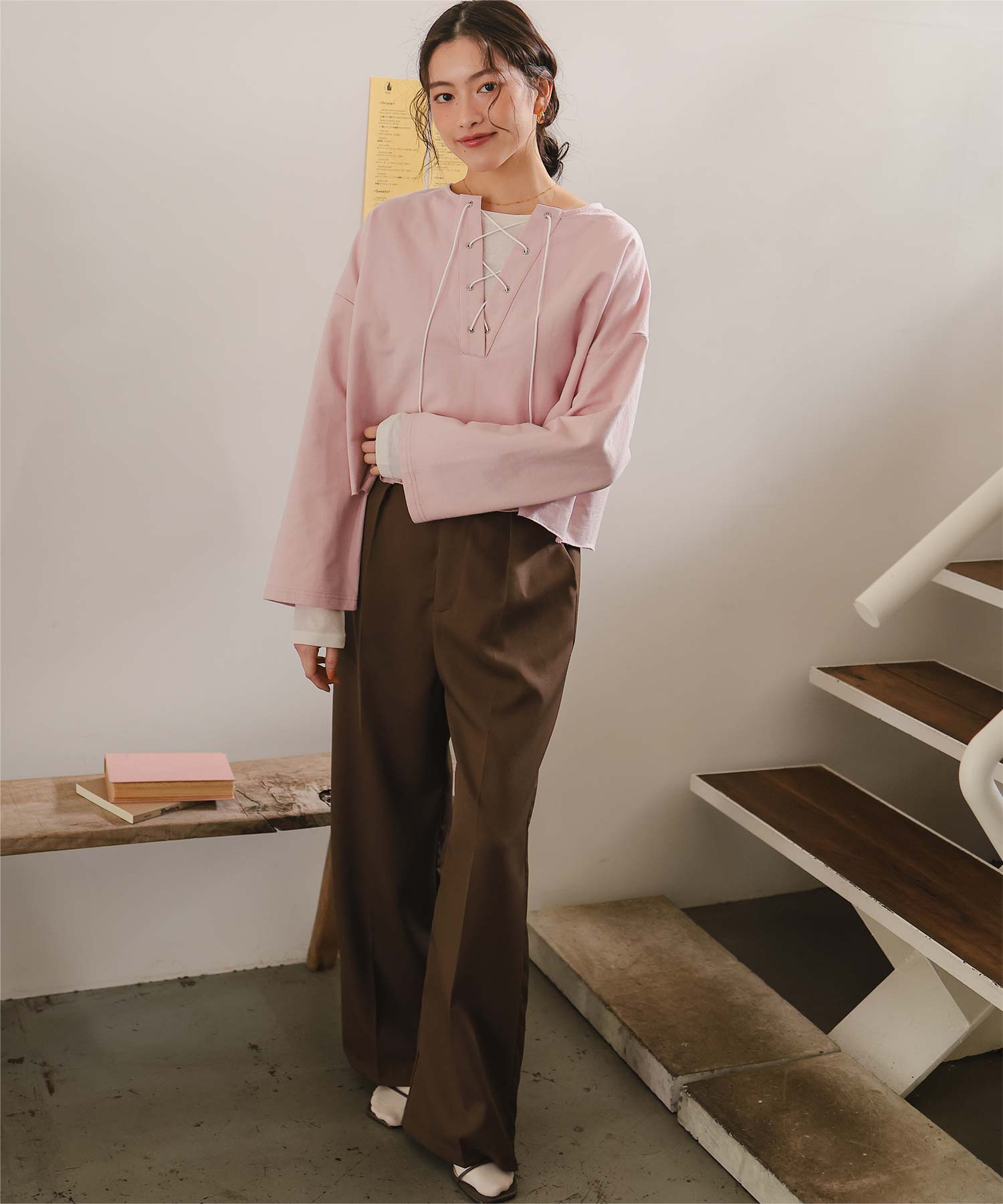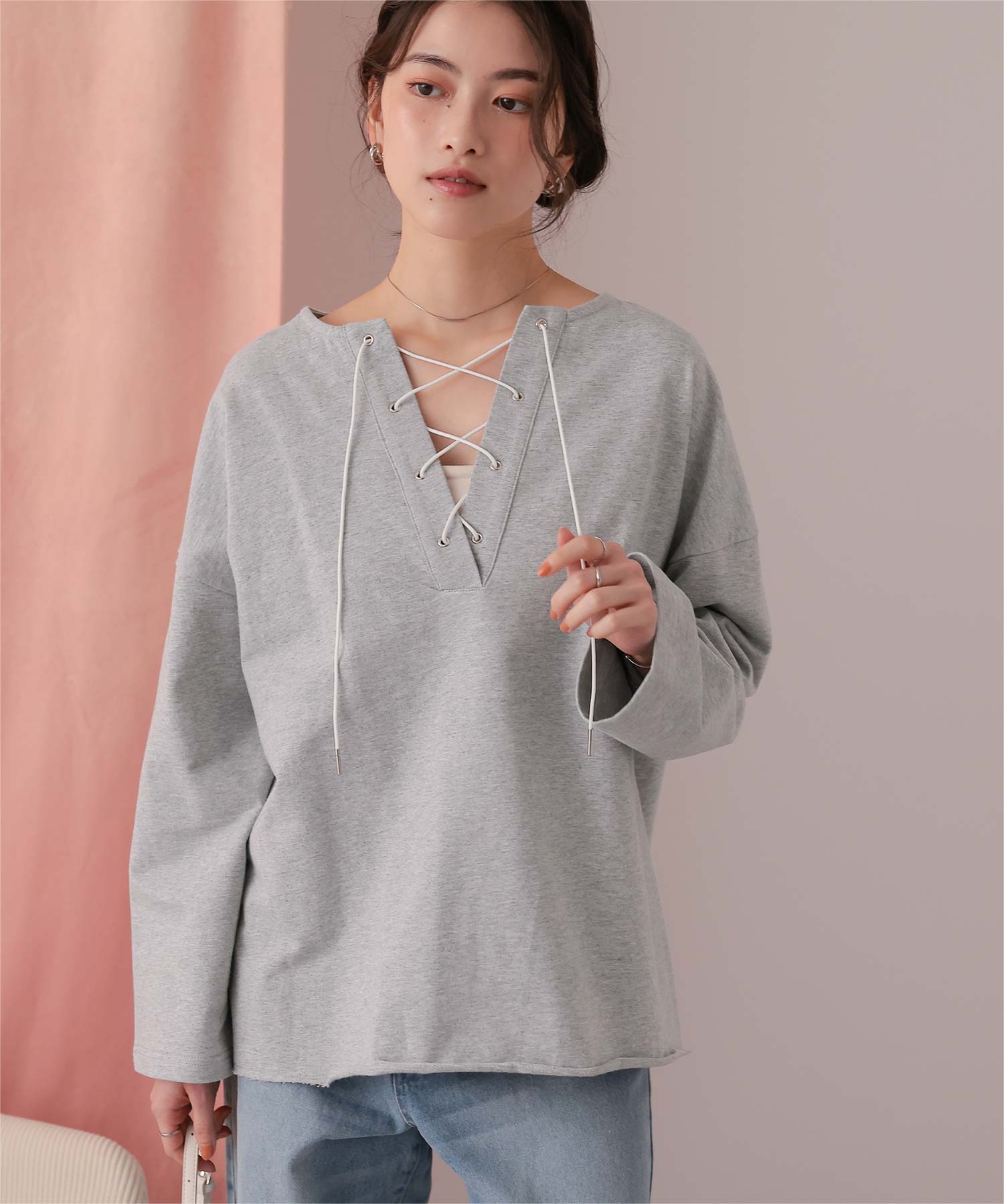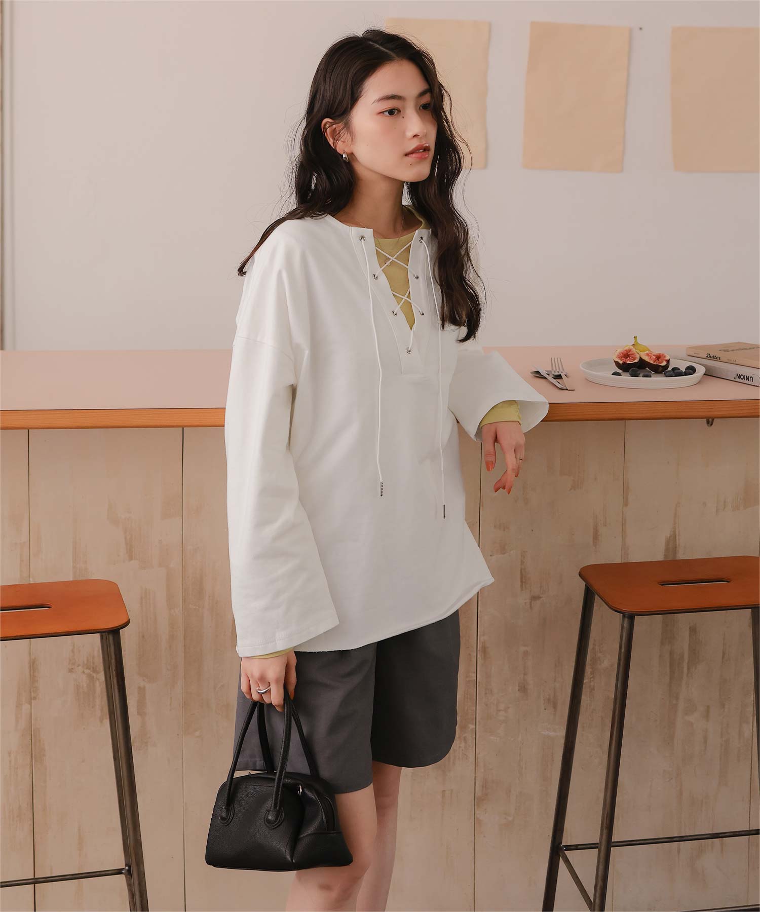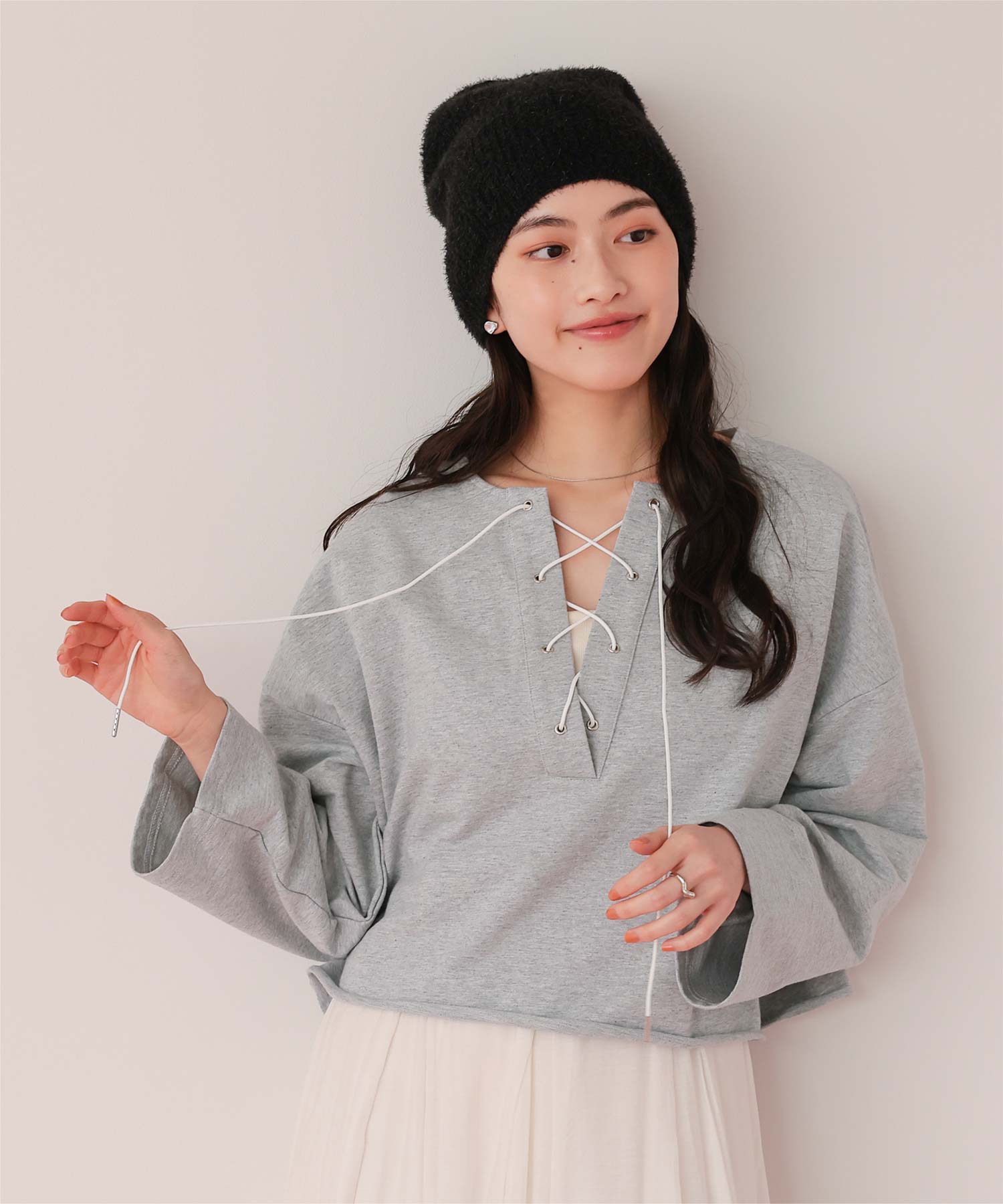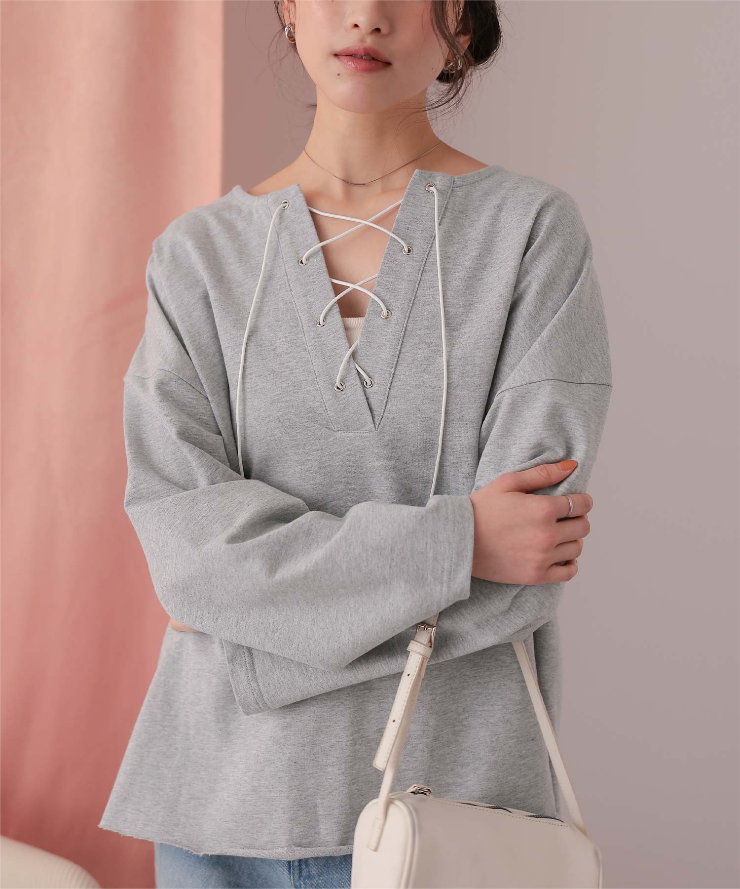 ・胸元のレースアップが印象的なデザインで、甘すぎず大人可愛いバランスを実現
