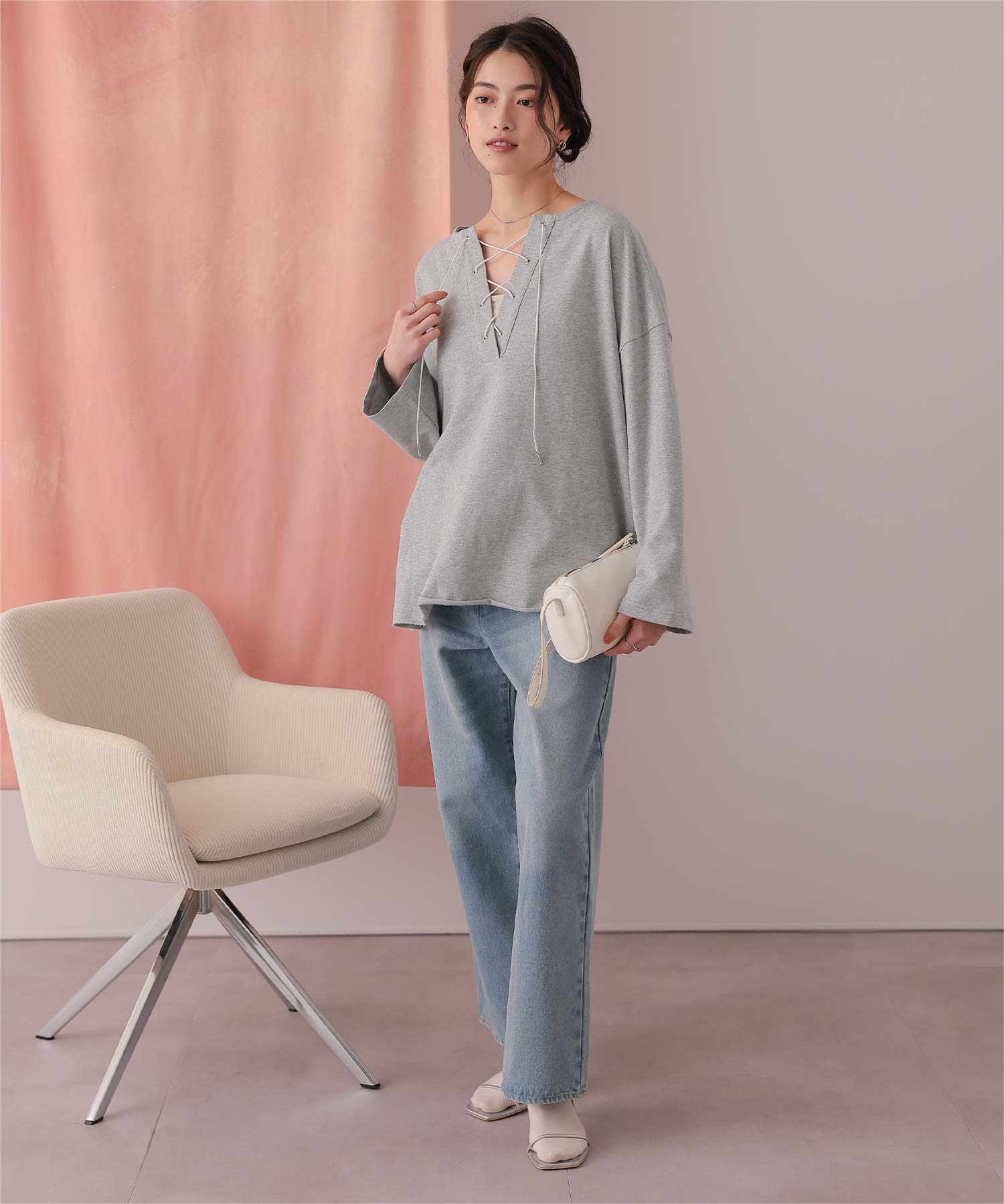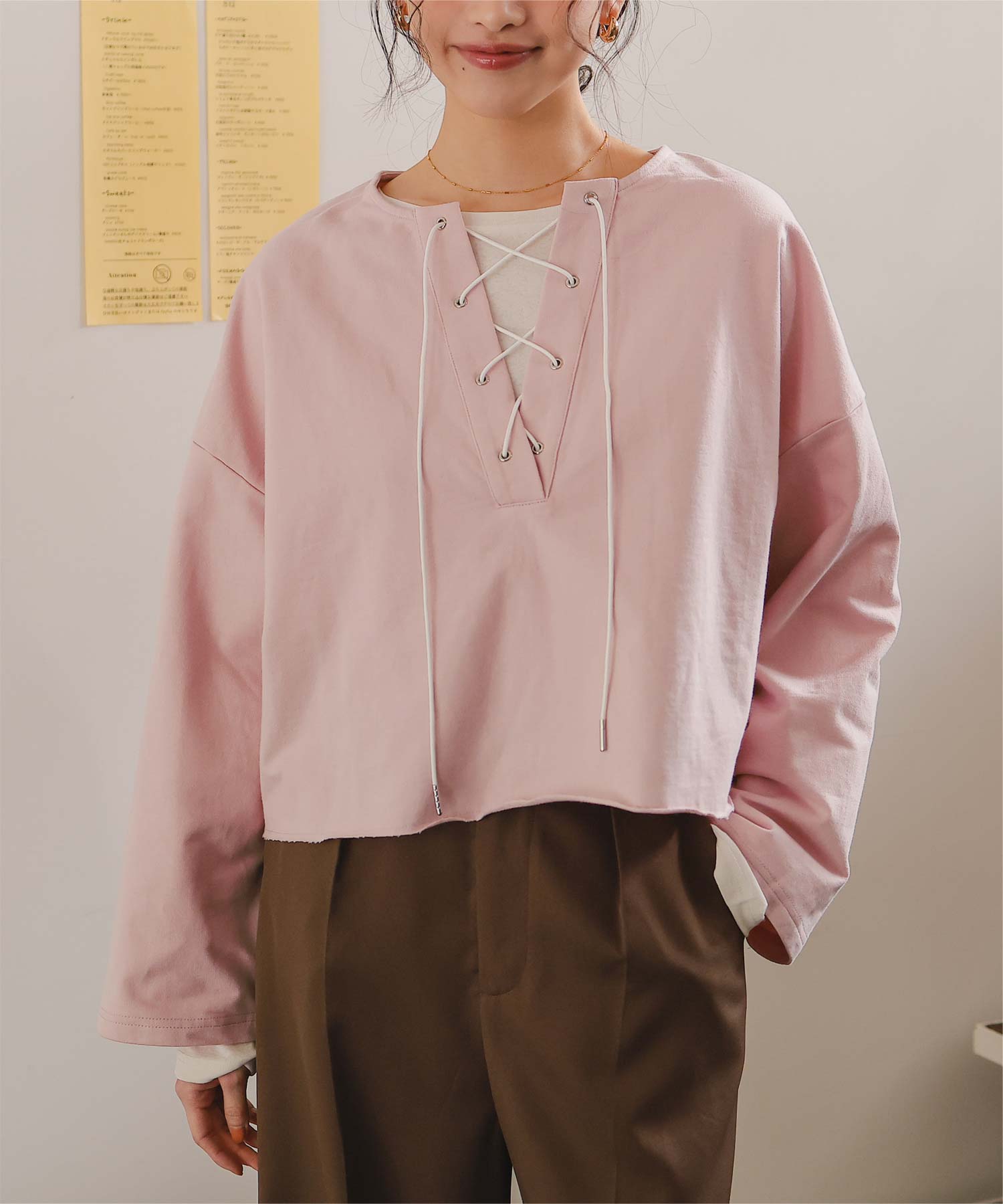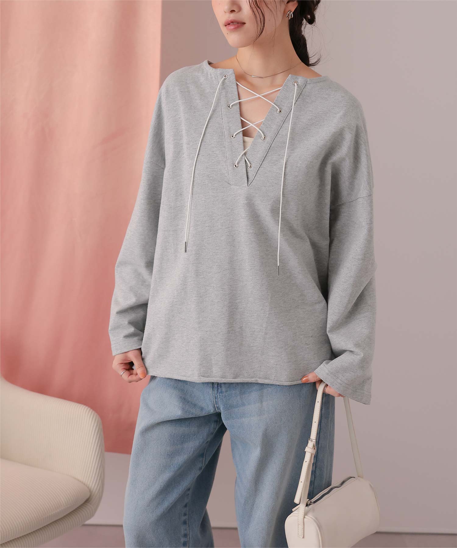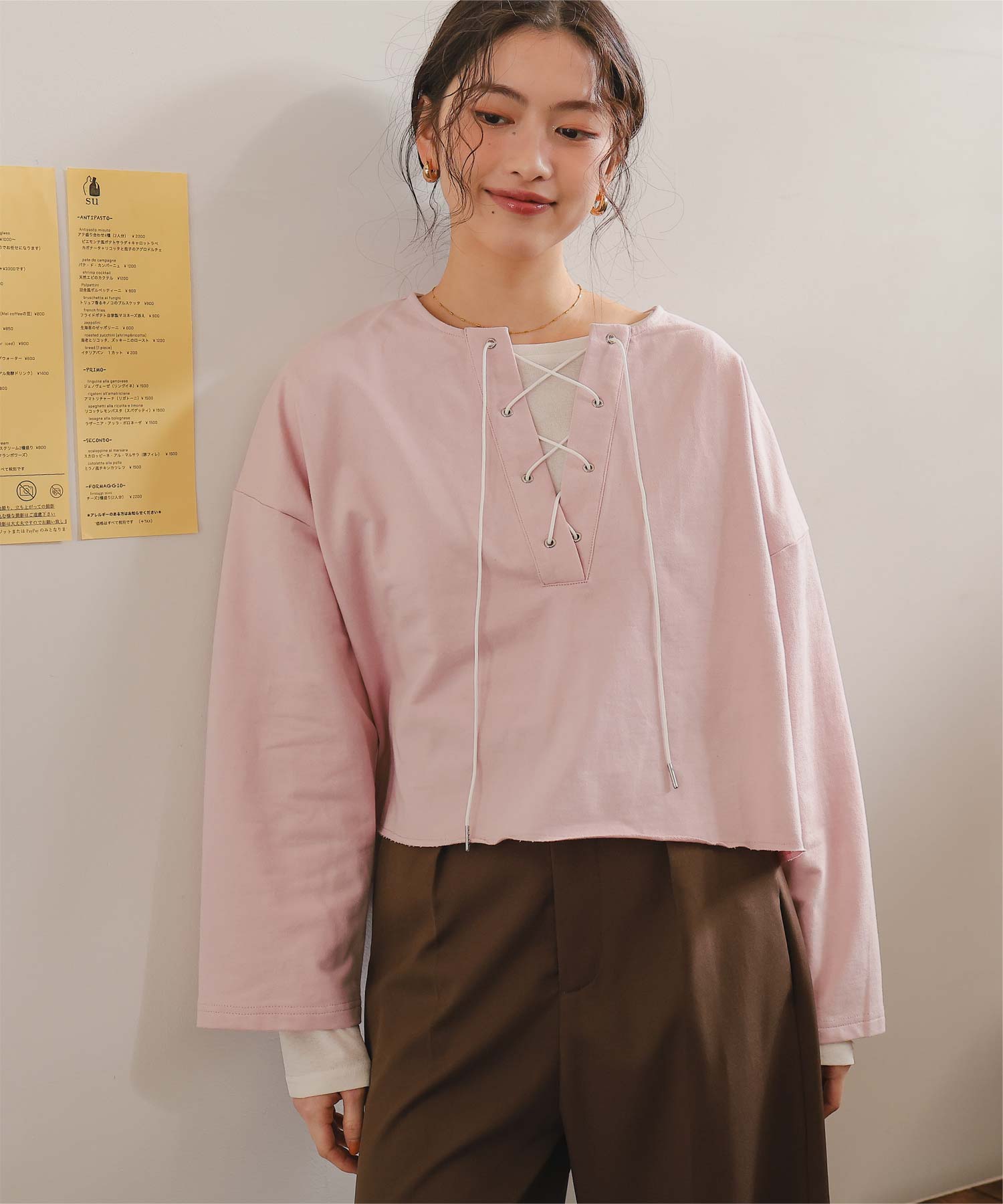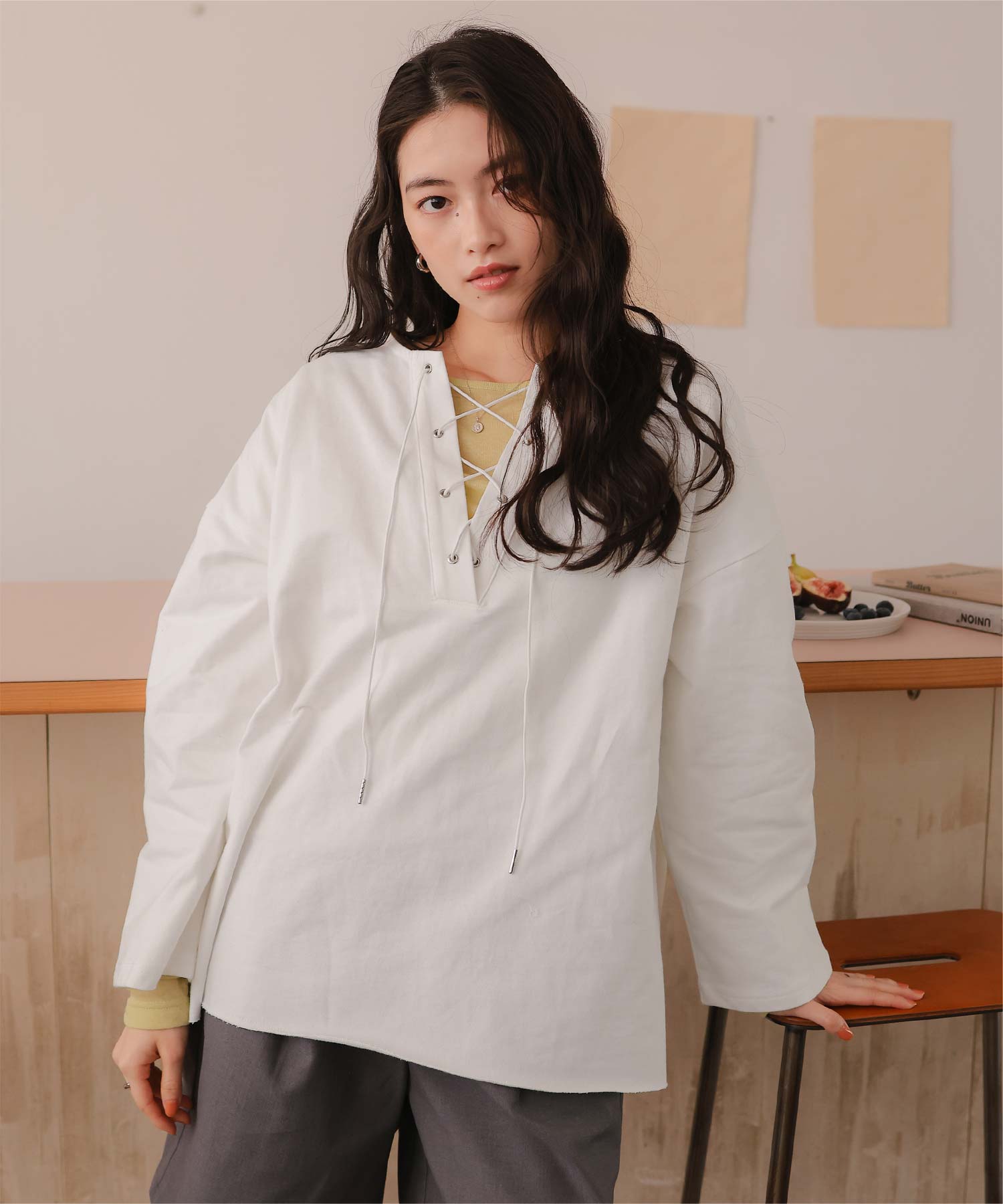 ・胸元のレースアップが印象的なデザインで、甘すぎず大人可愛いバランスを実現