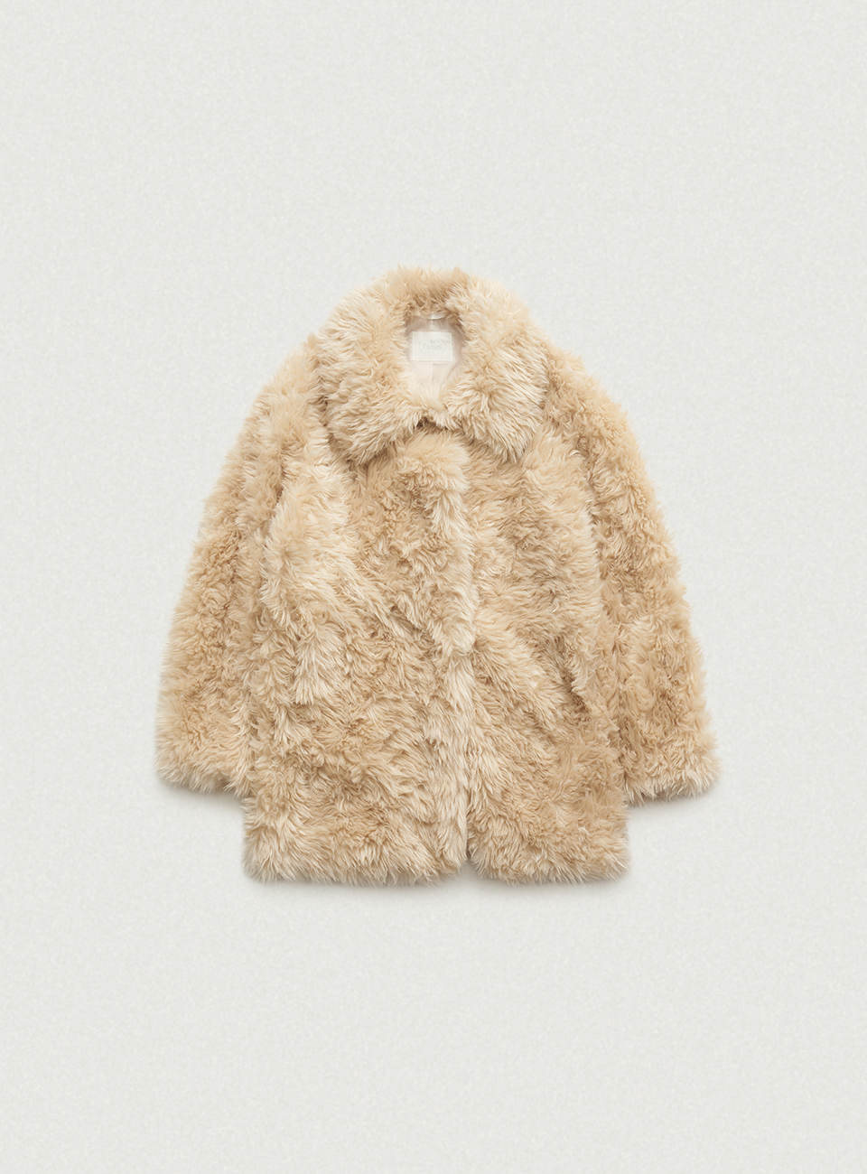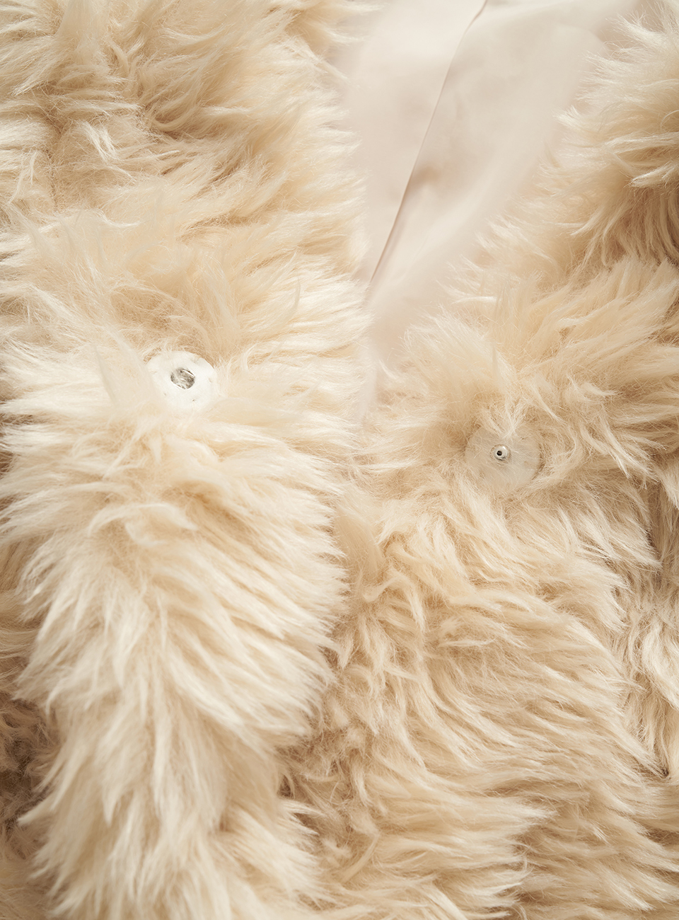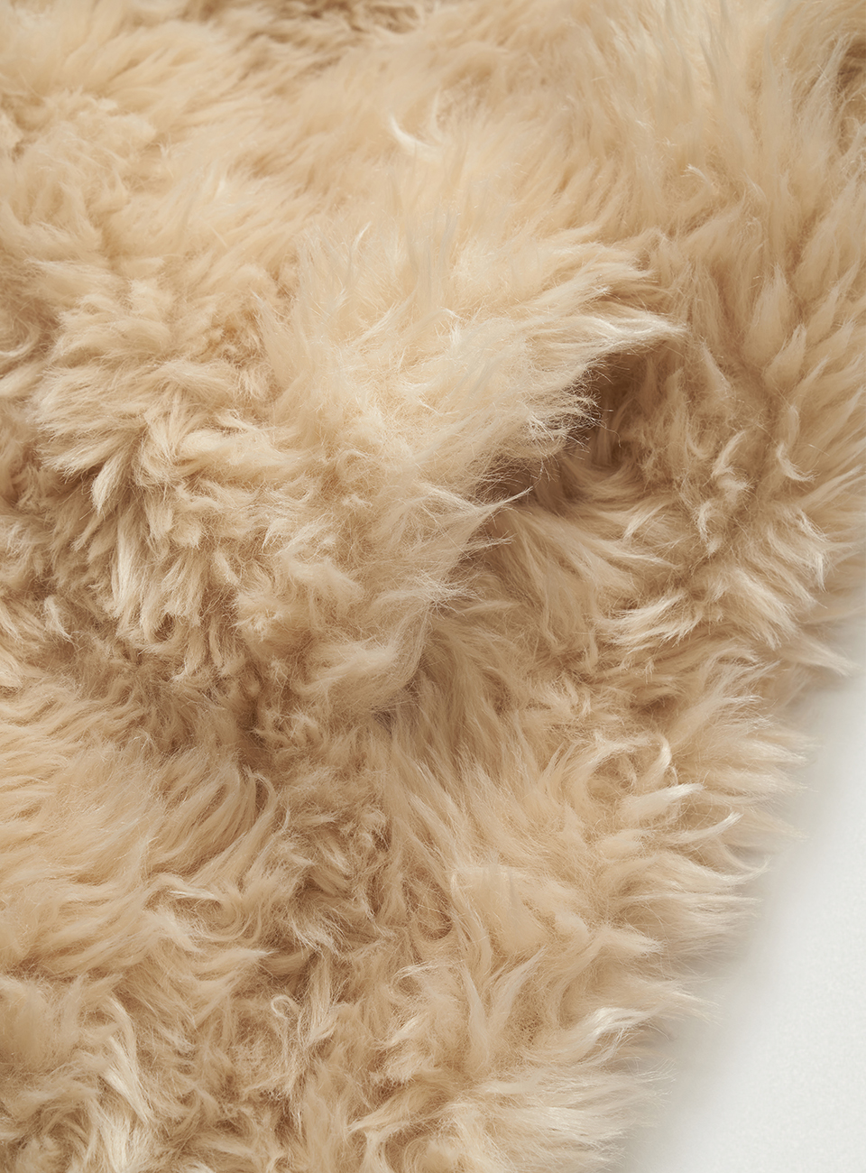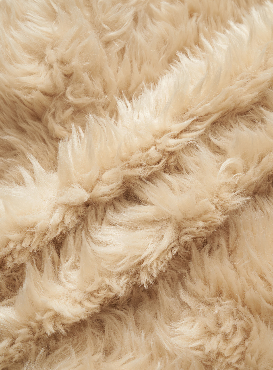 ライトベージュカラーと、柔らかくヘアリーなテクスチャーが特徴のファーファブリック。