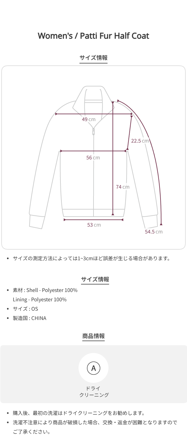 シングルボタン留めで、ファー生地を使用したボタンと隠しスナップ仕様の