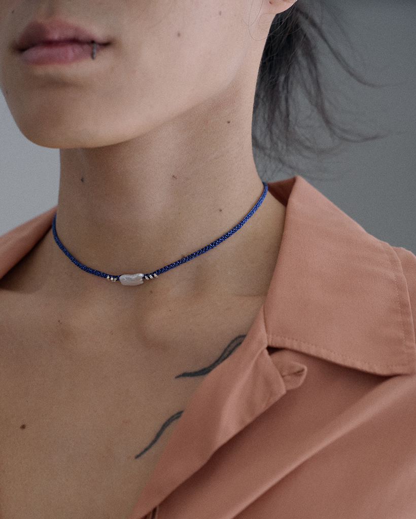-金属ではなく、高品質のメタル糸を使用して仕立てた、クロシェのネックレス兼ボディチェーンです。
