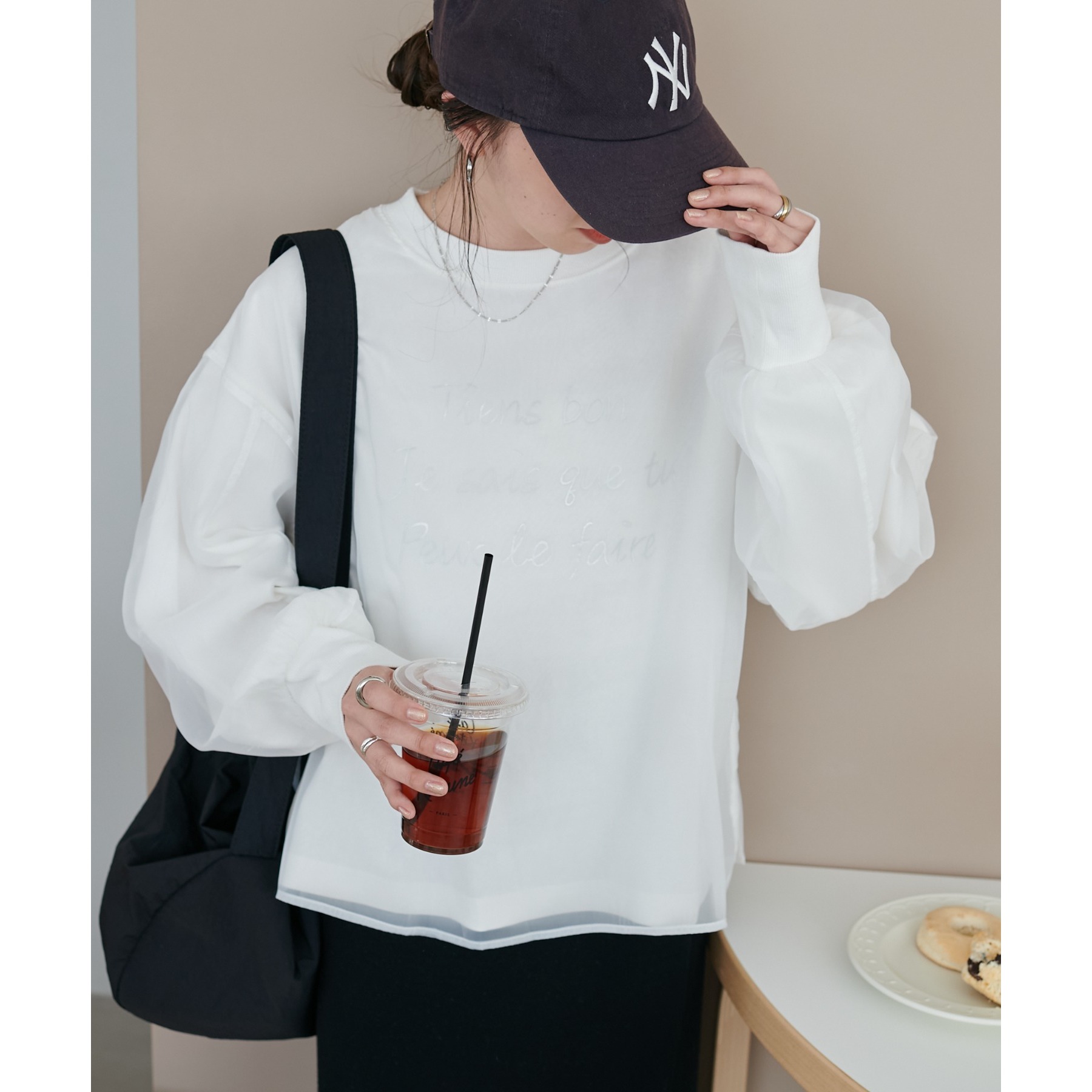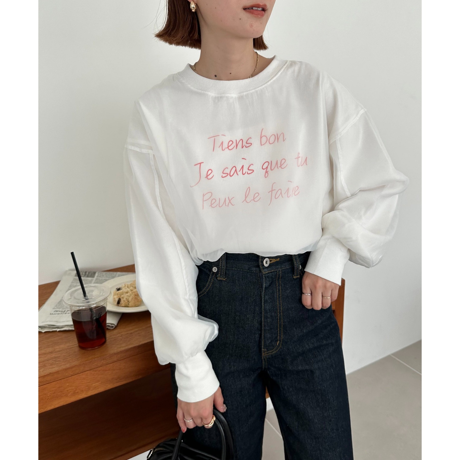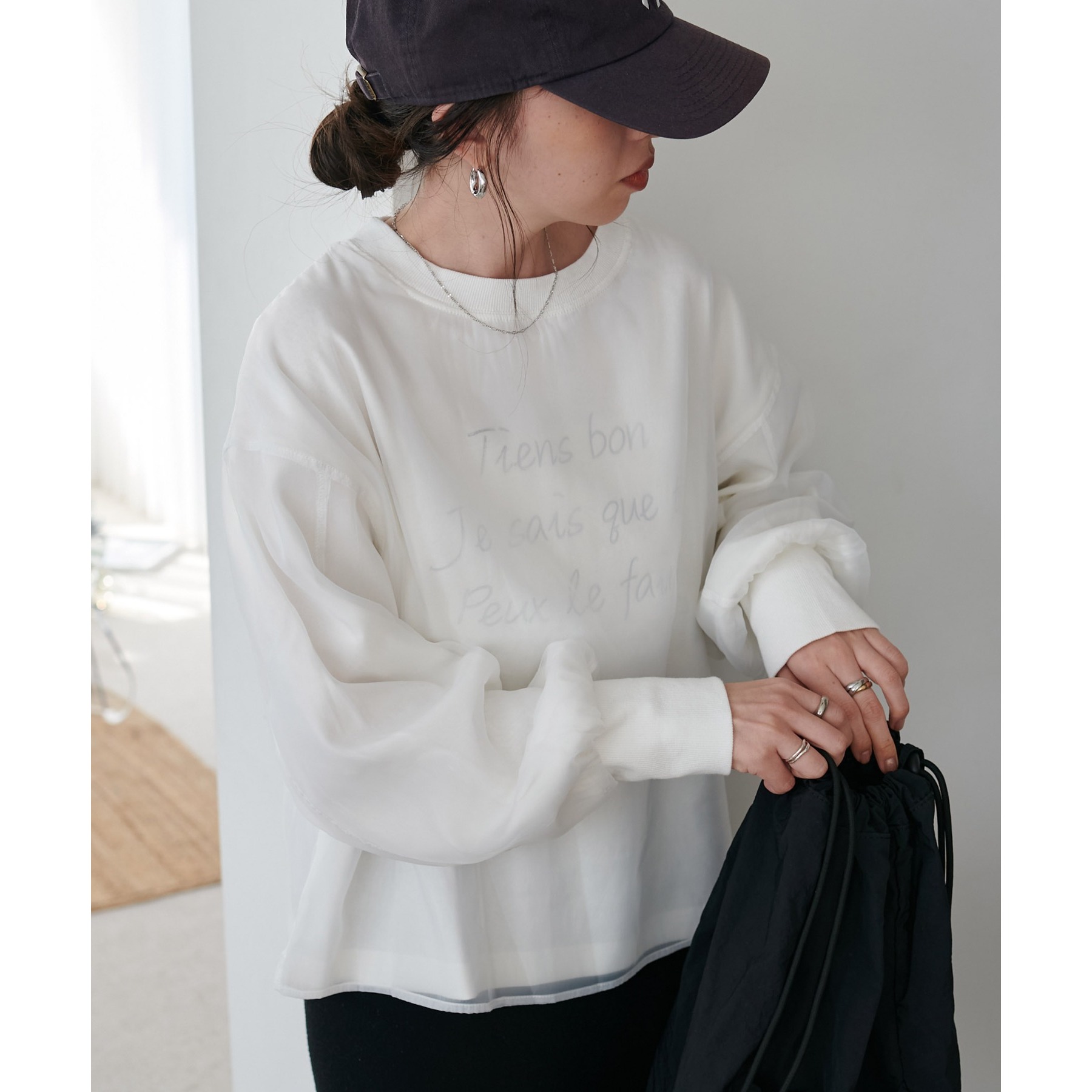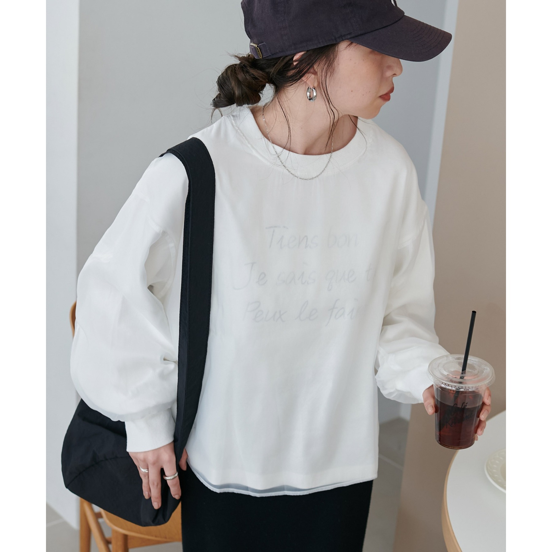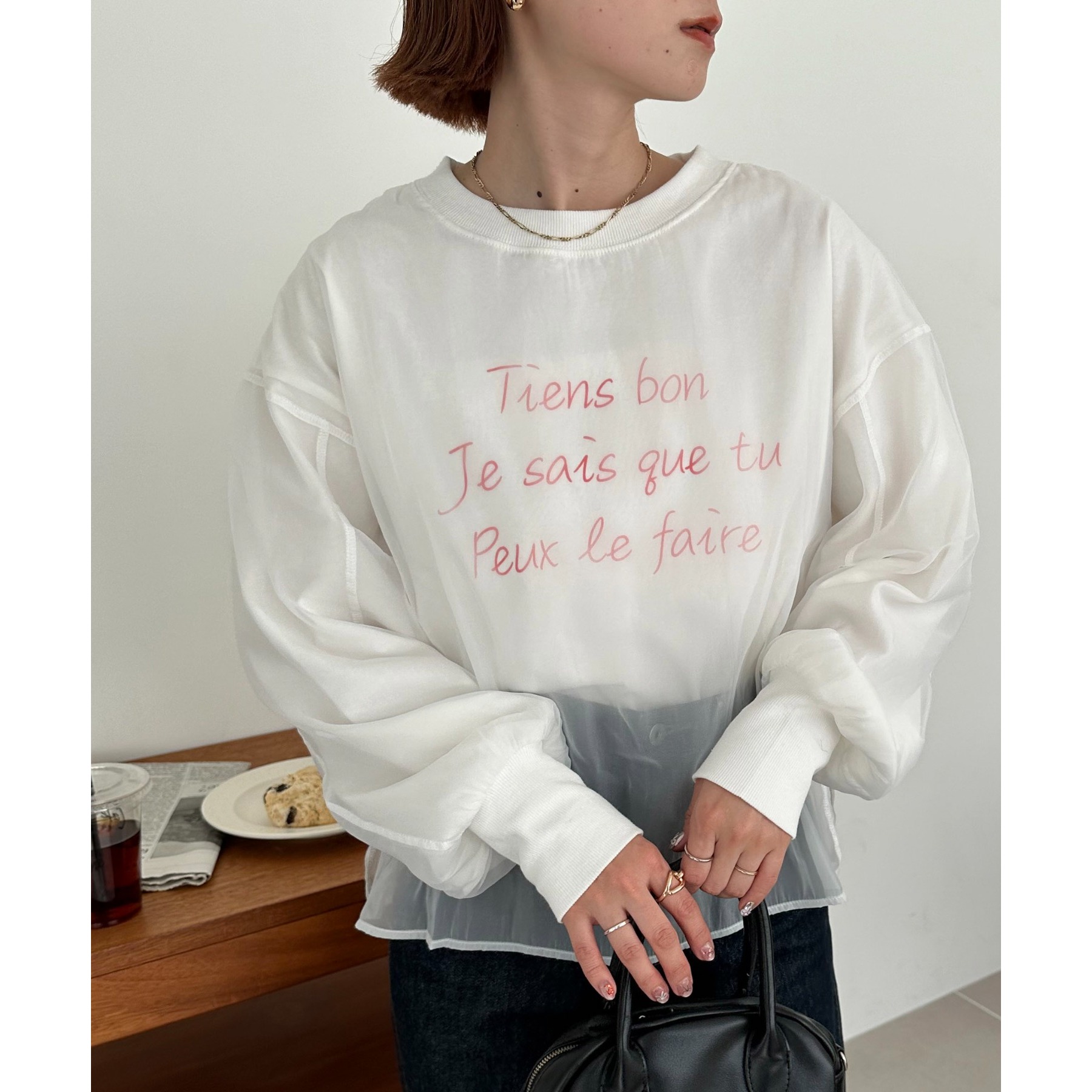 ロゴTにオーガンジーがレイヤードされた、大人きれいめカジュアルトップス。