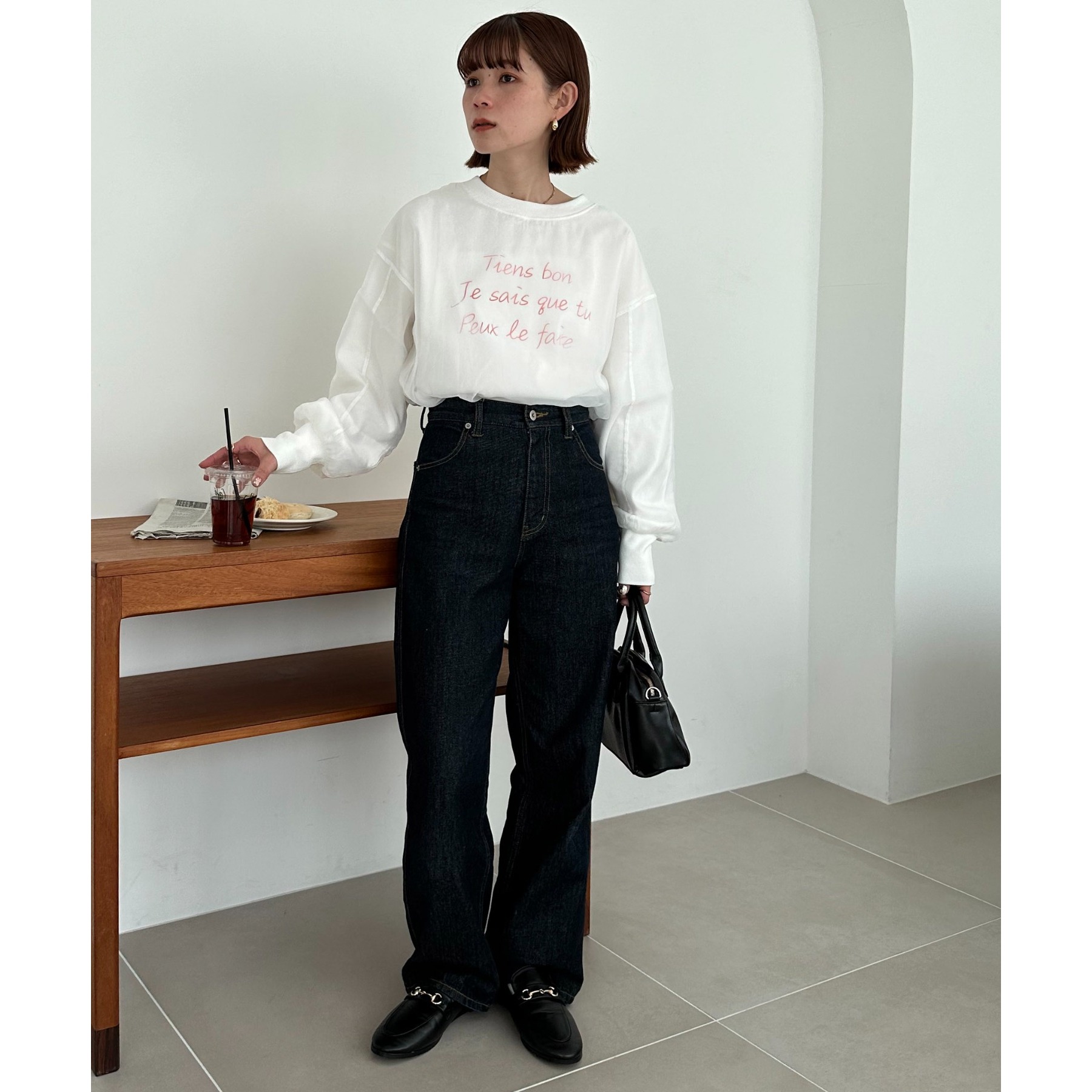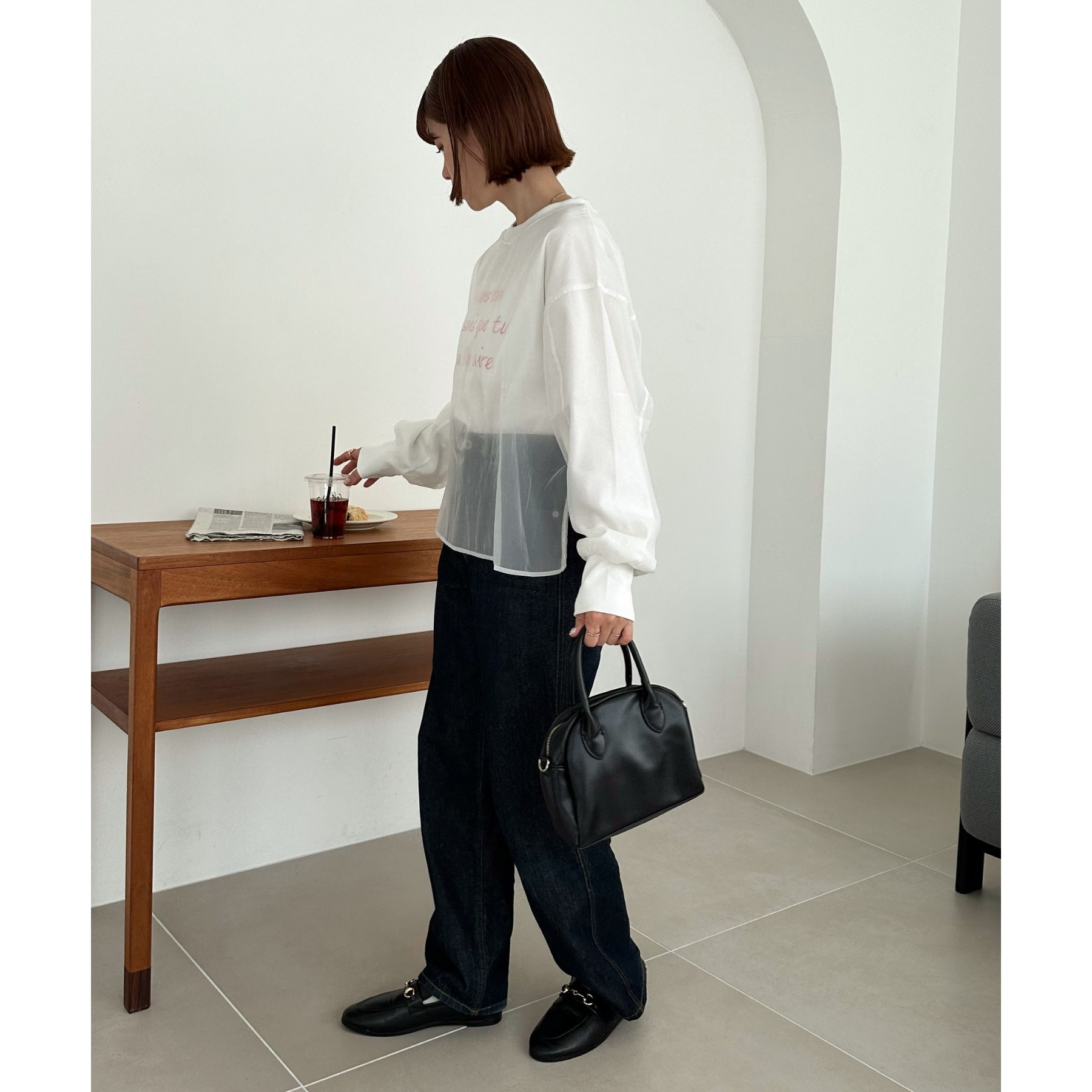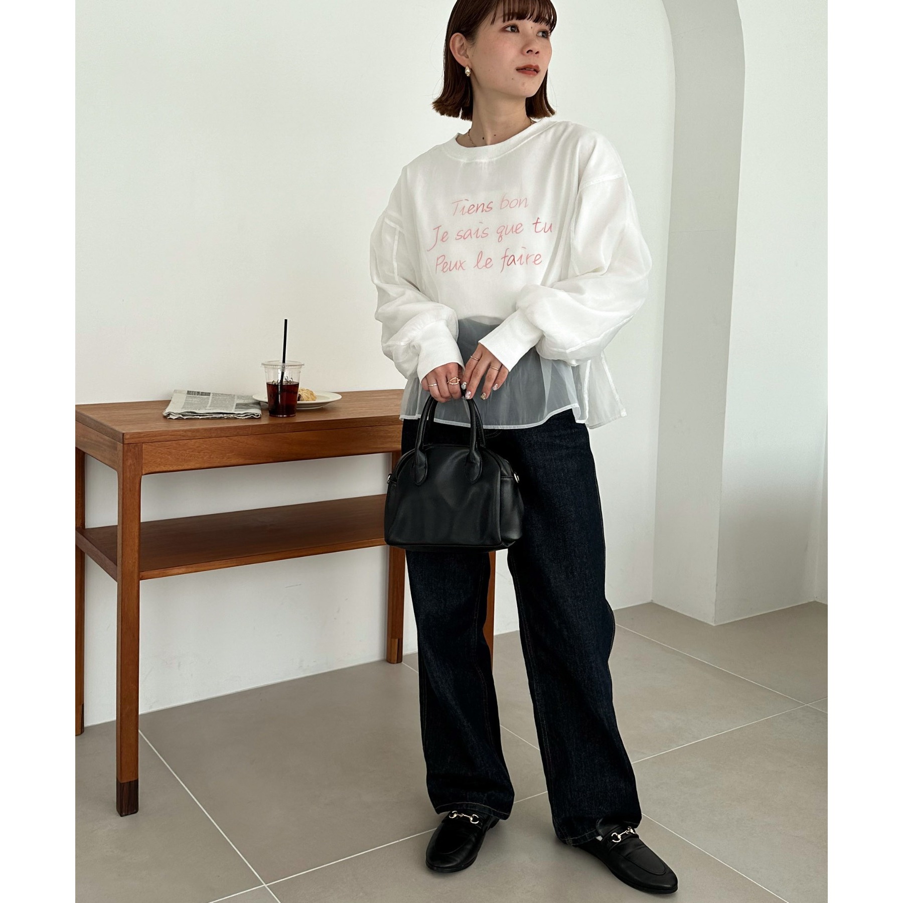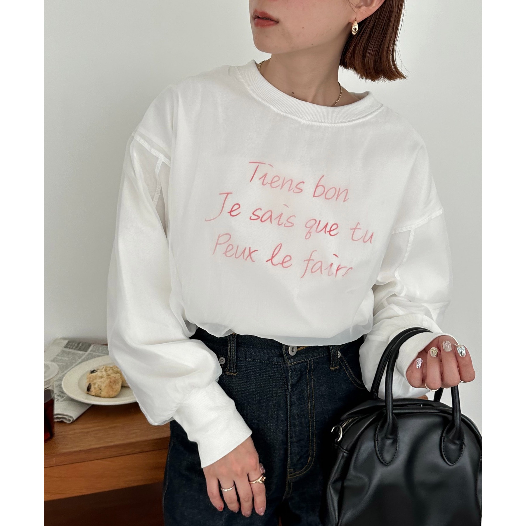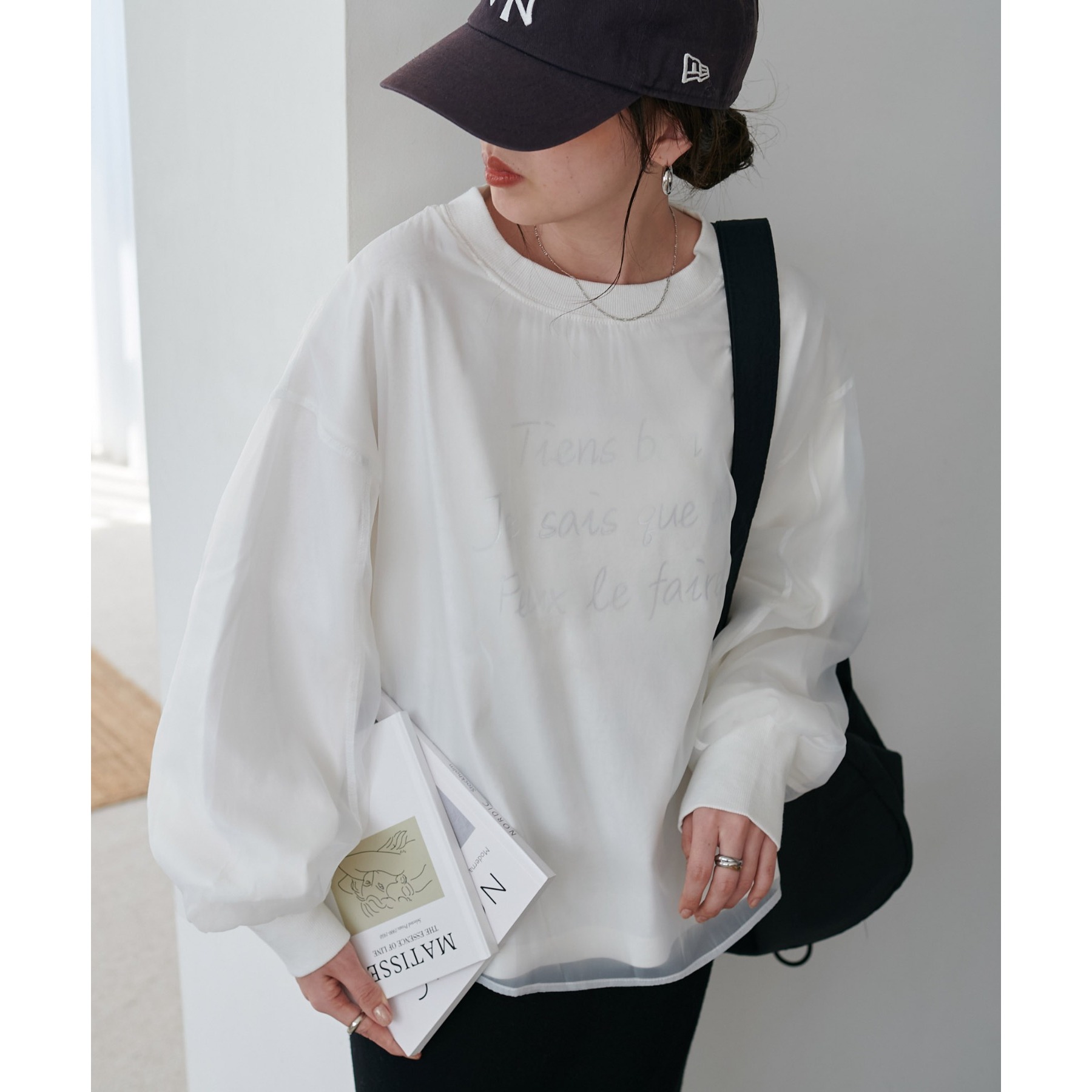 ロゴTにオーガンジーがレイヤードされた、大人きれいめカジュアルトップス。