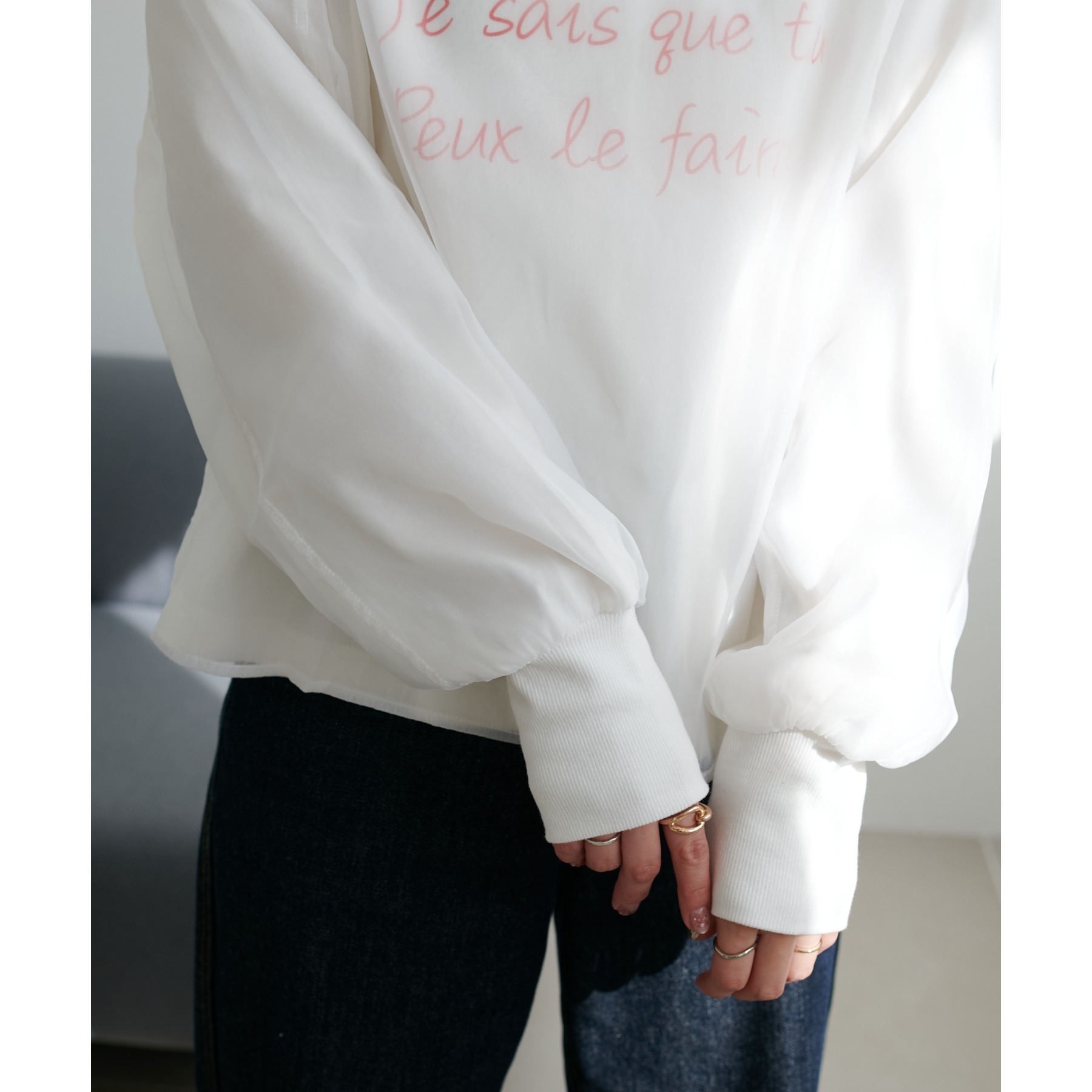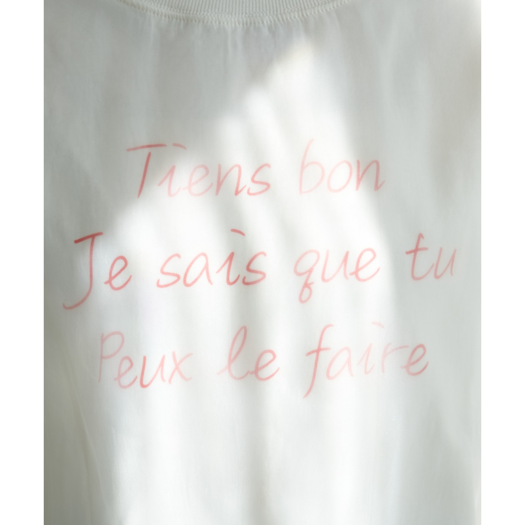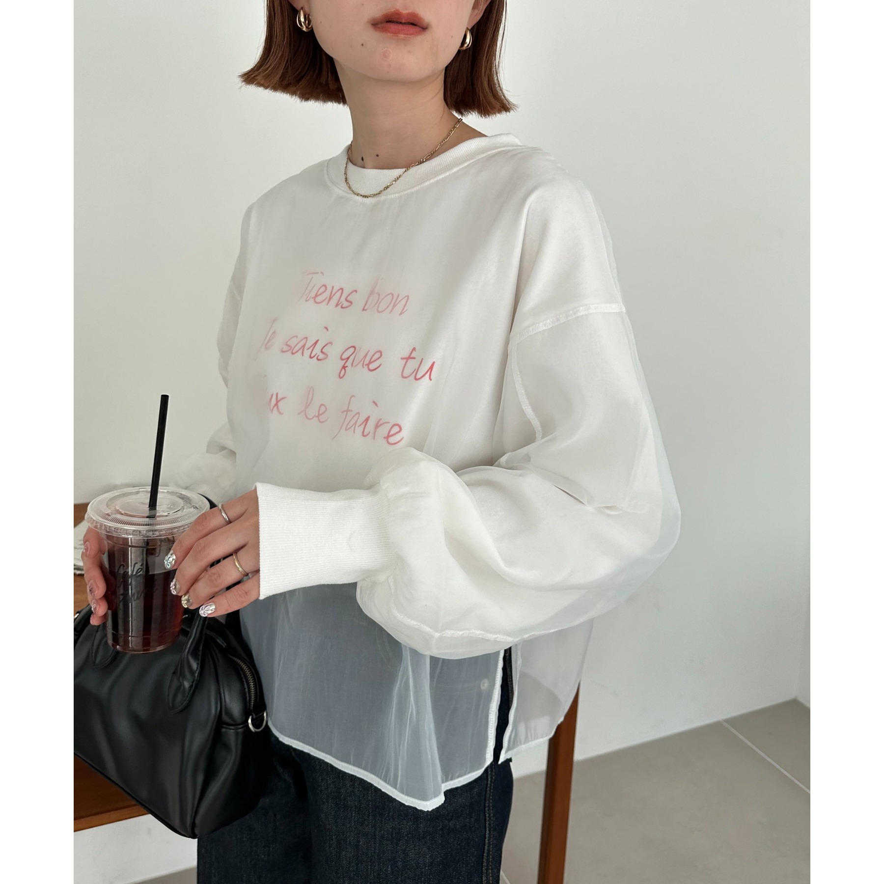 ロゴTのカジュアル感とオーガンジーのきれいめがレイヤードされたことで大人きれいめカジュアルに!ロゴTをインすることでふわっと広がるオーガンジーの裾がワンポイントなります。どんなボトムスにも合わせやすいホワイトで文字色はシルバー・レッドからお選びいただけます。