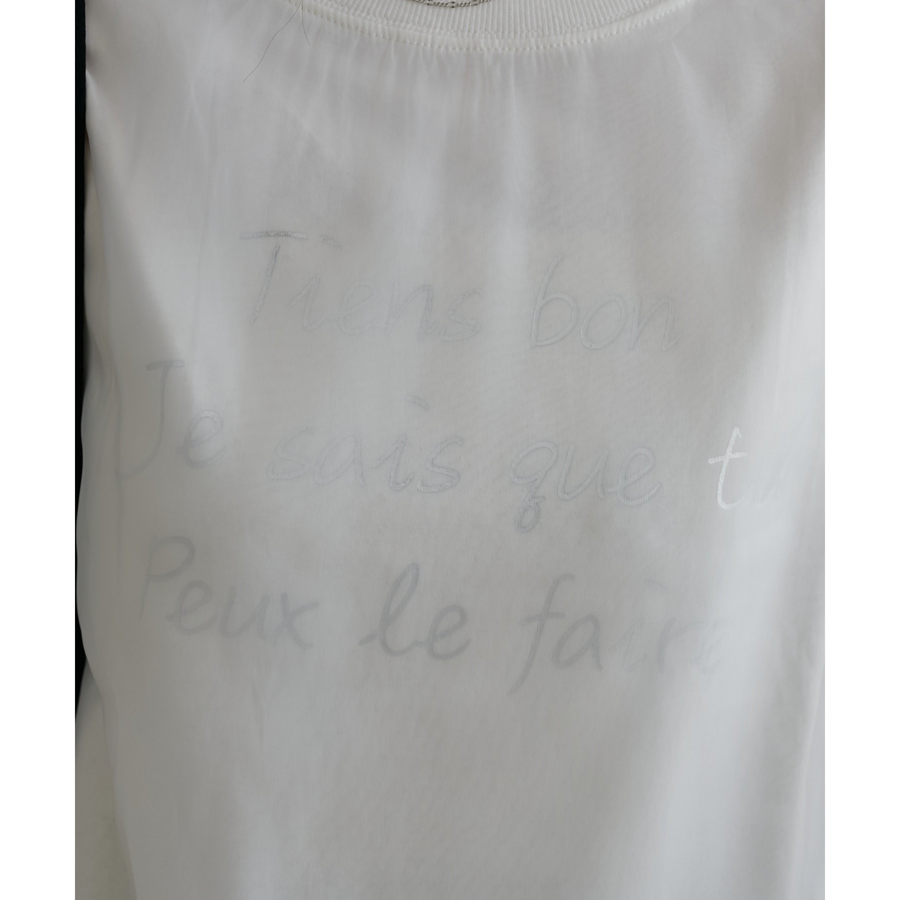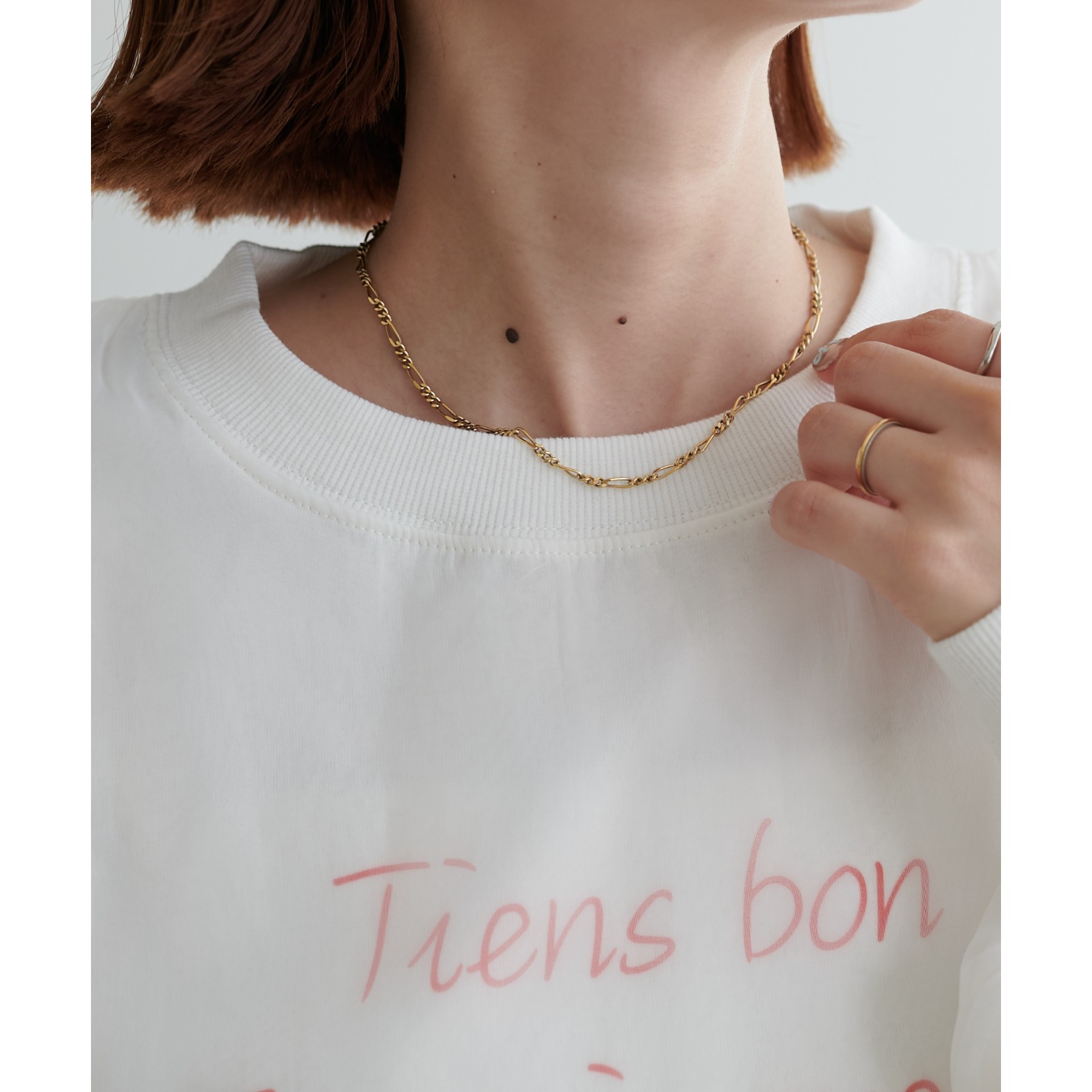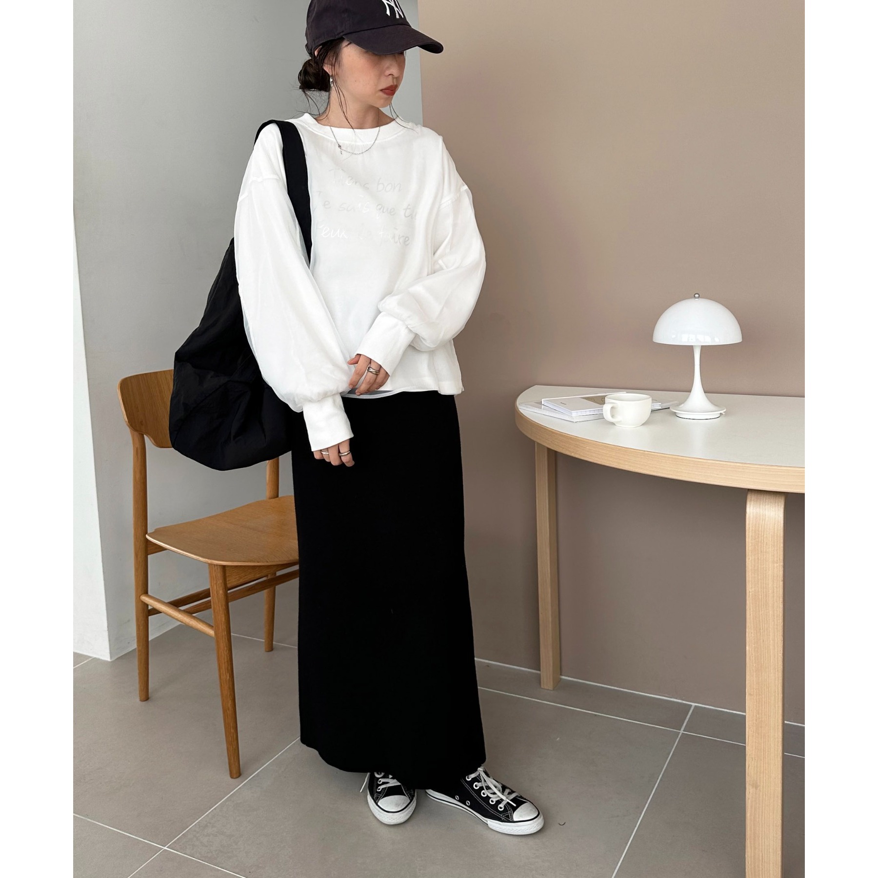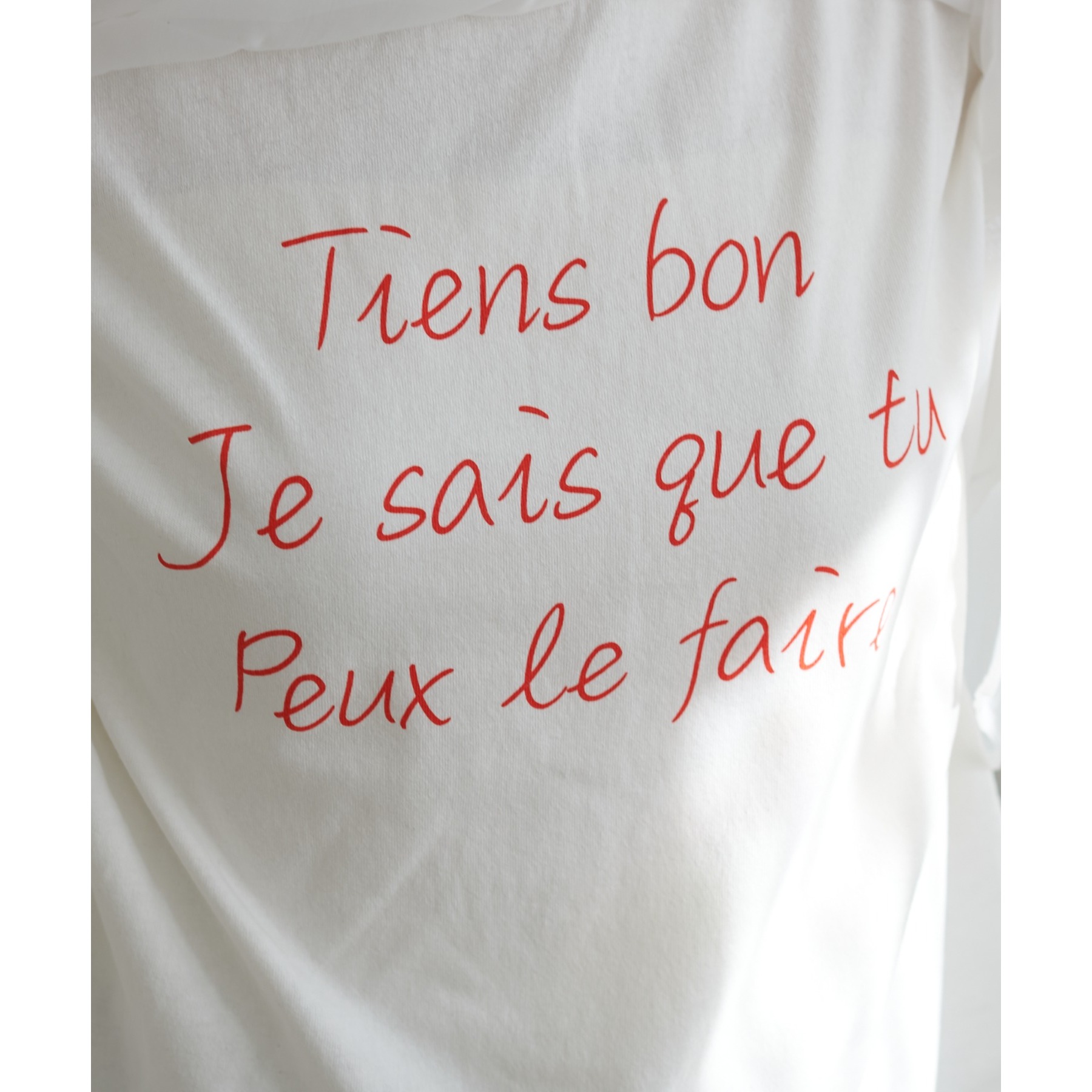 ロゴTのカジュアル感とオーガンジーのきれいめがレイヤードされたことで大人きれいめカジュアルに!ロゴTをインすることでふわっと広がるオーガンジーの裾がワンポイントなります。どんなボトムスにも合わせやすいホワイトで文字色はシルバー・レッドからお選びいただけます。