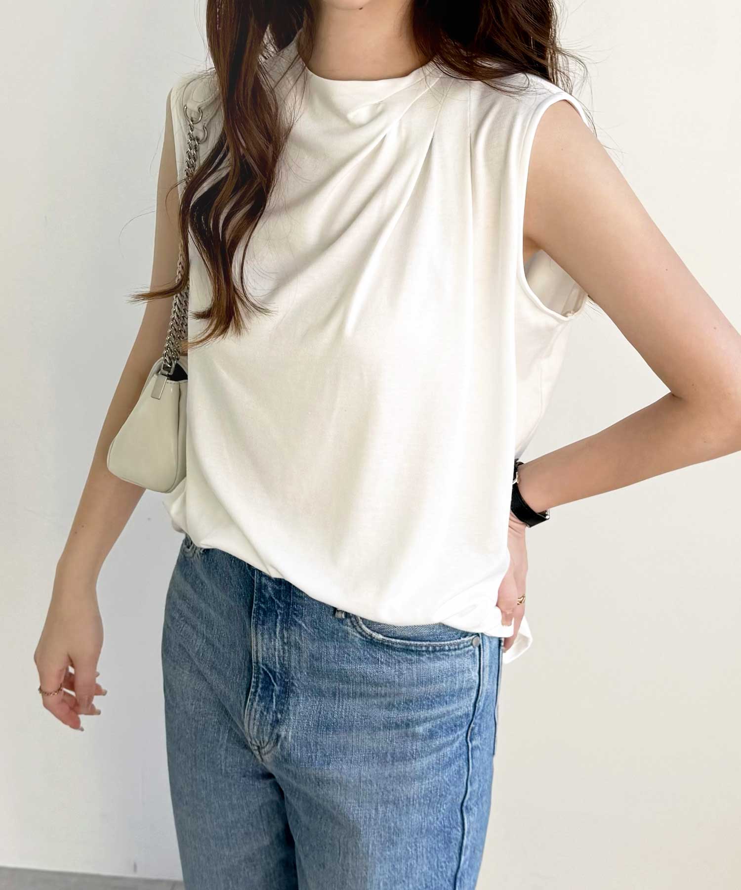 プチハイネックとすっきりとしたフレンチスリーブの組み合わせが